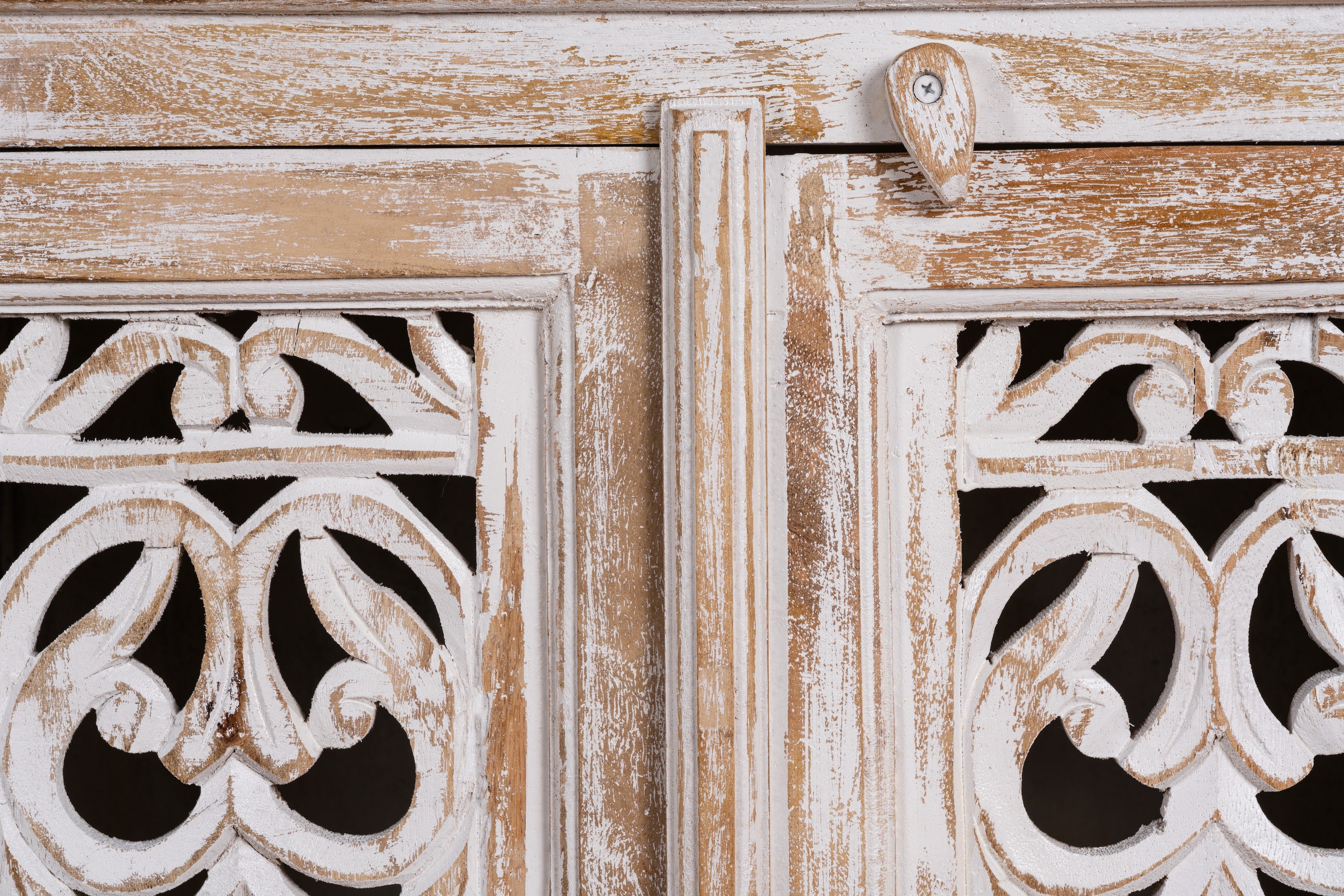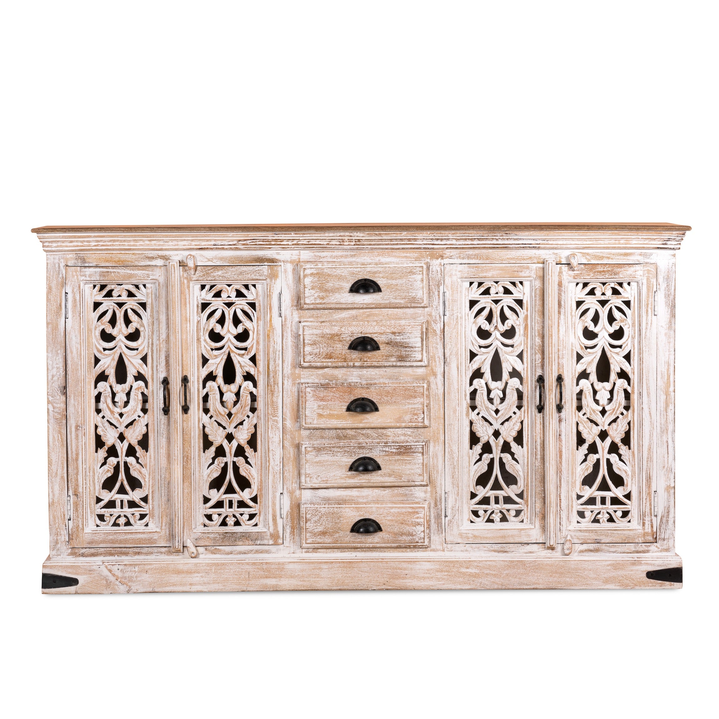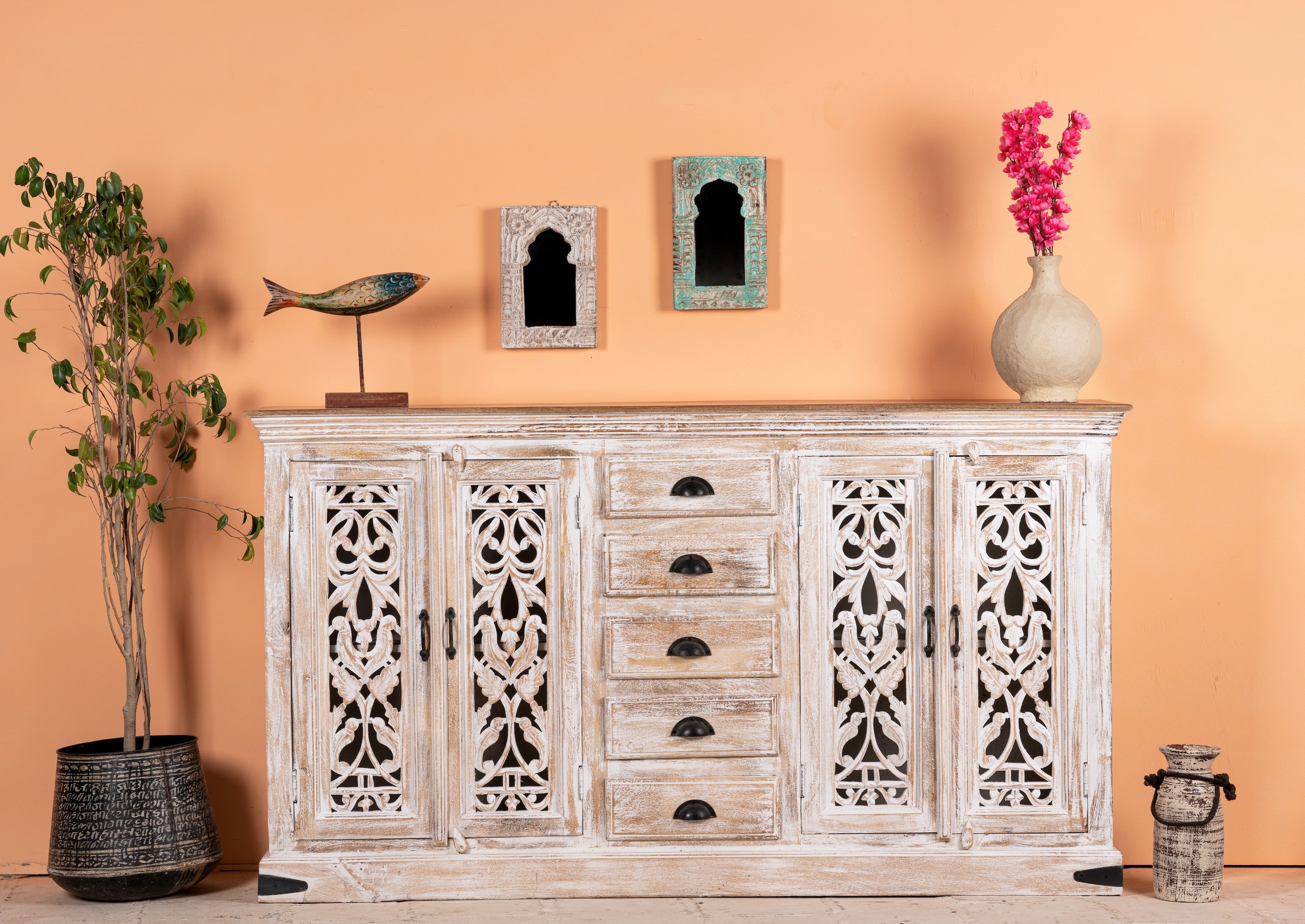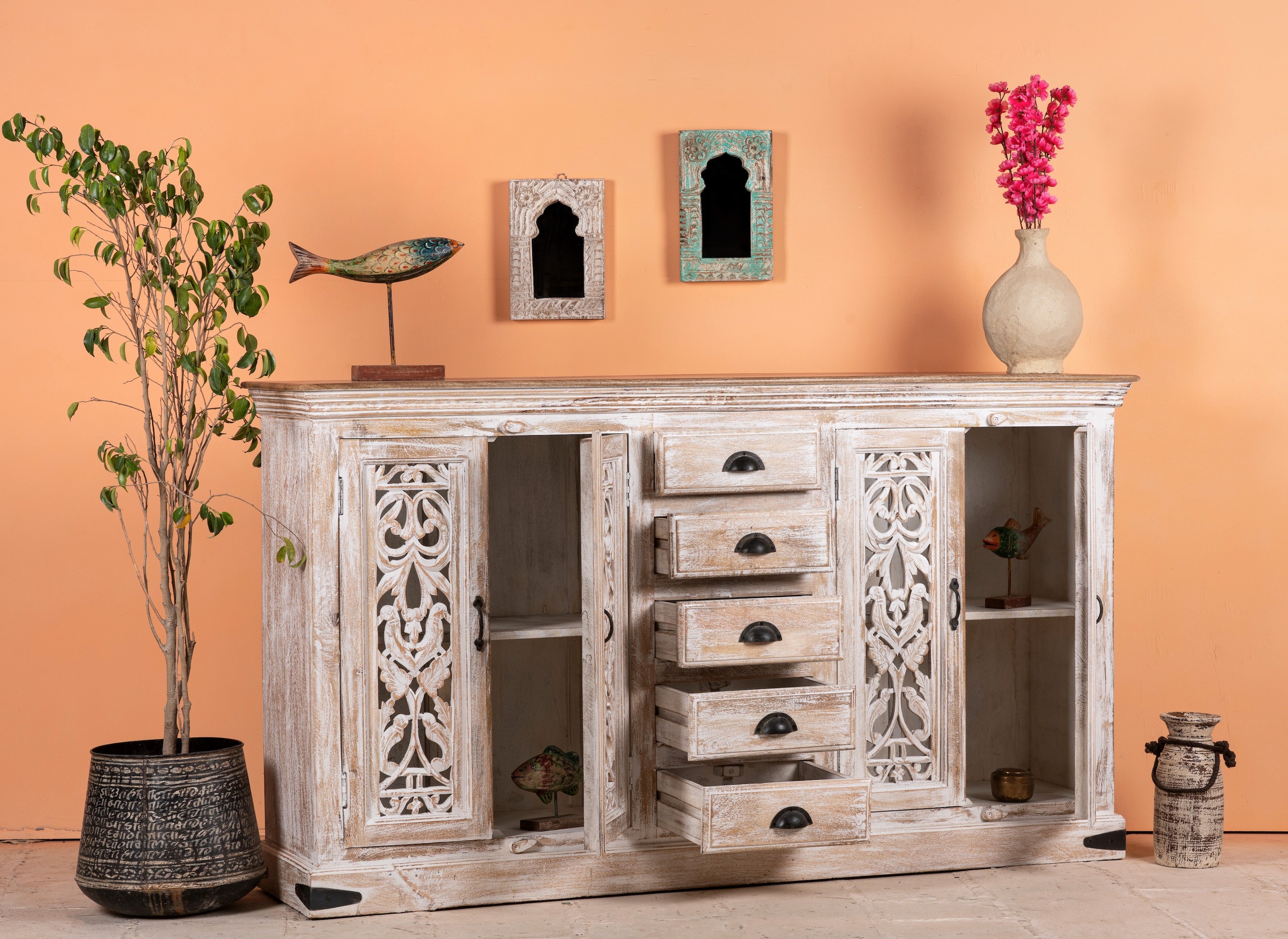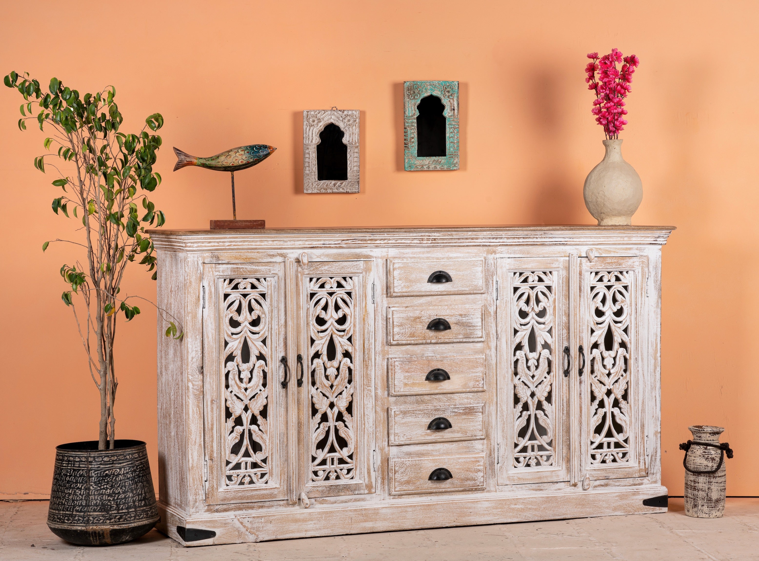 Maak kennis met het handgemaakte Indiase dressoir "Alang", een opmerkelijk stuk dat voortreffelijk vakmanschap en tijdloos design combineert. De betoverende witgekalkte kleur benadrukt de natuurlijke schoonheid van het mangohout en geeft uw ruimte een gevoel van elegantie.