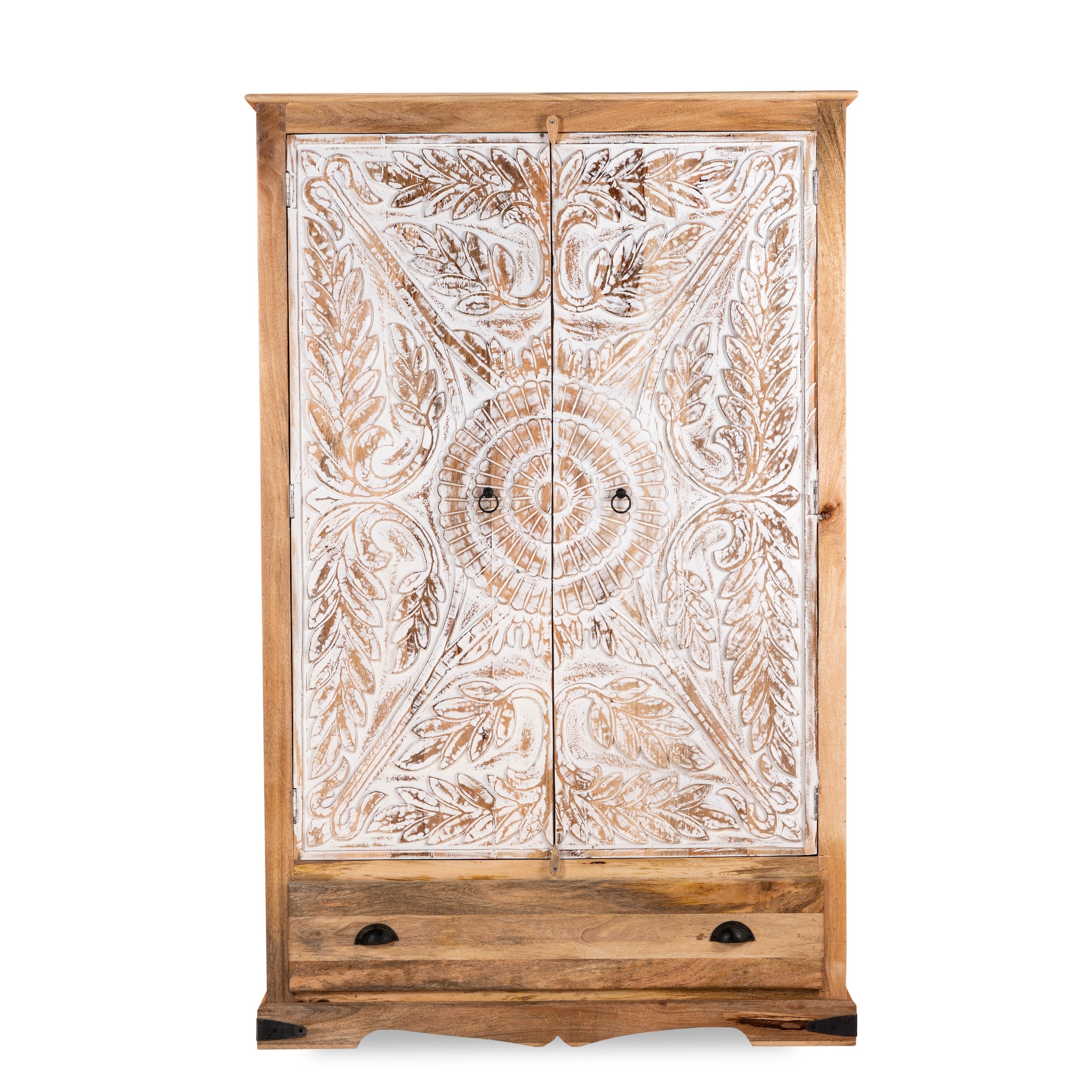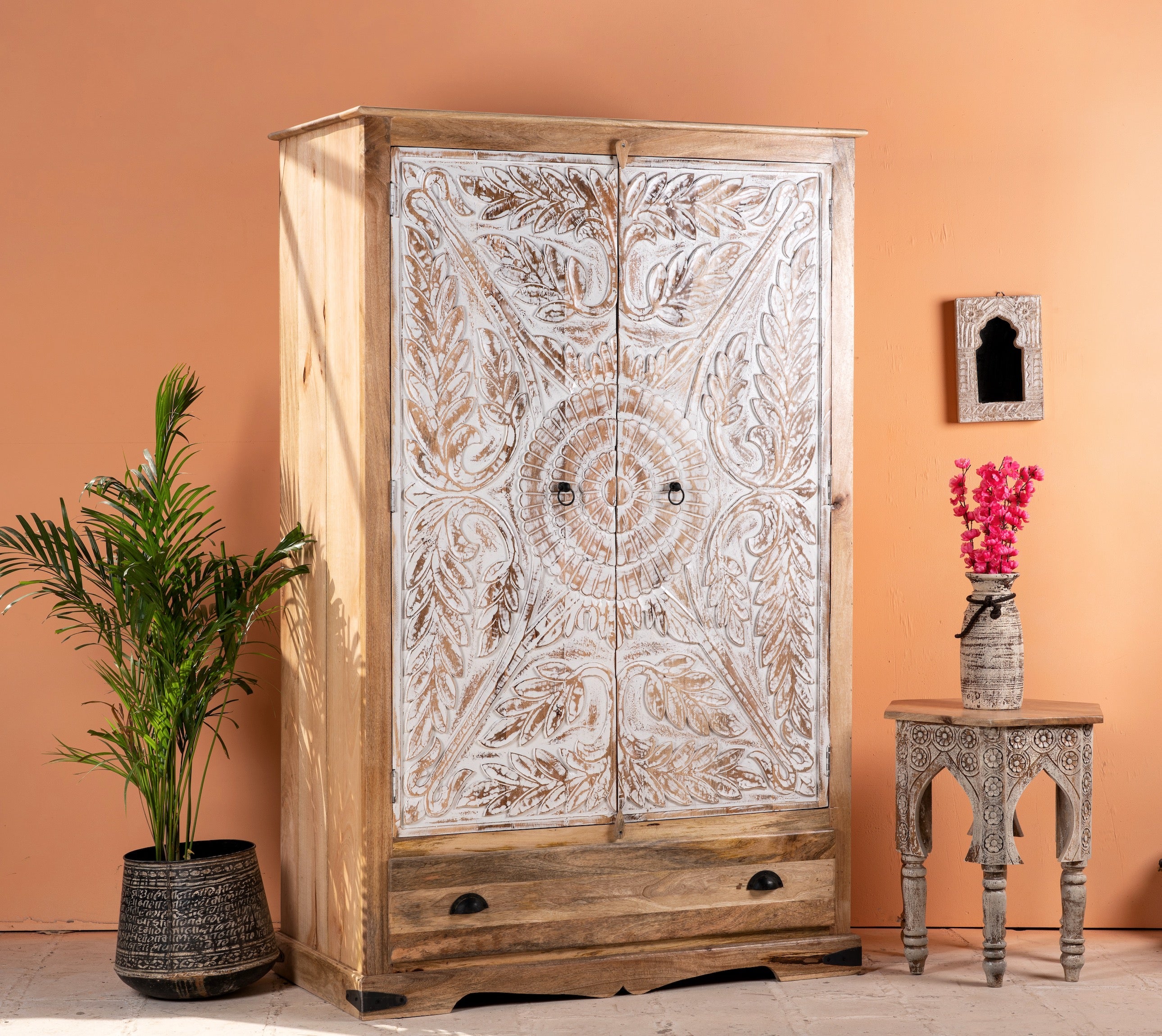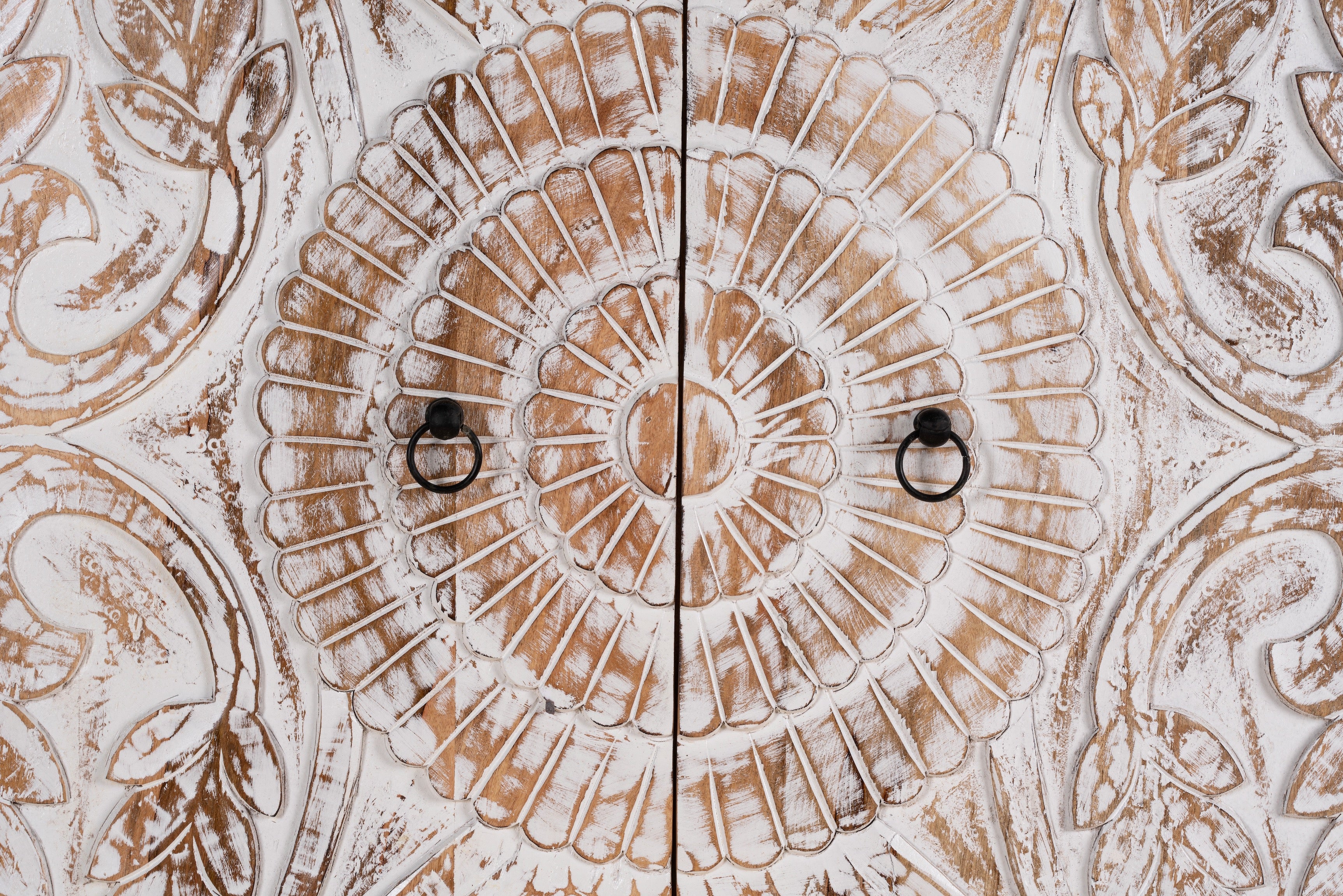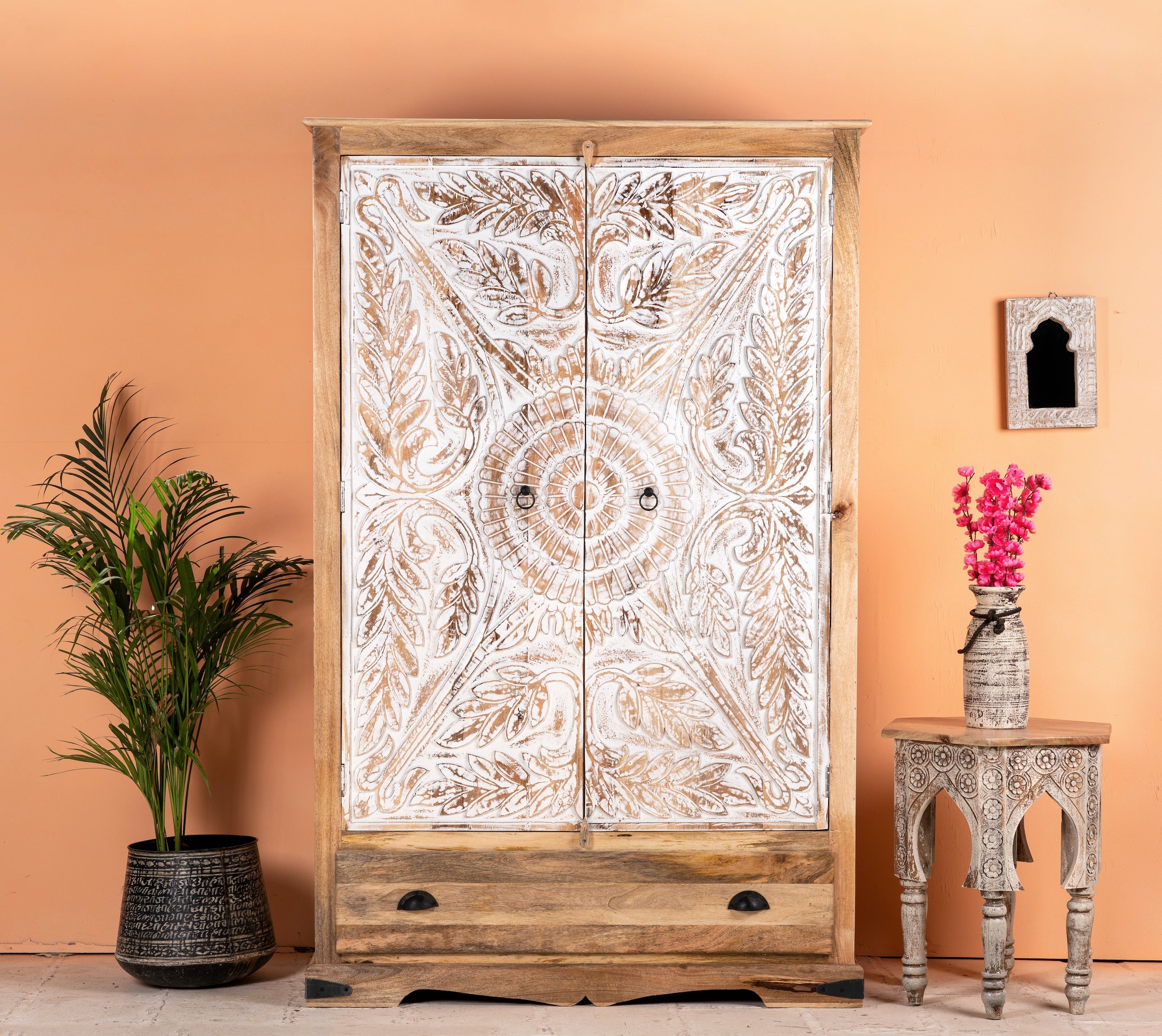Ervaar het voortreffelijke vakmanschap van de "Cheyyur" Indiase handgemaakte kast, een waar meesterwerk dat moeiteloos elegantie en functionaliteit combineert. De grandeur van dit stuk wordt gedefinieerd door de grote witgekalkte deuren versierd met ingewikkelde handgesneden gravures, die de vaardigheid en artisticiteit van Indiase ambachtslieden laten zien.