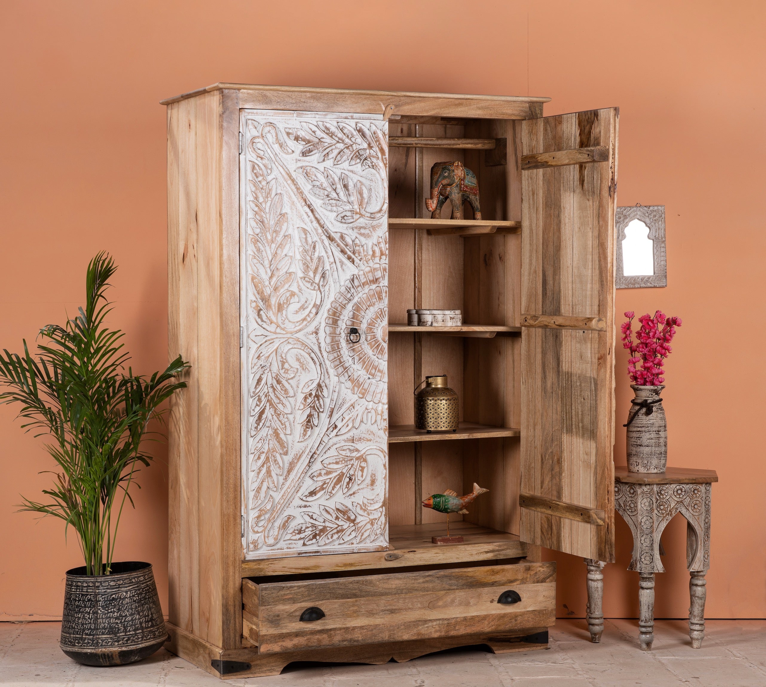 Transformeer uw leefruimte met de charme van de handgemaakte kast "Cheyyur", waar artistiek vakmanschap en functionaliteit samenkomen.