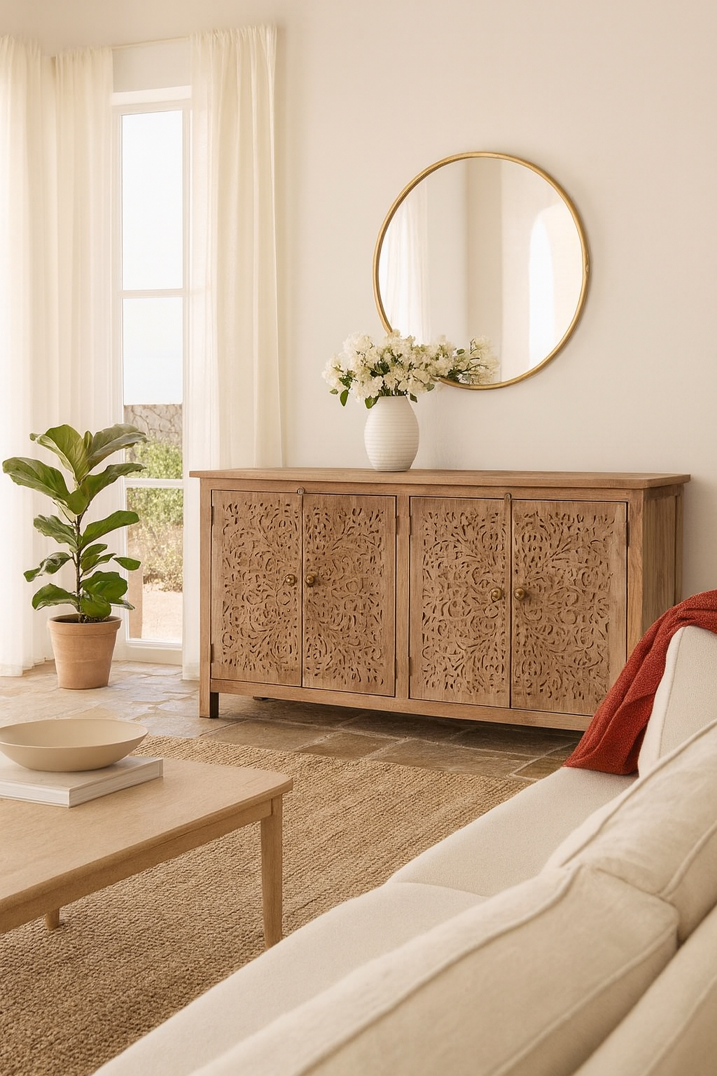 Breng warmte en verfijning in uw huis met dit gesneden acaciahouten dressoir, een perfecte combinatie van natuurlijke schoonheid en functioneel design. Gemaakt van massief acaciahout, toont dit stuk verbluffende houtnerfpatronen, versterkt door delicate, met de hand gesneden details die textuur en karakter toevoegen.