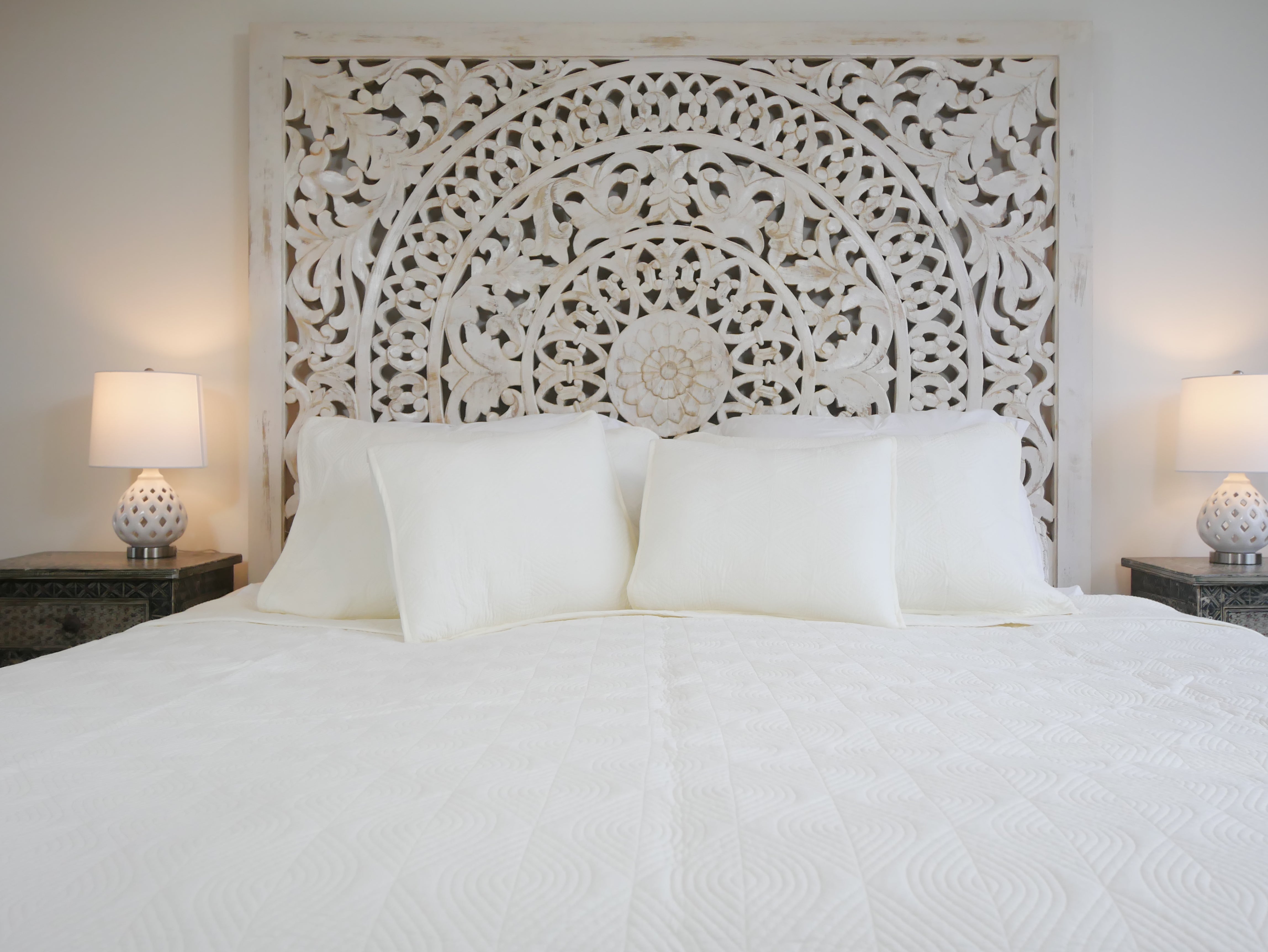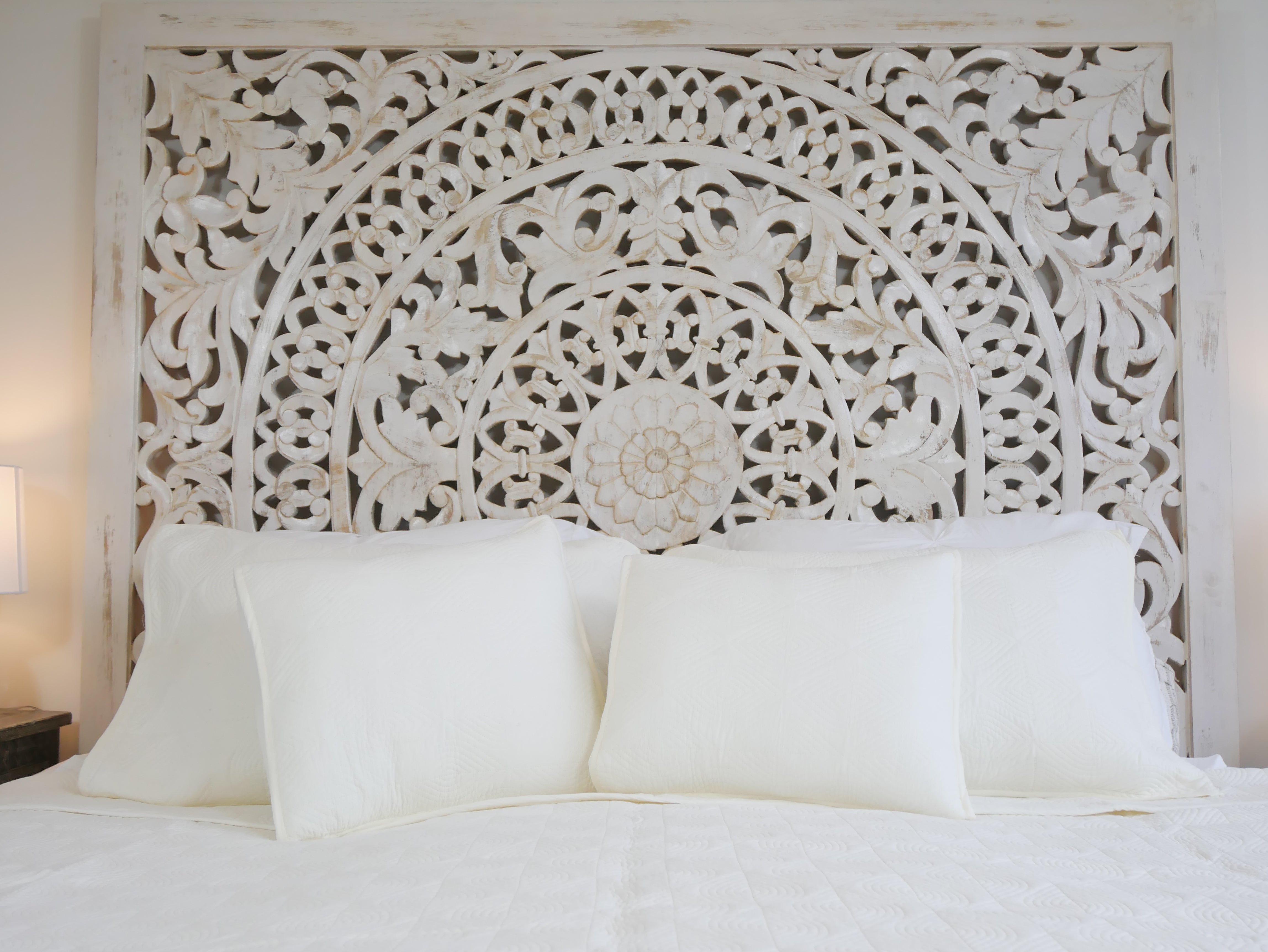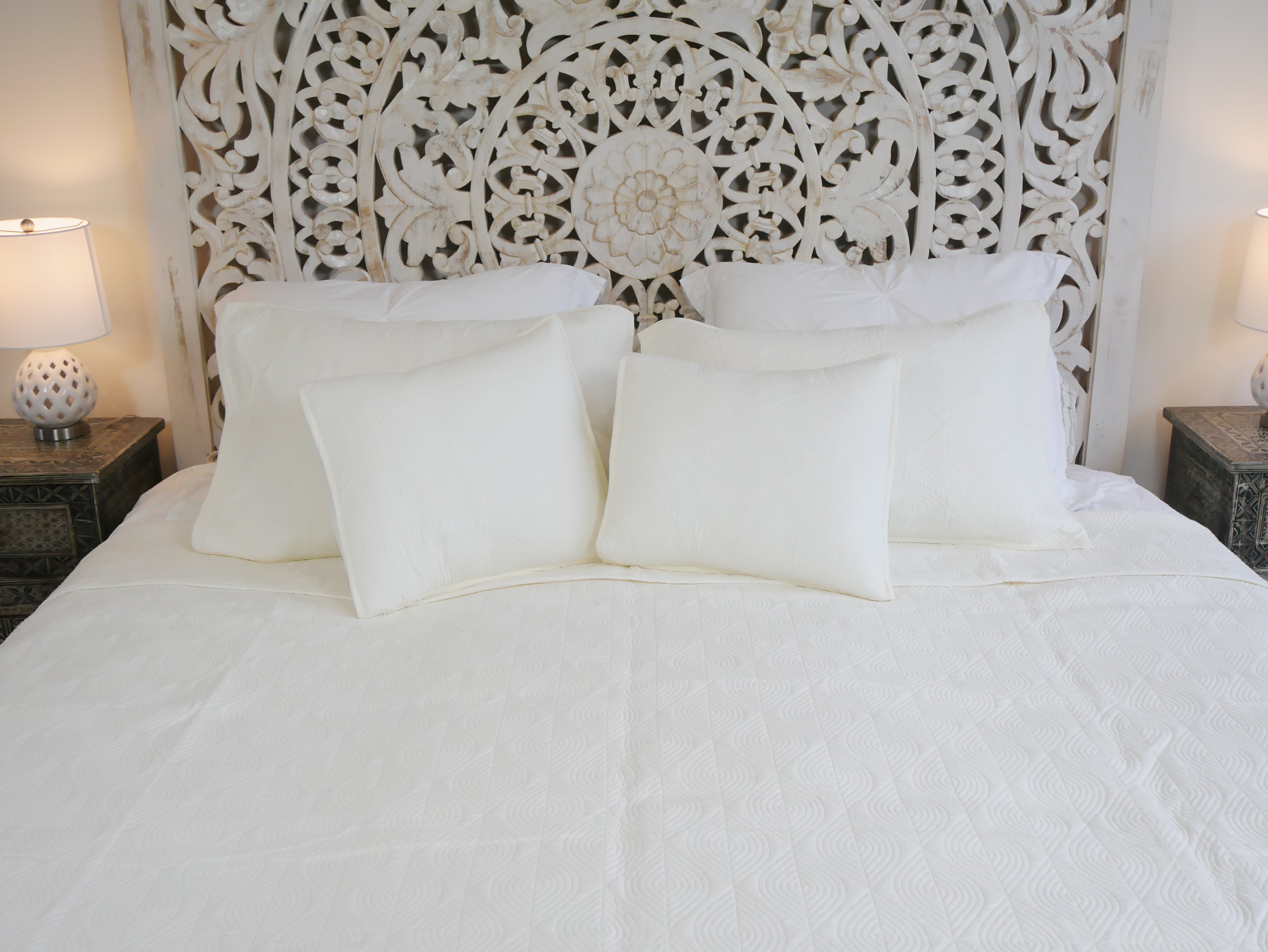 Dit bedovertrek, gemaakt van 100% ongebleekt natuurlijk katoen en rijkelijk geborduurd, met 2 kleine en 2 grote kussenslopen, brengt pure luxe in uw slaapkamer of als bankovertrek in uw woonkamer.