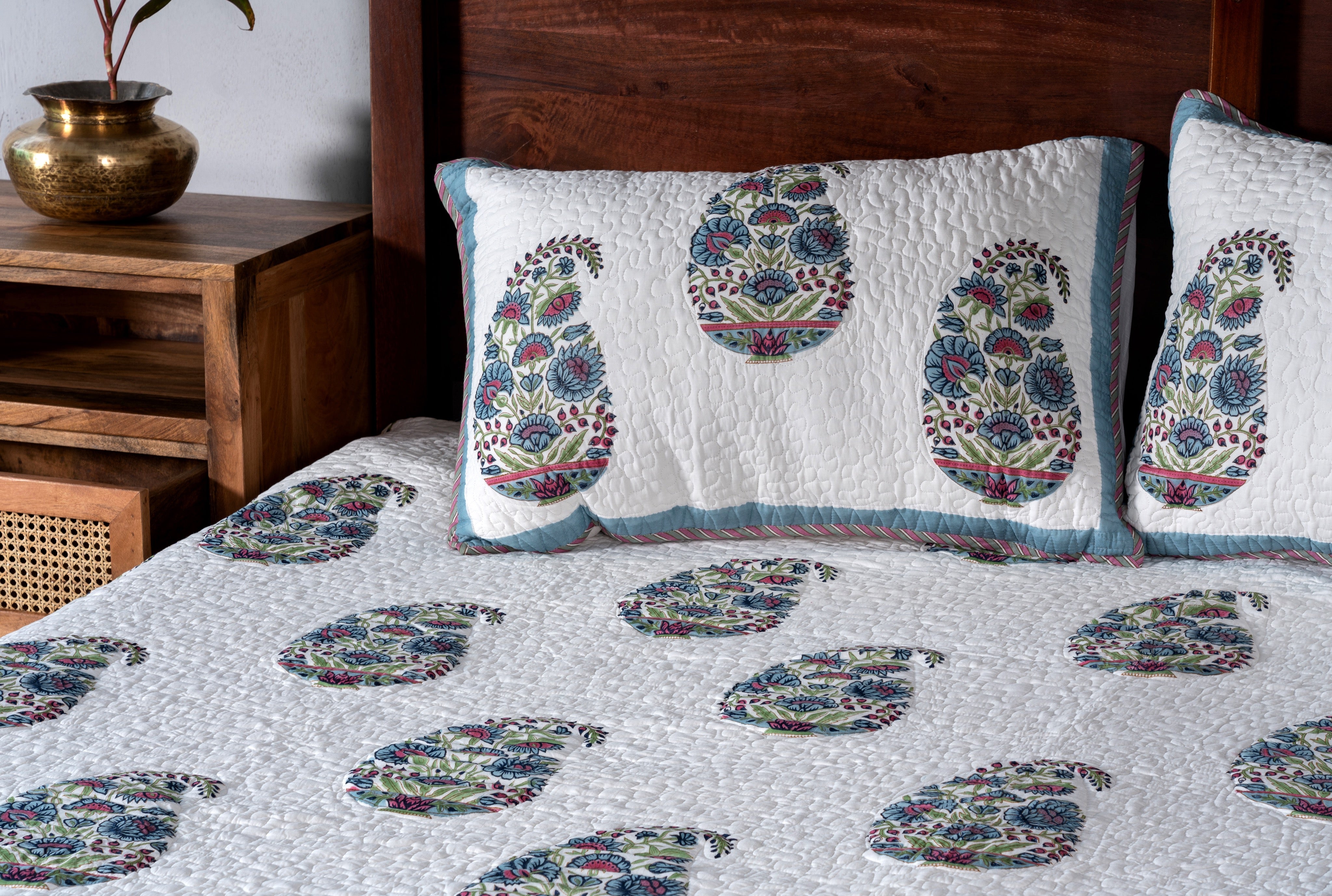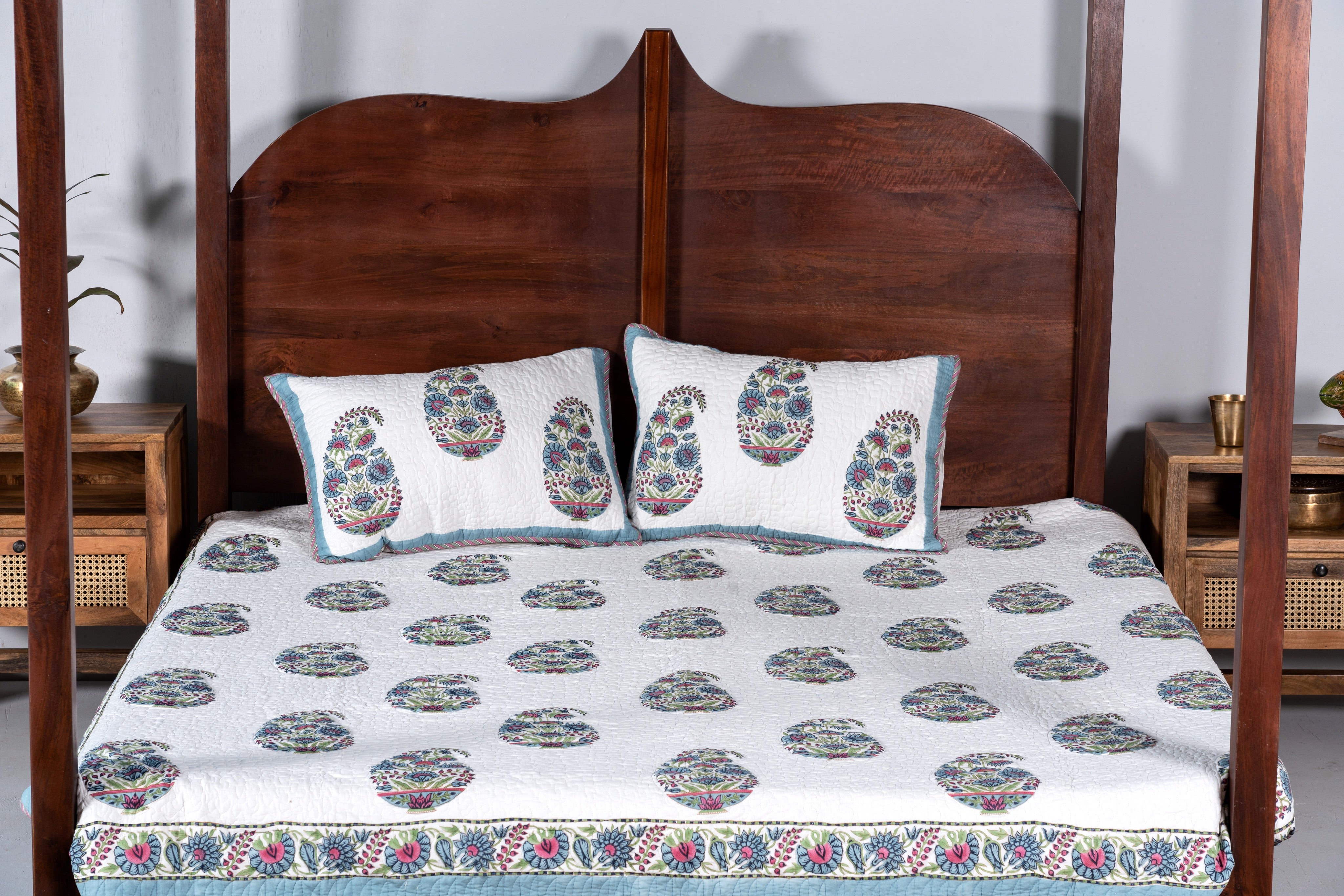 Deze prachtige handgemaakte 230x270 cm blok bedrukte bedsprei is aan beide kanten bedrukt in typische bloemenpatronen uit Rajasthan. De bedsprei kan in twee verschillende patrooncombinaties worden gedraaid.