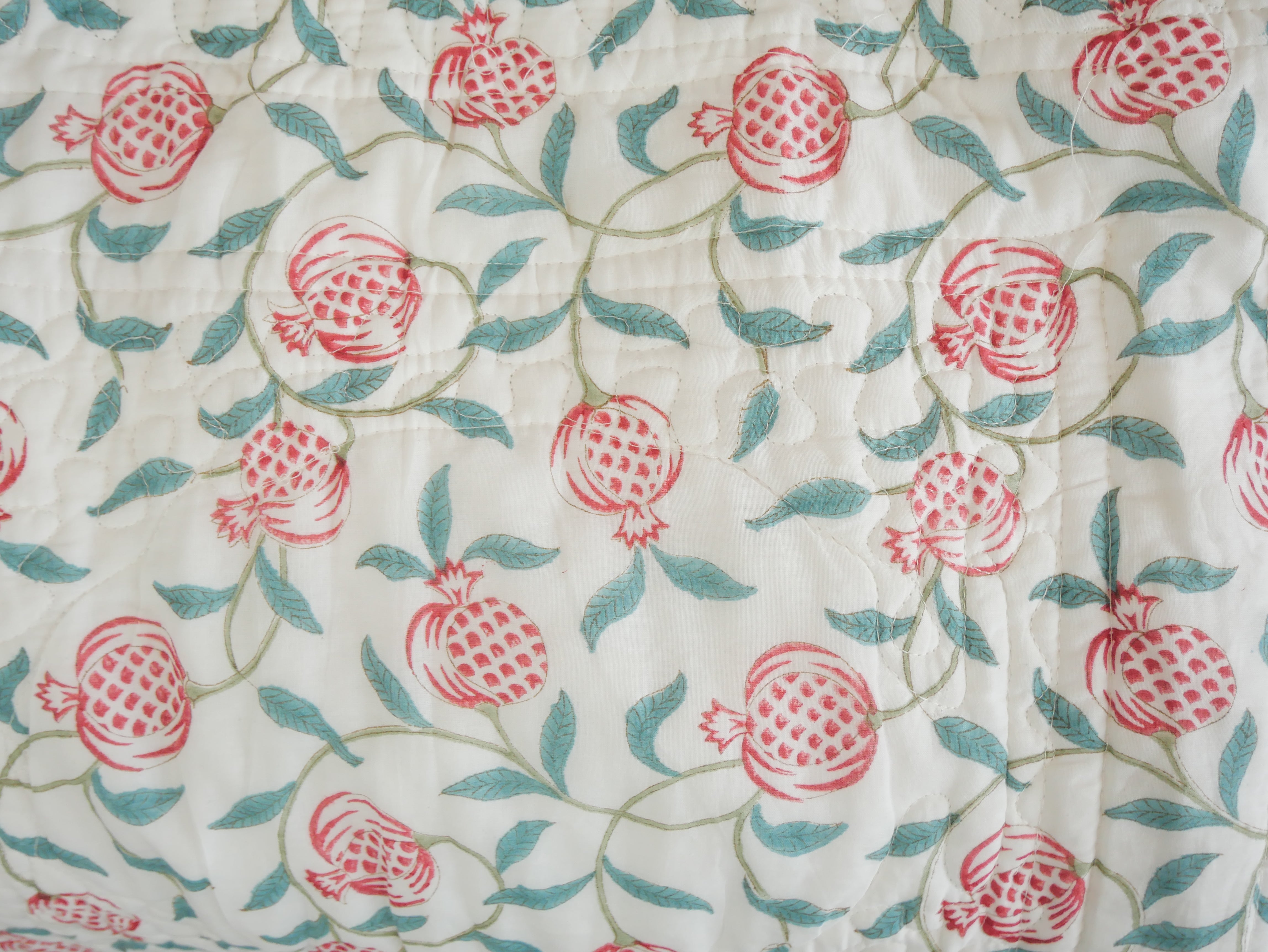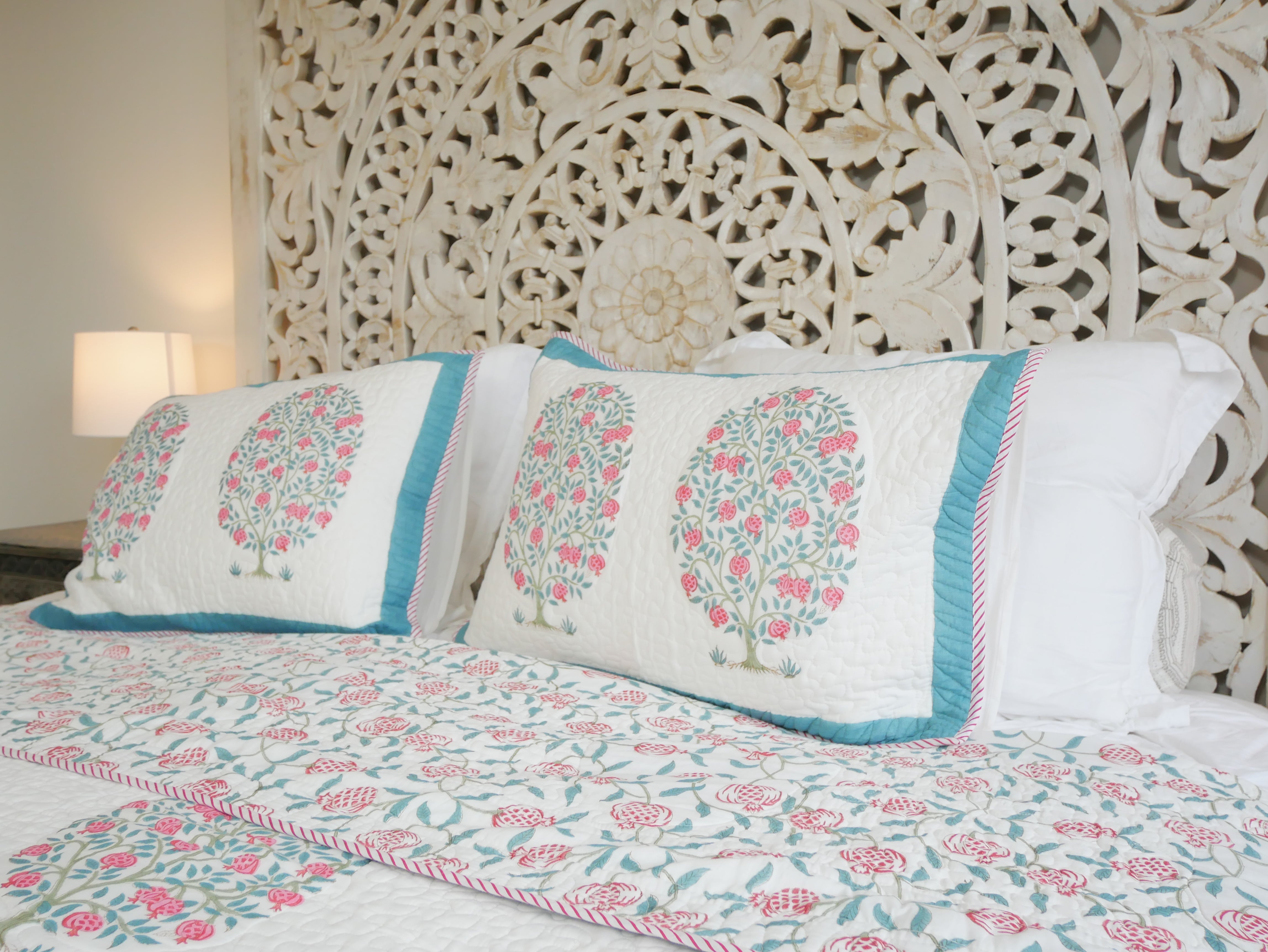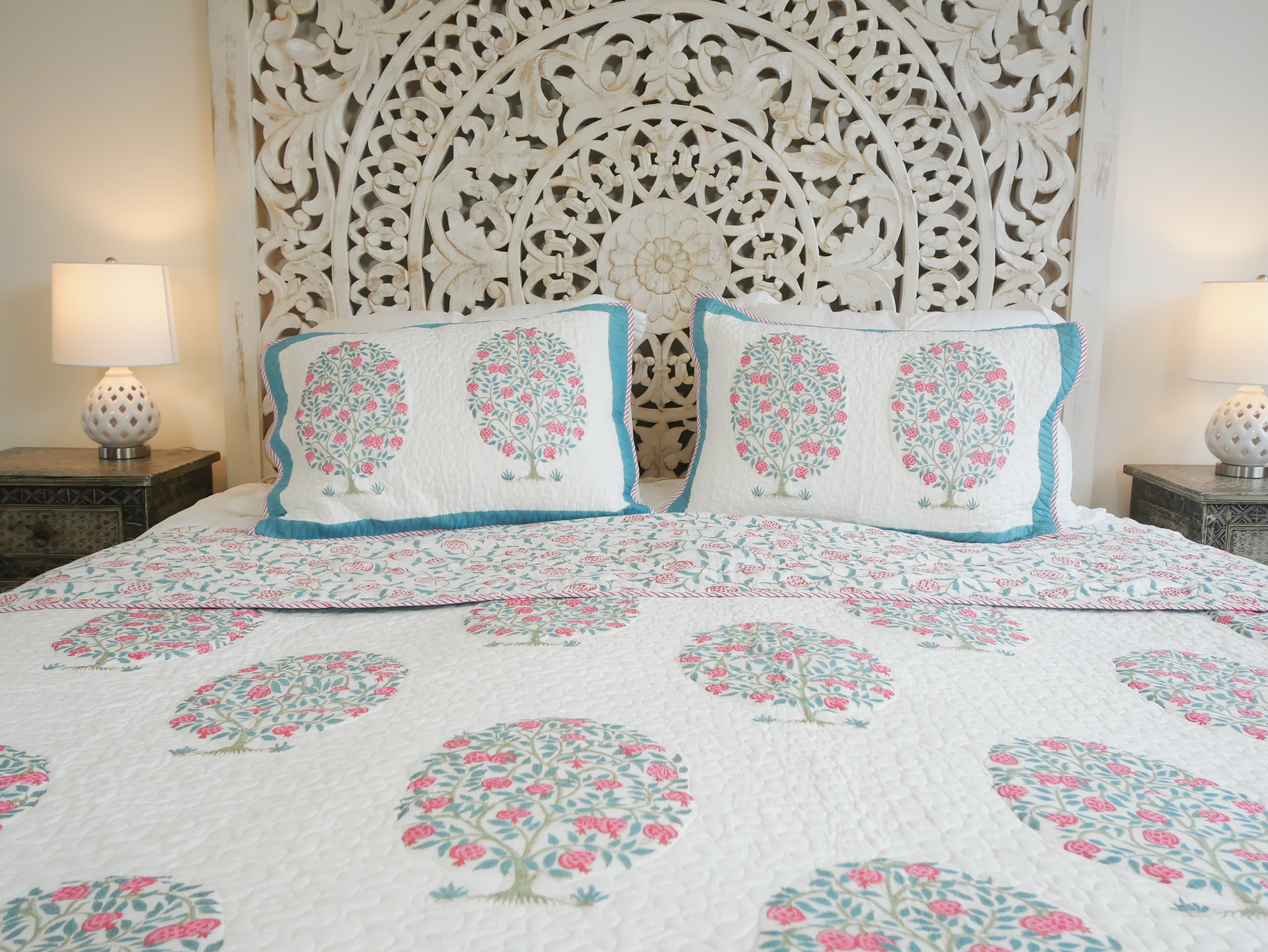 Deze prachtige handgemaakte bedsprei met blokprint van 220x250 cm is aan beide kanten bedrukt en kan in twee verschillende patrooncombinaties worden gedraaid.