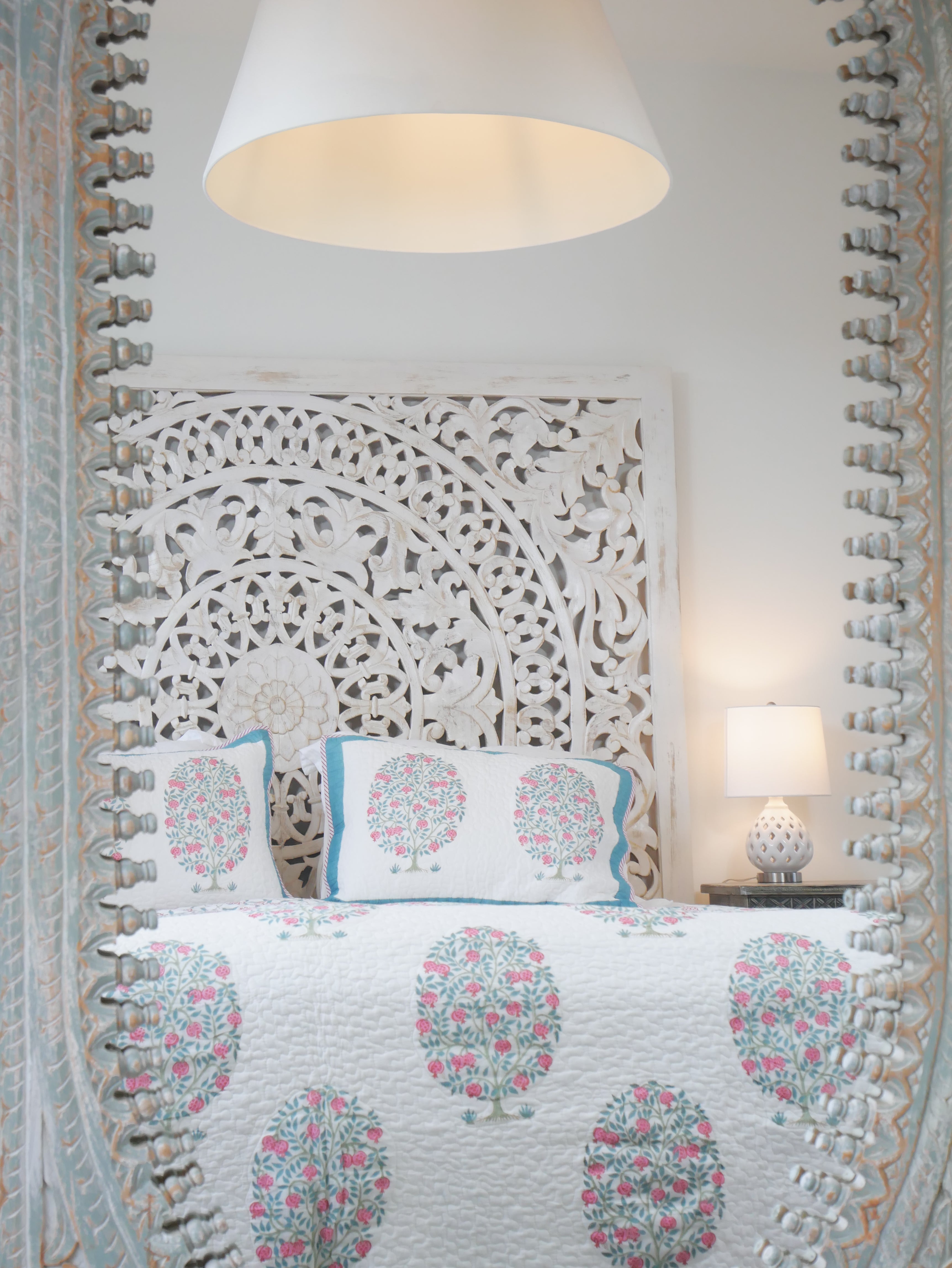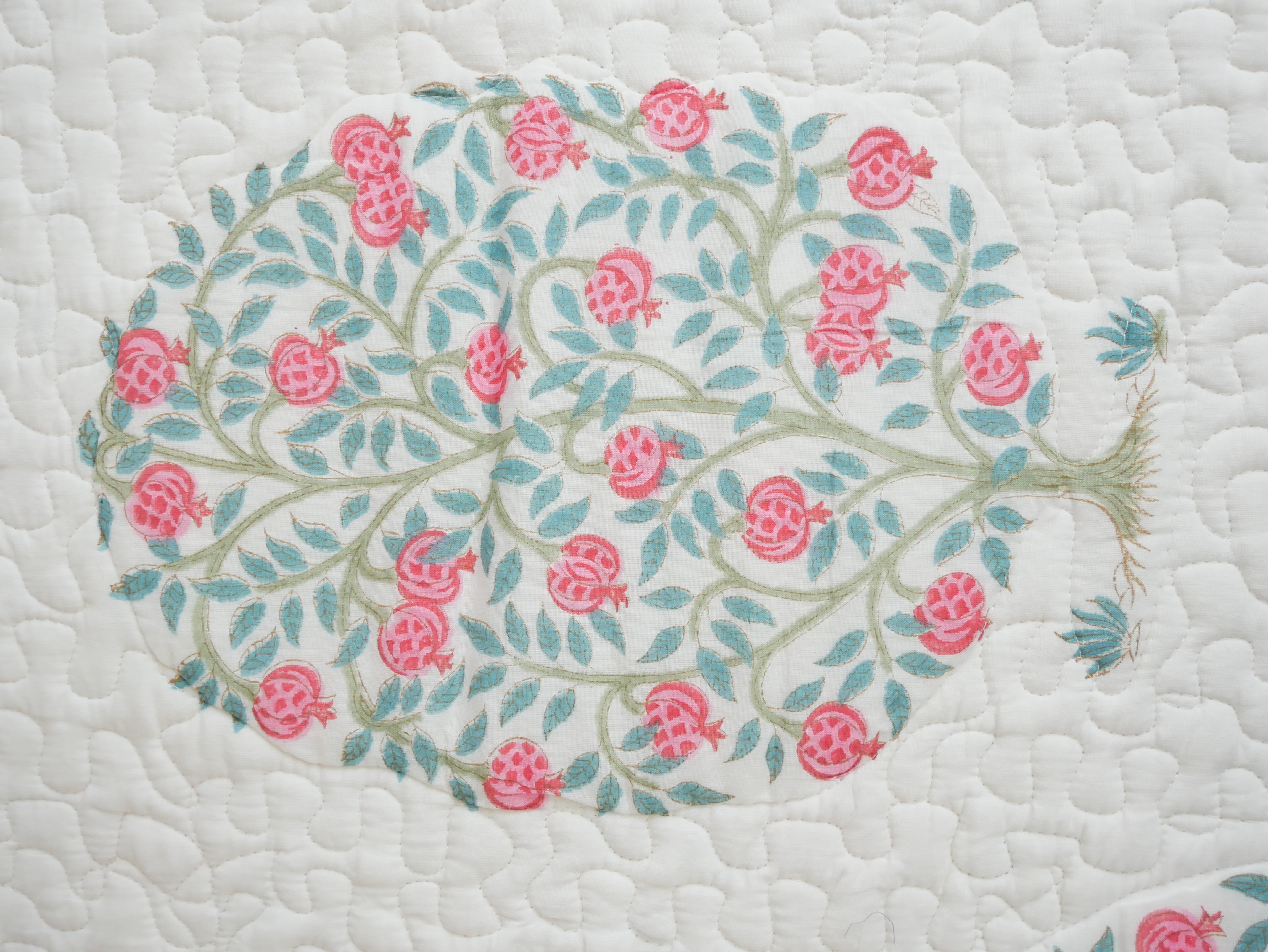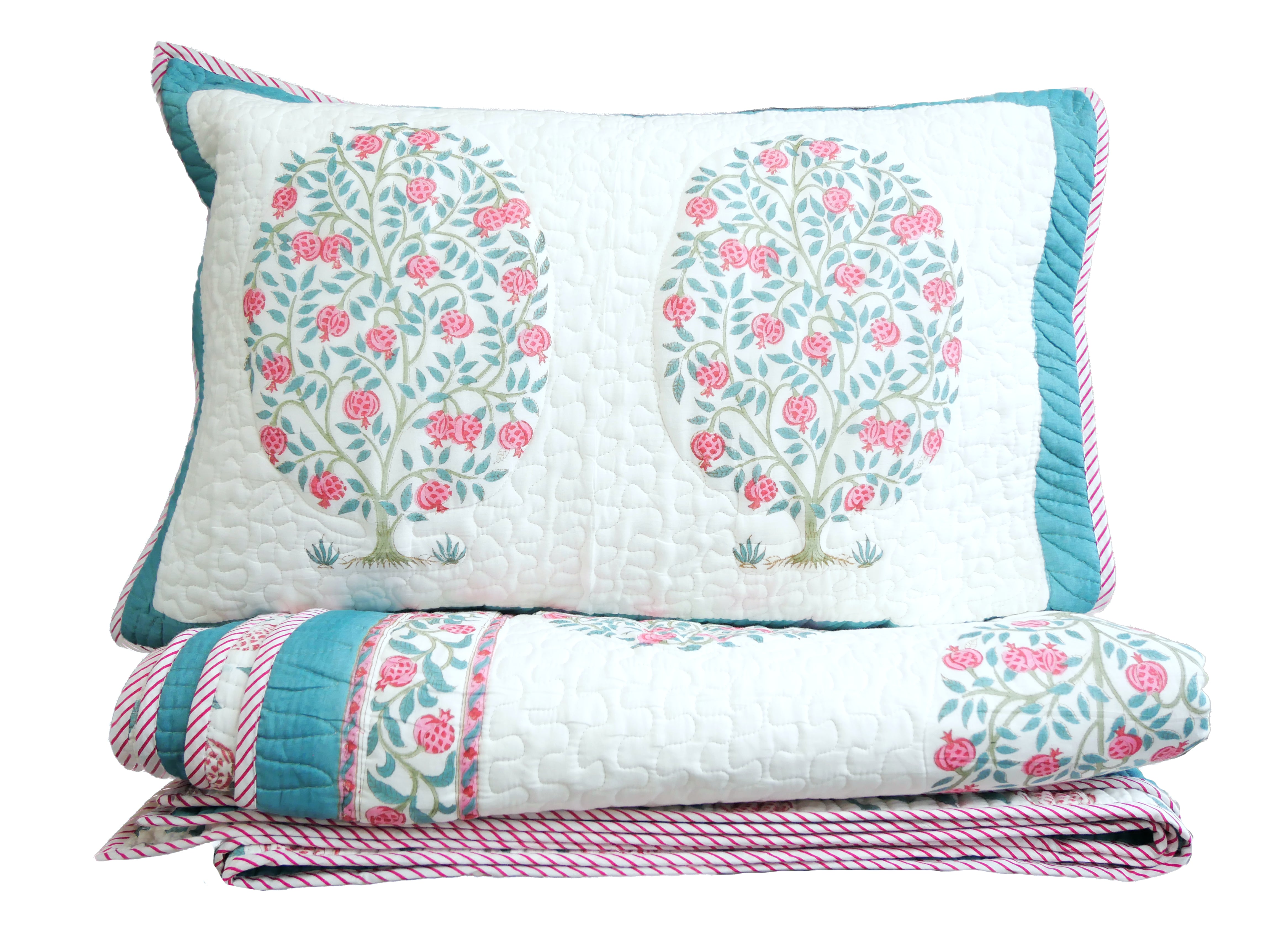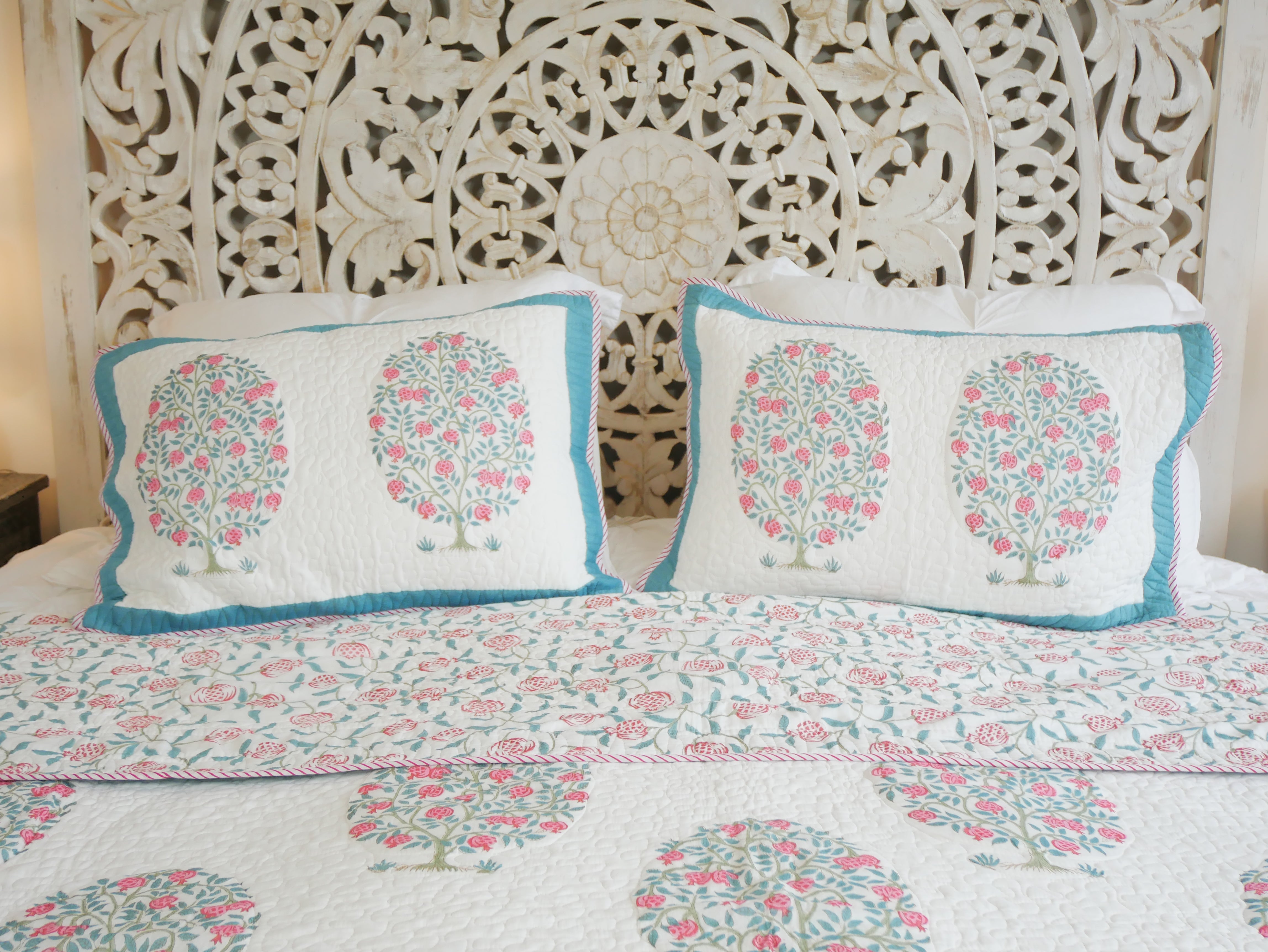 Deze prachtige handgemaakte bedsprei met blokprint van 220x250 cm is aan beide kanten bedrukt en kan in twee verschillende patrooncombinaties worden gedraaid.