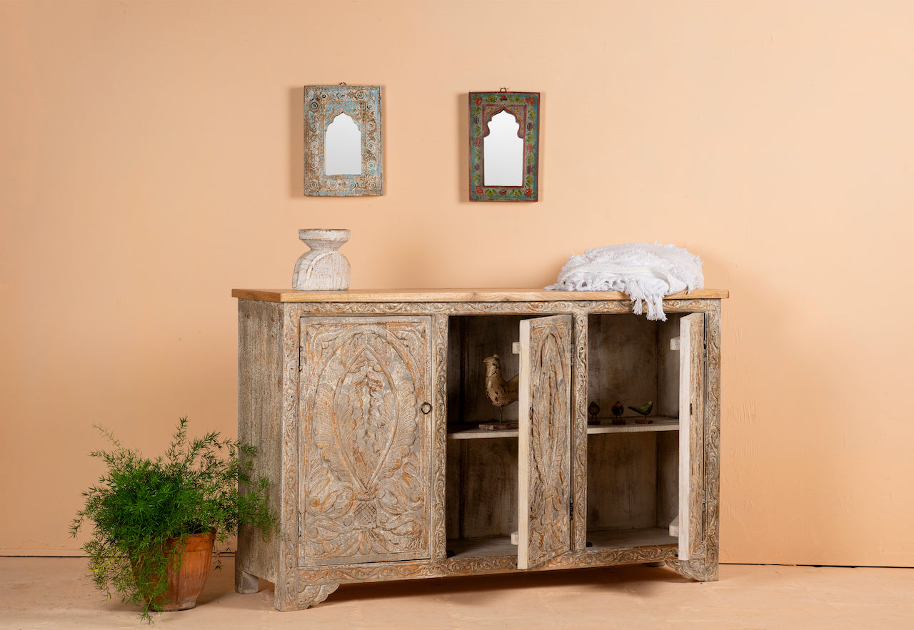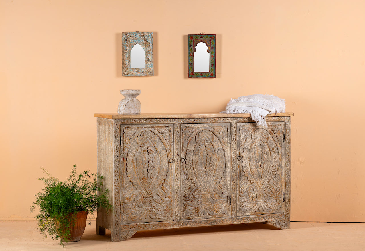 Dit elegante handgesneden mangohouten dressoir is een waar meesterwerk van vintage design. Met ingewikkelde bloemensnijwerken en een verfijnde drielaagse kleurafwerking straalt dit stuk charme en karakter uit. De stevige constructie en ruime driedeurs opbergruimte maken het net zo functioneel als mooi, perfect om de esthetiek van elke kamer te verbeteren met zijn tijdloze aantrekkingskracht.