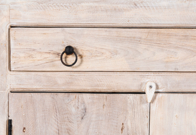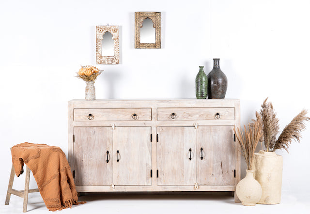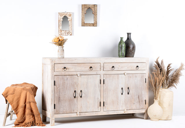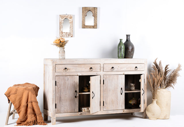 Liefhebbers van de zogenaamde "Ibiza-stijl" zijn helemaal in de mode met dit prachtige, gezandstraalde dressoir Barkal van gerecycled teakhout. Het witgekalkte, oude hout in strandstijl is eenvoudig te integreren in elke omgeving en brengt een beetje vakantiesfeer in elke woonruimte.