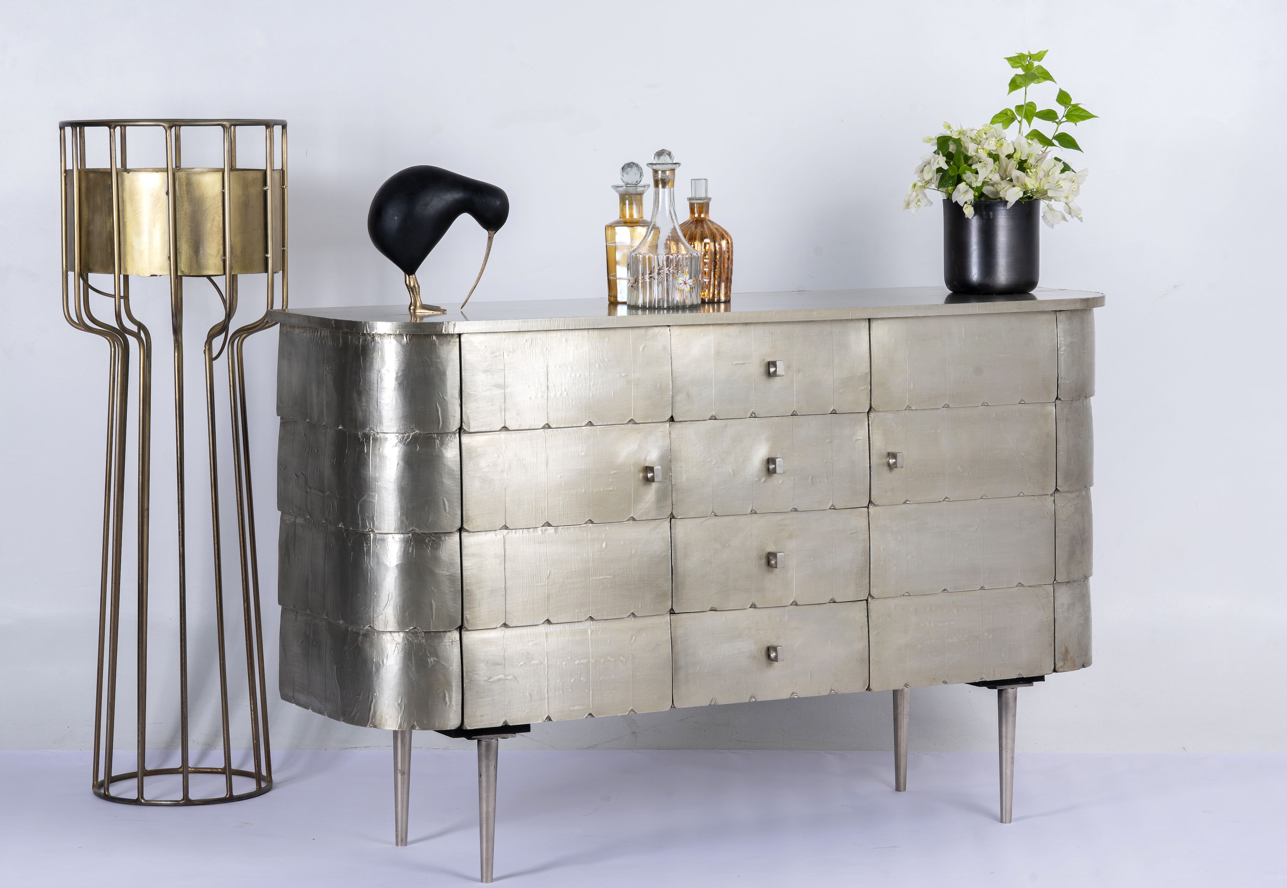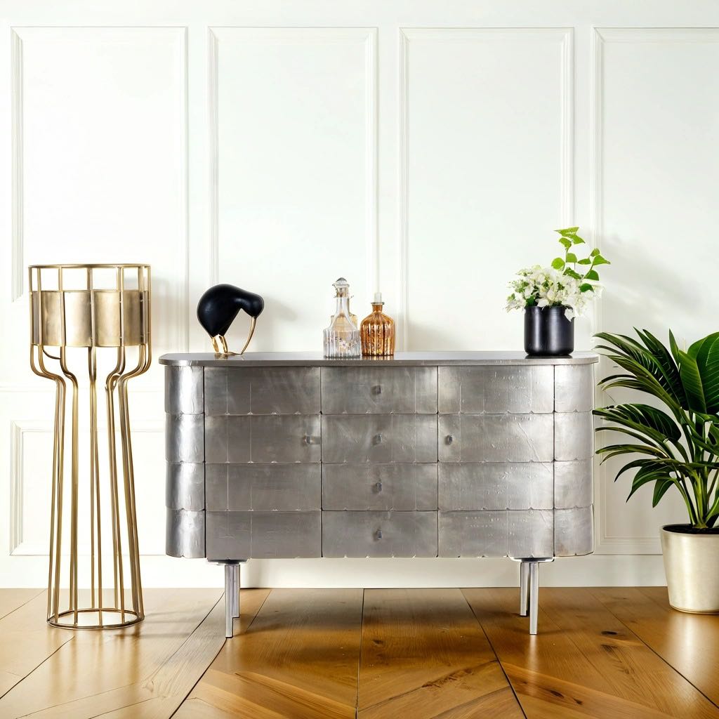 Deze uit hout gesneden kast met witte metalen bekleding is meer dan alleen een opbergoplossing; het is een statementstuk dat de schoonheid en functionaliteit van elke kamer in je huis zal verbeteren.