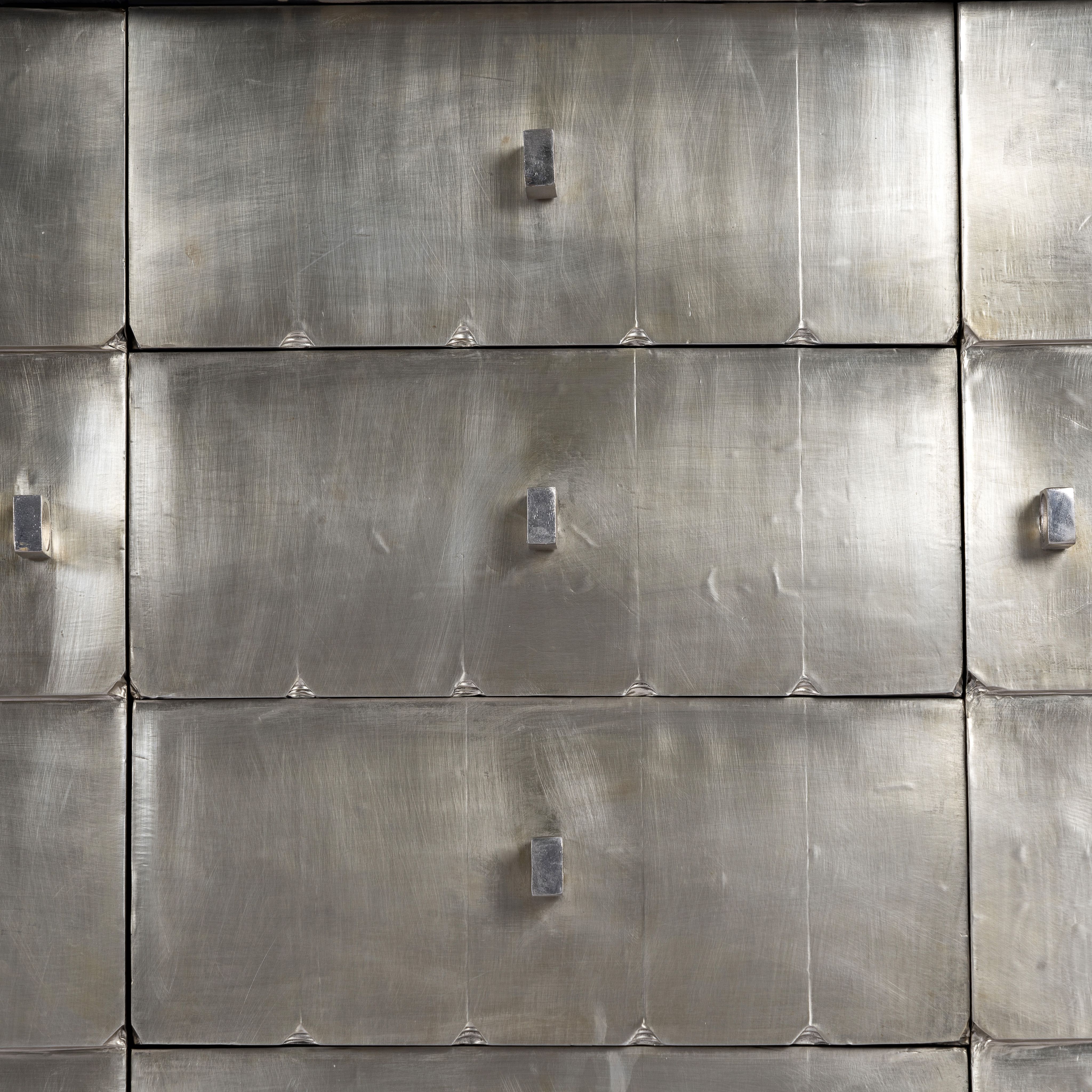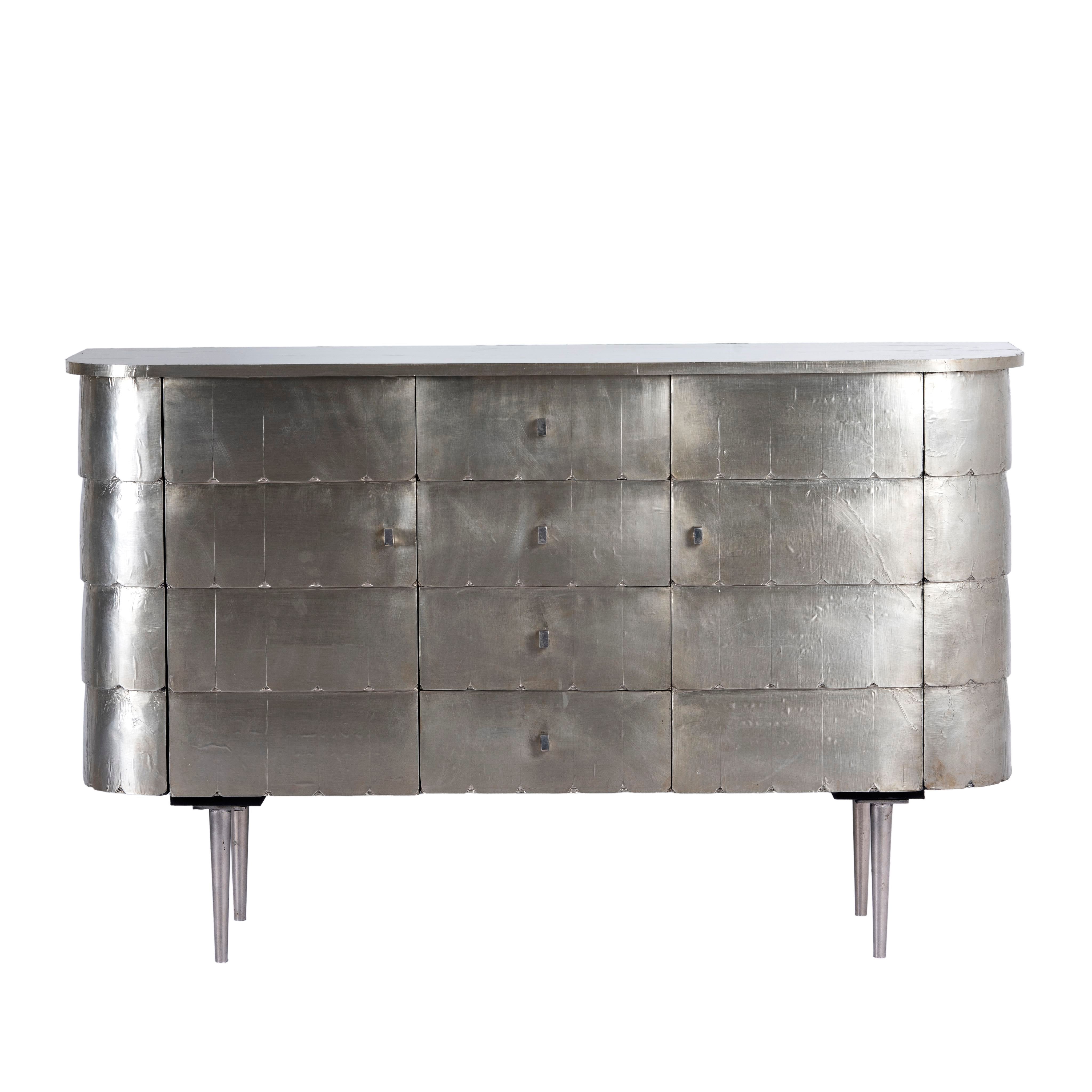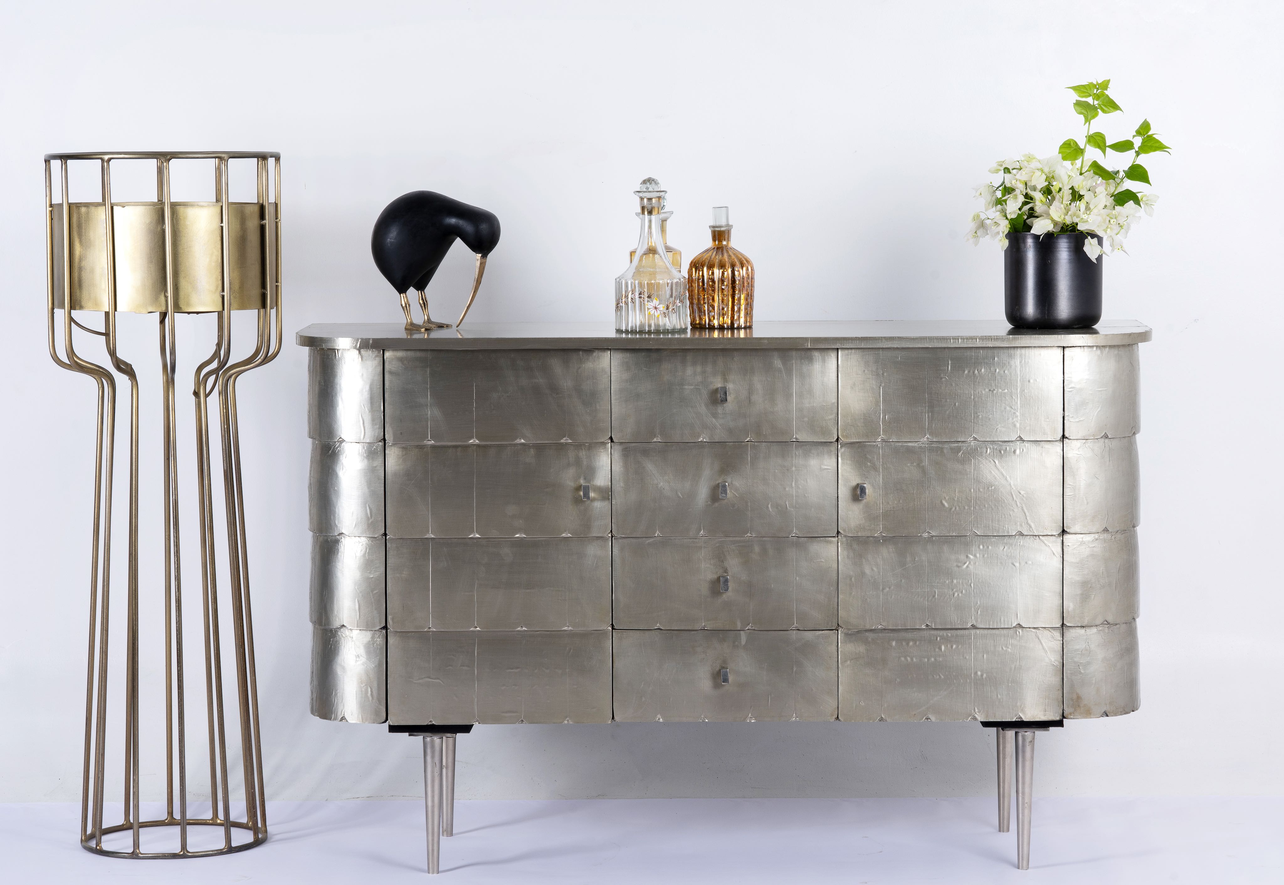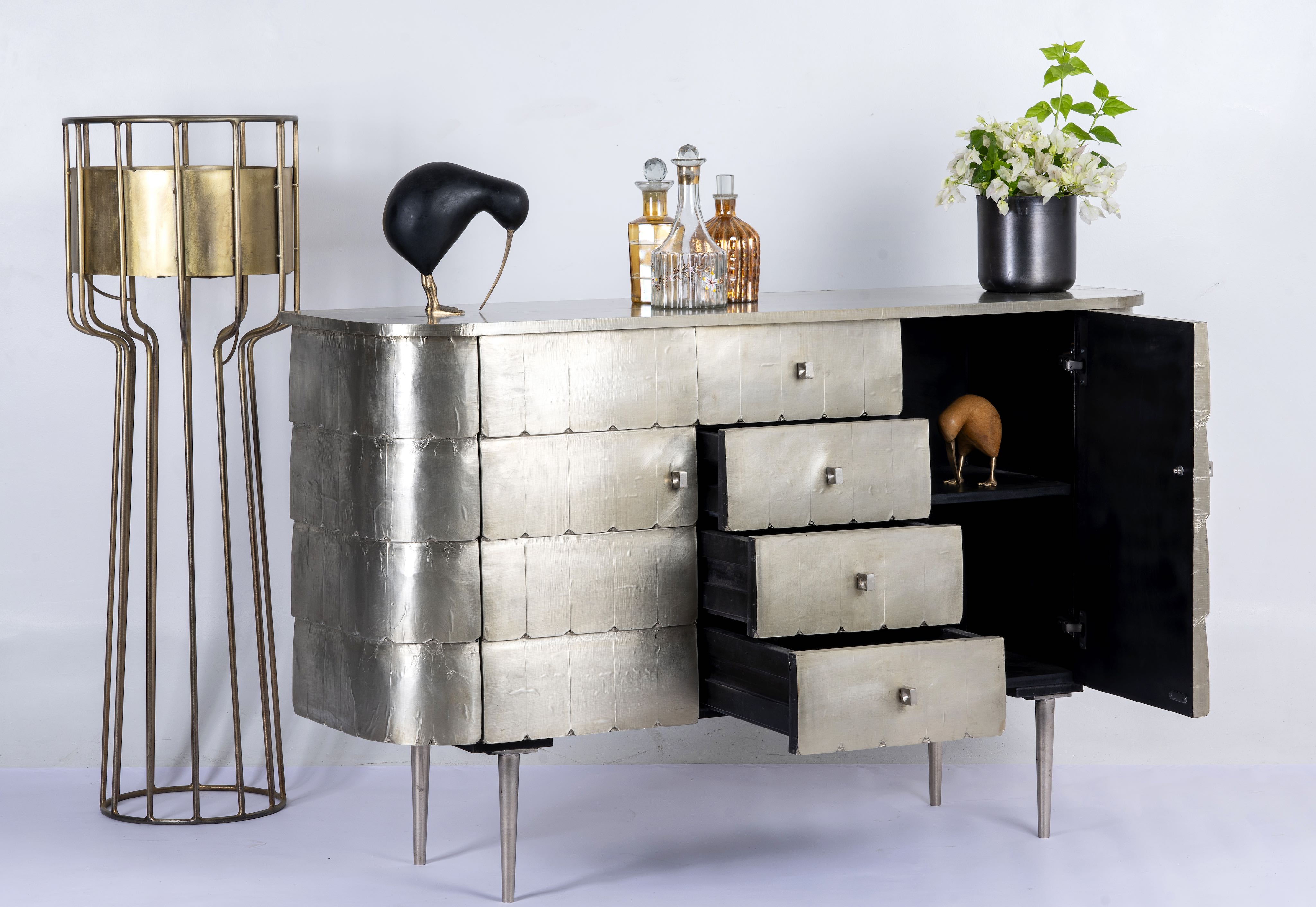 Het oppervlak van de kast is vakkundig bekleed met wit metaal. Het ingewikkelde houtsnijwerk wordt geaccentueerd door de glanzende metalen afwerking, wat een vleugje elegantie en verfijning aan het stuk toevoegt.