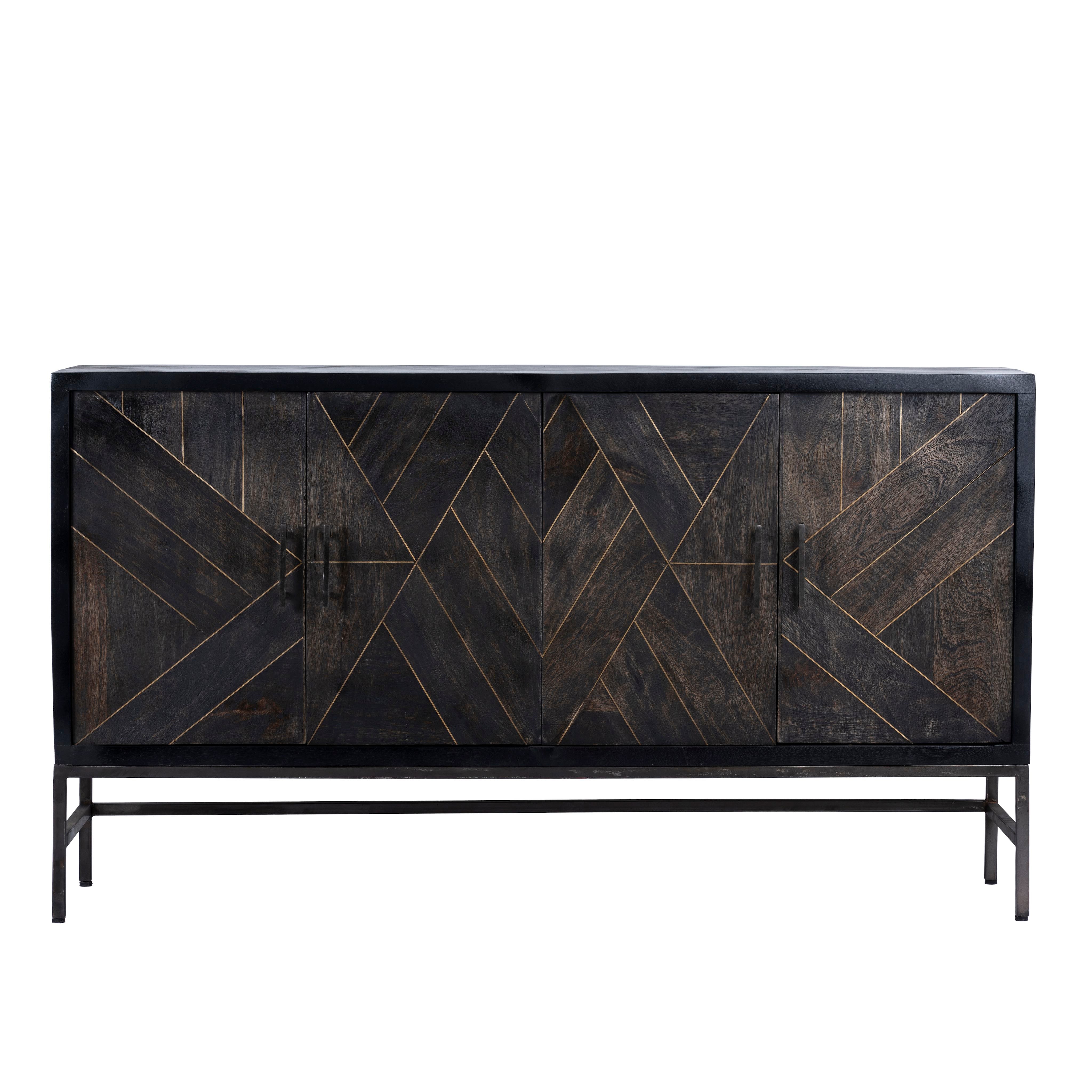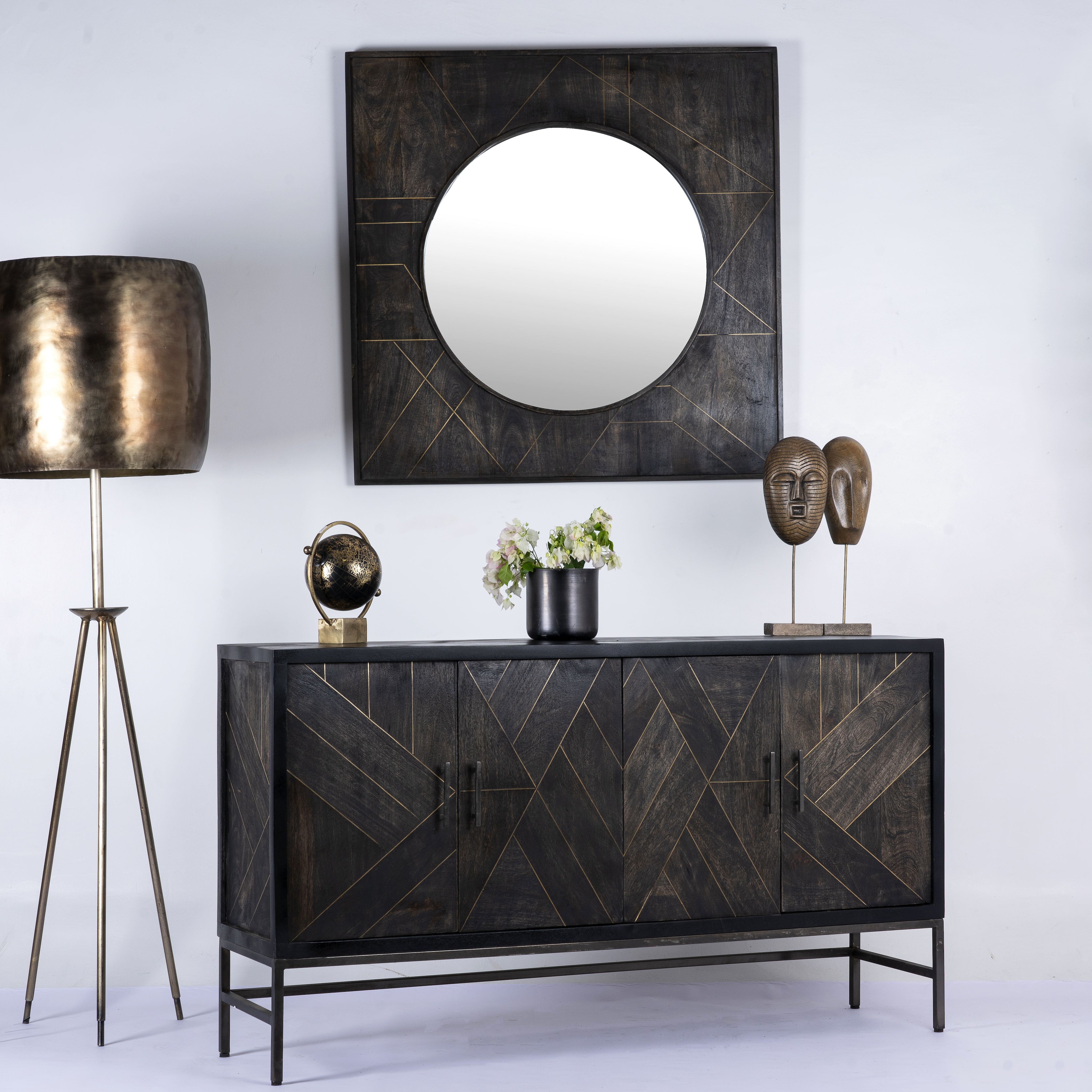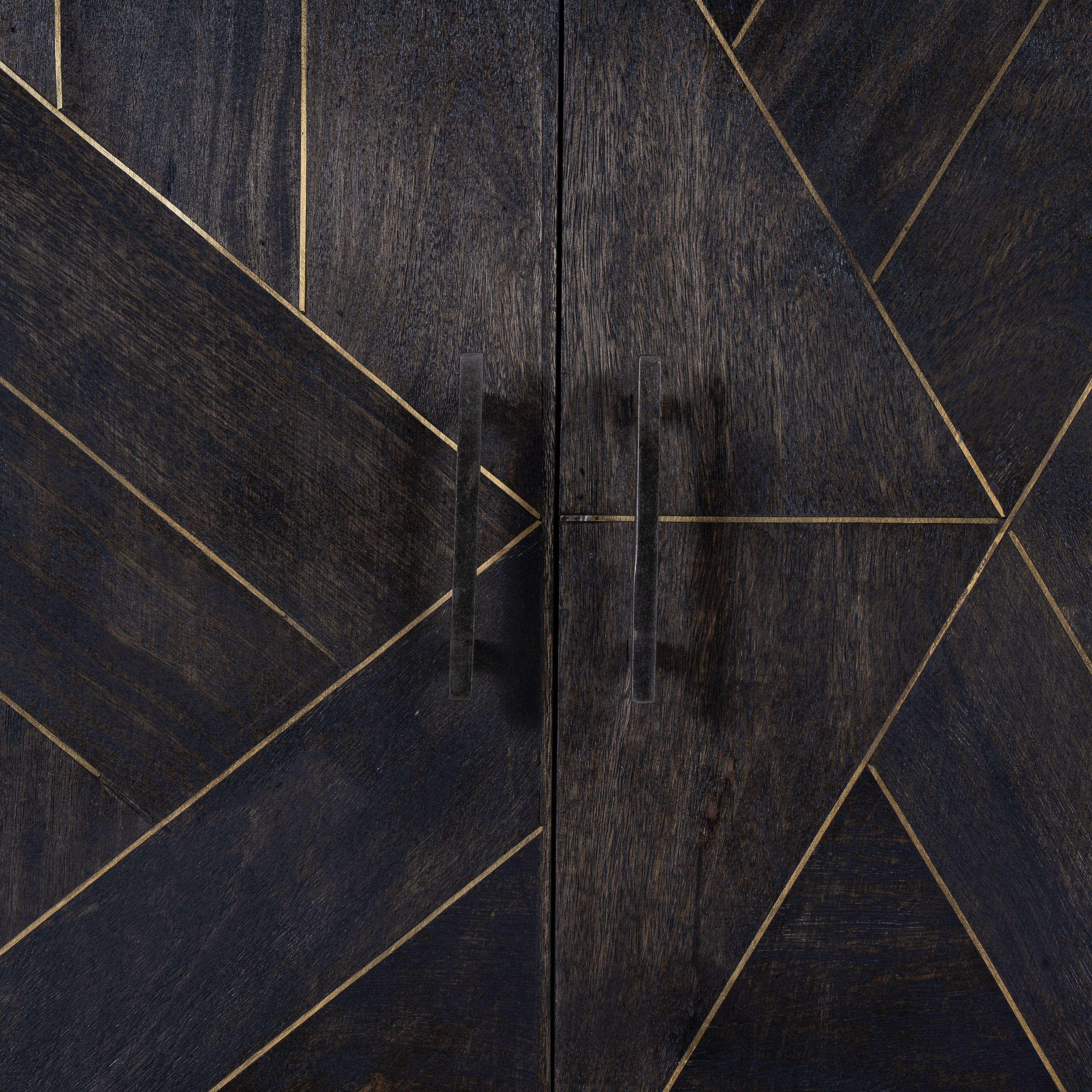 Deze elegante houten kast met vier deuren maakt echt een statement. De nauwkeurig met de hand vervaardigde koperen inlegstukken vormen een opvallend contrast met de zwarte afwerking. Ondersteund door een grijs en zwart vernikkeld metalen onderstel, straalt dit stuk verfijning uit. Zwarte meubels laten altijd een blijvende indruk achter en dienen als een opvallend middelpunt in moderne interieurs.