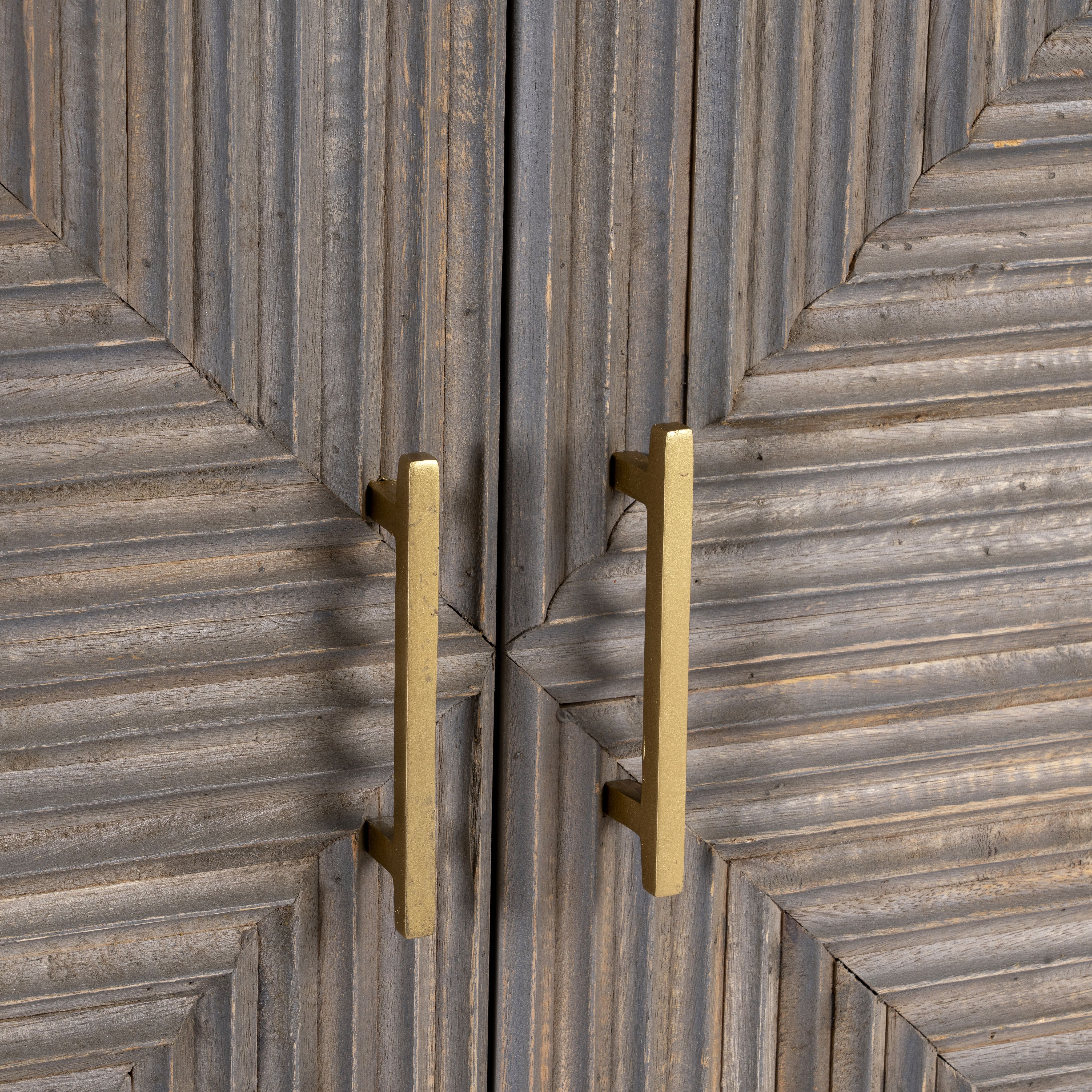 Het dressoir is versierd met handgemaakte lineaire gravures, waarbij elke lijn minutieus is uitgesneden door bekwame ambachtslieden. Deze gravures creëren een strak, gestructureerd ontwerp dat visuele interesse en een eigentijds tintje aan het stuk toevoegt. De lineaire patronen steken af tegen het grijsgewassen hout en benadrukken het ambachtelijke vakmanschap en de aandacht voor detail.