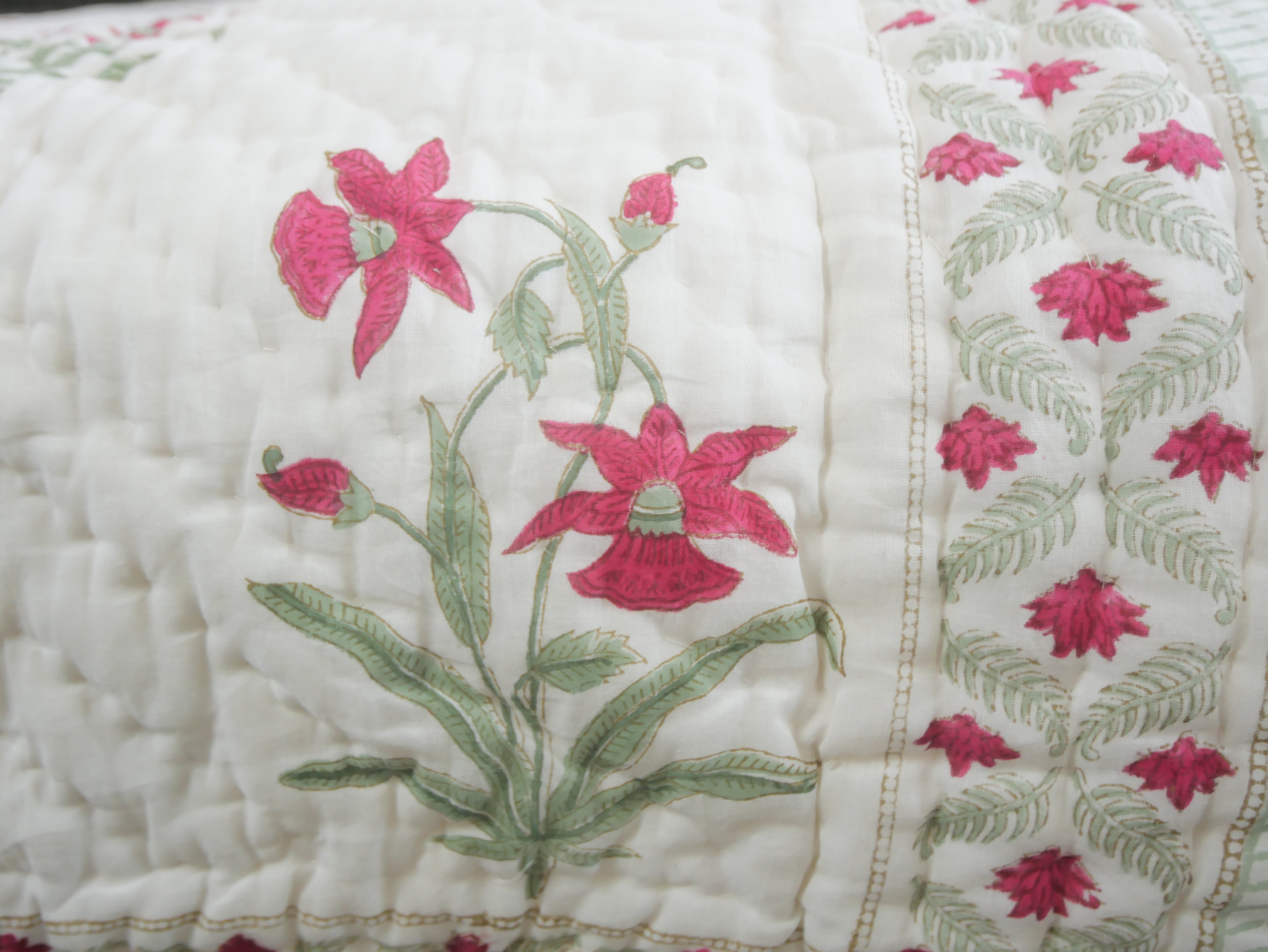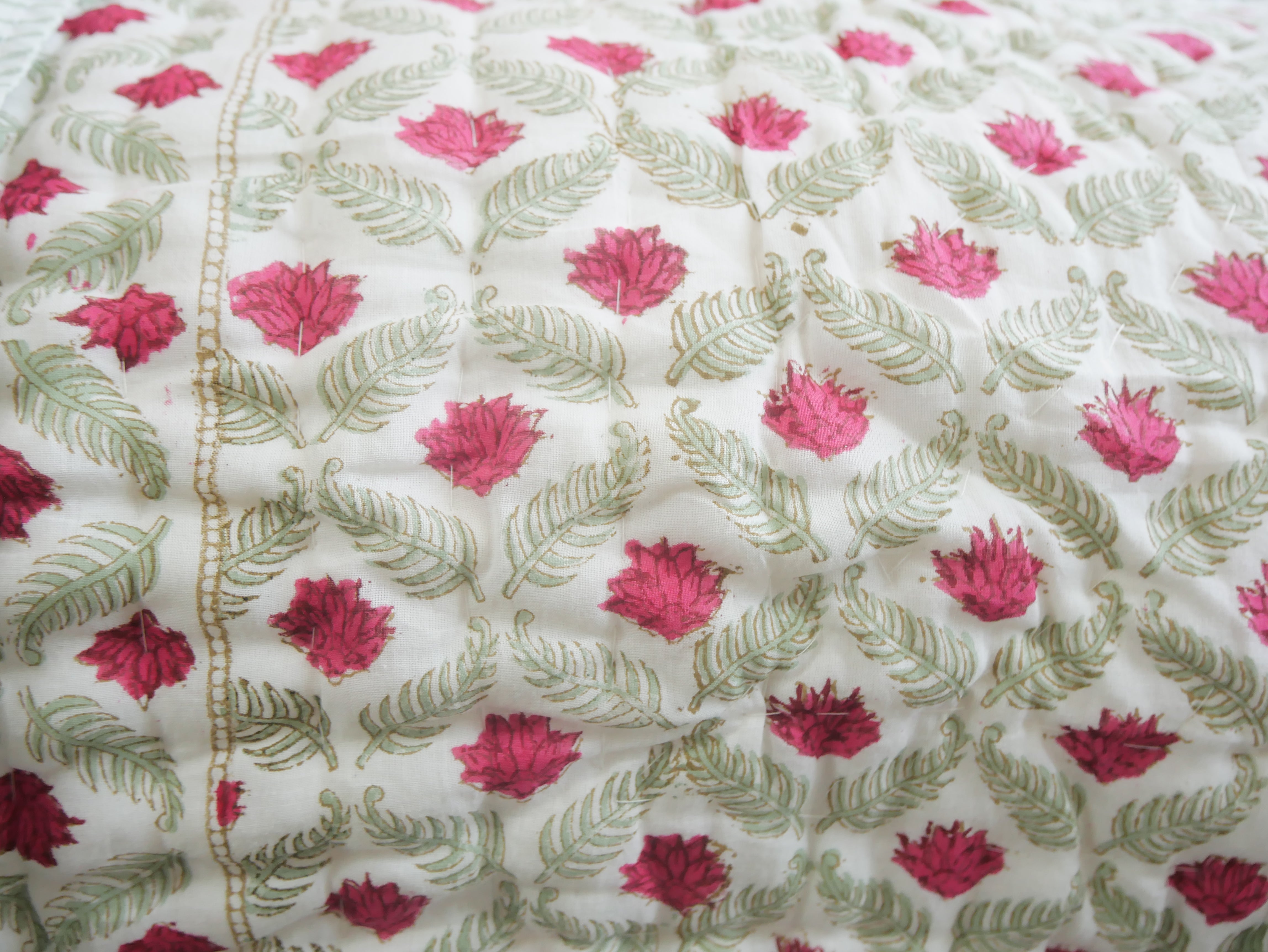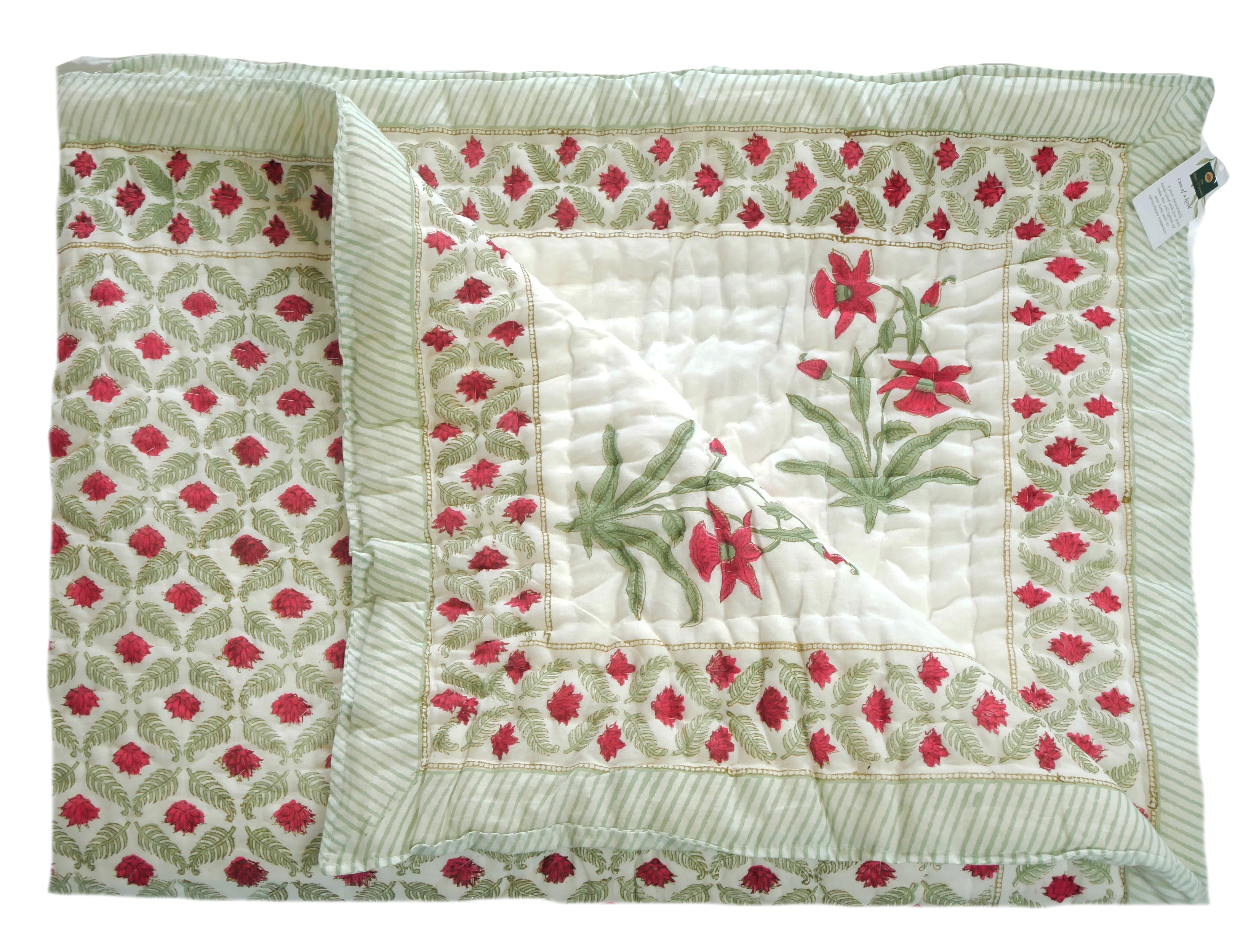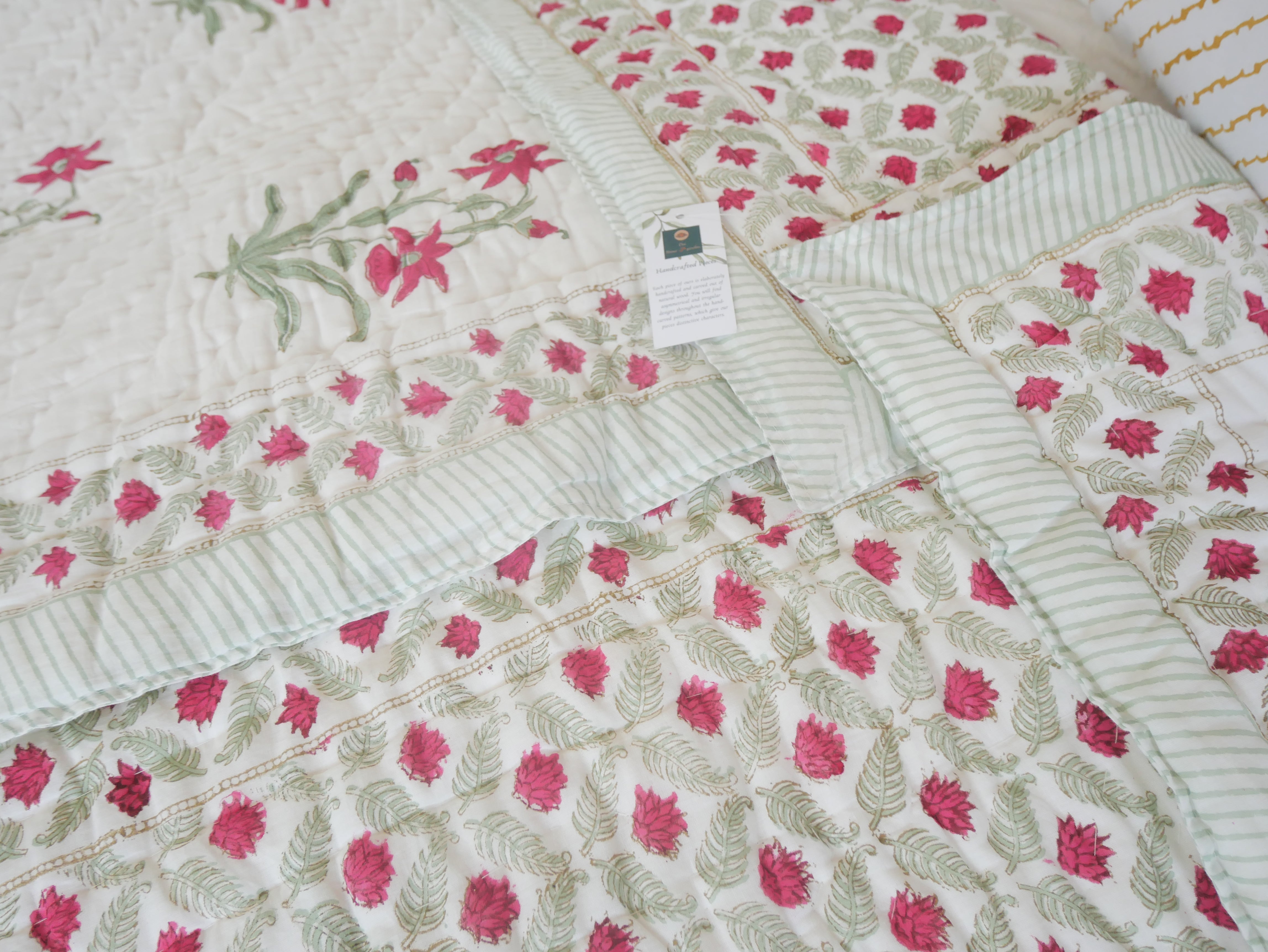 Dit prachtige dekbed is gemaakt van hoogwaardig, ongebleekt katoen, is met de hand genaaid en voorzien van ingewikkelde blokprints.