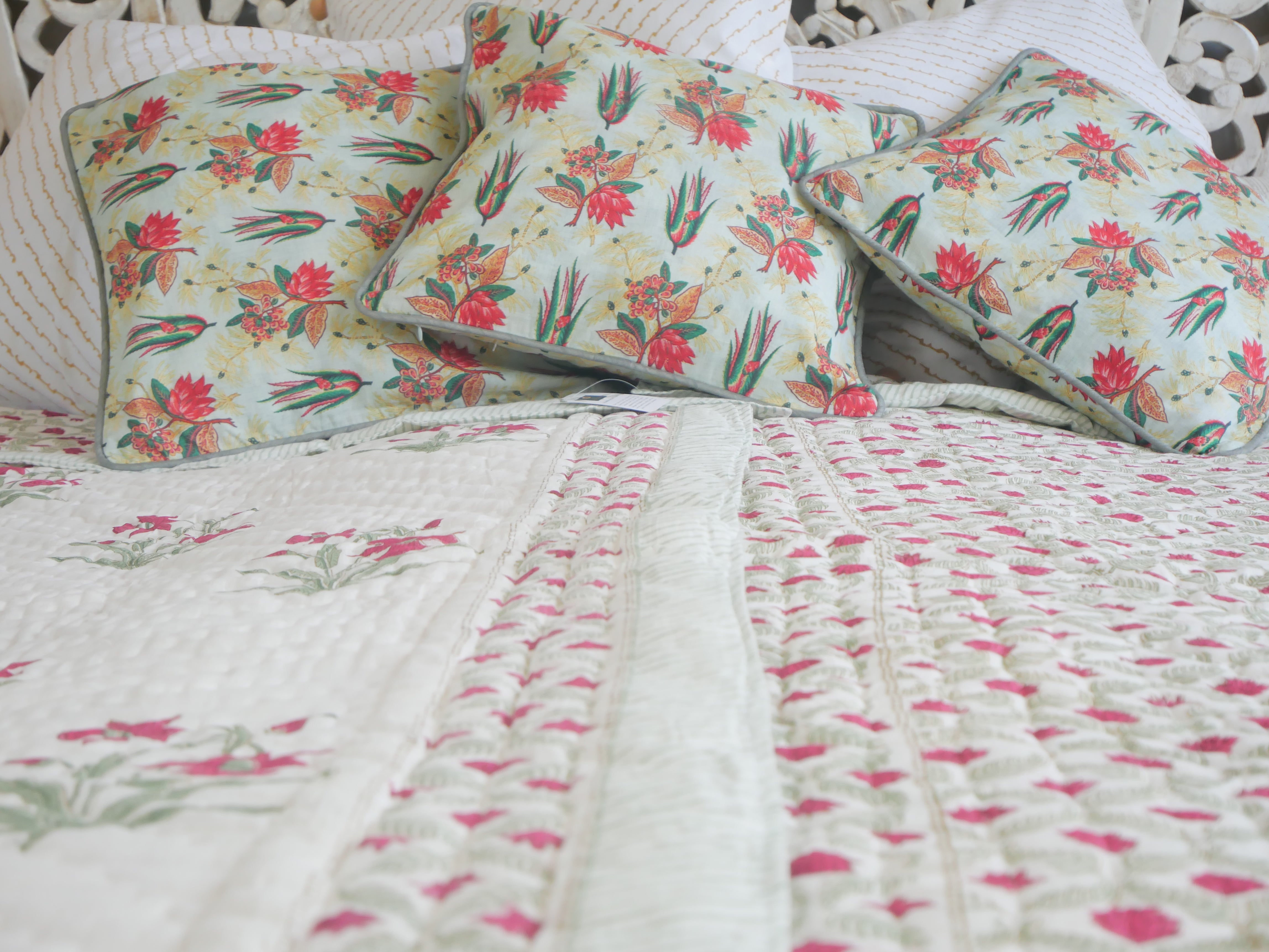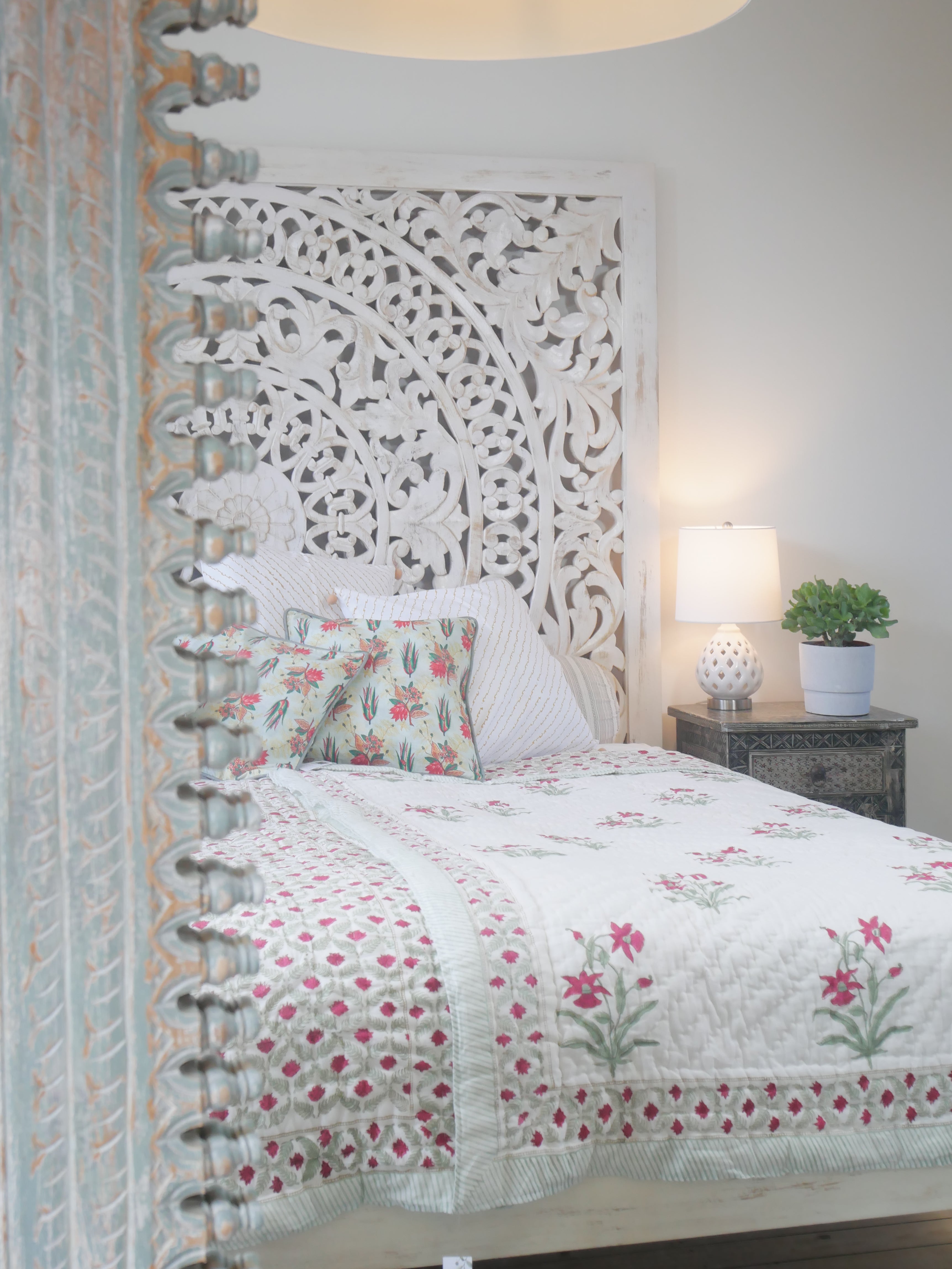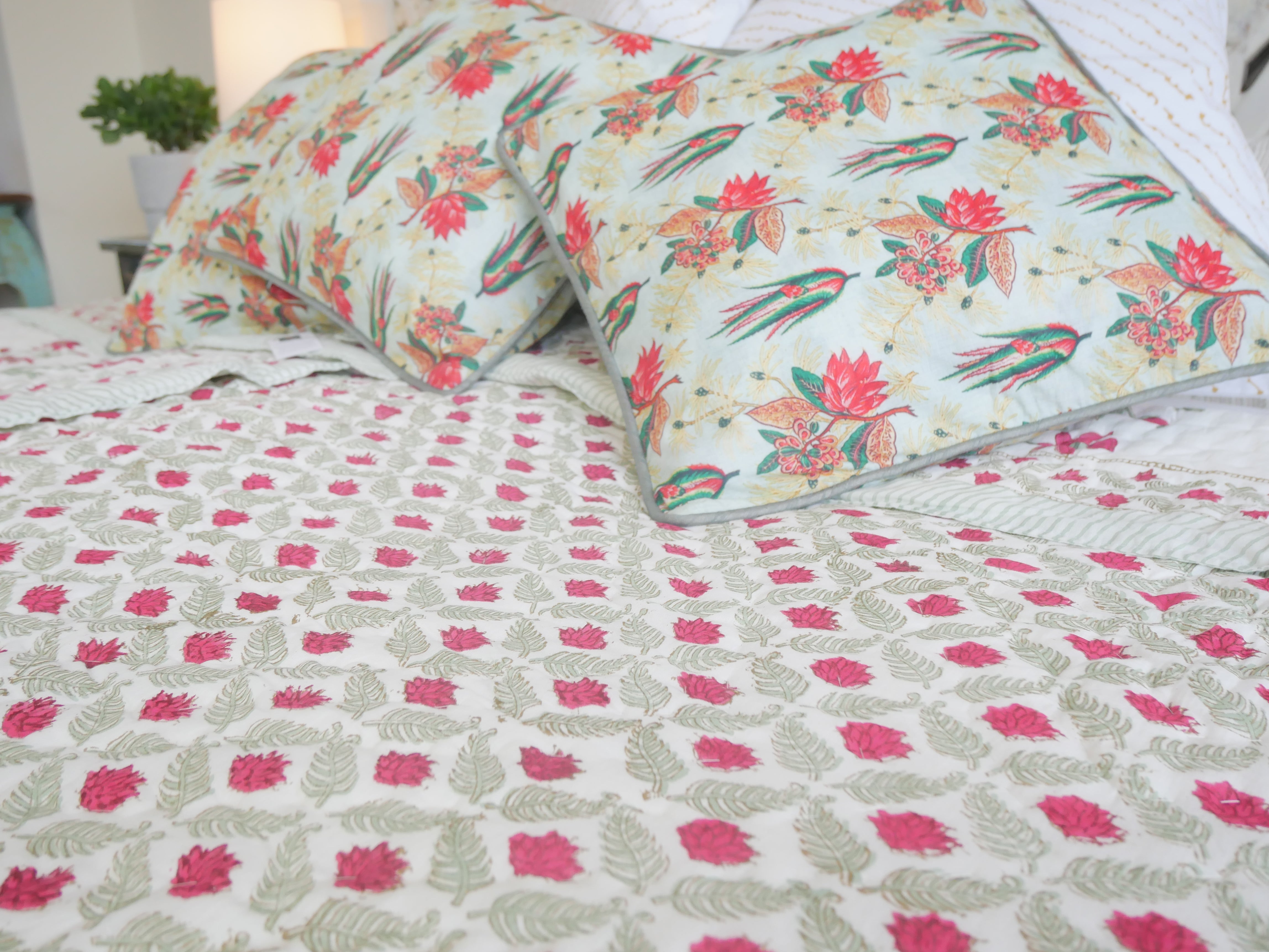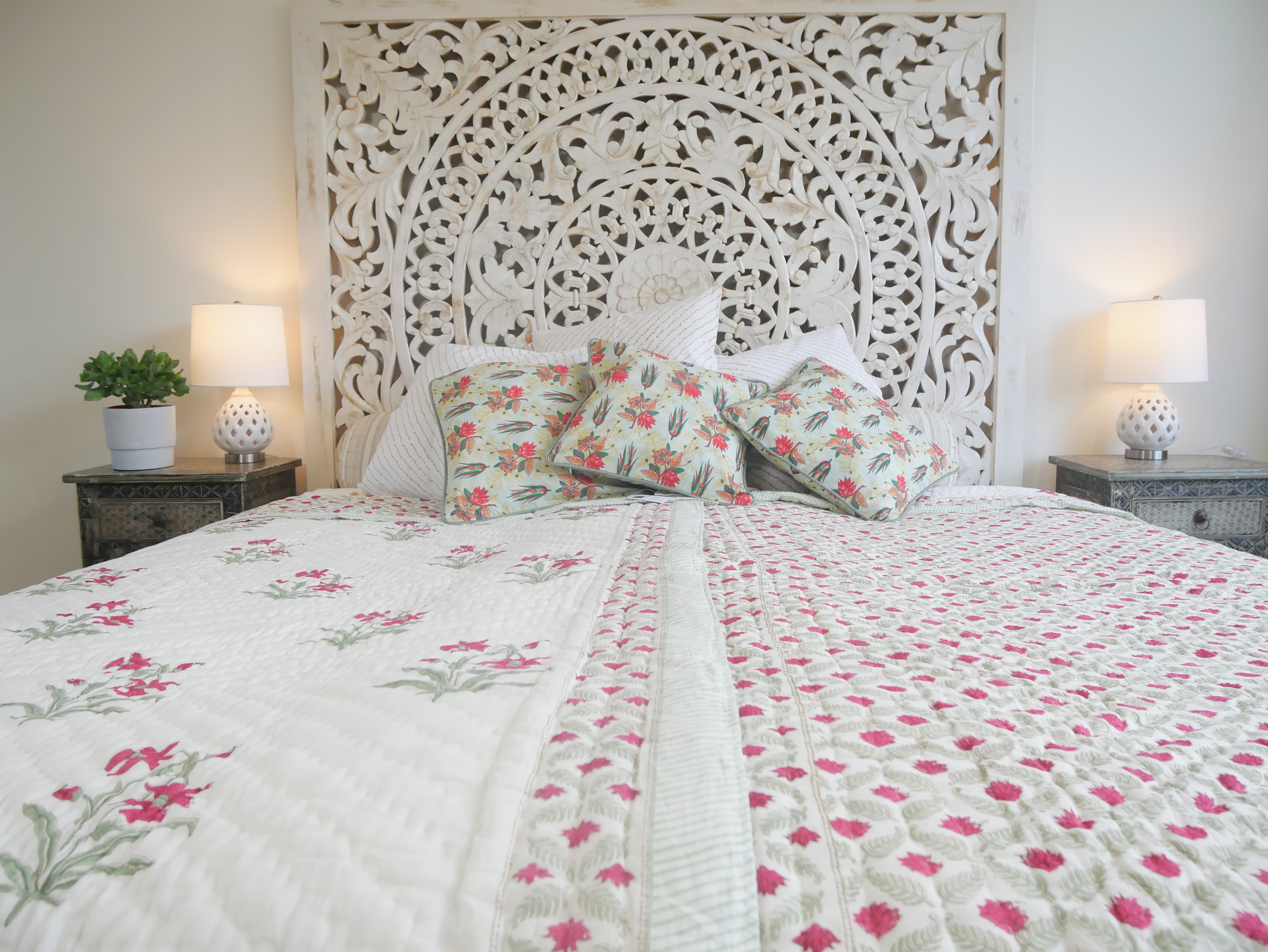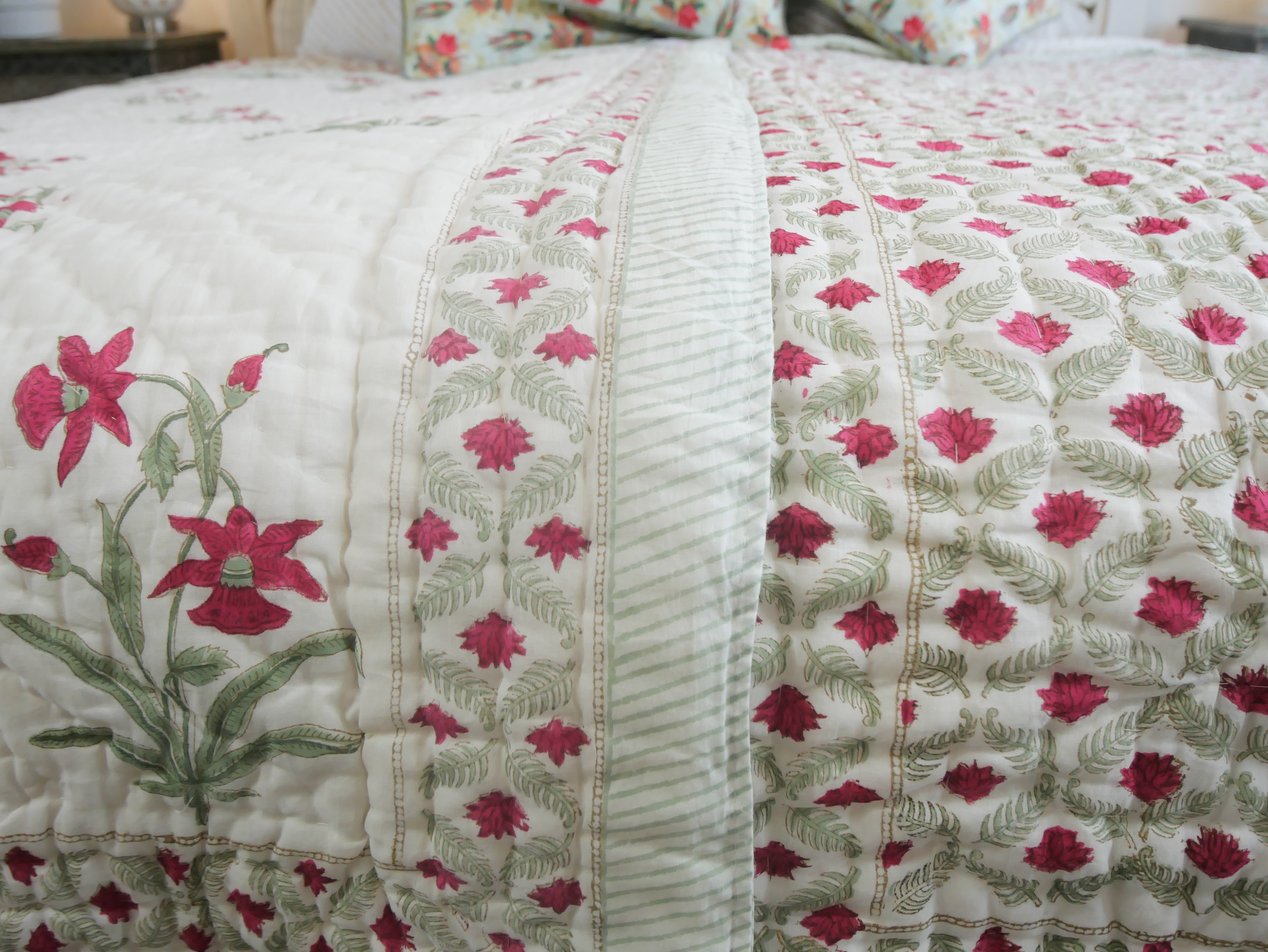 Dit prachtige dekbed is gemaakt van hoogwaardig, ongebleekt katoen, is met de hand genaaid en voorzien van ingewikkelde blokprints.