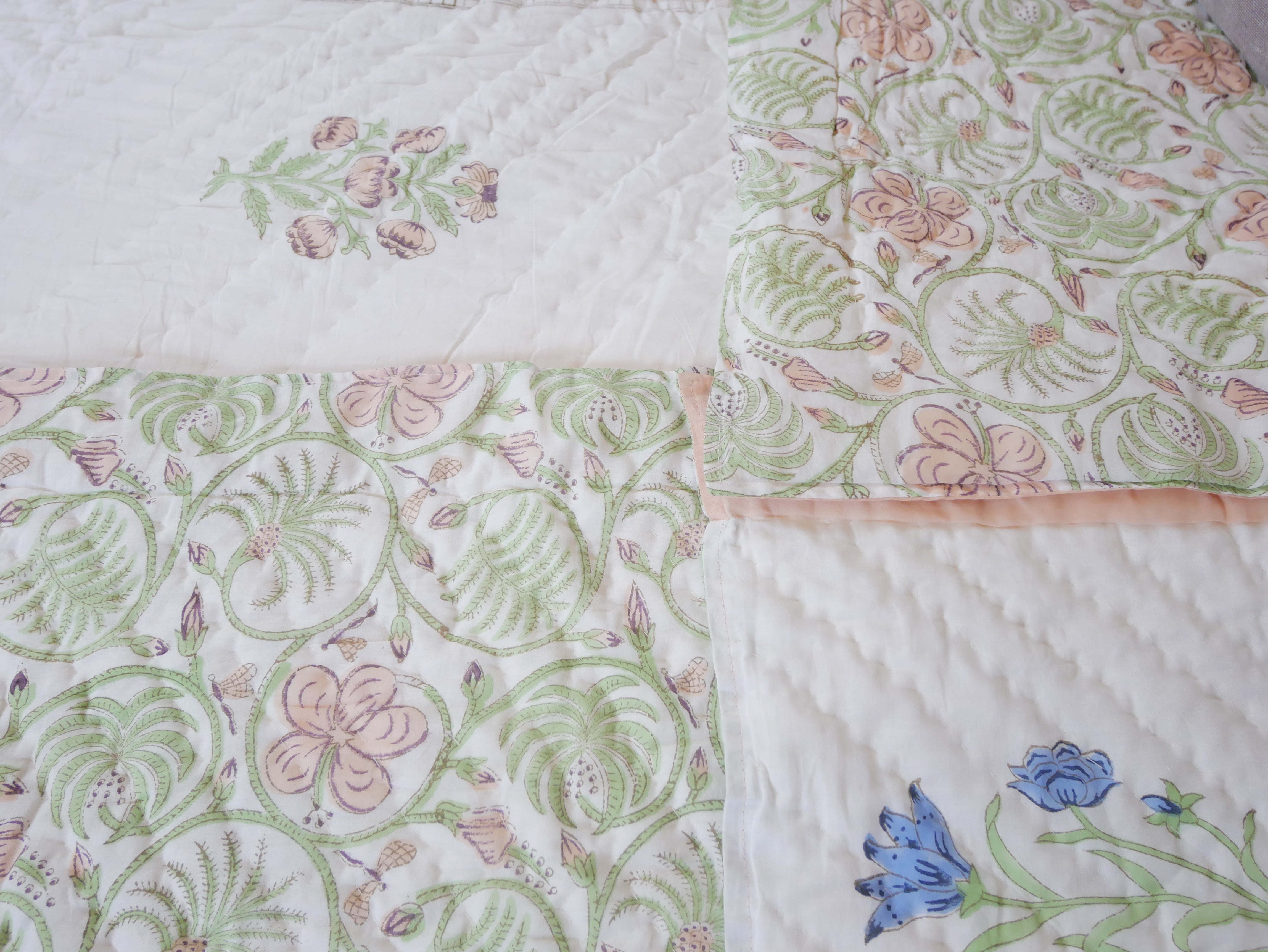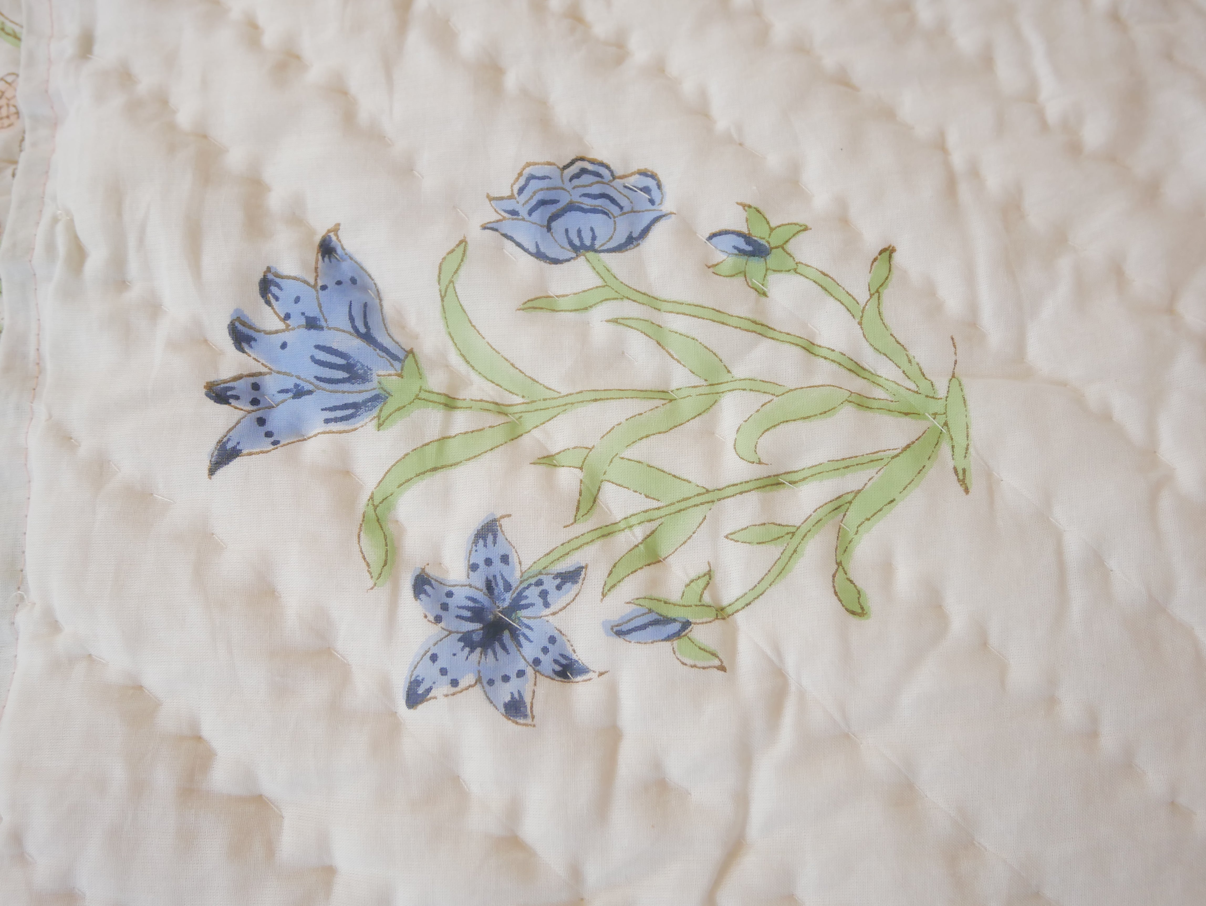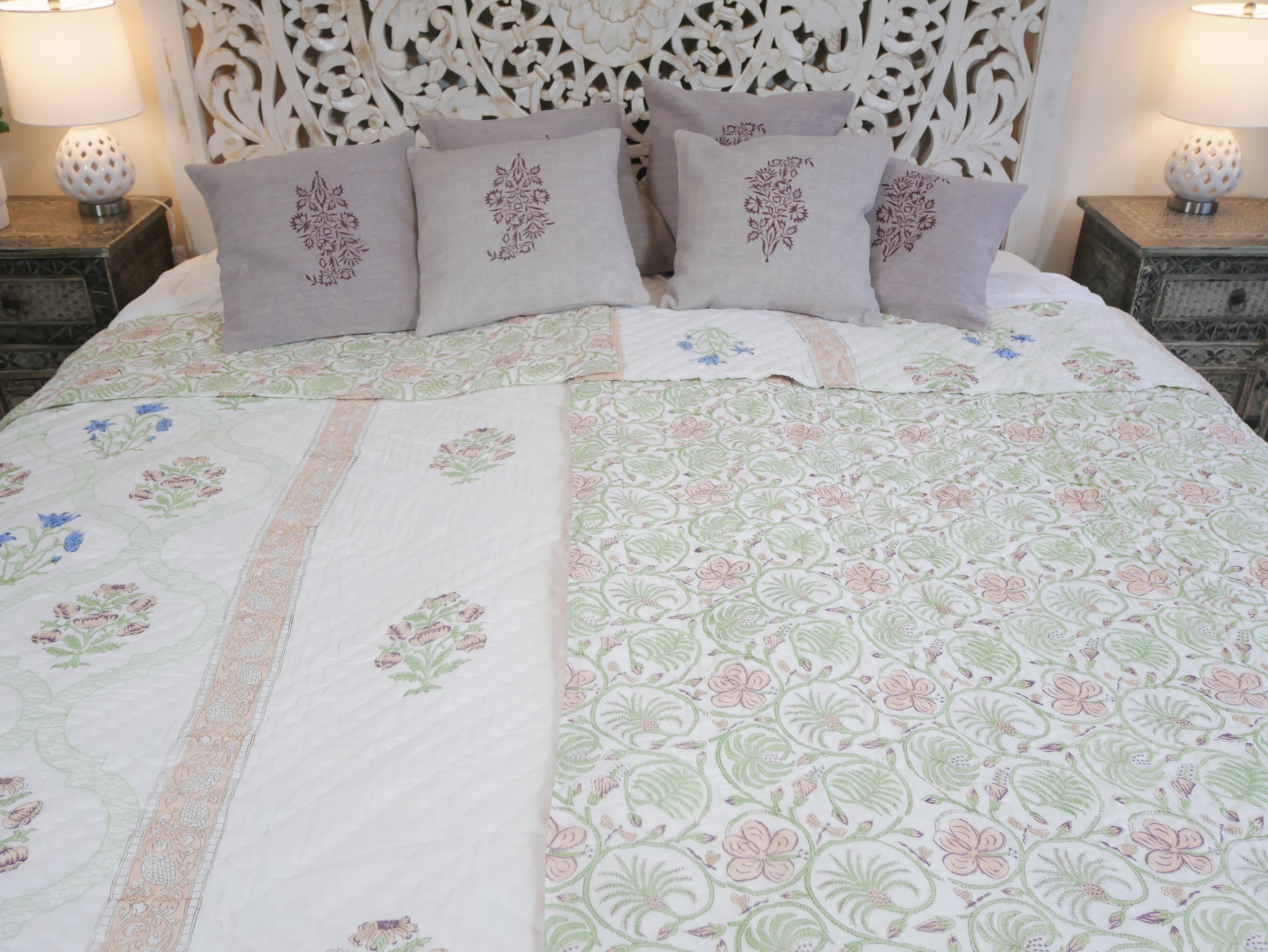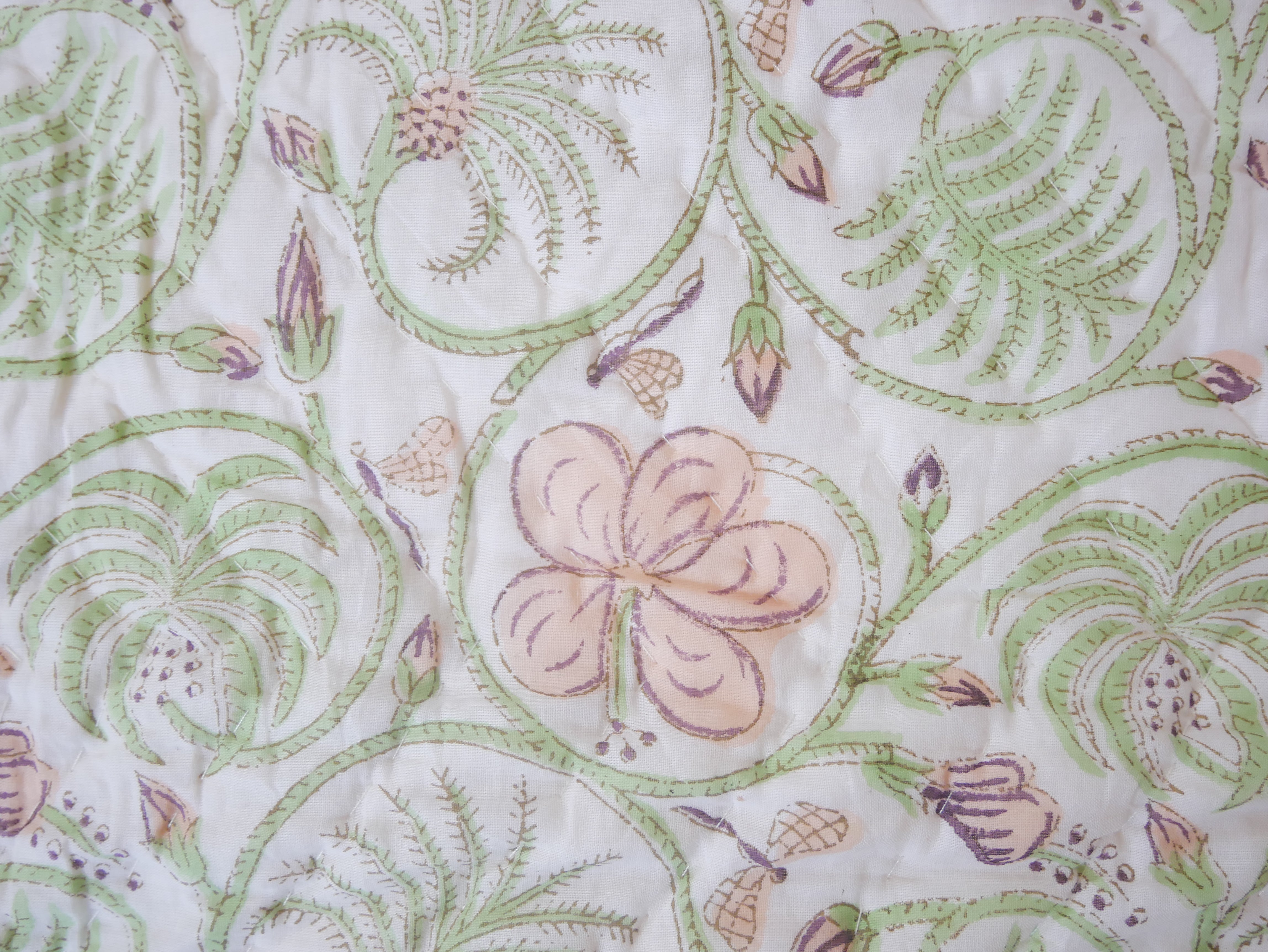 Het is met de hand genaaid en toont ingewikkelde handgemaakte blokprints uit Rajasthan.