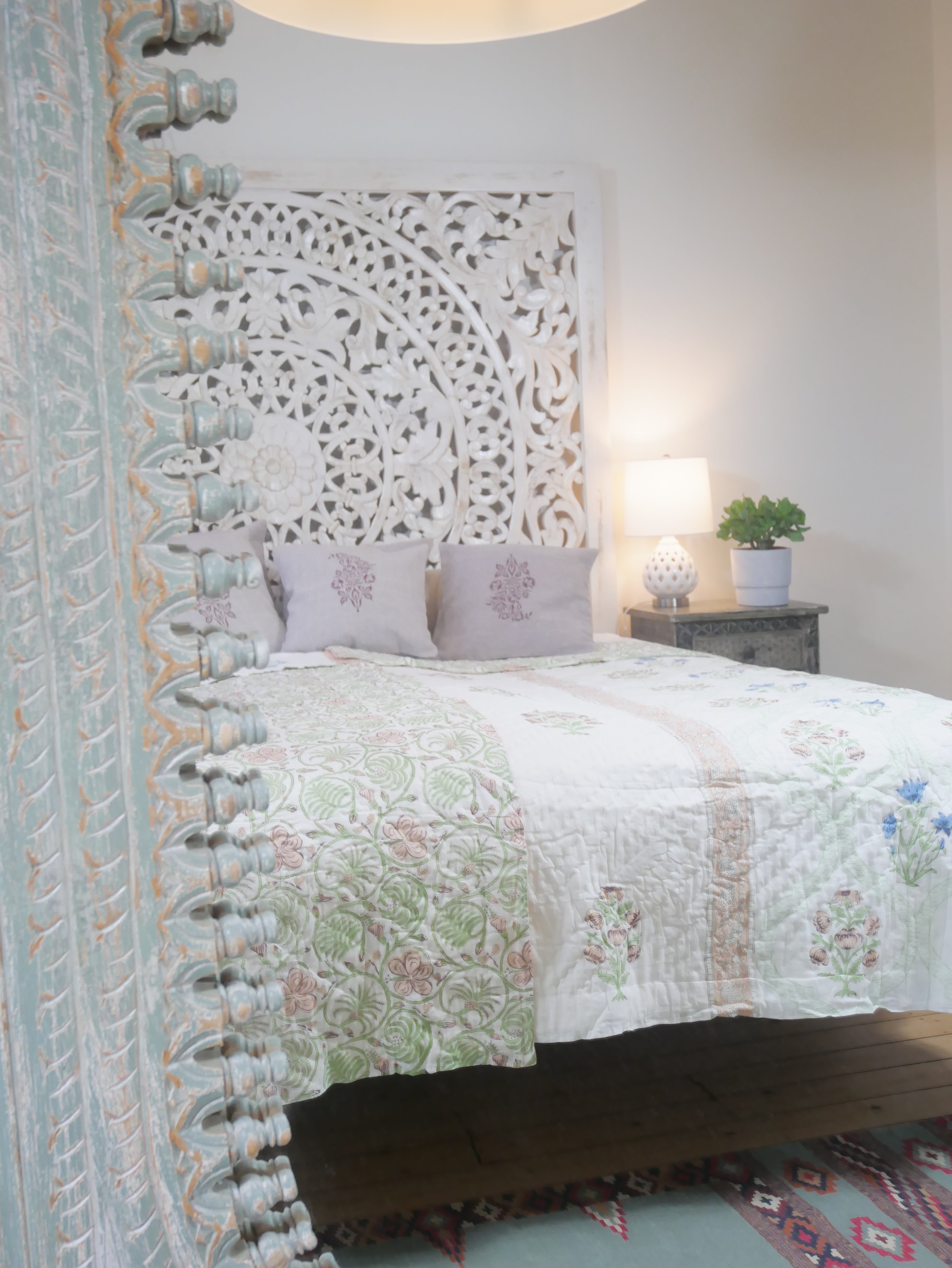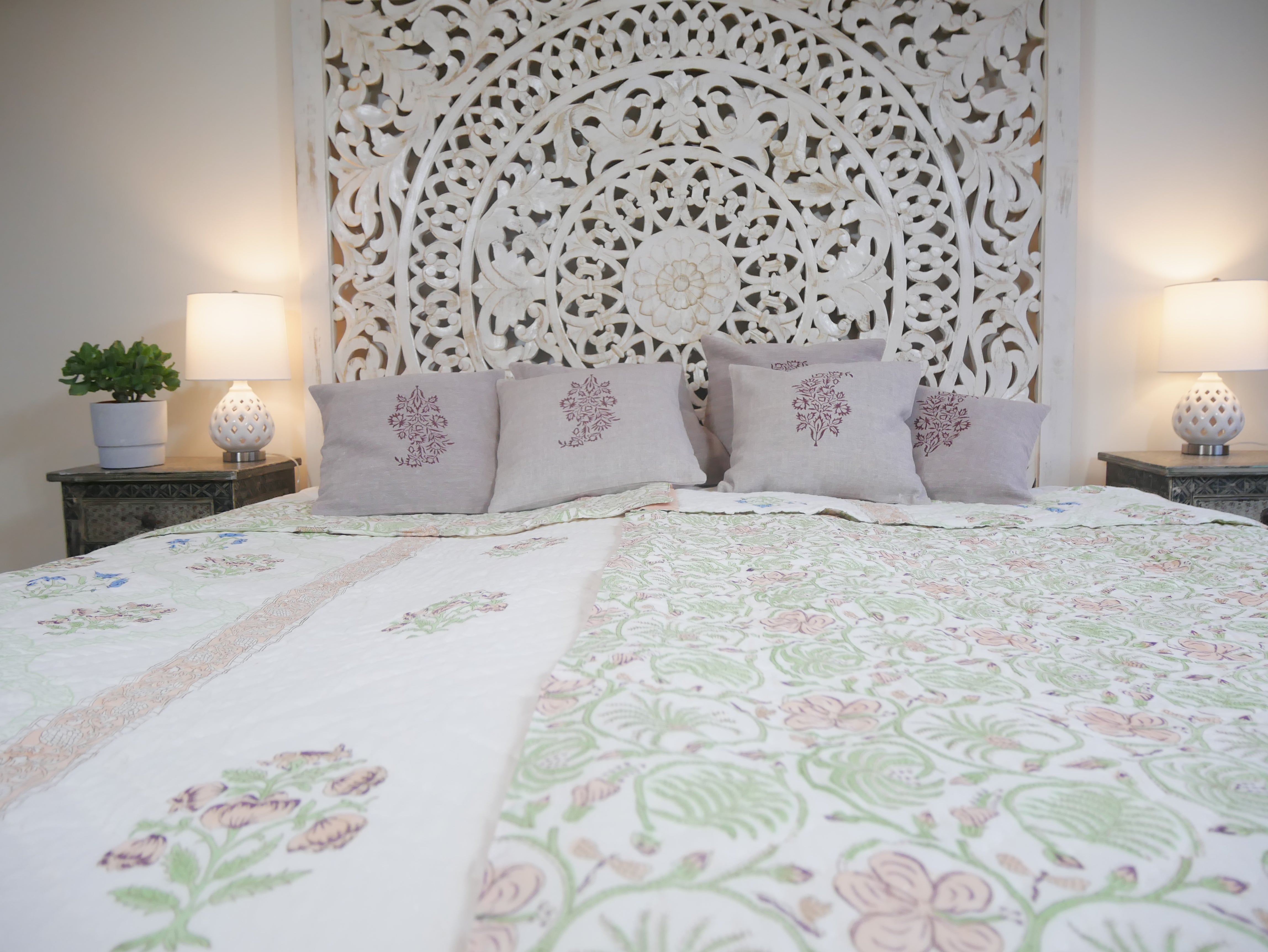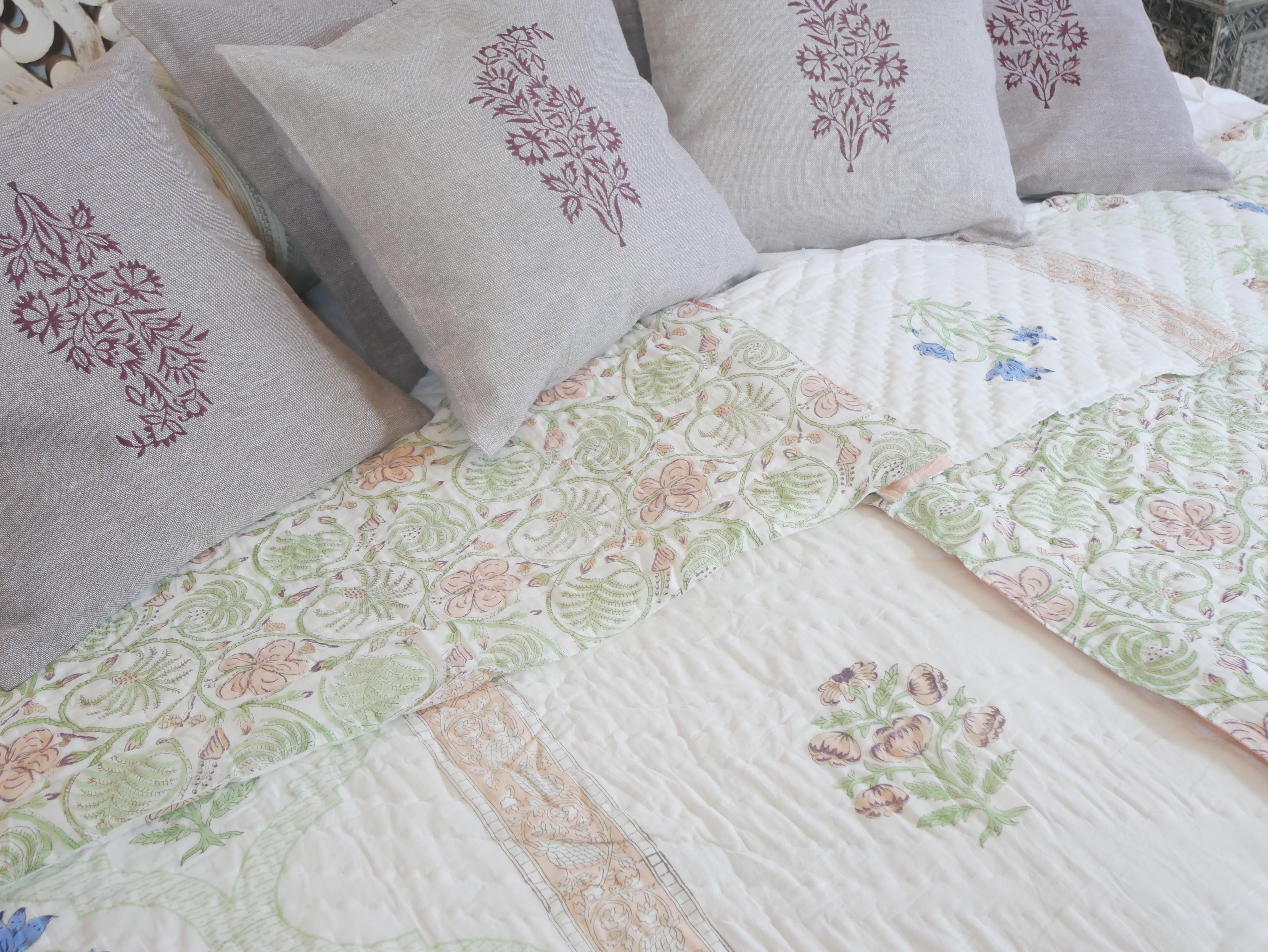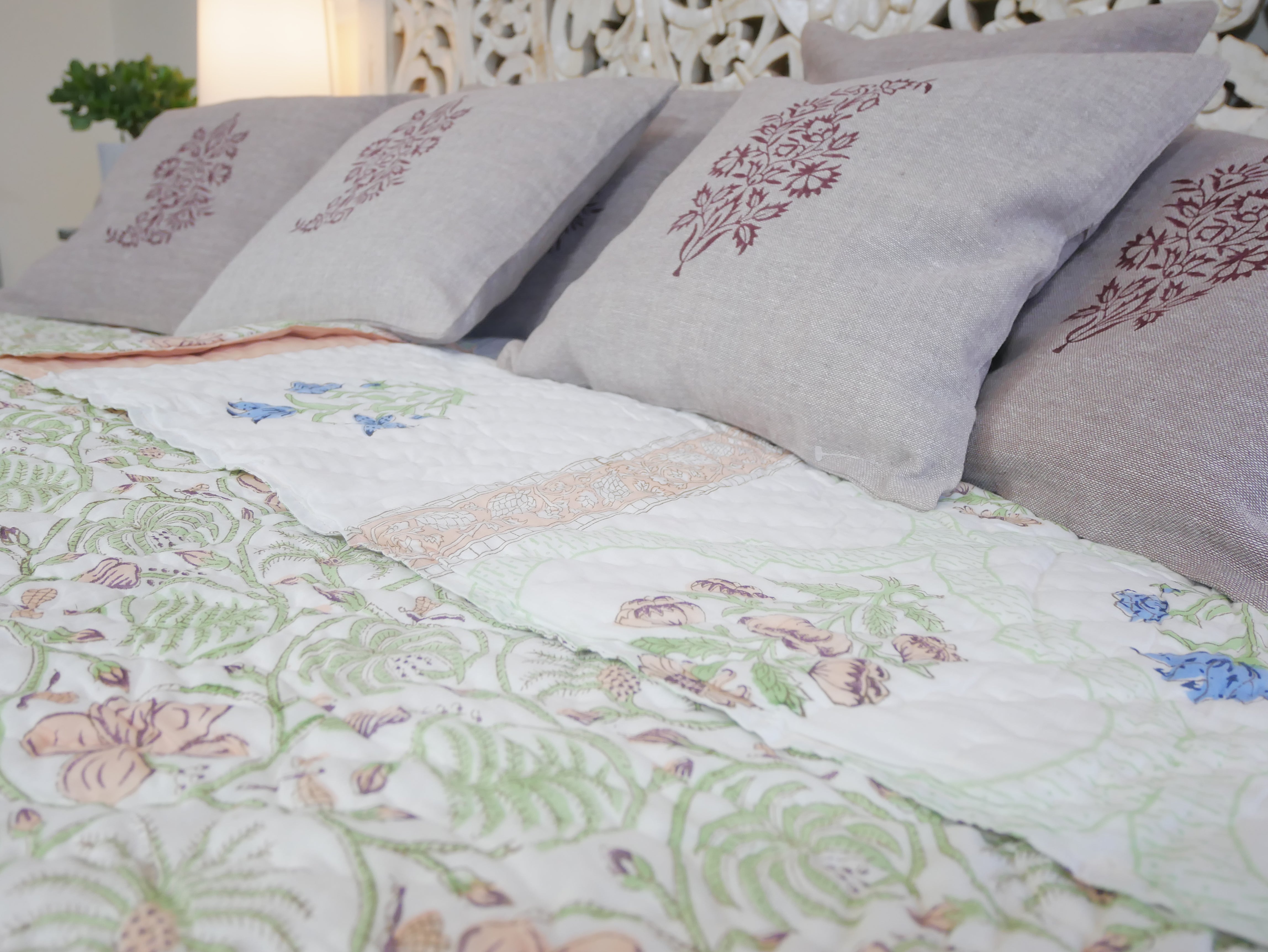 Het is met de hand genaaid en toont ingewikkelde handgemaakte blokprints uit Rajasthan.