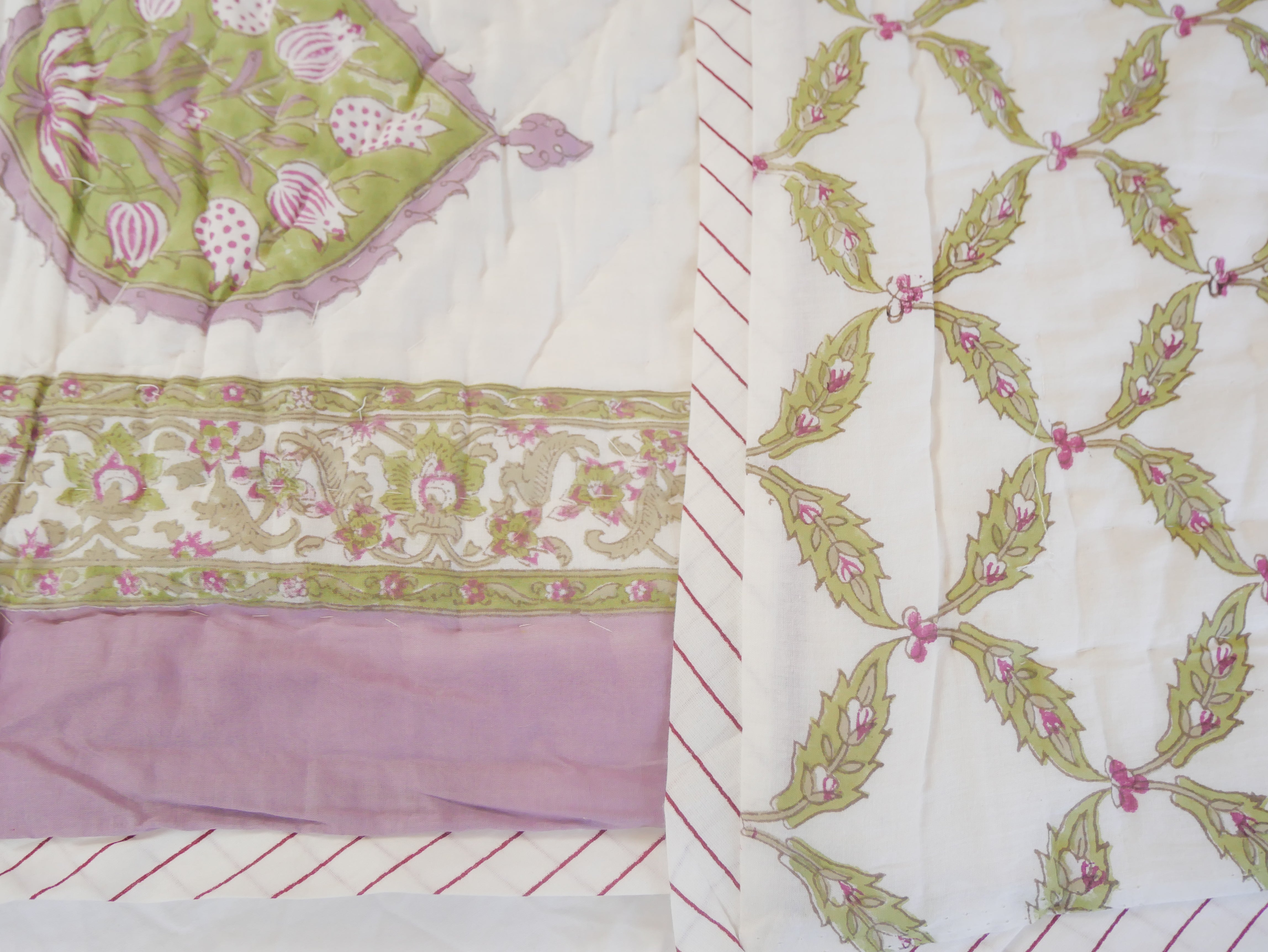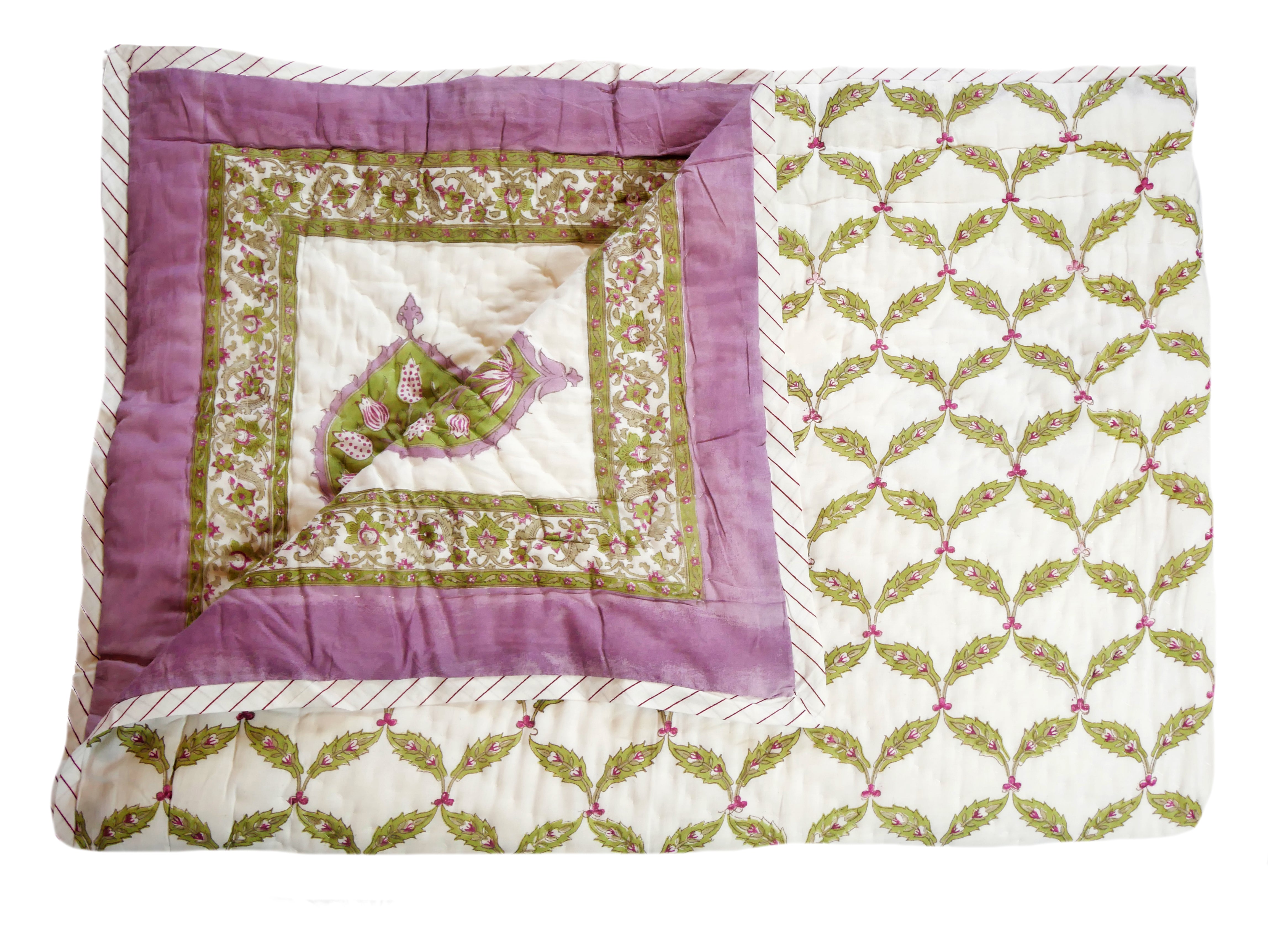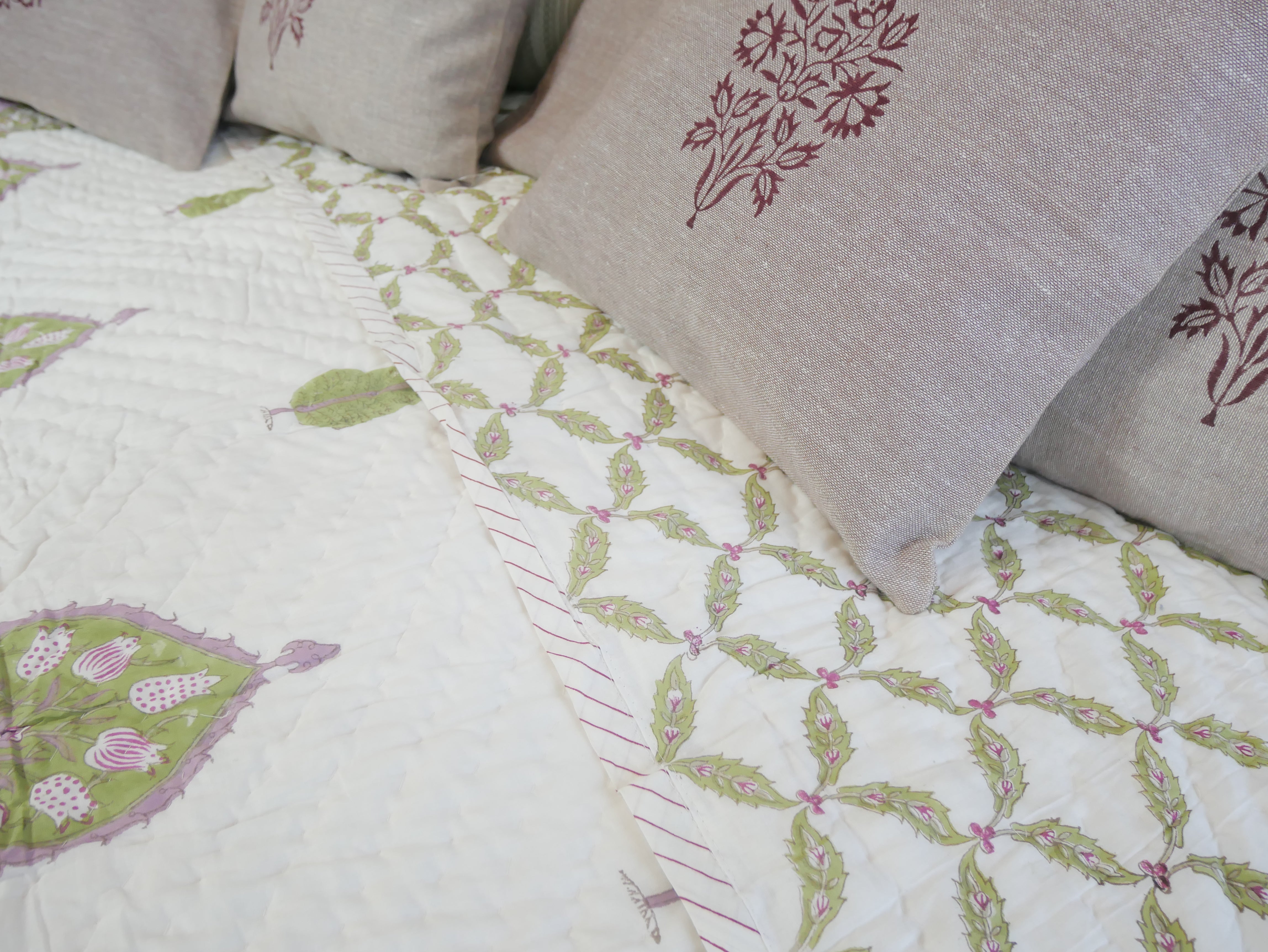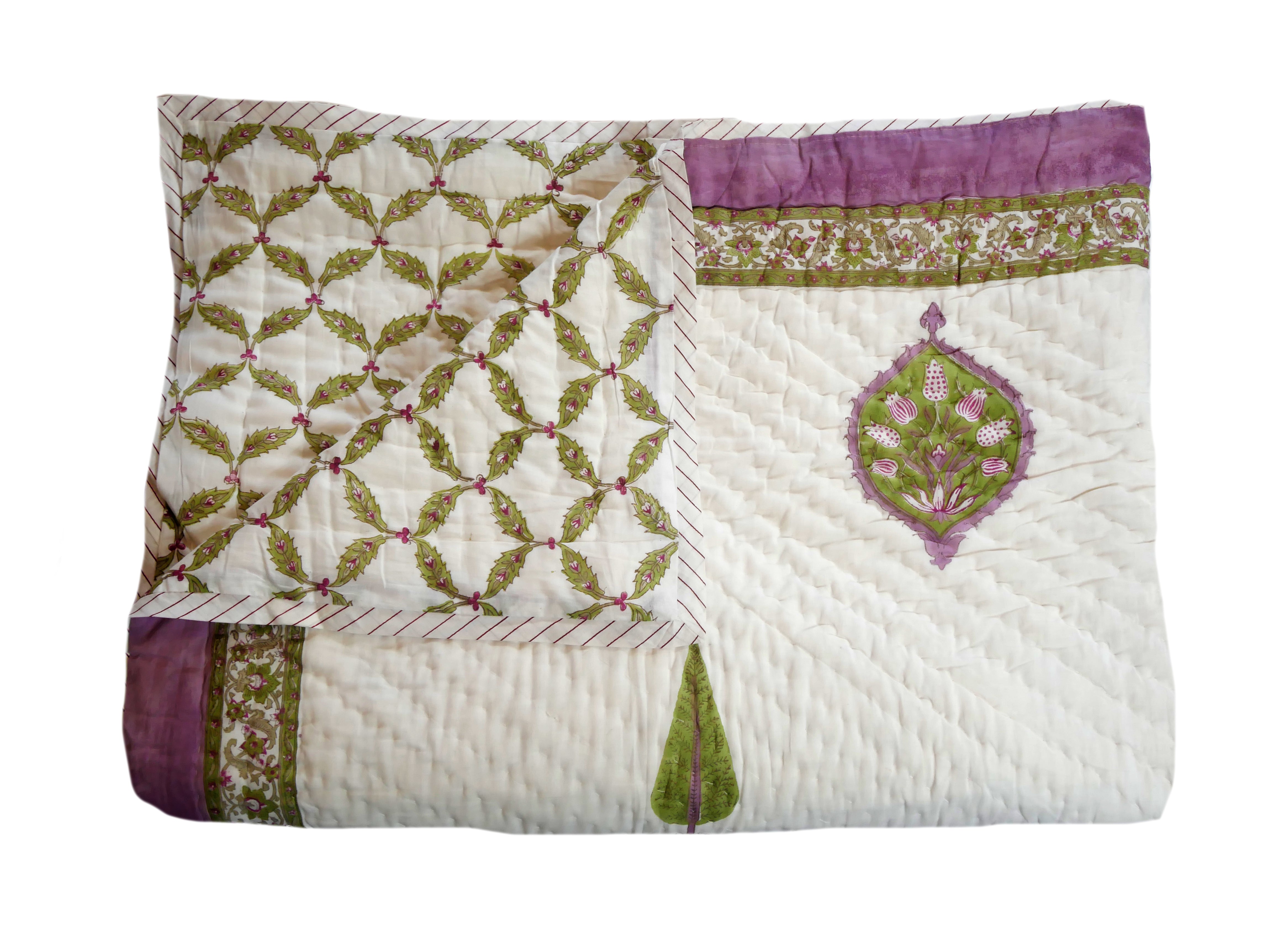 Het is met de hand genaaid en toont ingewikkelde handgemaakte blokprints uit Rajasthan.