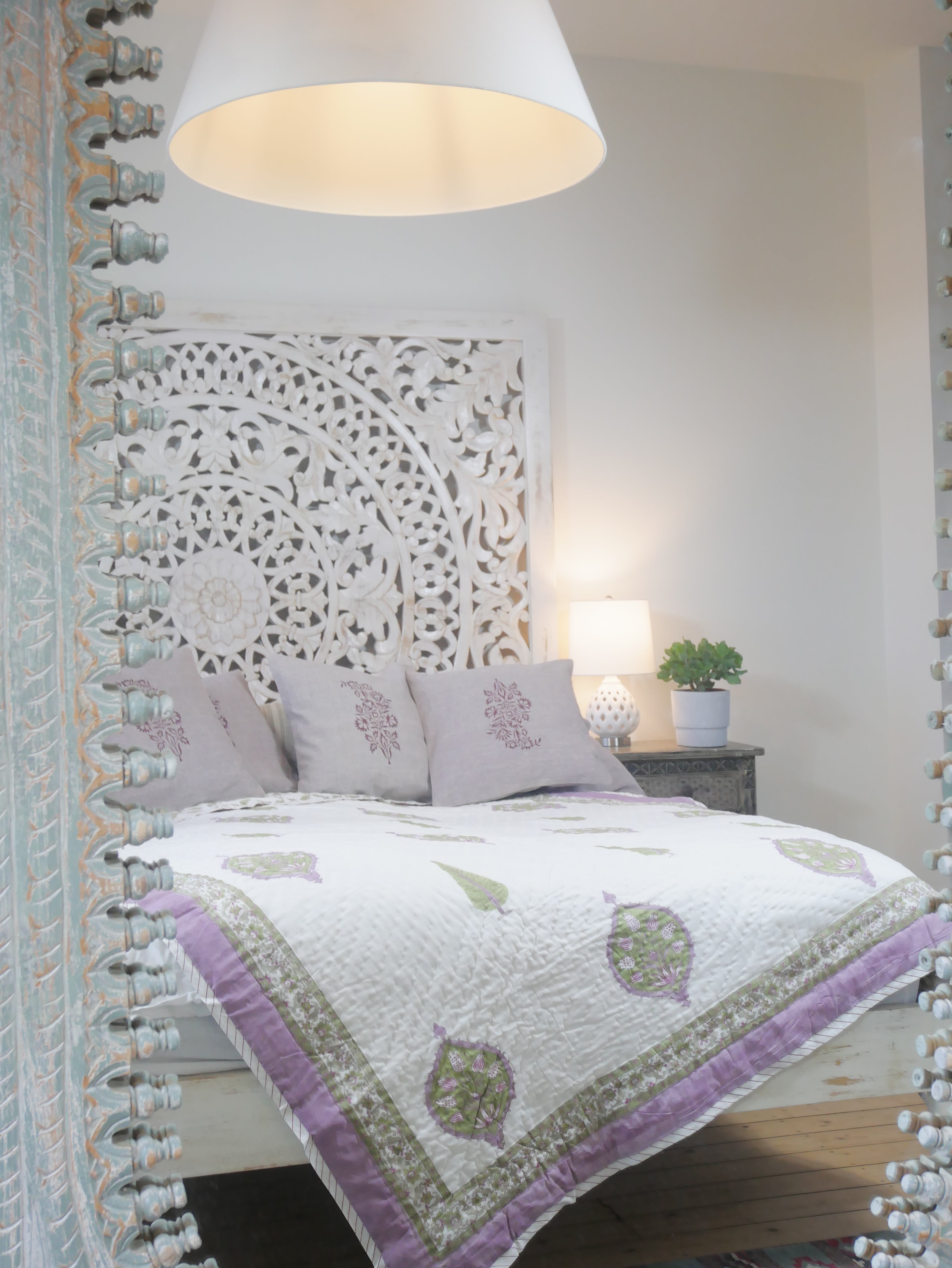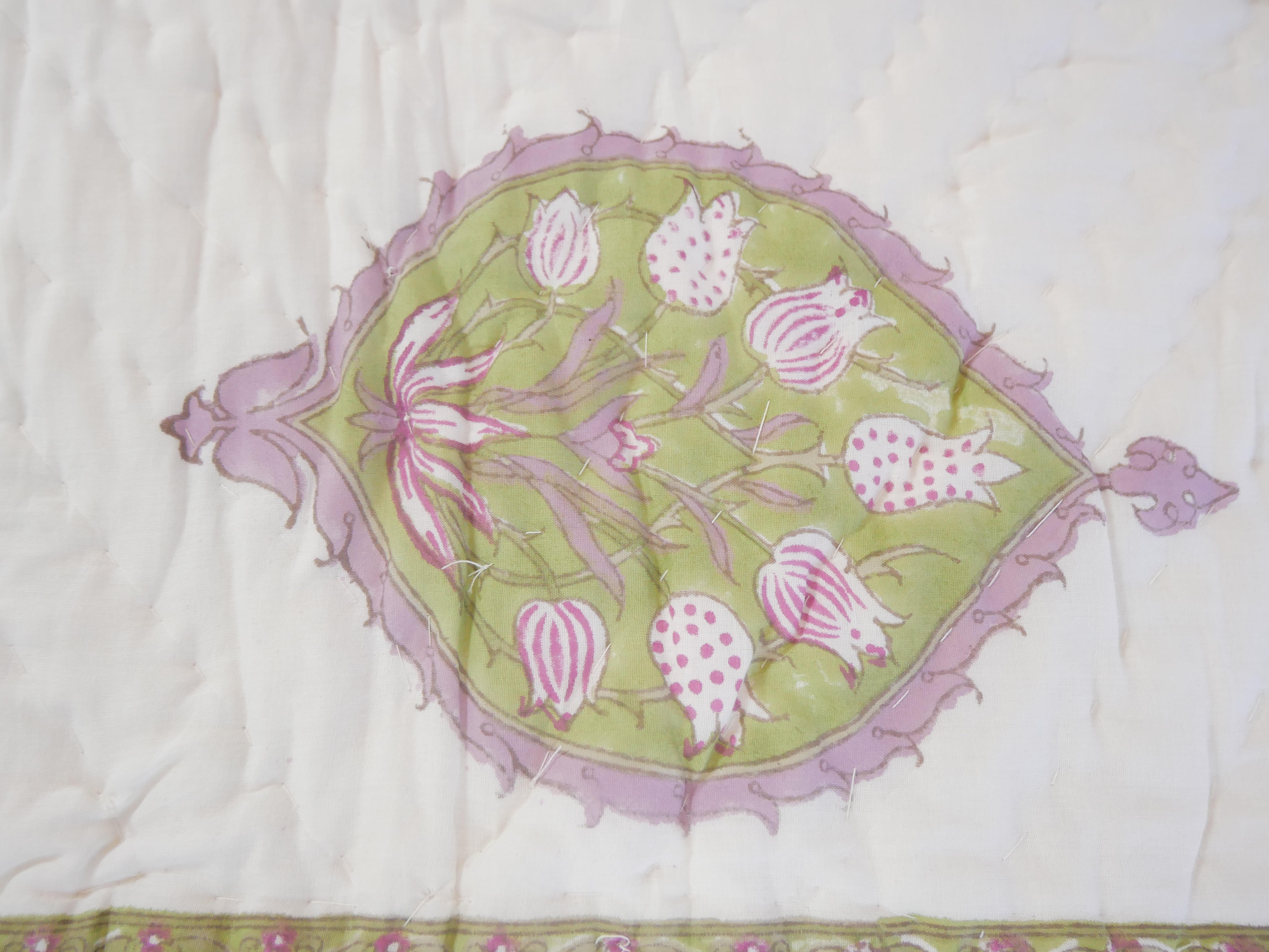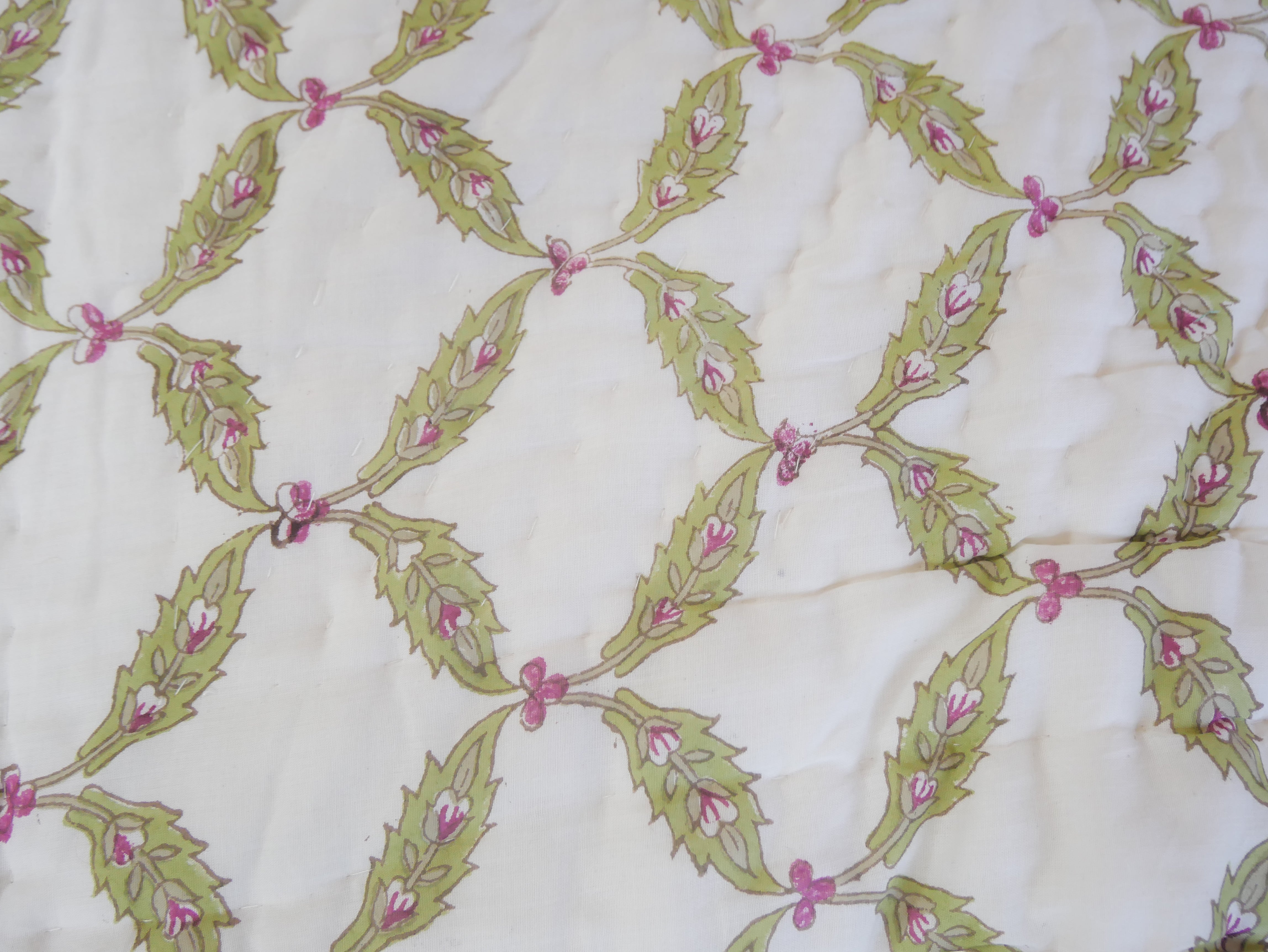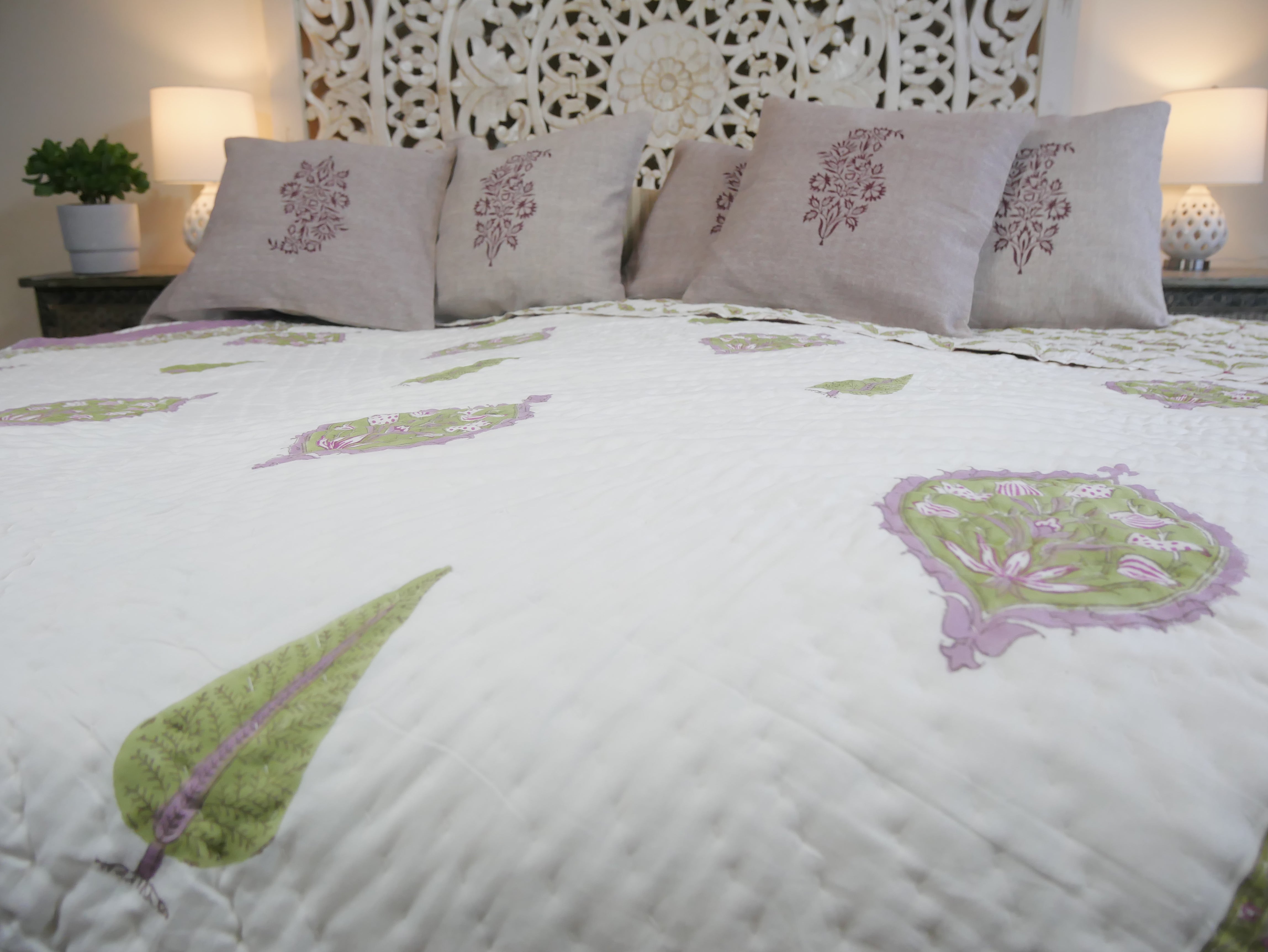 Het is met de hand genaaid en toont ingewikkelde handgemaakte blokprints uit Rajasthan.