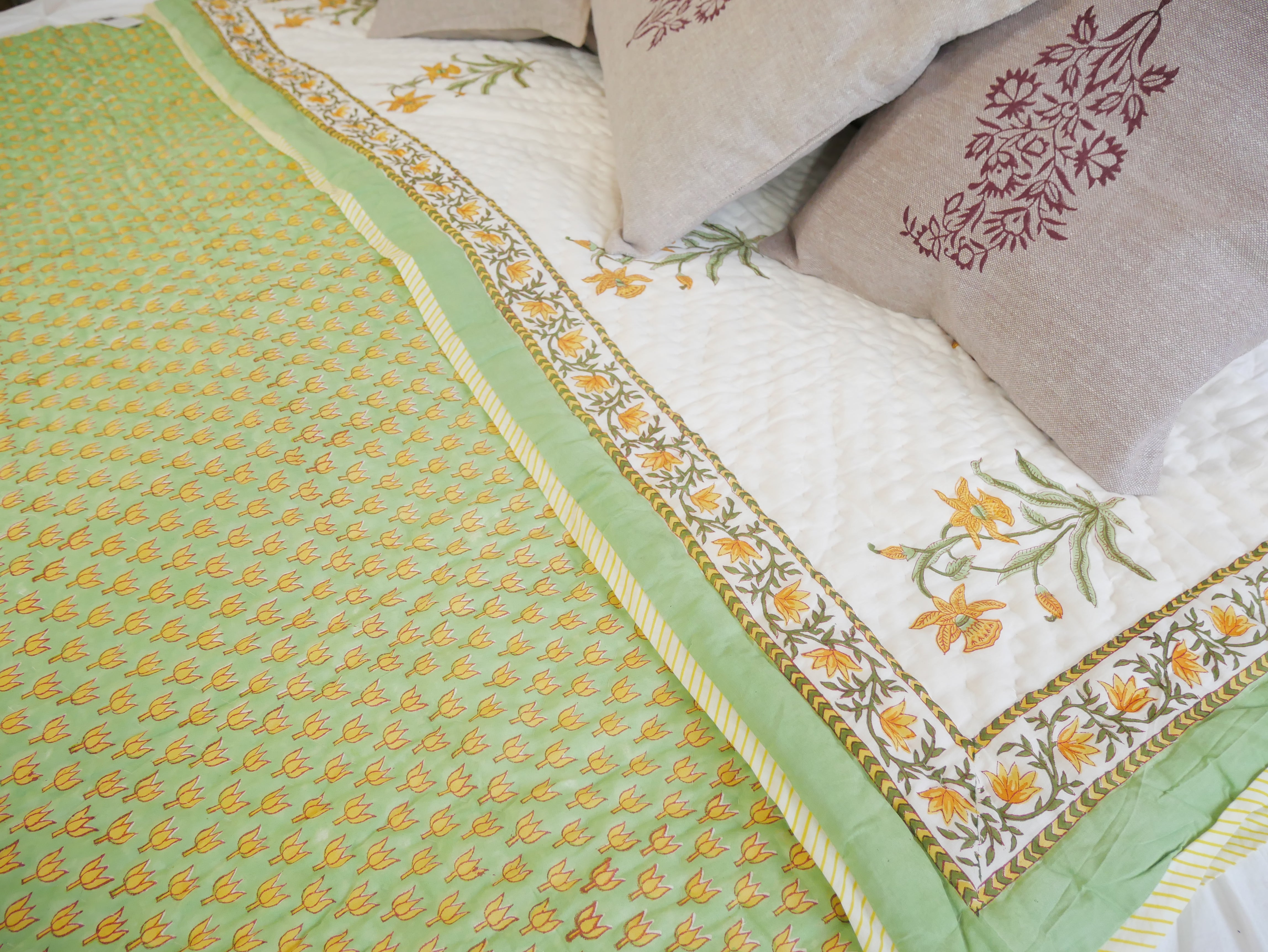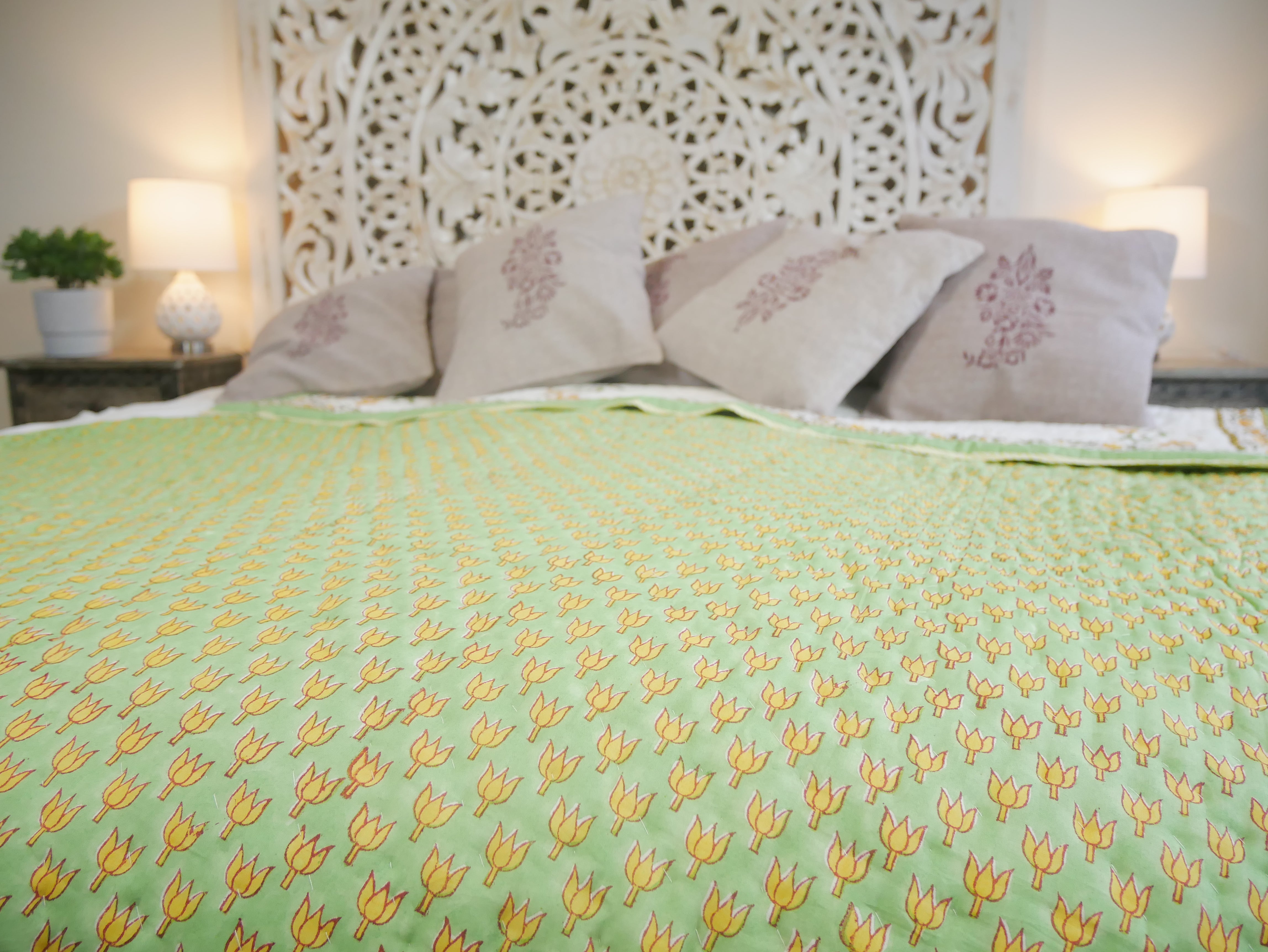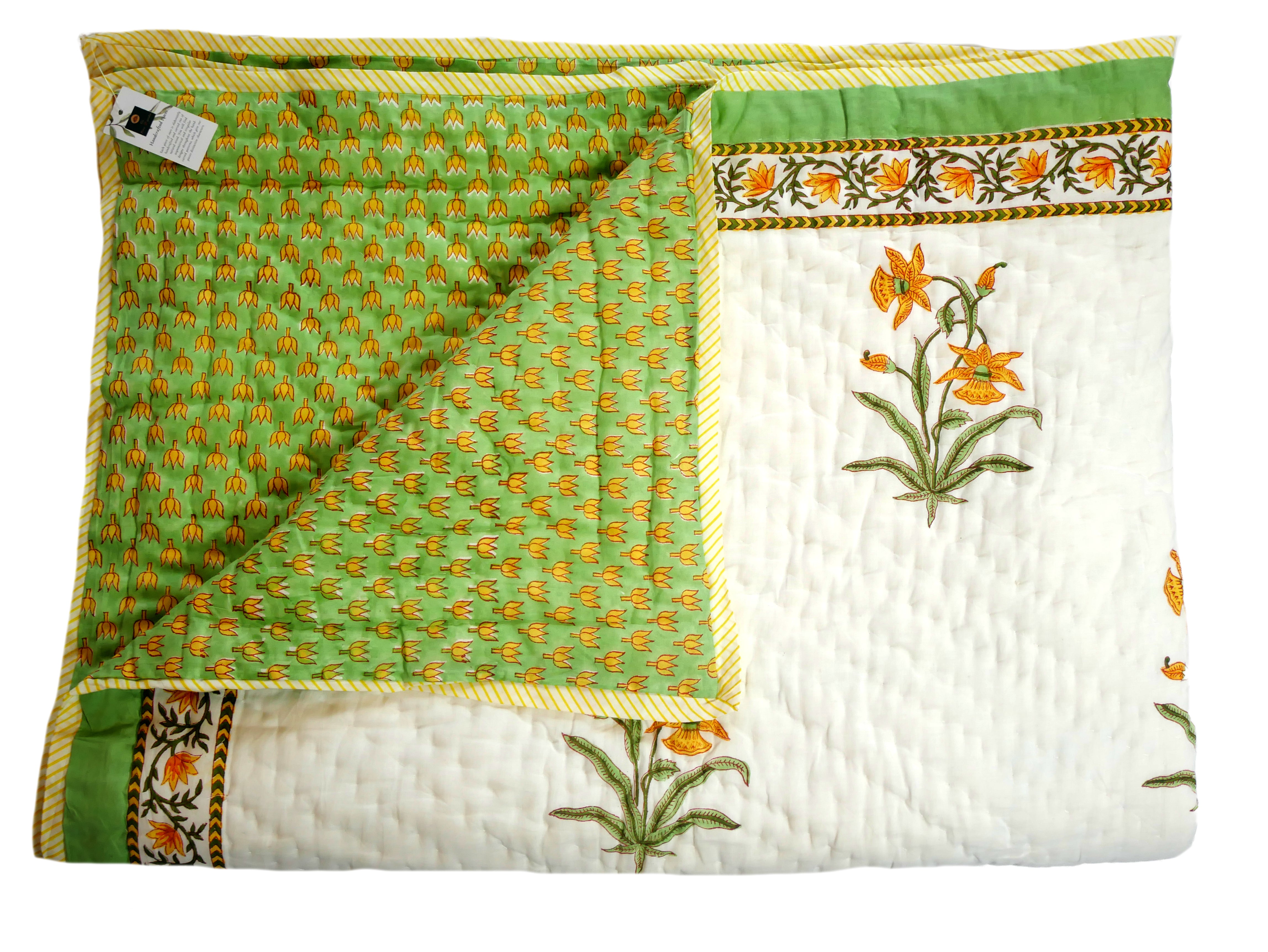 Het is met de hand genaaid en toont ingewikkelde handgemaakte blokprints uit Rajasthan.
