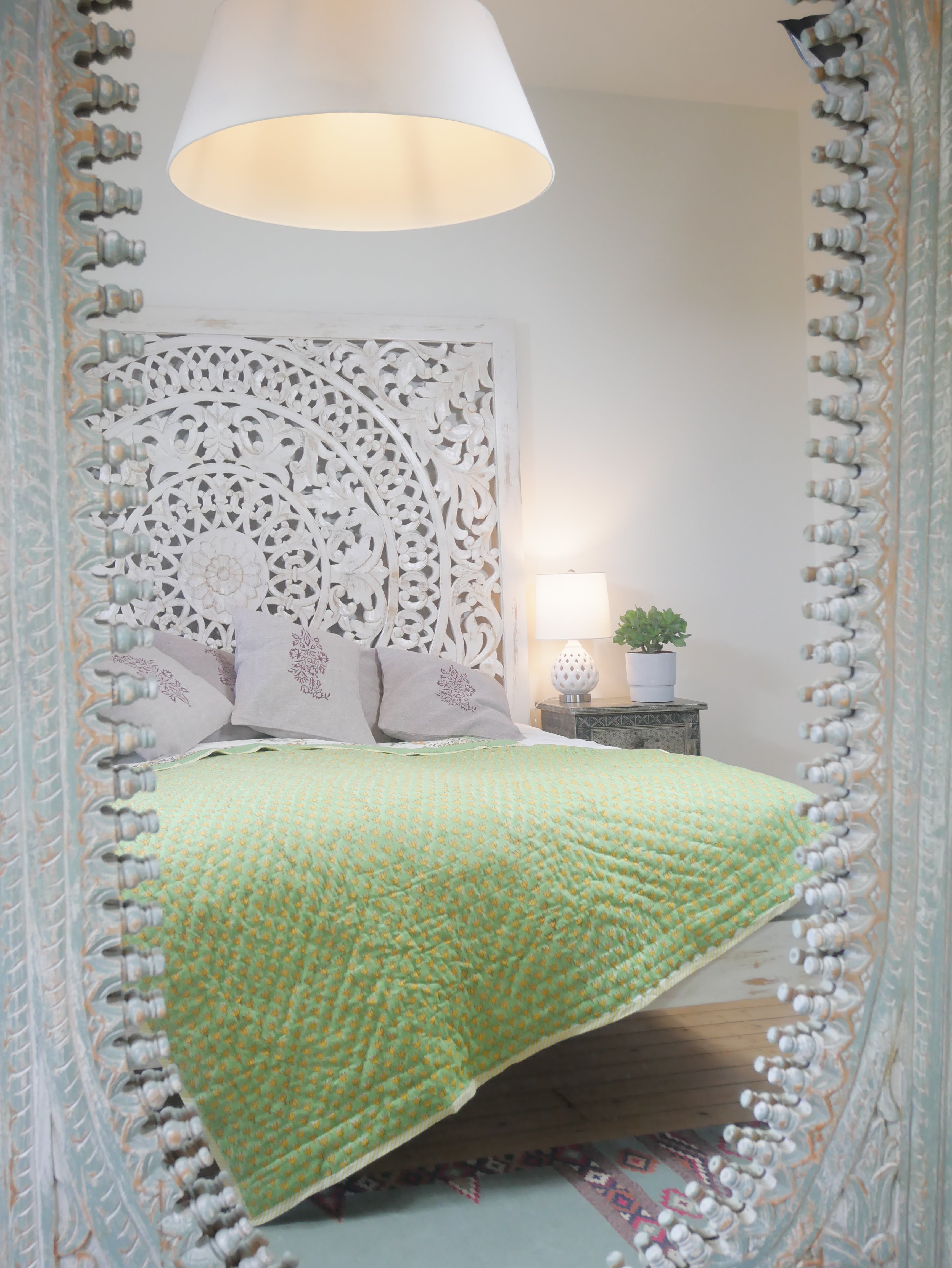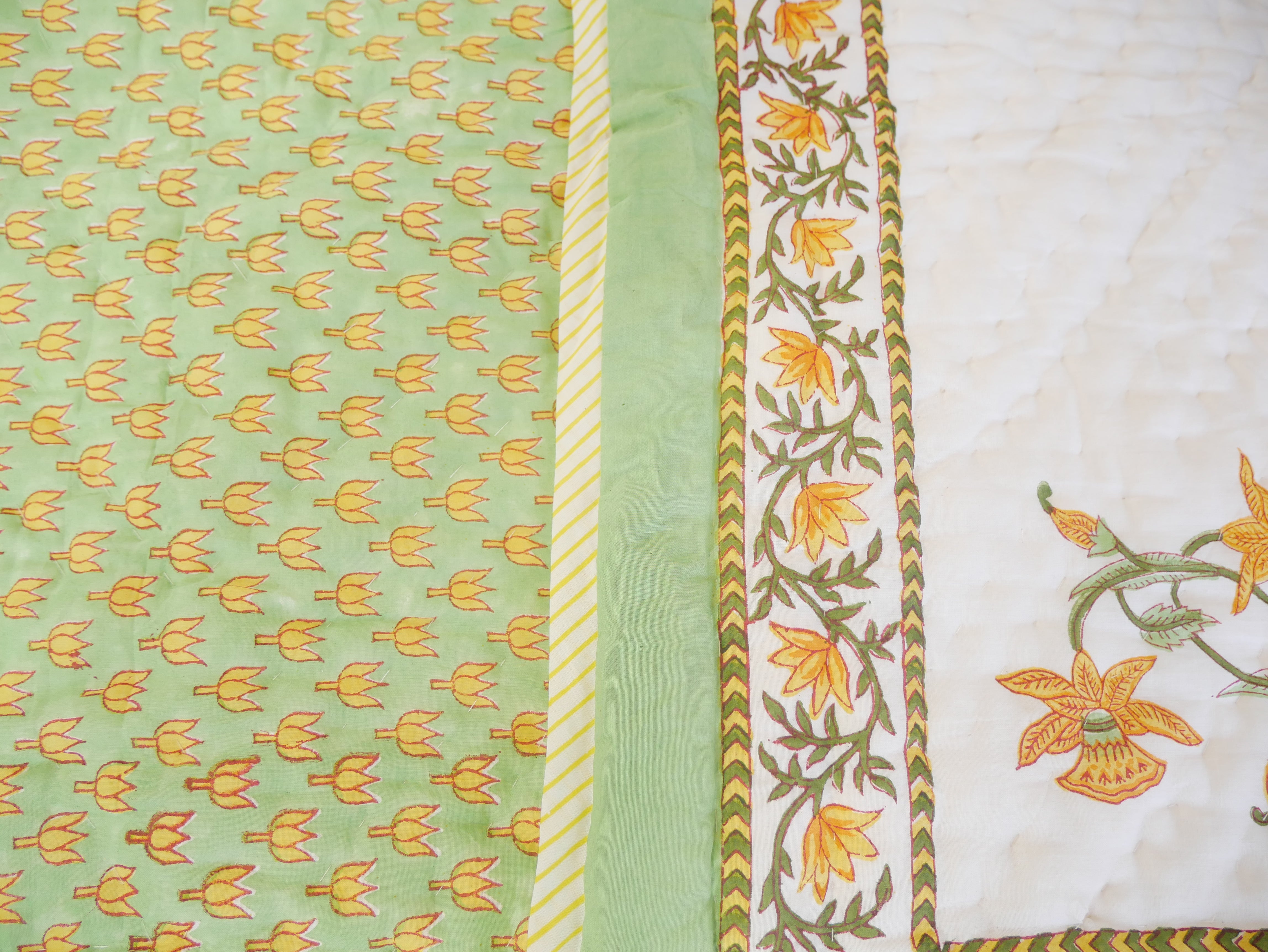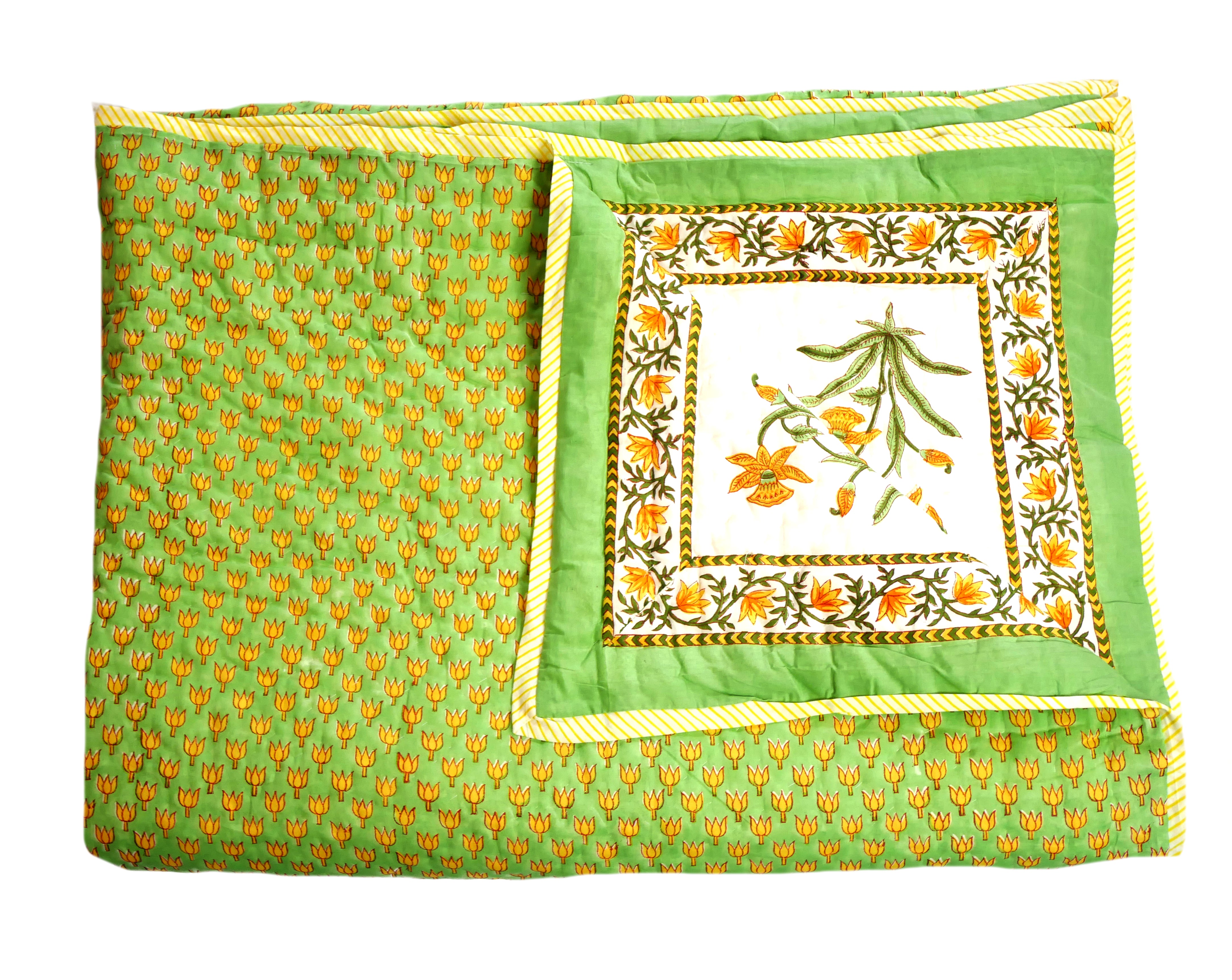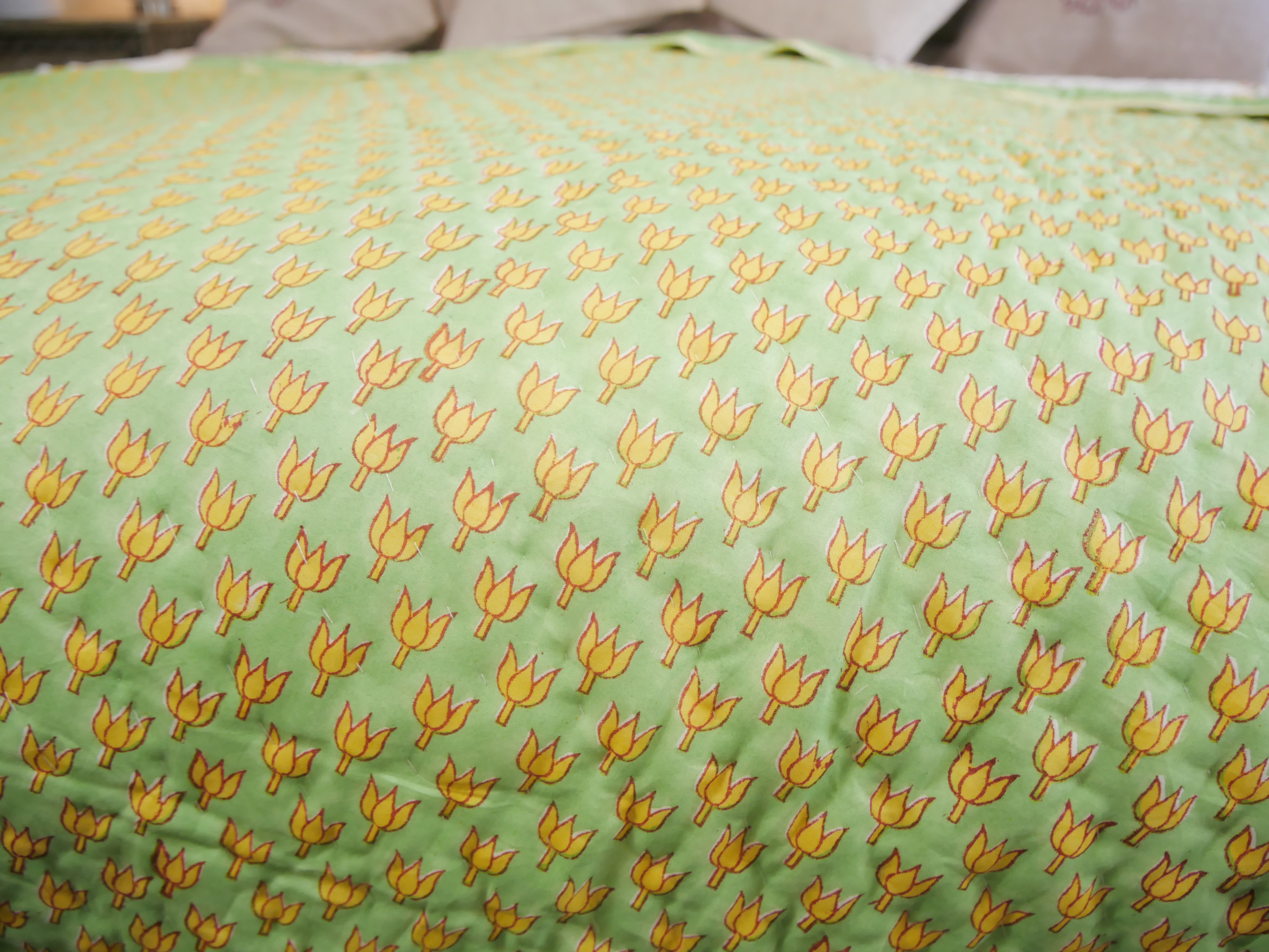 Het is met de hand genaaid en toont ingewikkelde handgemaakte blokprints uit Rajasthan.