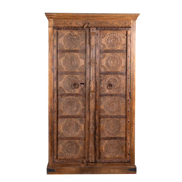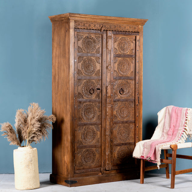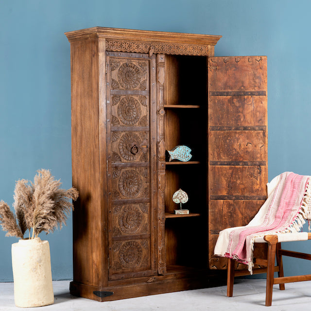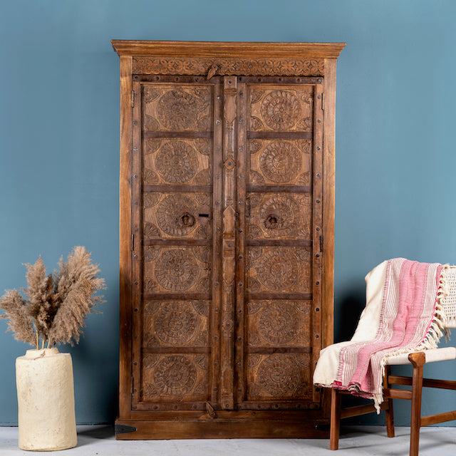 Ervaar de tijdloze schoonheid en exquise charme van onze Indiase kast Kangra, gemaakt van oude, gerecyclede teakhouten deuren. Elke deur vertelt zijn eigen verhaal, rijkelijk versierd met ingewikkeld handgesneden bloemenpatronen die een rijke culturele traditie weerspiegelen.