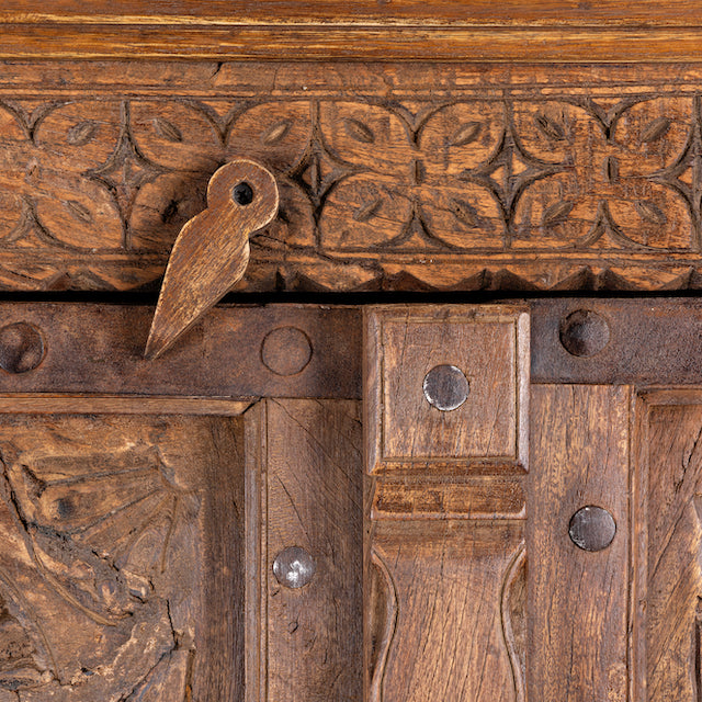 Beschermd door een zorgvuldig aangebrachte laag was, glanst de kast in een tijdloze glans die zijn schoonheid voor generaties lang bewaart. Perfect voor degenen die op zoek zijn naar een statement piece met geschiedenis en karakter, deze kast brengt een vleugje Indiase flair en elegantie in uw huis.