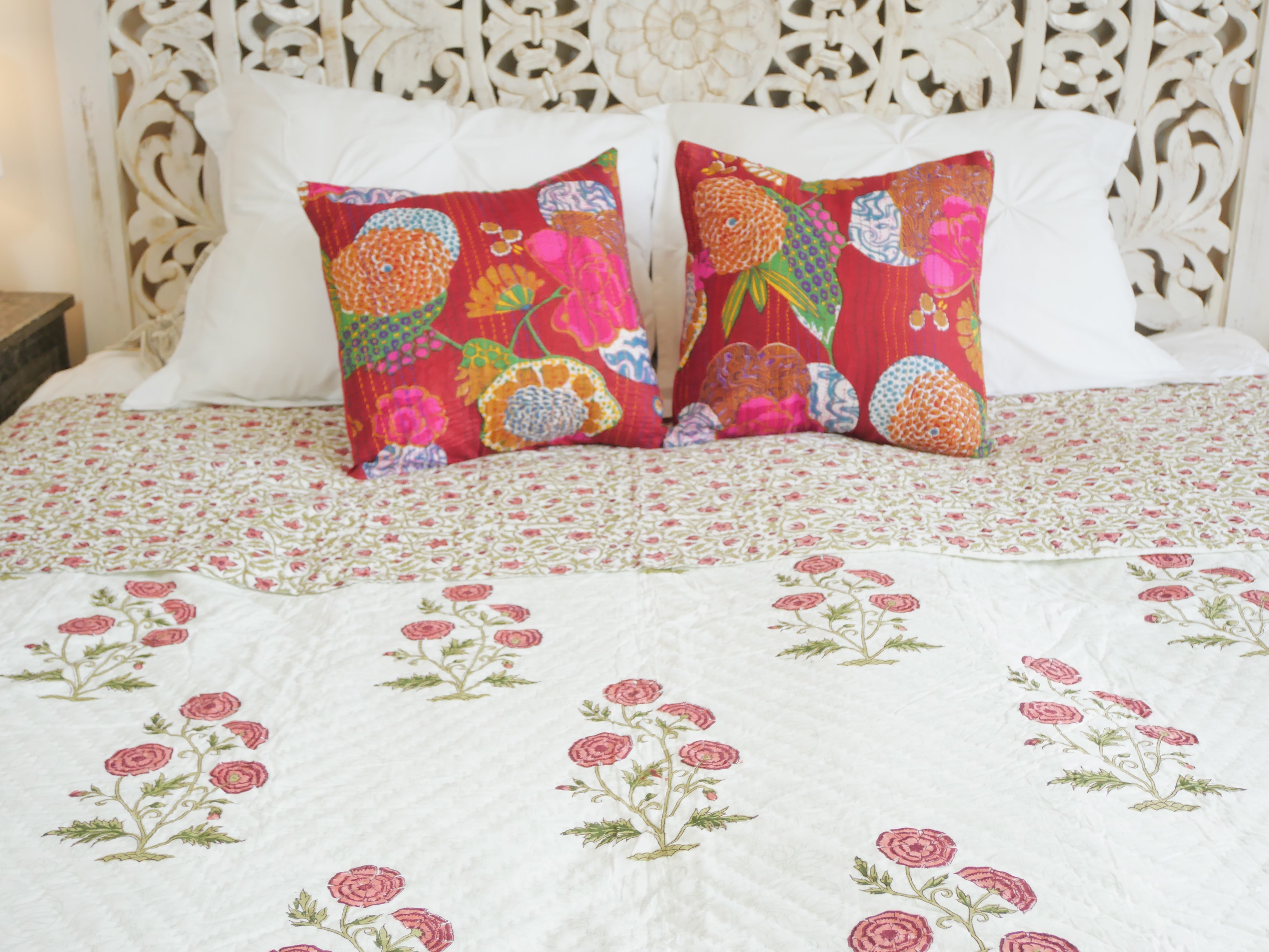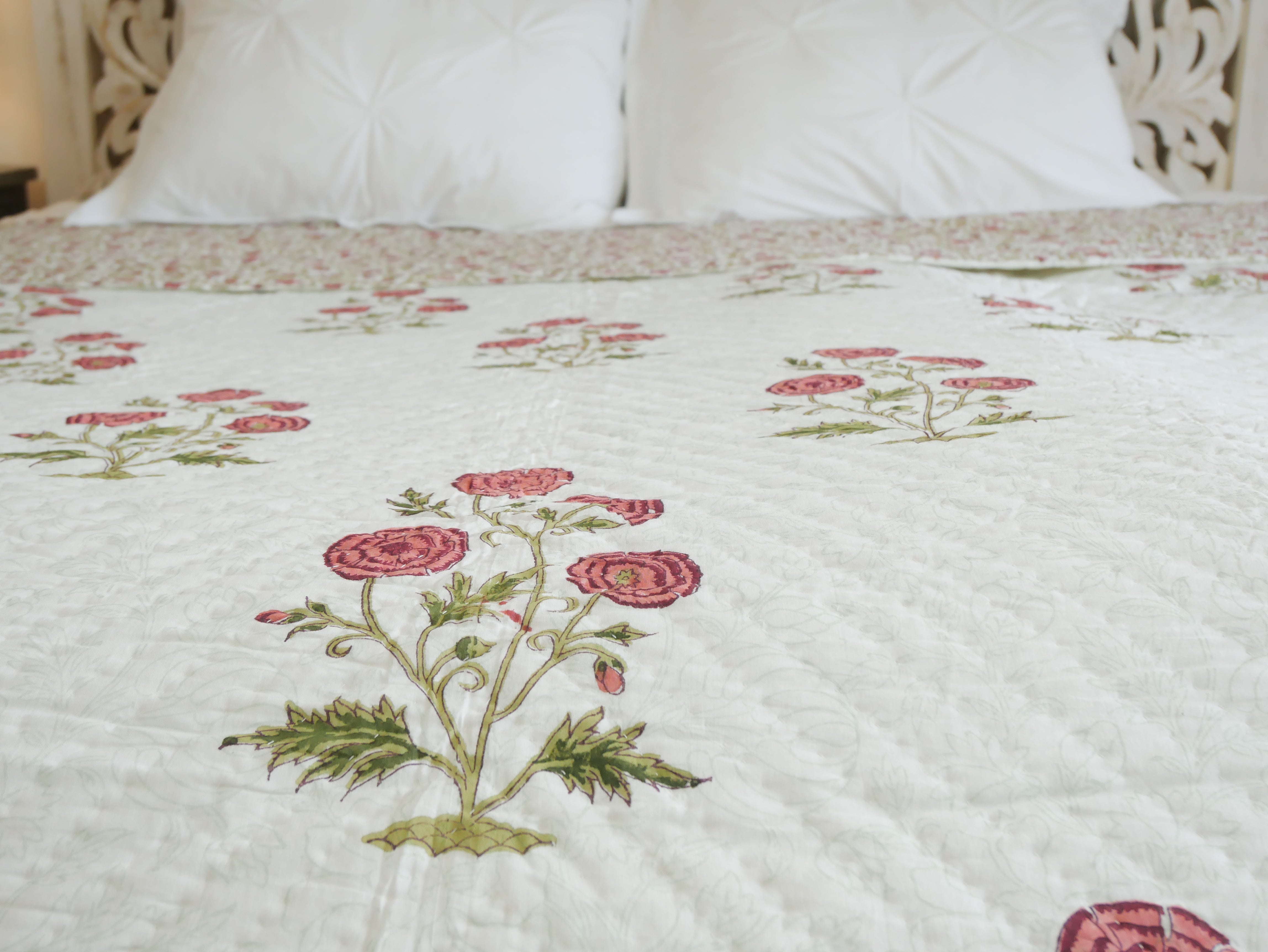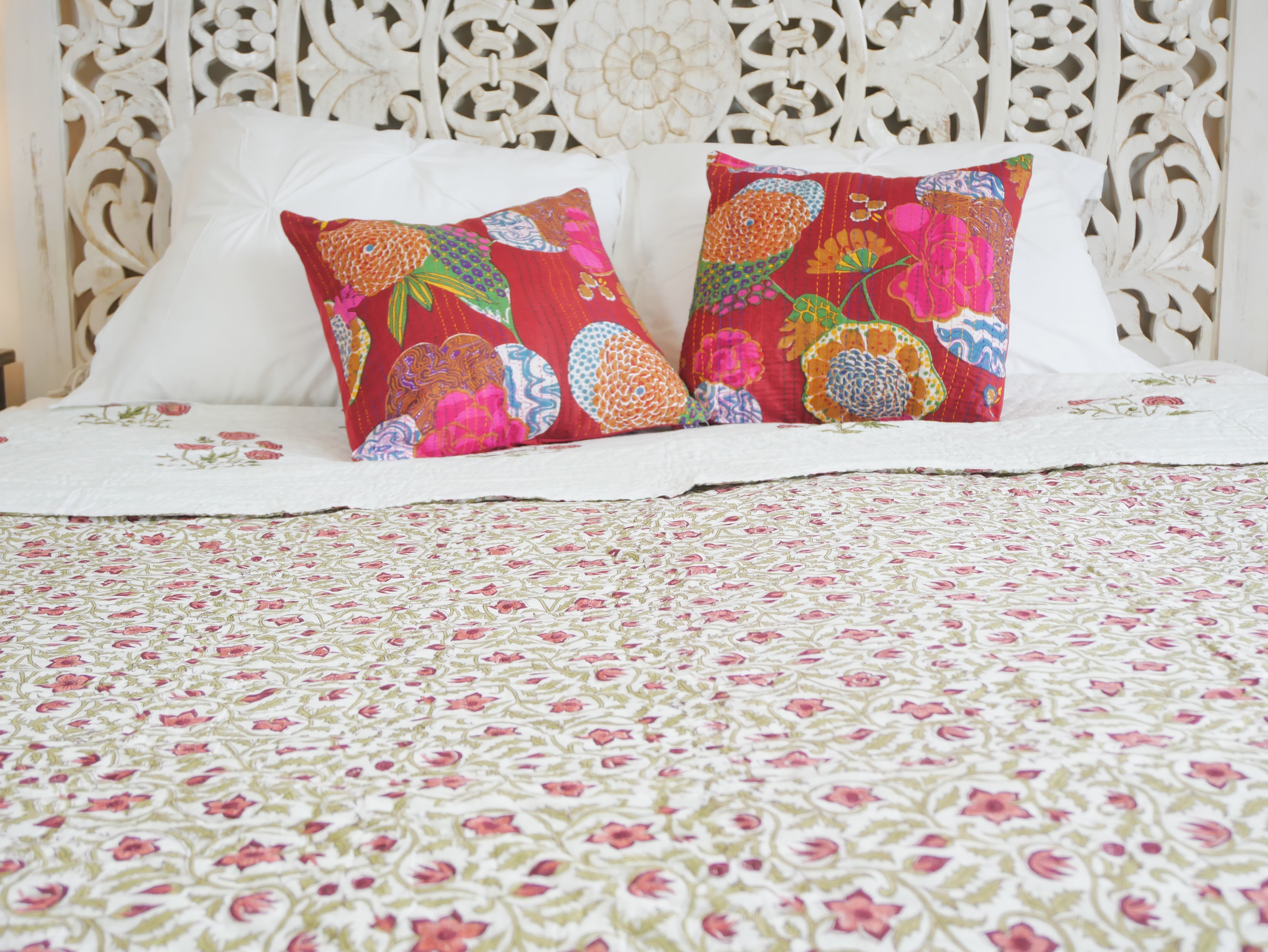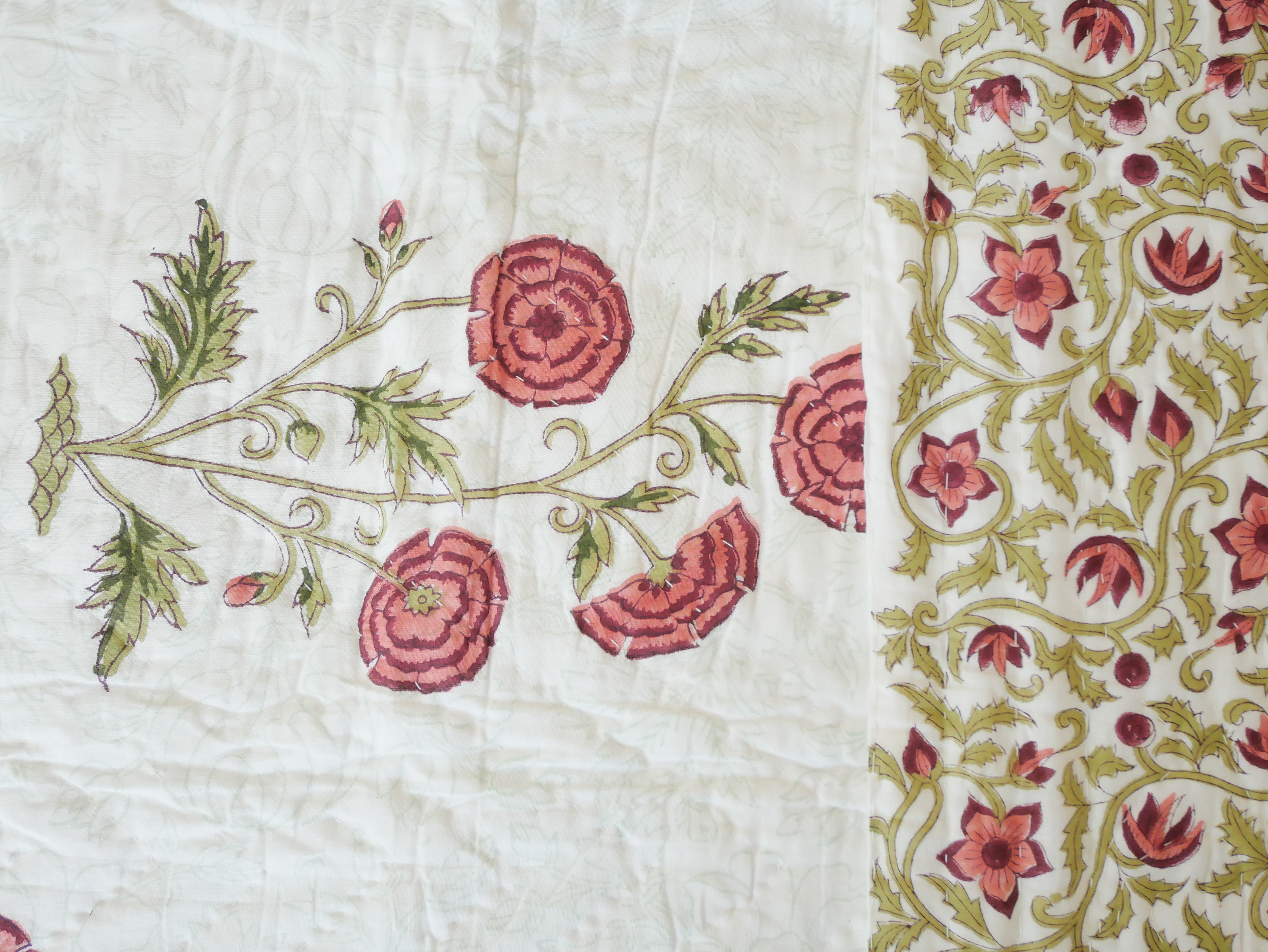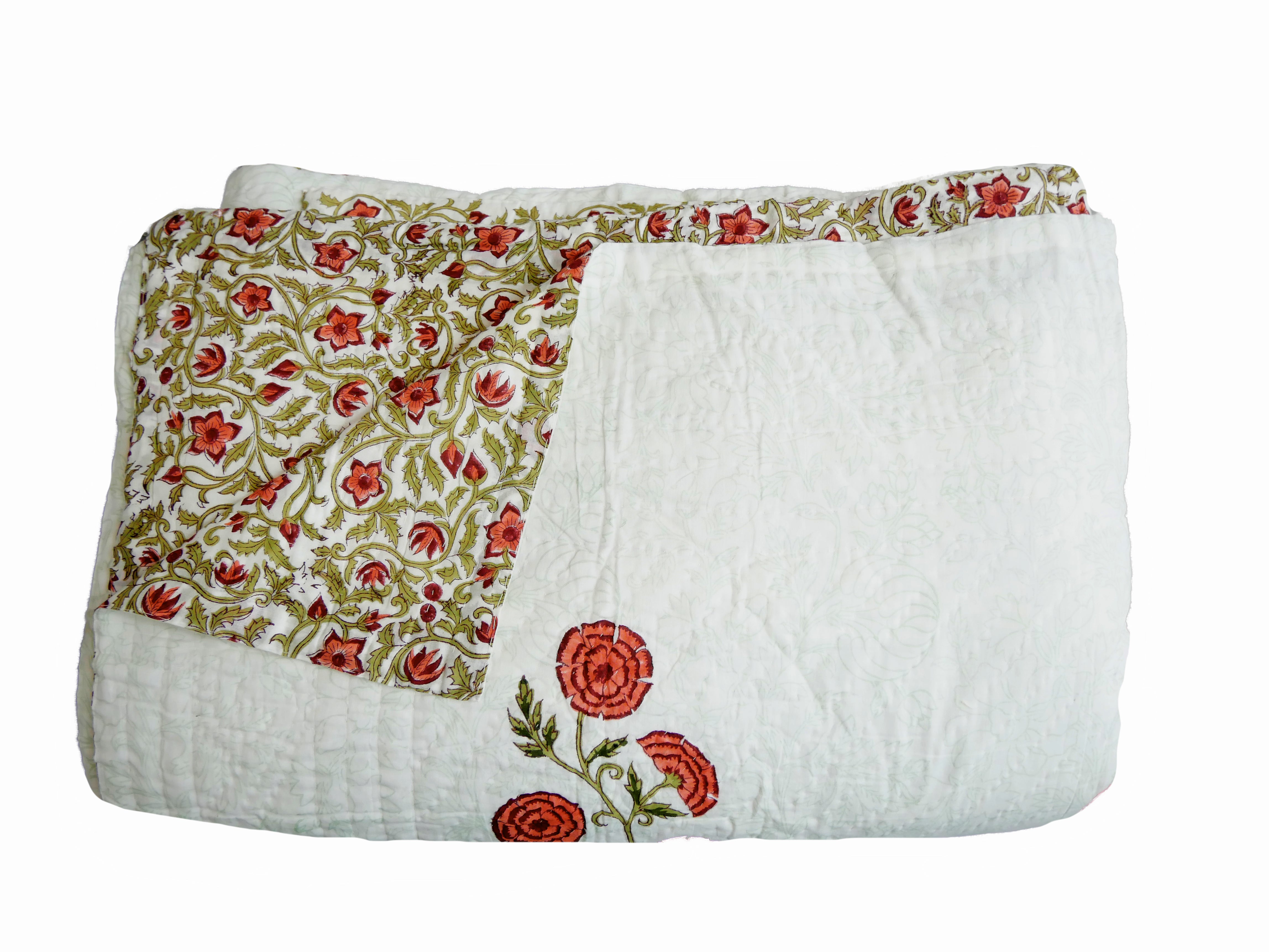 Deze deken is een waar ambachtelijk product: met de hand geborduurd en genaaid. De typische bloemmotieven van Rajasthan zijn met de hand in blokdruk op beide zijden van de deken aangebracht.