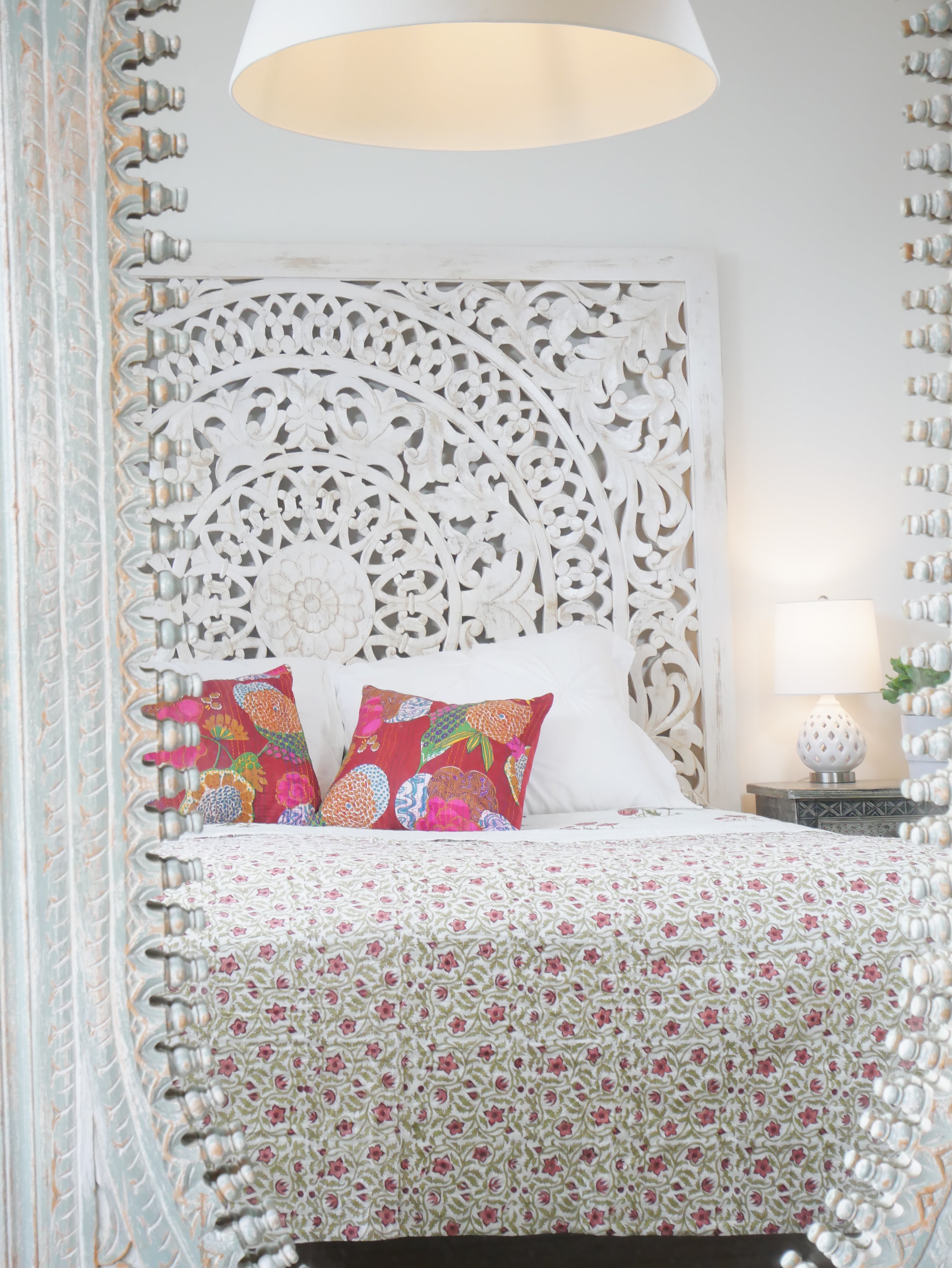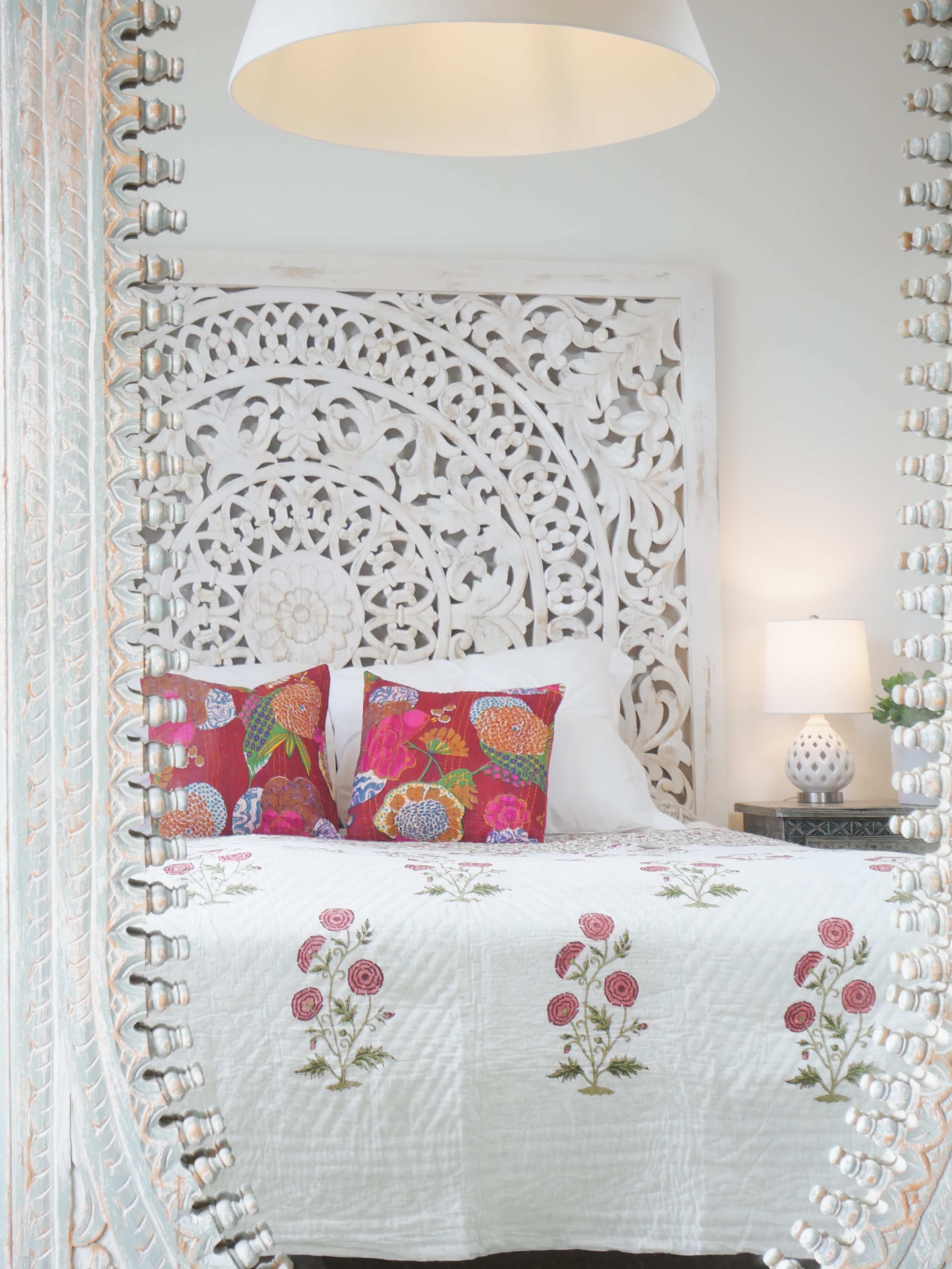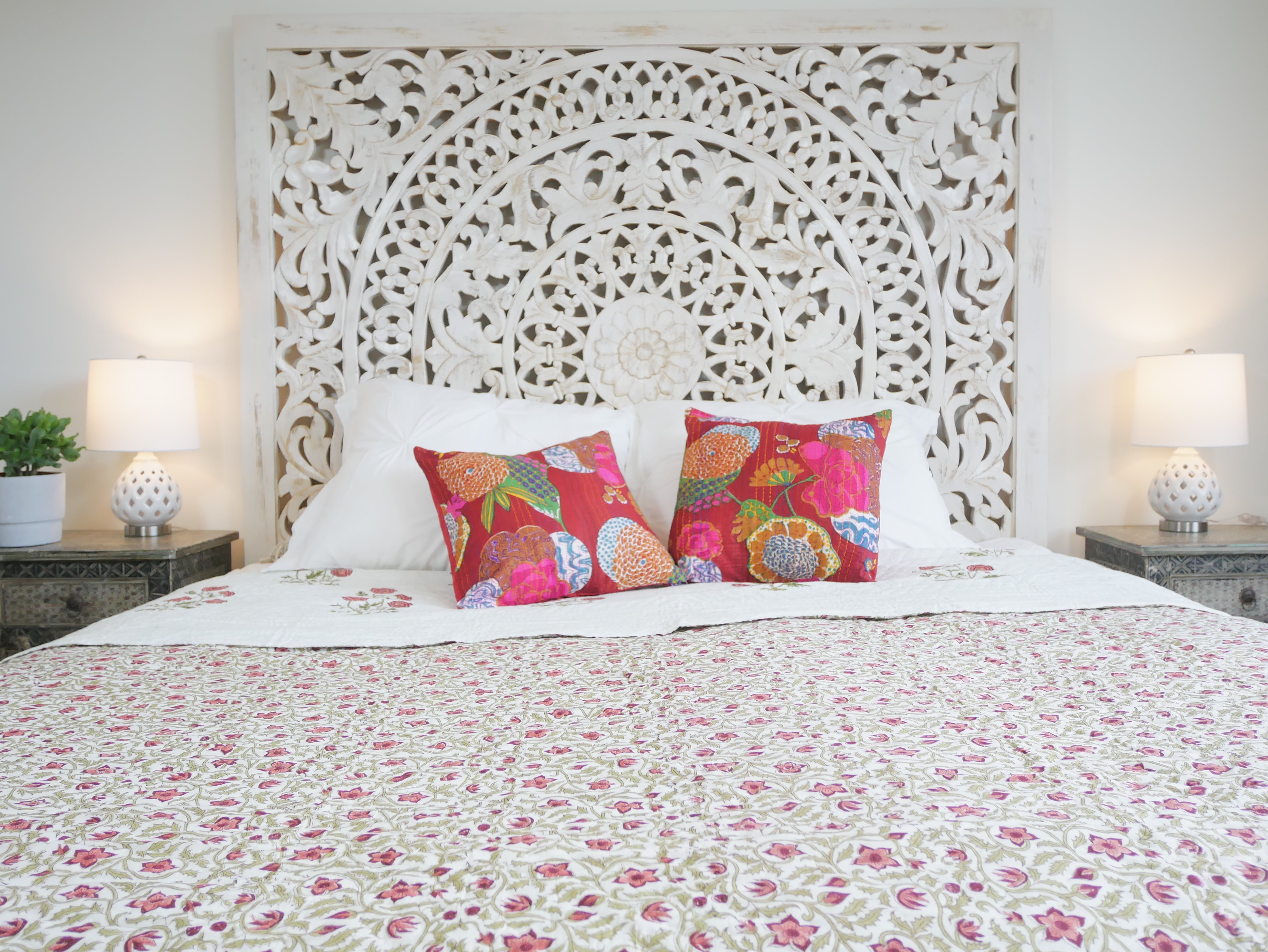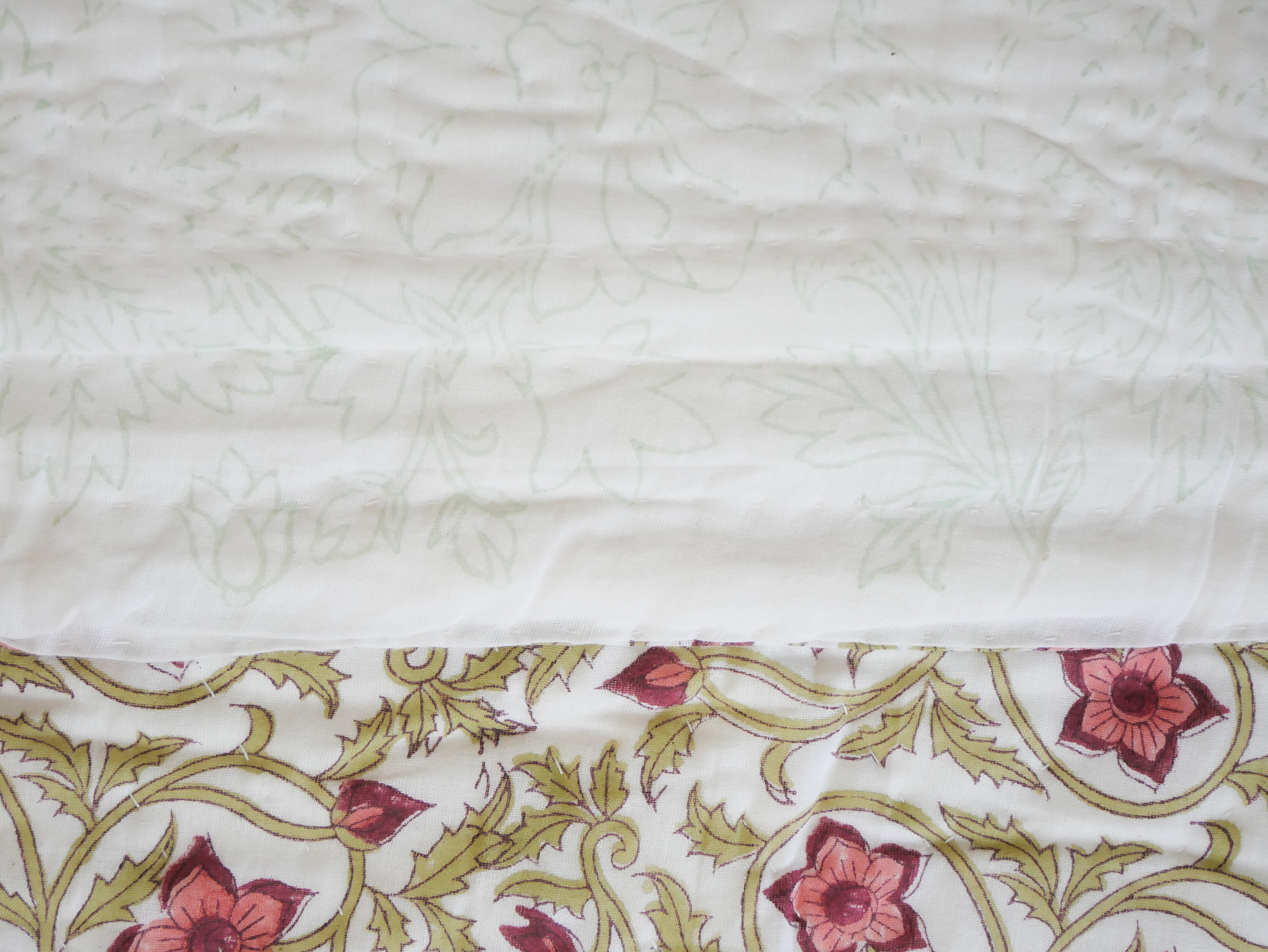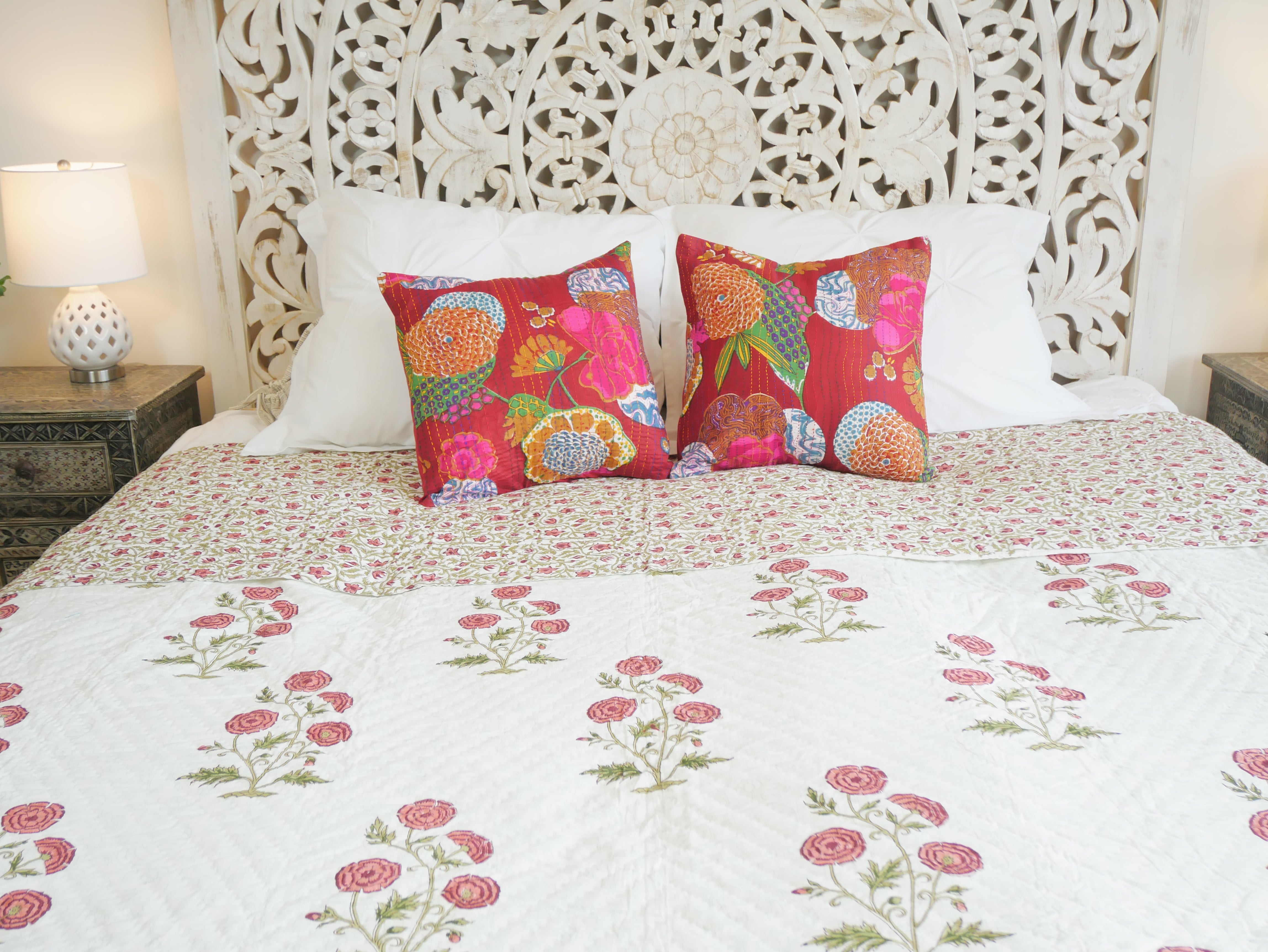 Deze deken is een waar ambachtelijk product: met de hand geborduurd en genaaid. De typische bloemmotieven van Rajasthan zijn met de hand in blokdruk op beide zijden van de deken aangebracht.