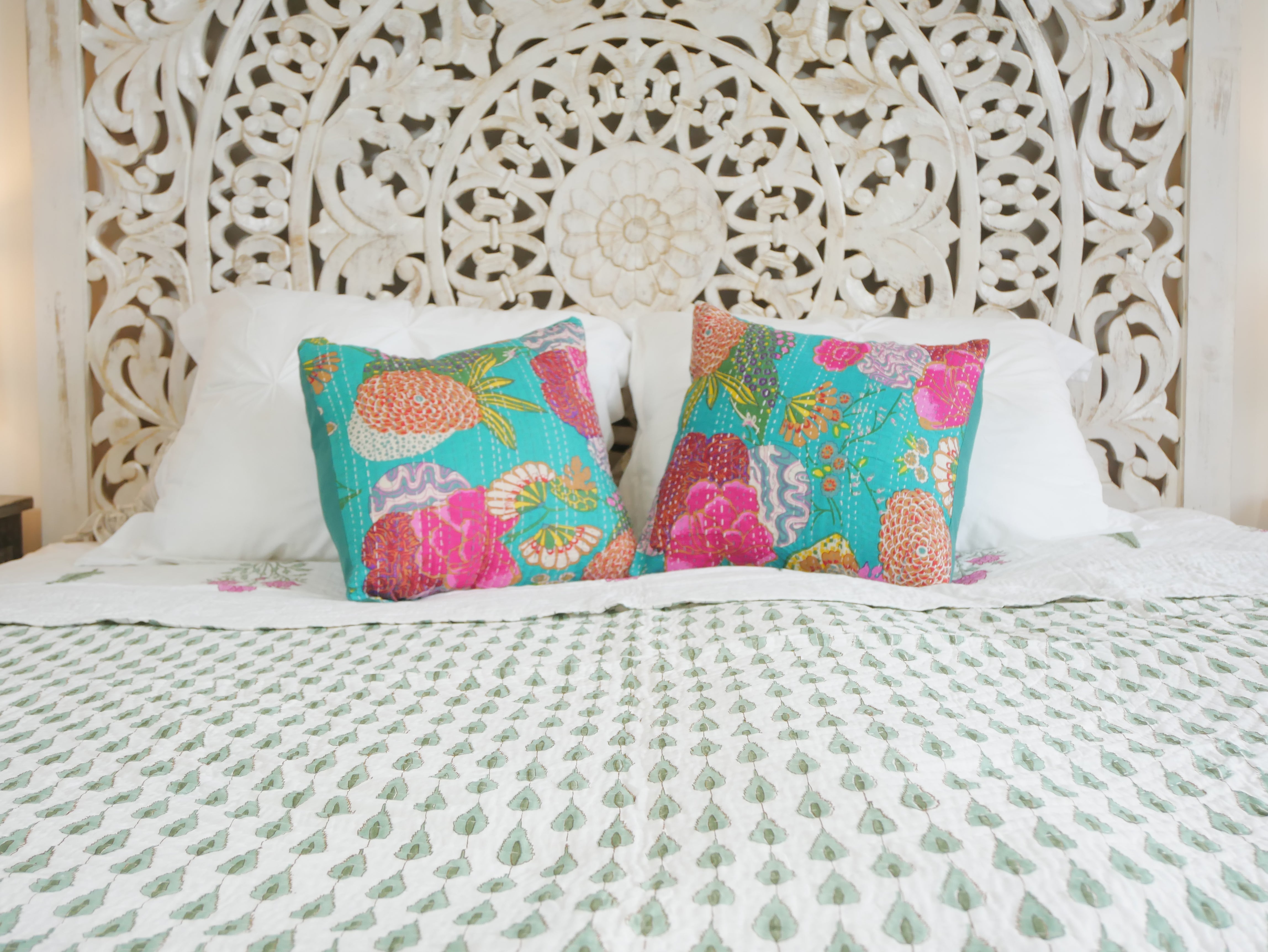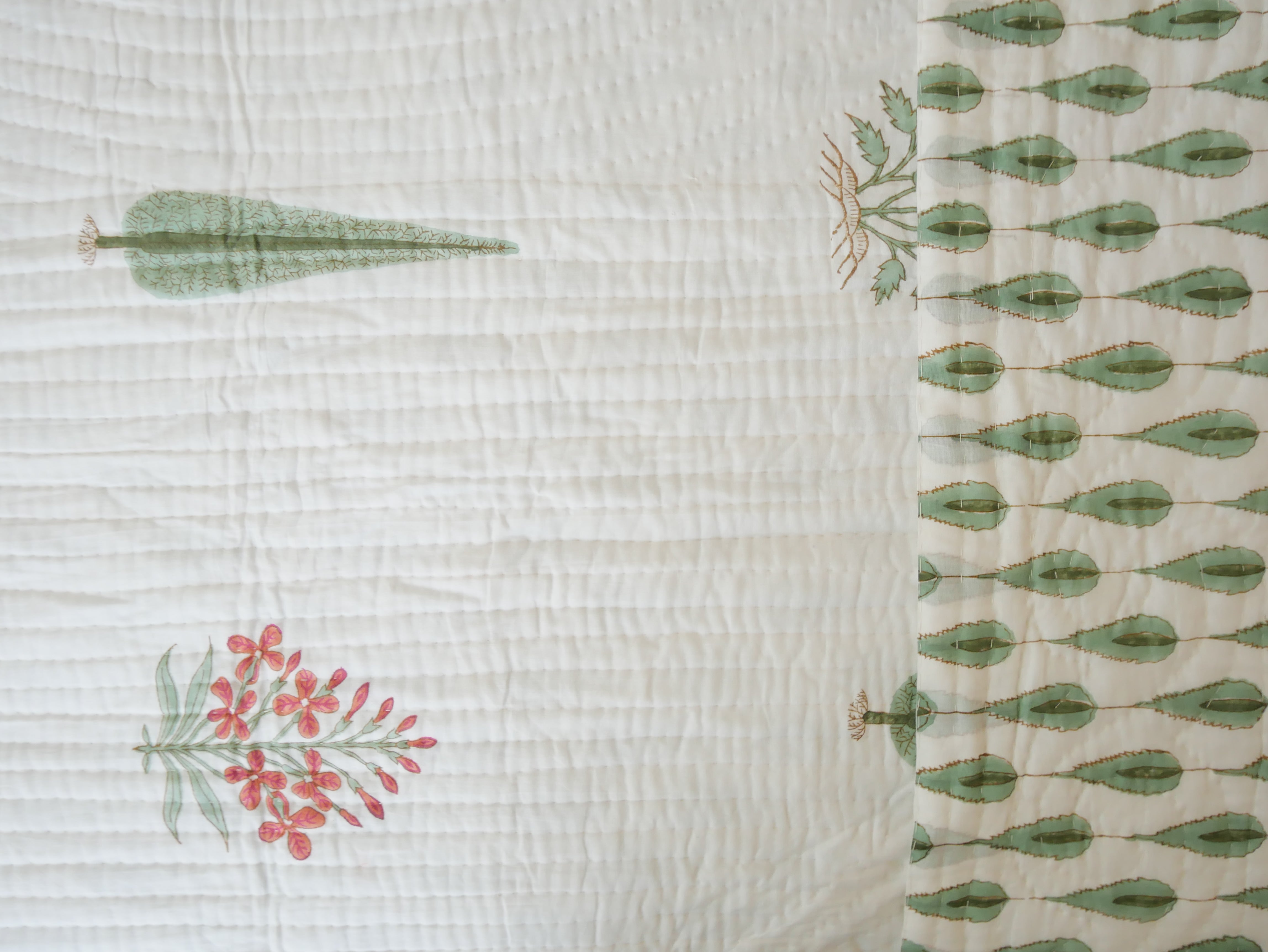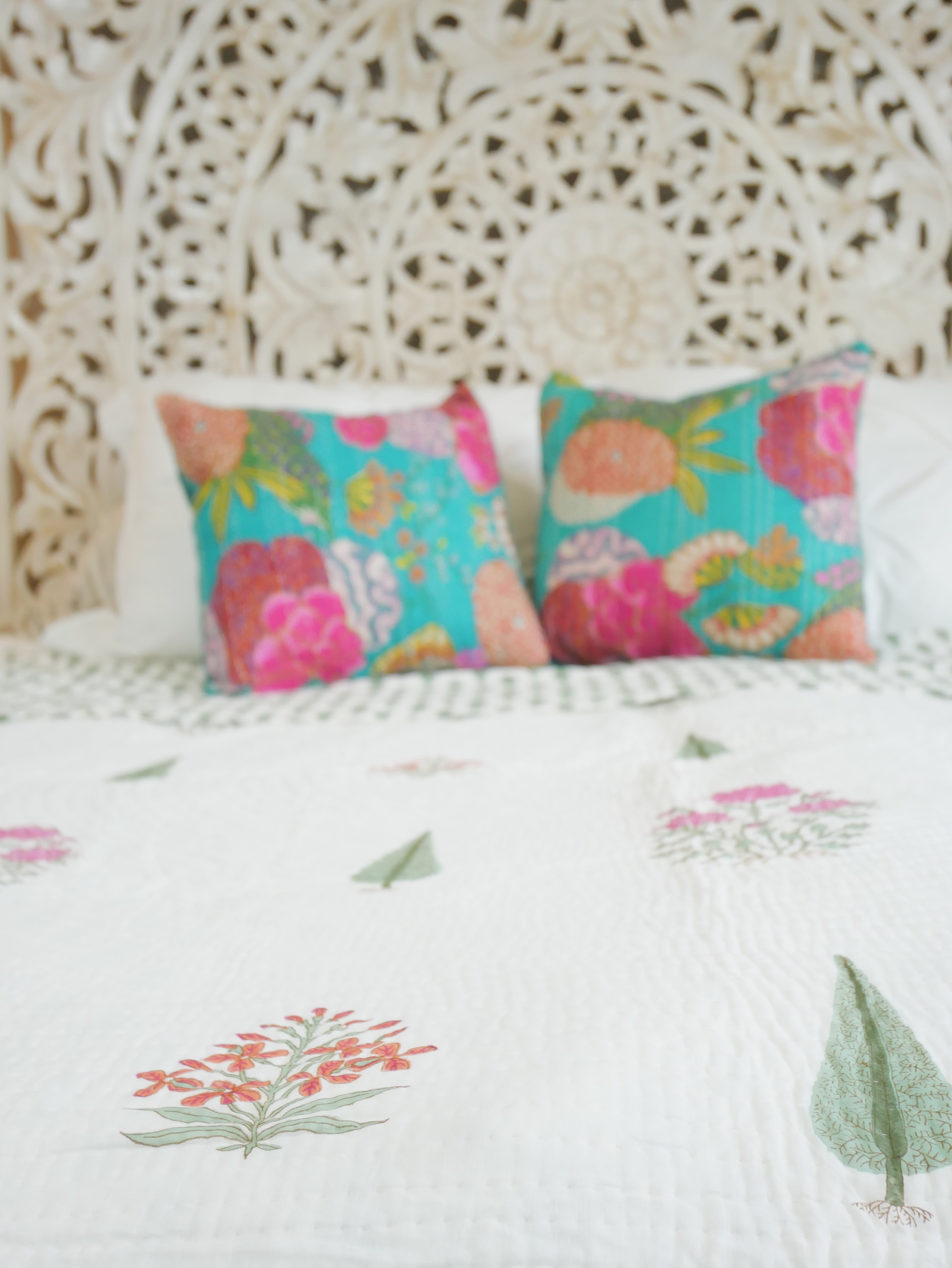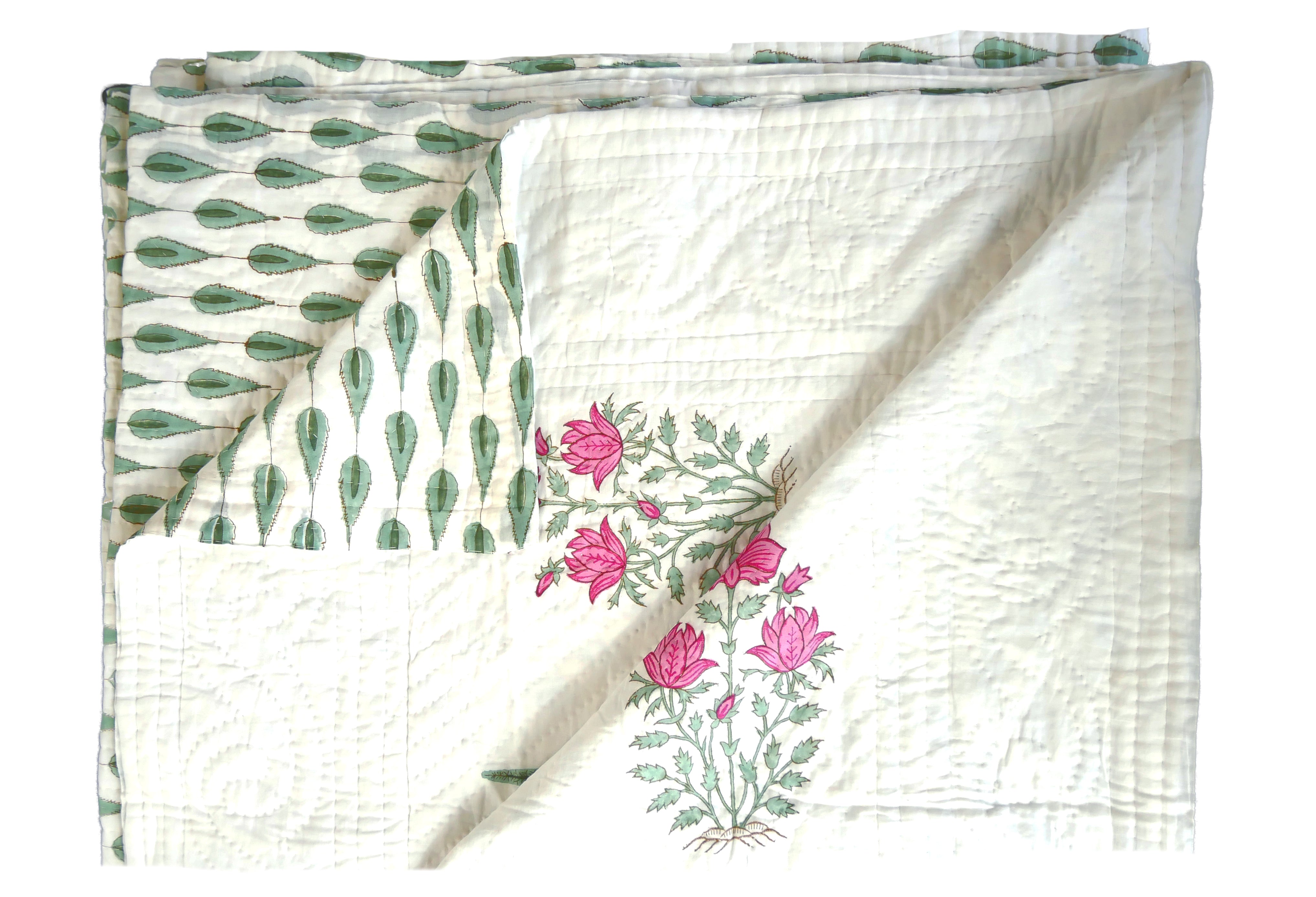 Deze deken is een waar ambachtelijk product: met de hand geborduurd en genaaid. De typische bloemmotieven van Rajasthan zijn met de hand in blokdruk op beide zijden van de deken aangebracht.