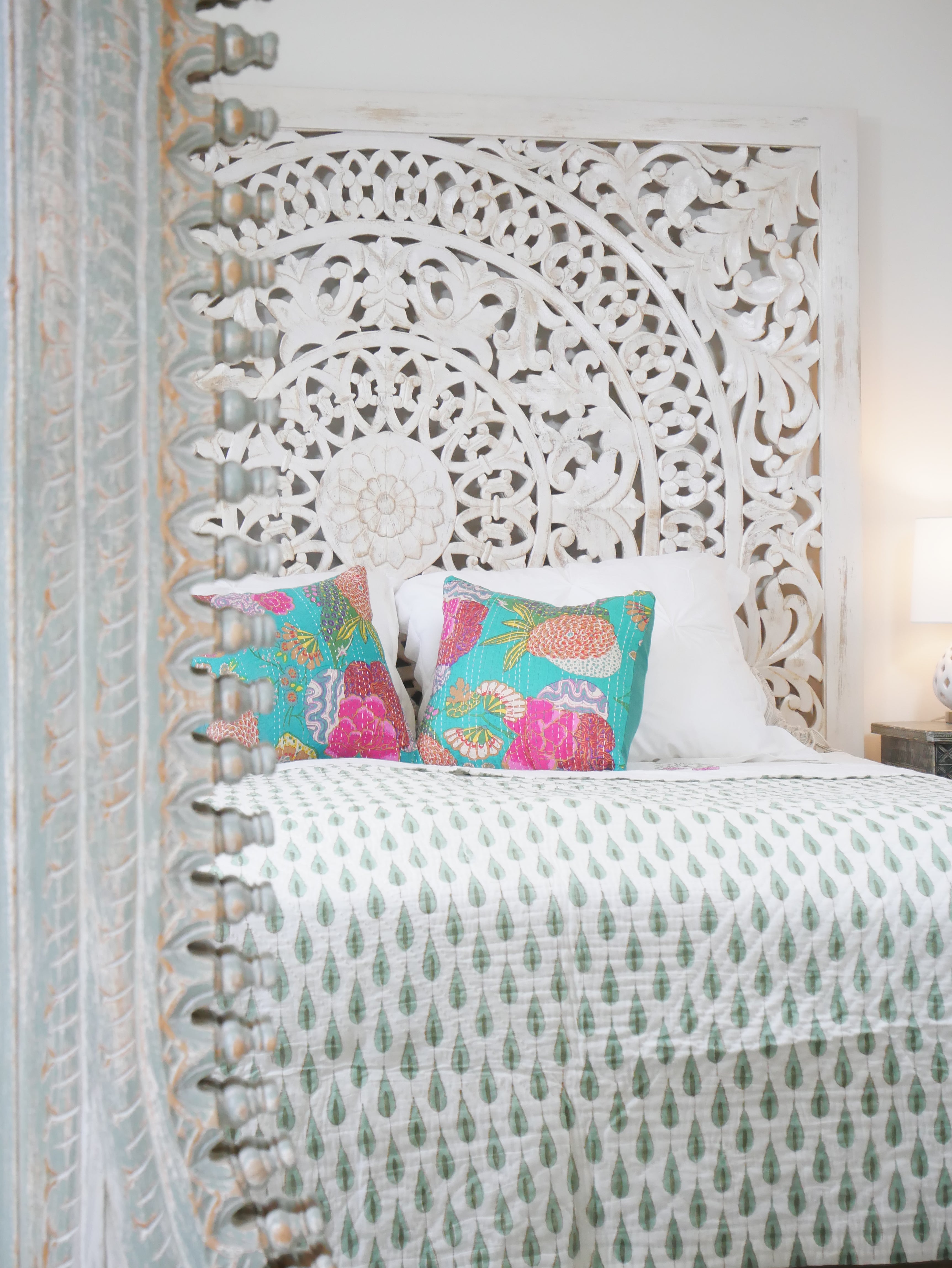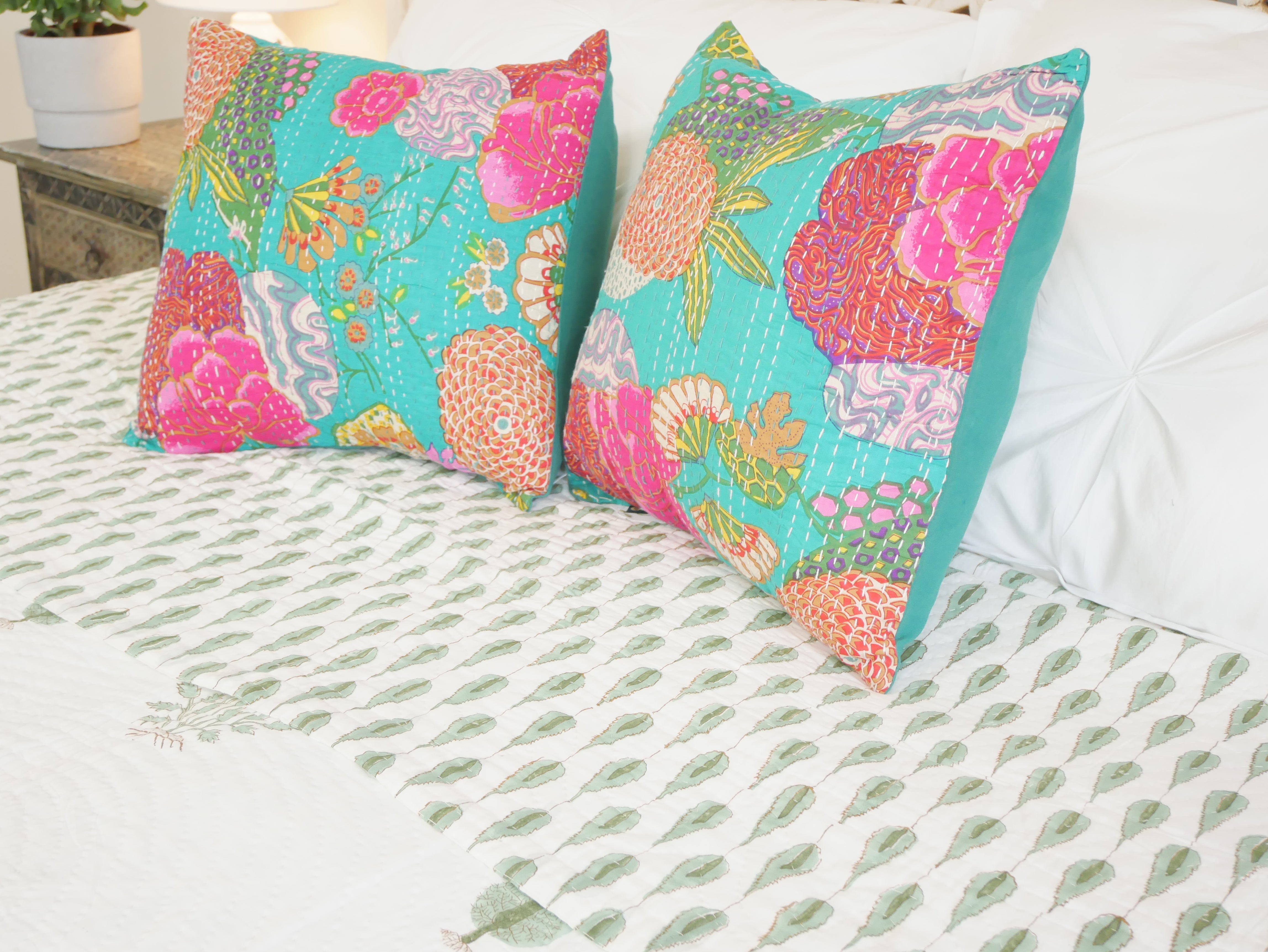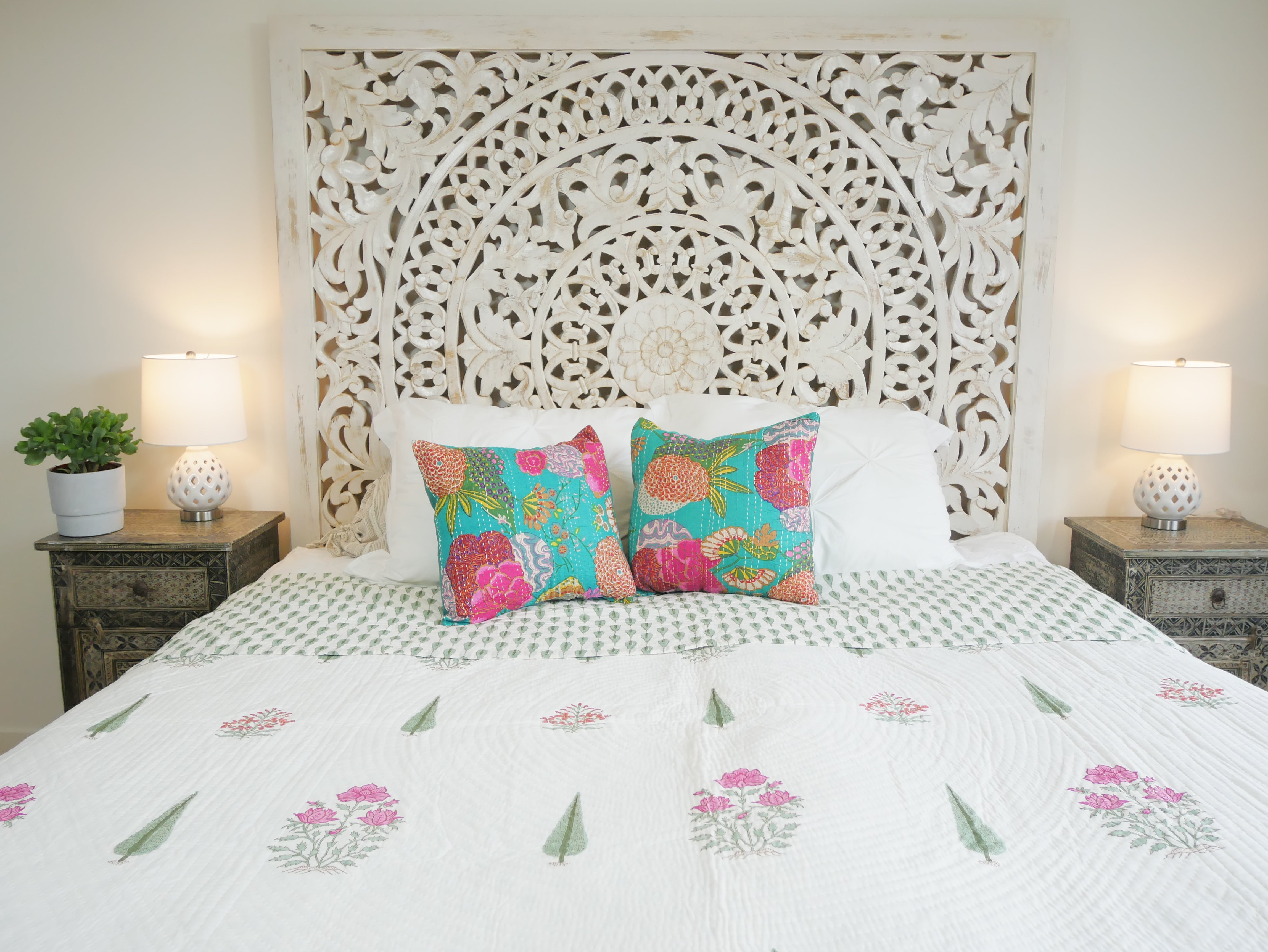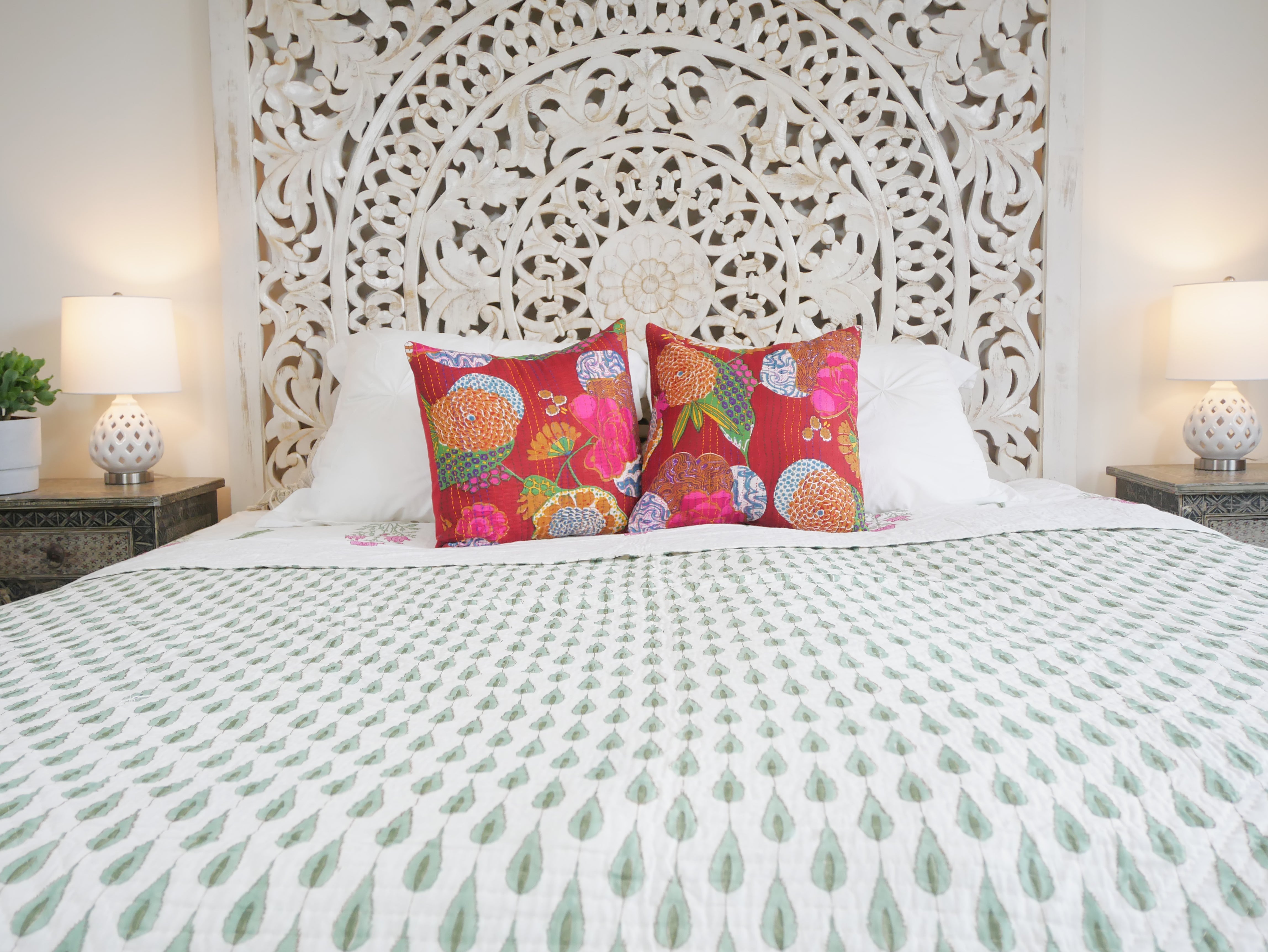 Deze deken is een waar ambachtelijk product: met de hand geborduurd en genaaid. De typische bloemmotieven van Rajasthan zijn met de hand in blokdruk op beide zijden van de deken aangebracht.