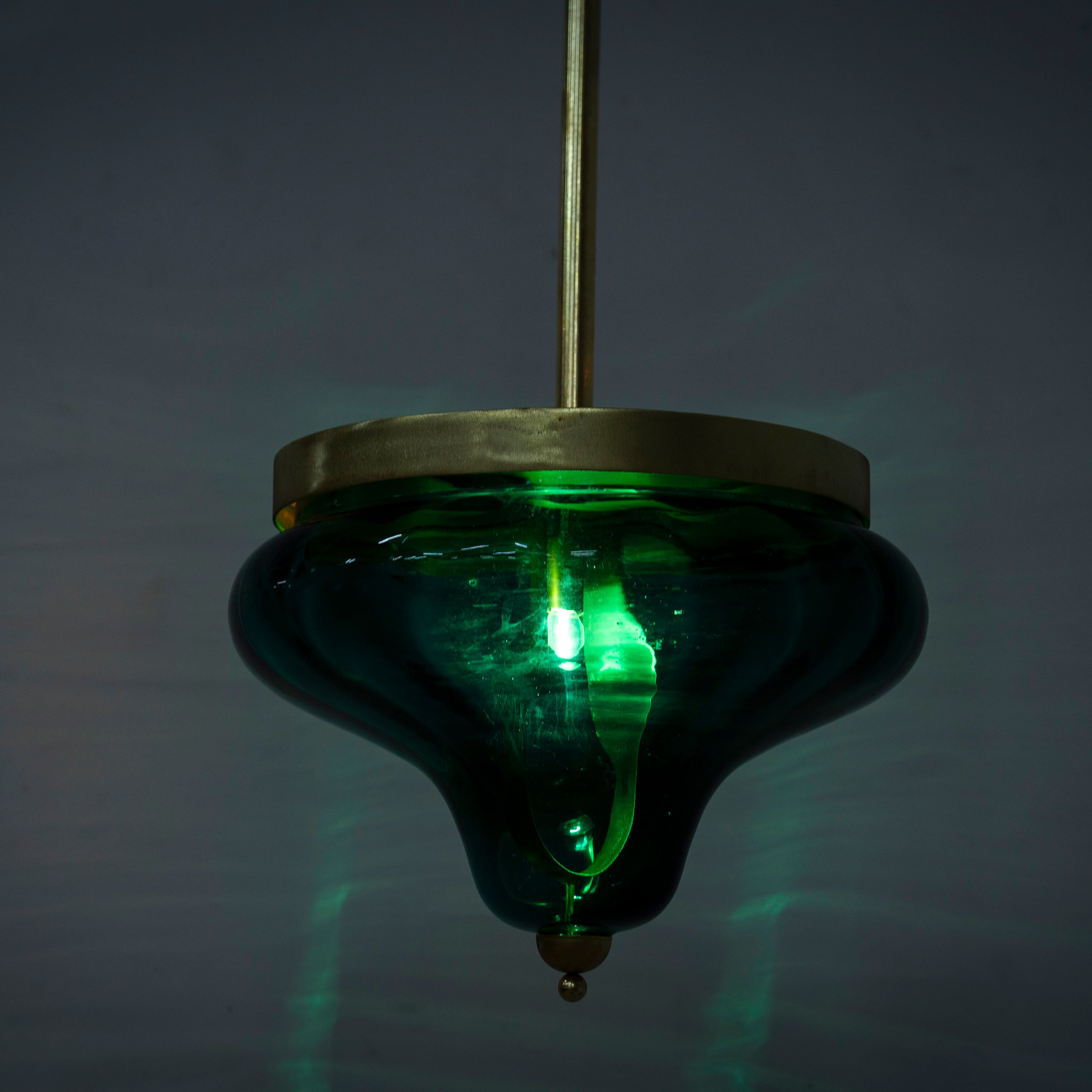 Het messing frame zorgt niet alleen voor duurzaamheid, maar zorgt ook voor een rijke, warme gloed die prachtig contrasteert met het groene glas. Deze combinatie creëert een boeiend middelpunt dat past bij verschillende decorstijlen, van klassiek tot eigentijds.
