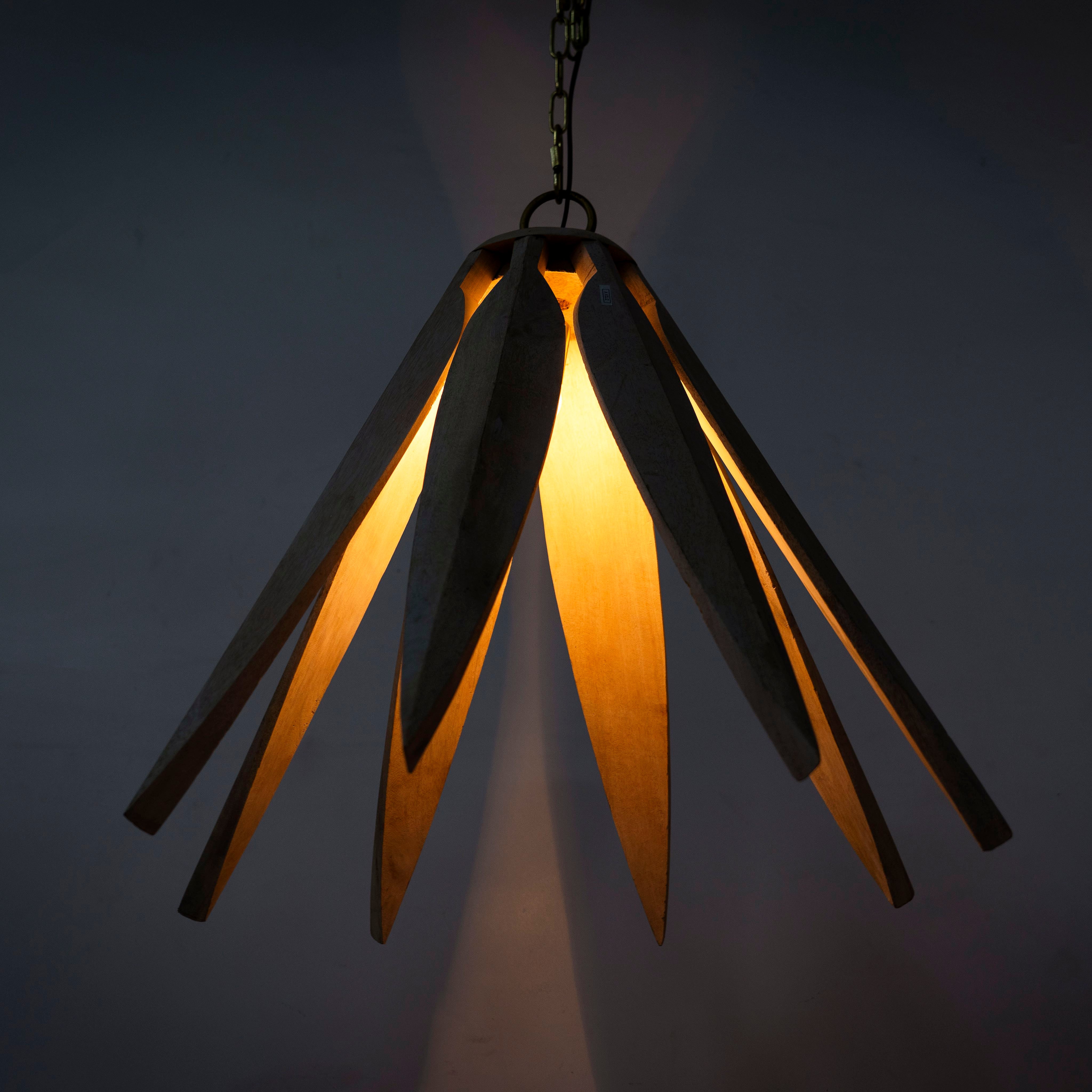 De lamp wordt elegant opgehangen aan een stevige ijzeren hanger, uitgevoerd in luxueus messing. De met messing beklede hanger zorgt niet alleen voor duurzaamheid, maar vormt ook een aanvulling op het witgewassen hout, waardoor een verfijnd contrast ontstaat. Deze combinatie van materialen en ingewikkeld ontwerp maakt de lamp tot een veelzijdig stuk dat verschillende binnenruimtes verbetert, van rustiek tot eigentijds.