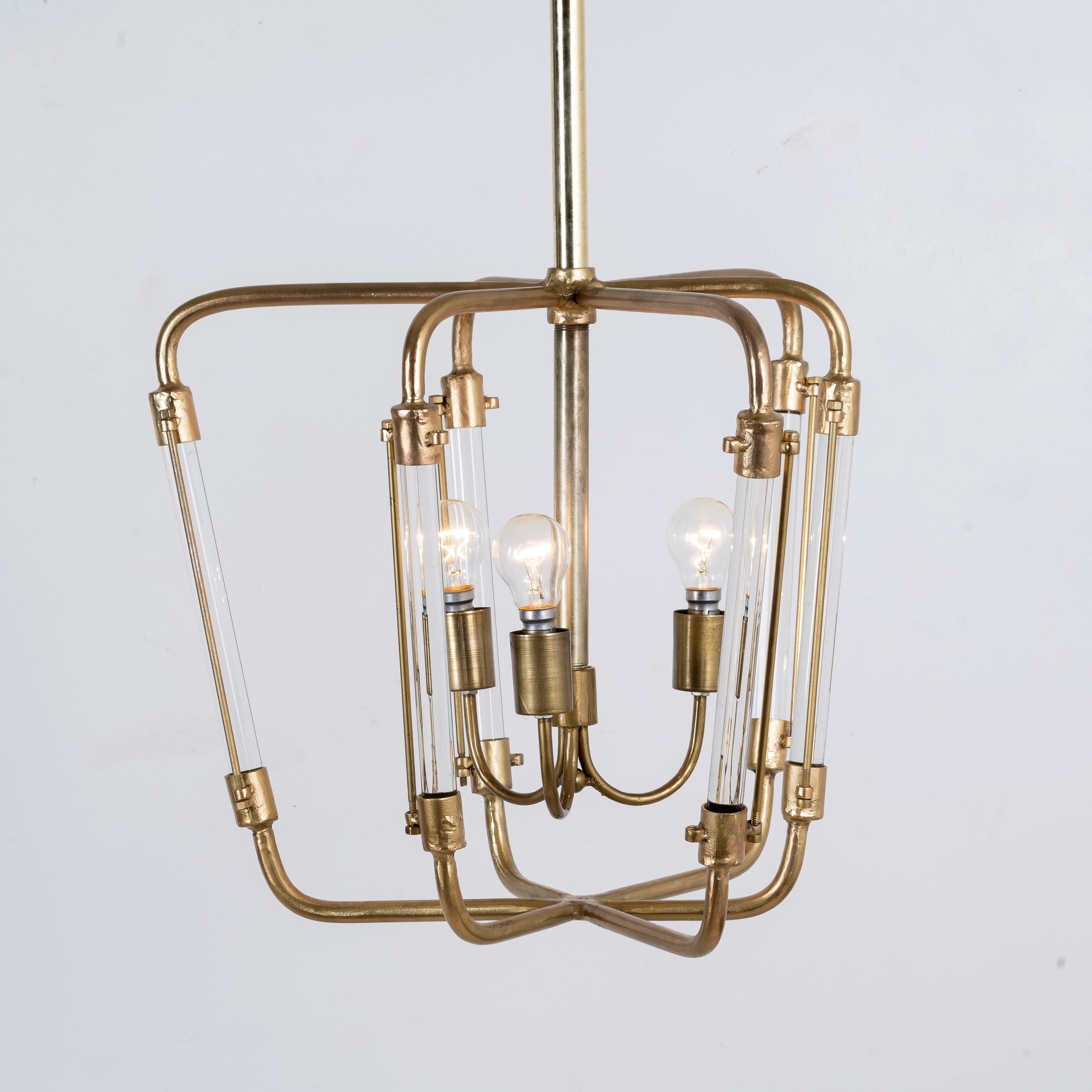 De lamp heeft in het hart een enkele lichtfitting die is versierd met een glazen kap in de vorm van een reageerbuis. Dit unieke ontwerp voegt niet alleen een artistiek tintje toe, maar zorgt er ook voor dat het licht zich zachtjes verspreidt, waardoor er in elke kamer een warme en uitnodigende ambiance ontstaat. De combinatie van het antieke messing frame en het strakke glazen element maakt deze lamp een veelzijdige toevoeging die past bij verschillende interieurstijlen.