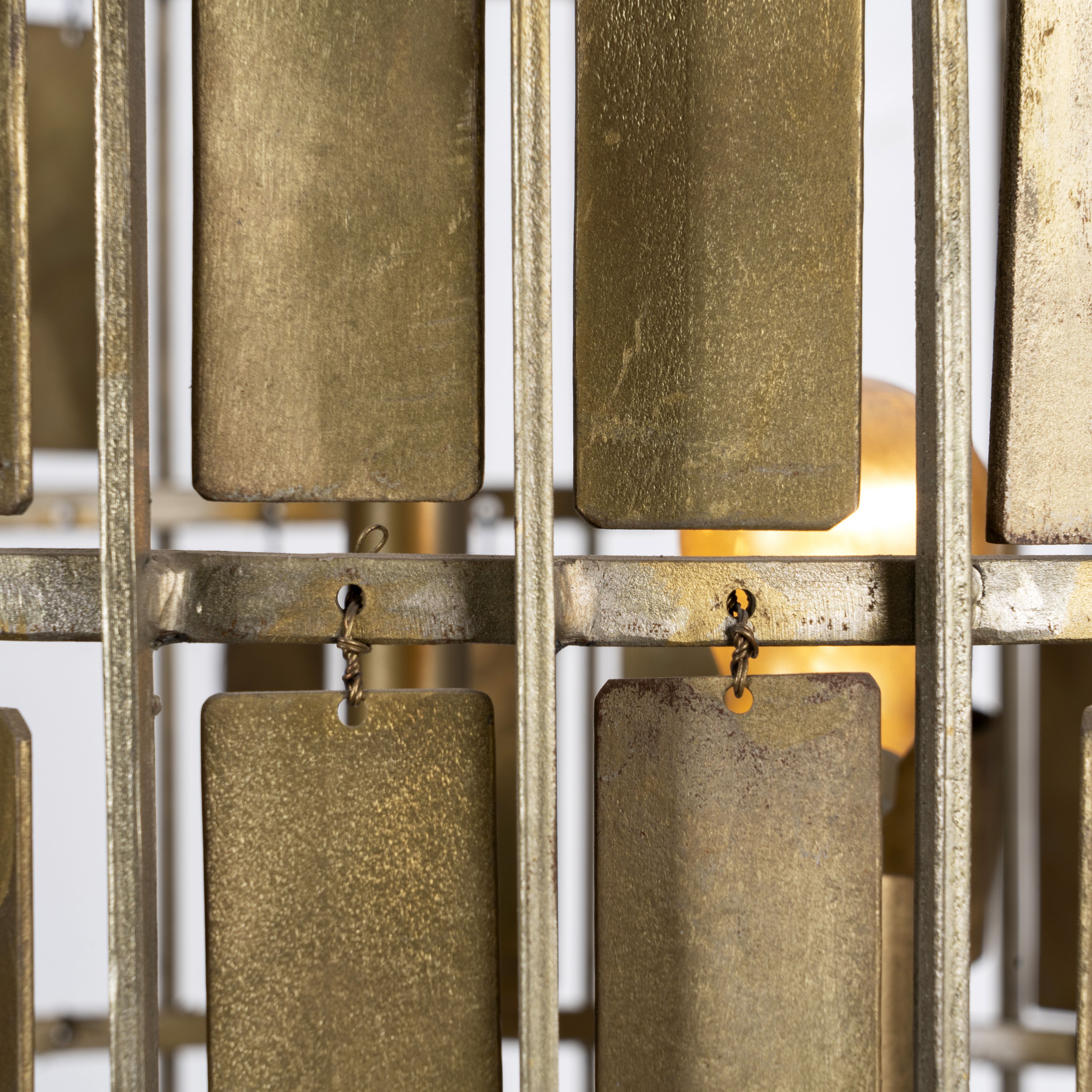 De lamp is uitgerust met drie lichtpunten, die voor voldoende verlichting zorgen en een boeiend spel van licht en schaduw creëren door het ingewikkelde tegelontwerp. Deze combinatie van robuuste ijzeren constructie en messing plating zorgt niet alleen voor duurzaamheid, maar voegt ook een verfijnde touch toe aan de algehele esthetiek.