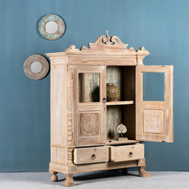Voeg een statement van elegantie en vakmanschap toe aan uw huis met deze prachtige opgeknapte teakhouten vitrine. De gezandstraalde afwerking versterkt de natuurlijke nerven van het teakhout, terwijl het unieke pootontwerp en de esthetiek in Ibiza-stijl een artistieke flair aan elke ruimte geven.