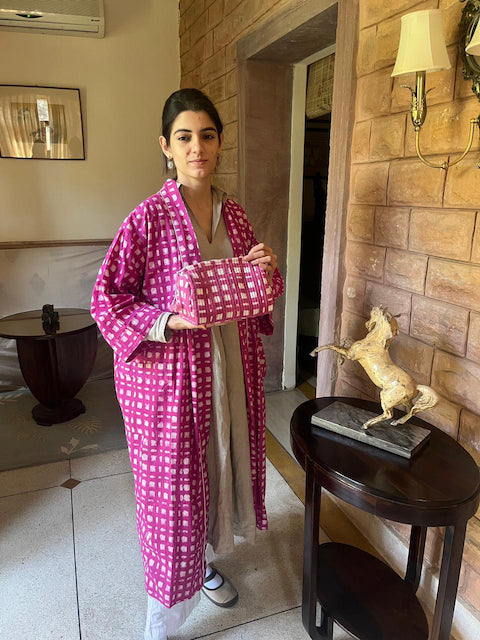 Wikkel uzelf in de levendige schoonheid van onze ochtendjassen, rechtstreeks afkomstig uit India en vervaardigd van 100% katoen. Elke badjas heeft een verscheidenheid aan kleuren en ontwerpen, waarbij traditionele Rajasthani-patronen worden gecombineerd met moderne bloemenmotieven. Deze badjassen zijn niet alleen een bewijs van uitzonderlijk vakmanschap, maar ook een viering van cultureel erfgoed en hedendaagse stijl. Ideaal om in te loungen of om een ​​exotische touch aan uw ochtendroutine toe te voegen, onze badjassen beloven comfort en elegantie in elke draad.