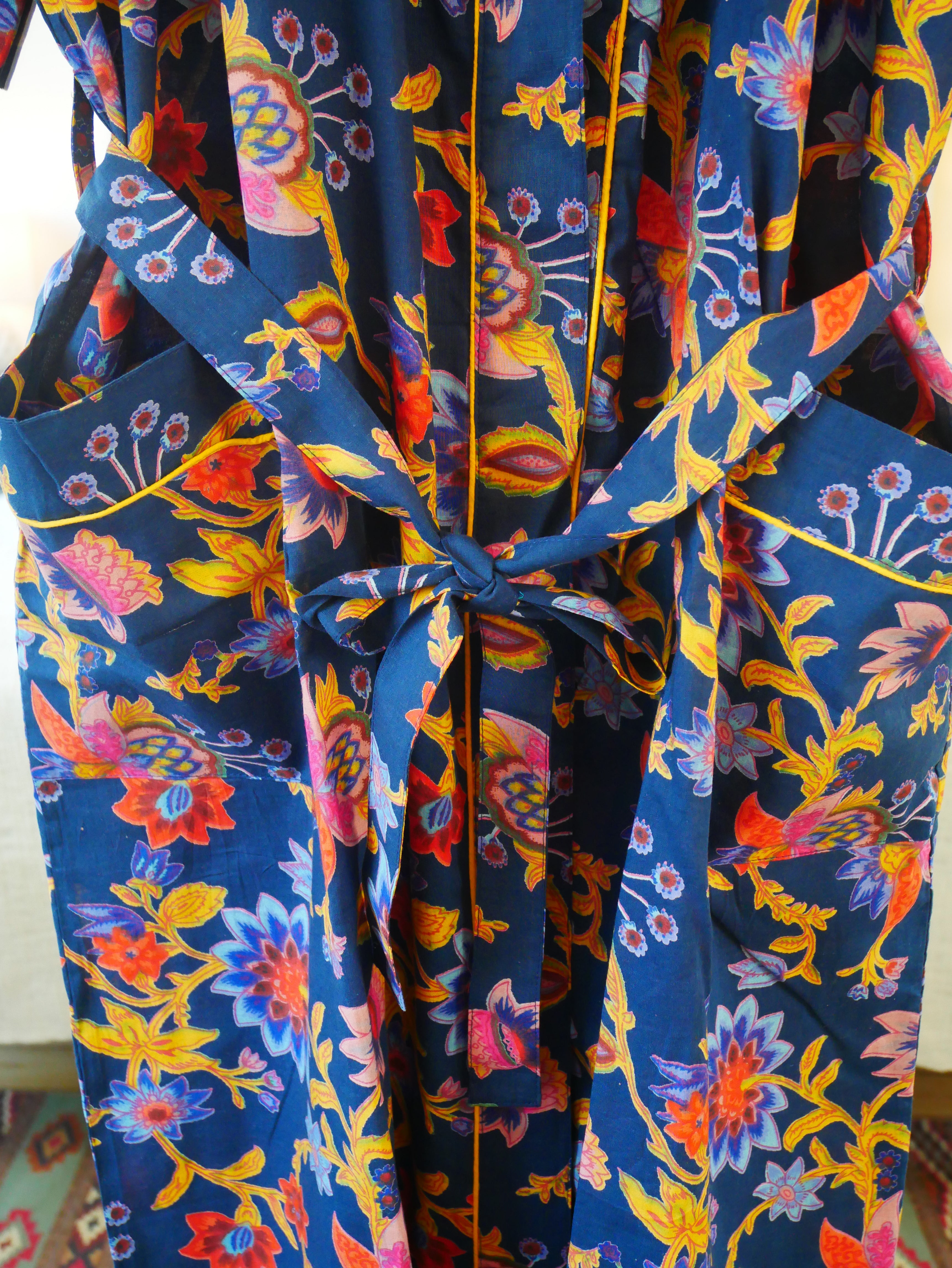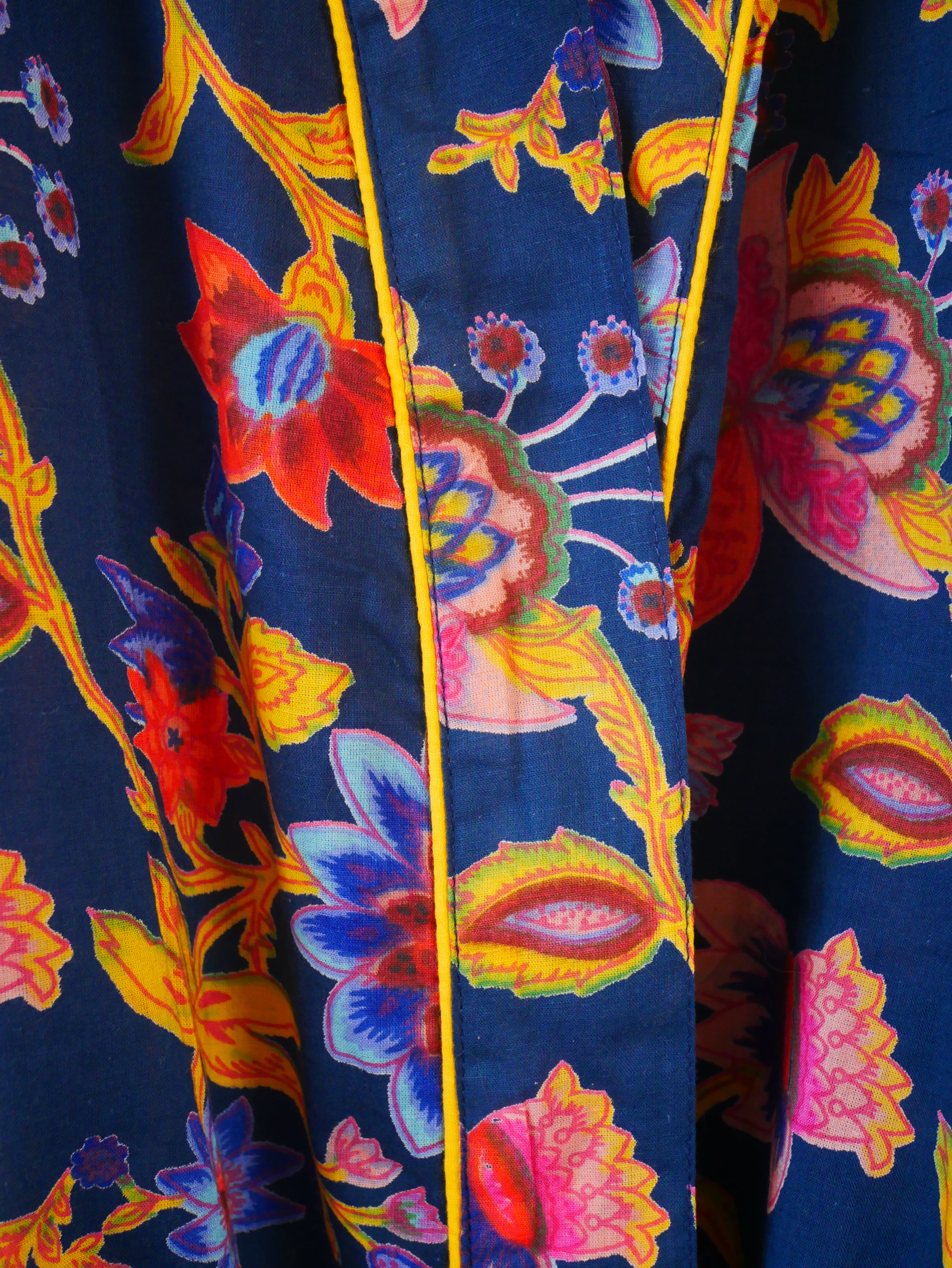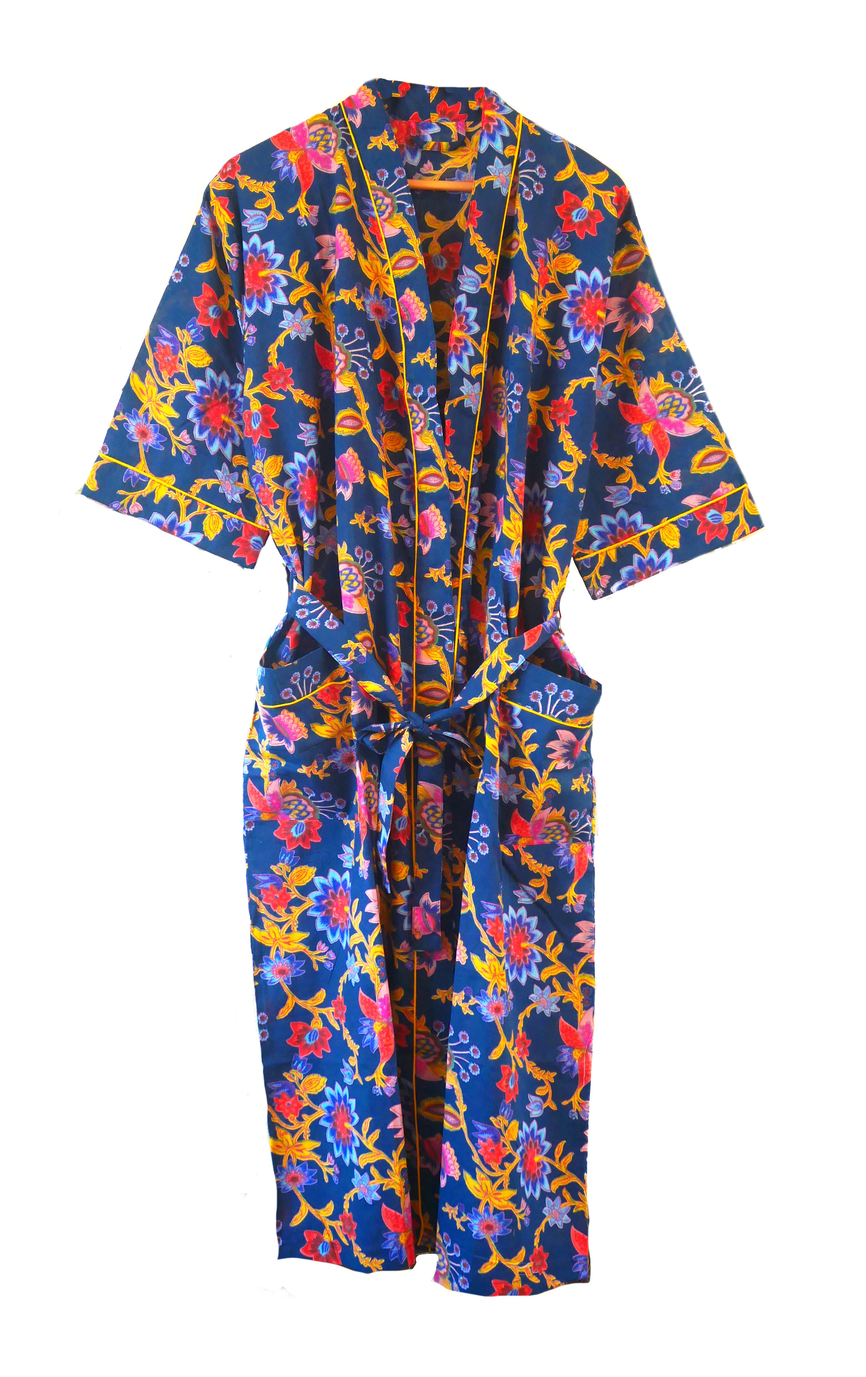 Wikkel uzelf in de levendige schoonheid van onze ochtendjassen, rechtstreeks afkomstig uit India en vervaardigd van 100% katoen. Elke badjas heeft een verscheidenheid aan kleuren en ontwerpen, waarbij traditionele Rajasthani-patronen worden gecombineerd met moderne bloemenmotieven. Deze badjassen zijn niet alleen een bewijs van uitzonderlijk vakmanschap, maar ook een viering van cultureel erfgoed en hedendaagse stijl. Ideaal om in te loungen of om een exotische touch aan uw ochtendroutine toe te voegen, onze badjassen beloven comfort en elegantie in elke draad.