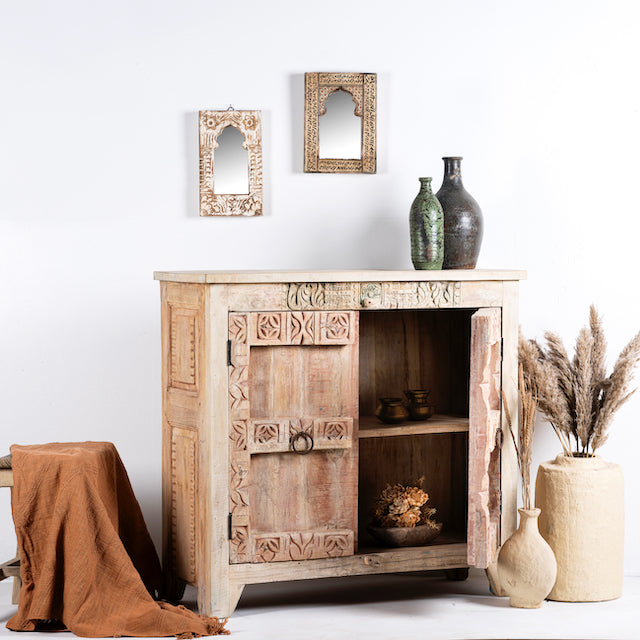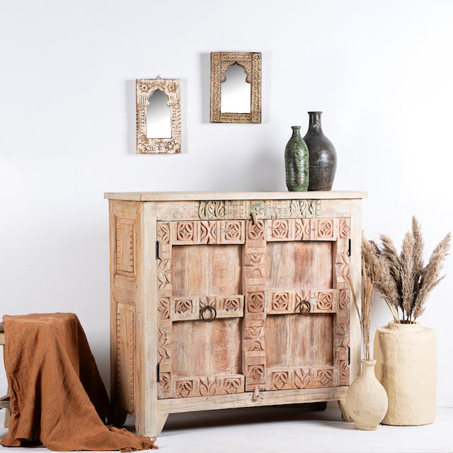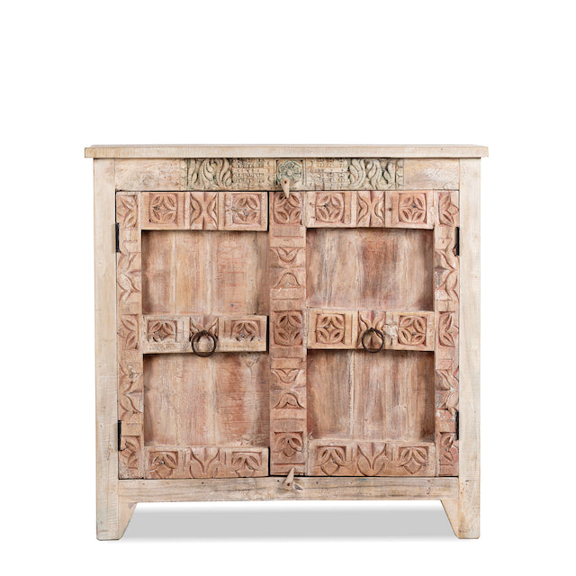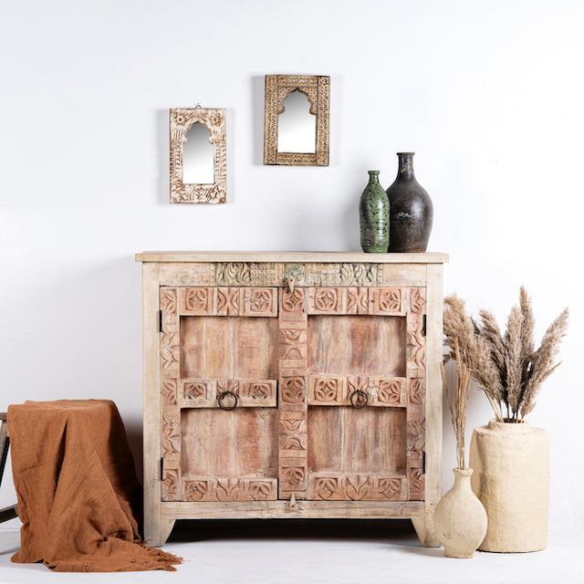 Liefhebbers van de zogenaamde 'Ibiza-stijl' zijn helemaal on trend met dit prachtige, gezandstraalde dressoir van gerecycled Teakhout. Het witgekalkte, oude hout in strandstijl is eenvoudig te integreren in elke omgeving en brengt een beetje vakantiesfeer in elke omgeving.