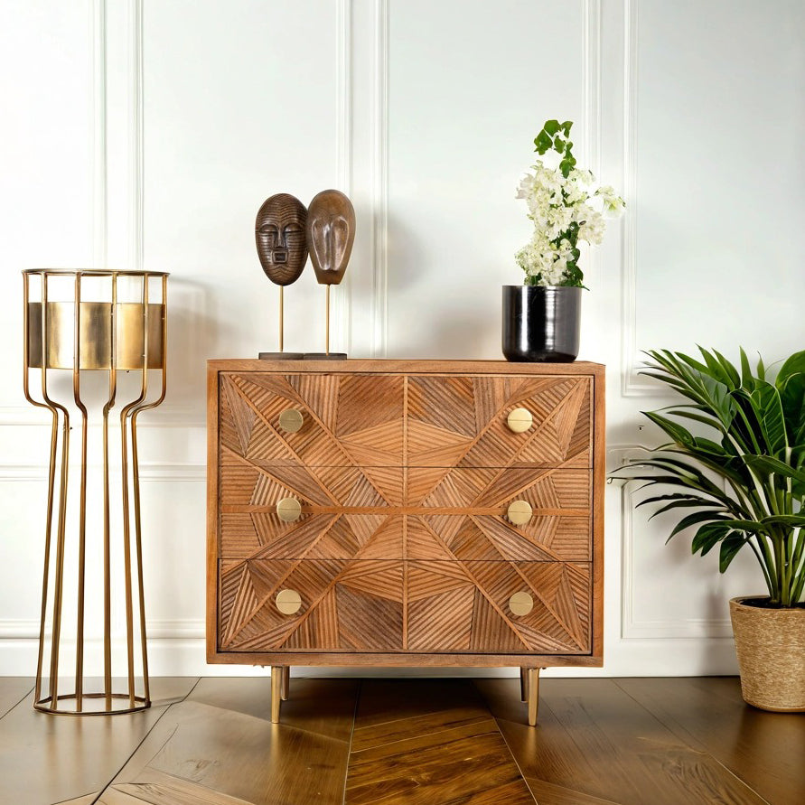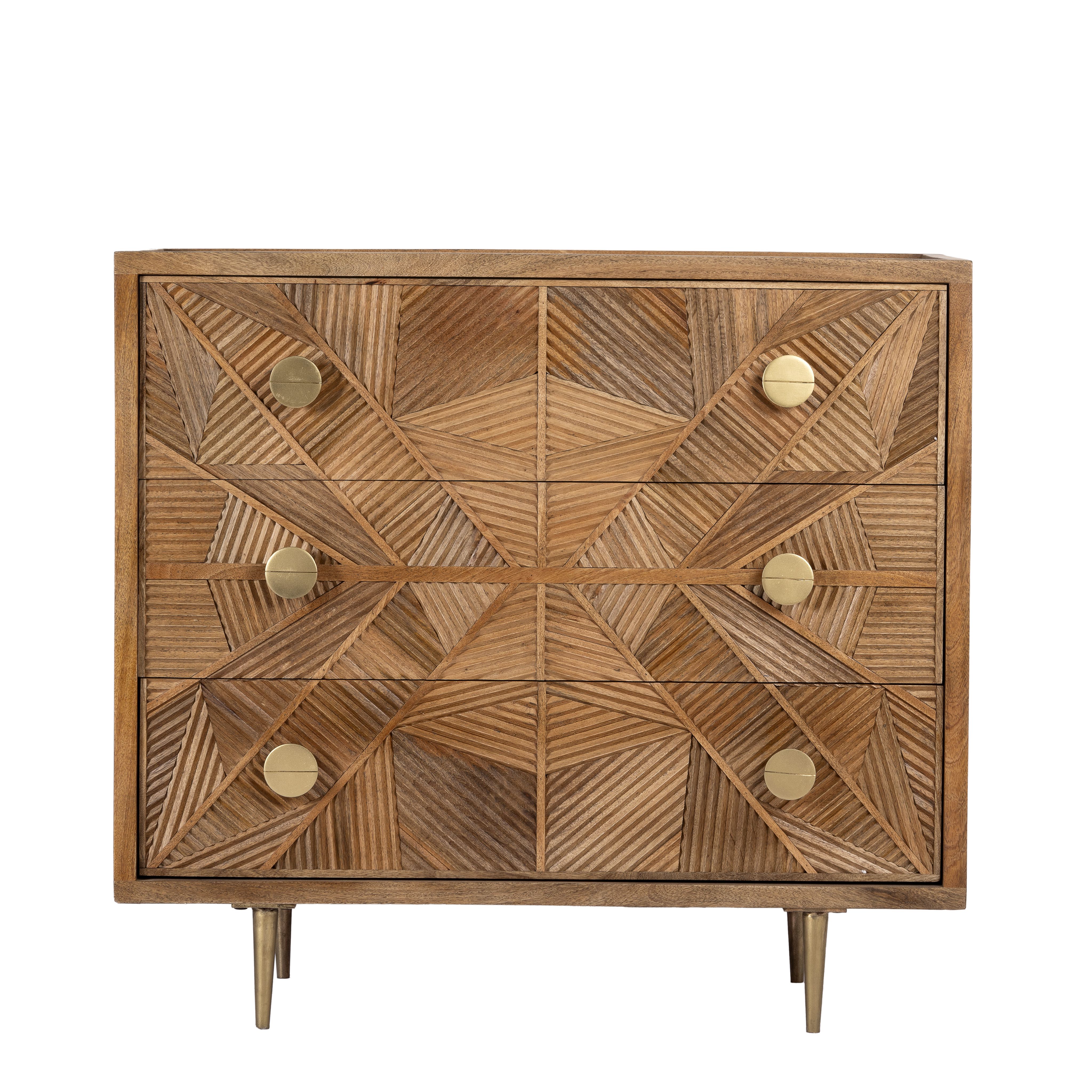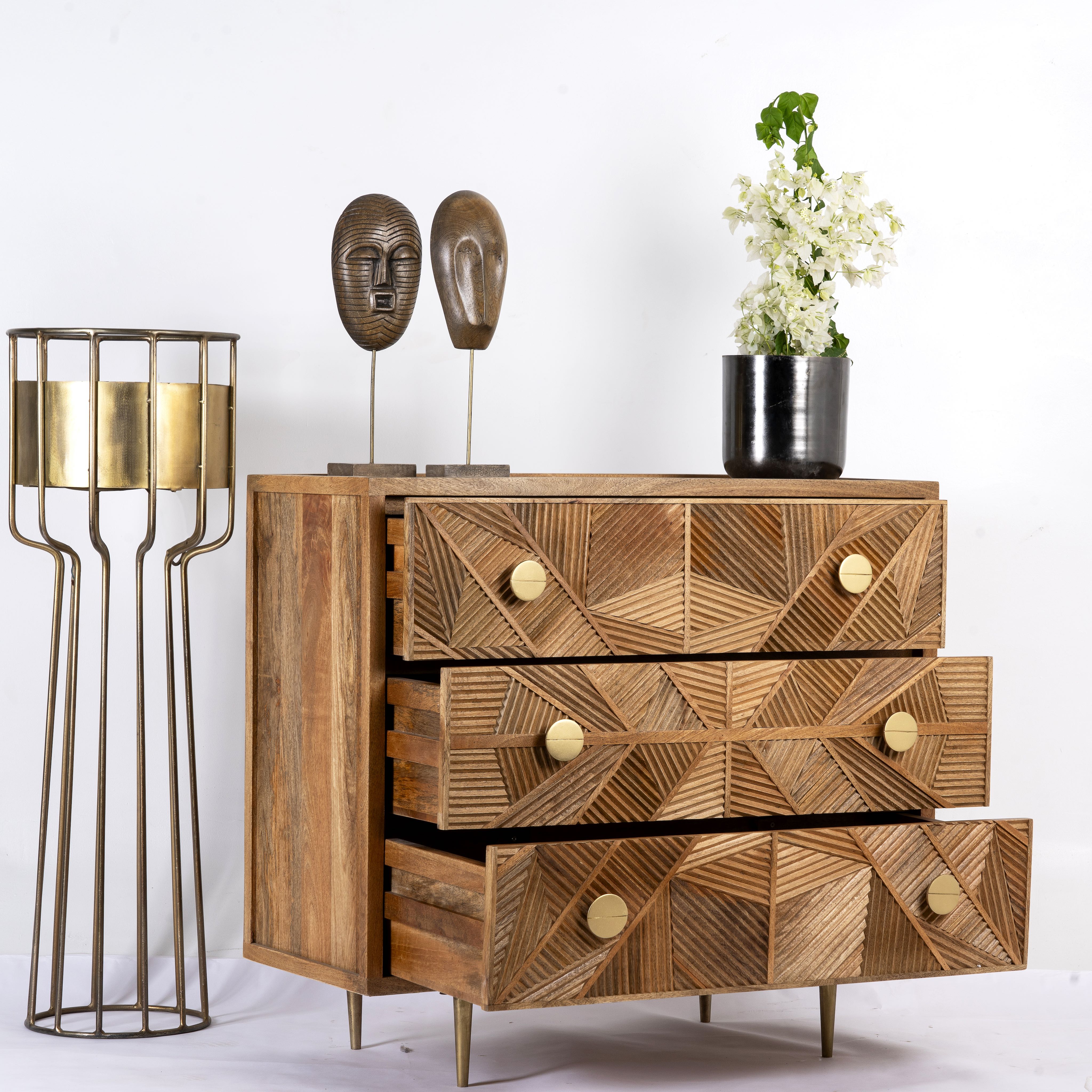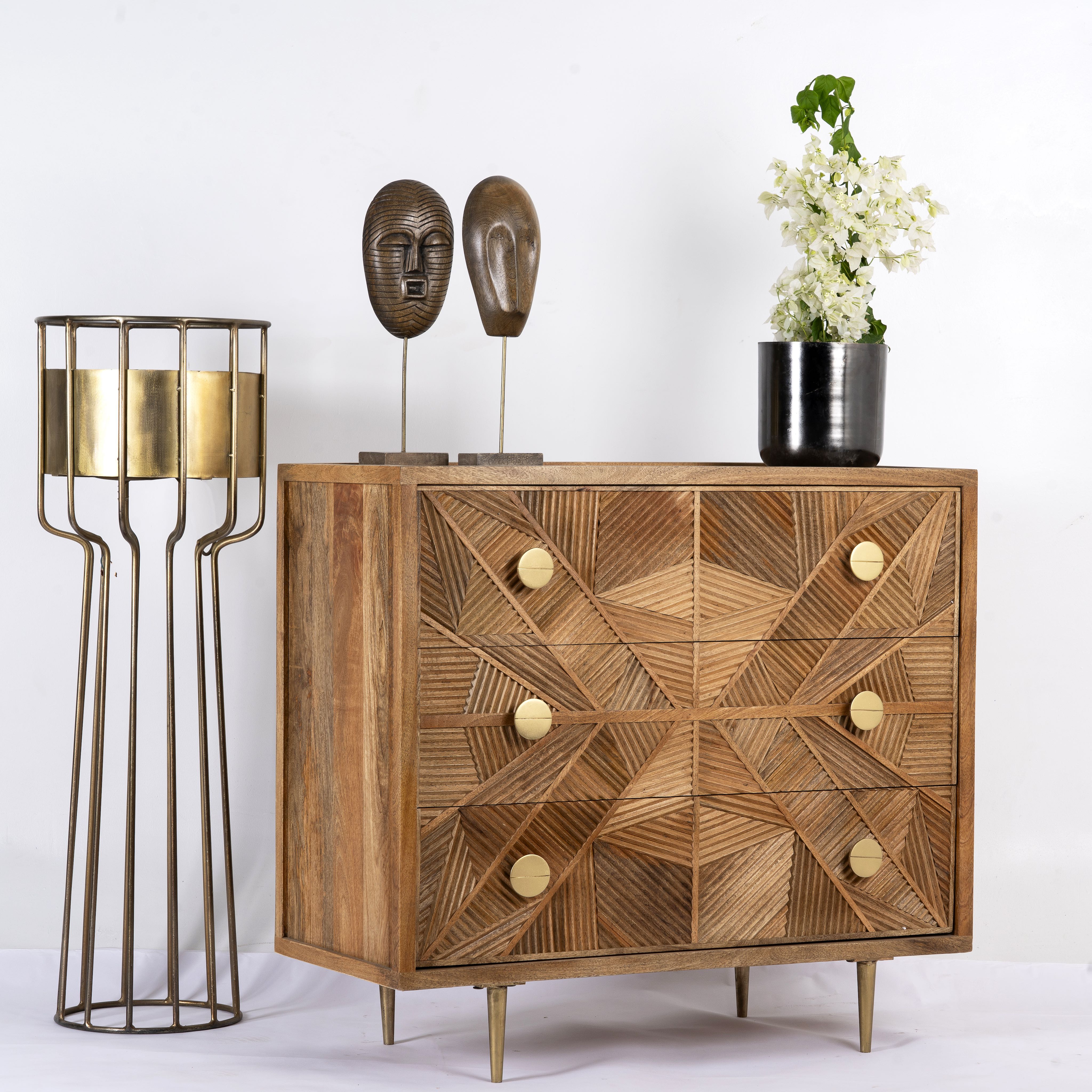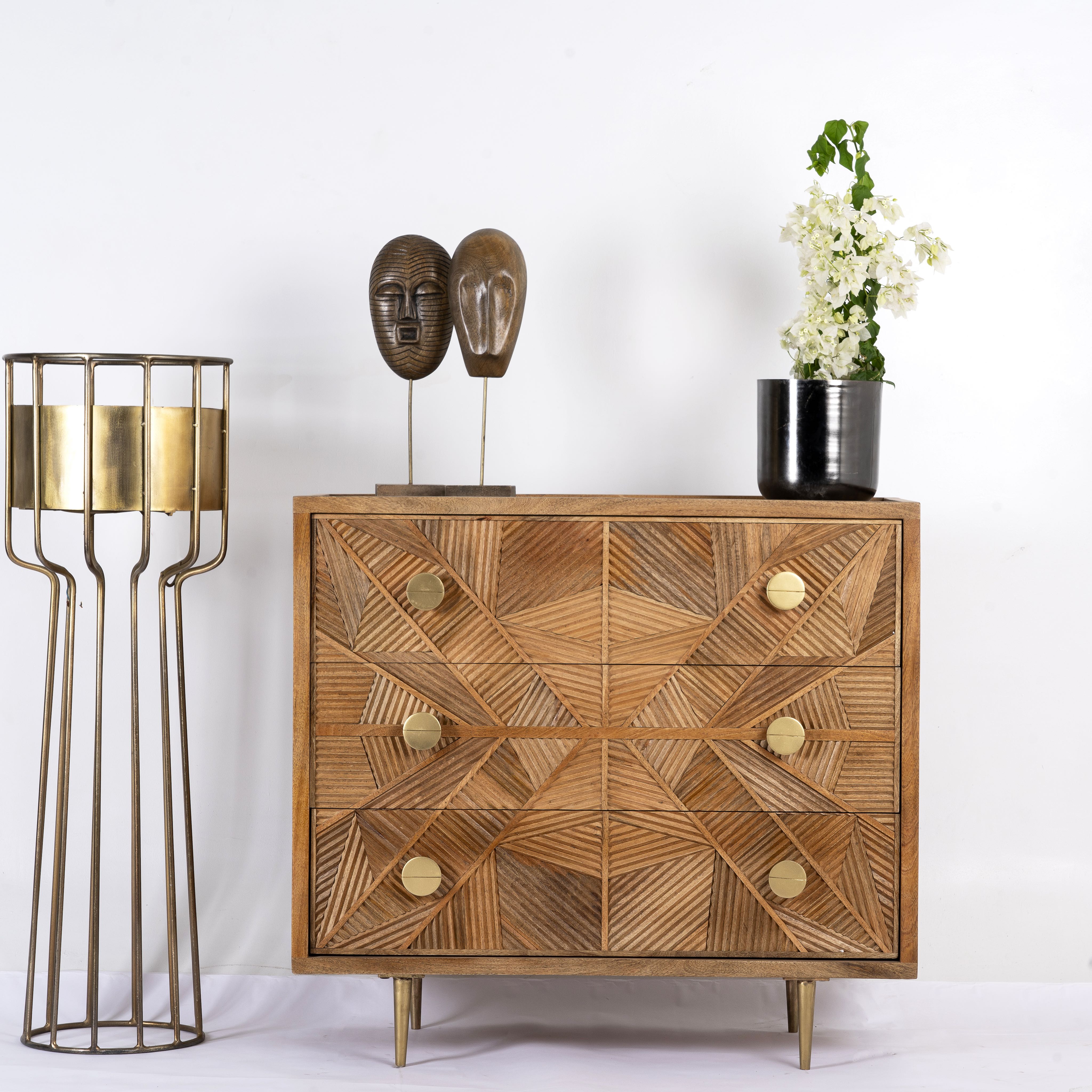 Het biedt voldoende opbergruimte met drie grote lades voor uw dagelijkse benodigdheden. De kist staat op met messing geplateerde ijzeren poten en het contrast tussen het natuurlijke hout en het goud van het messing geeft dit stuk een onderscheidend karakter.