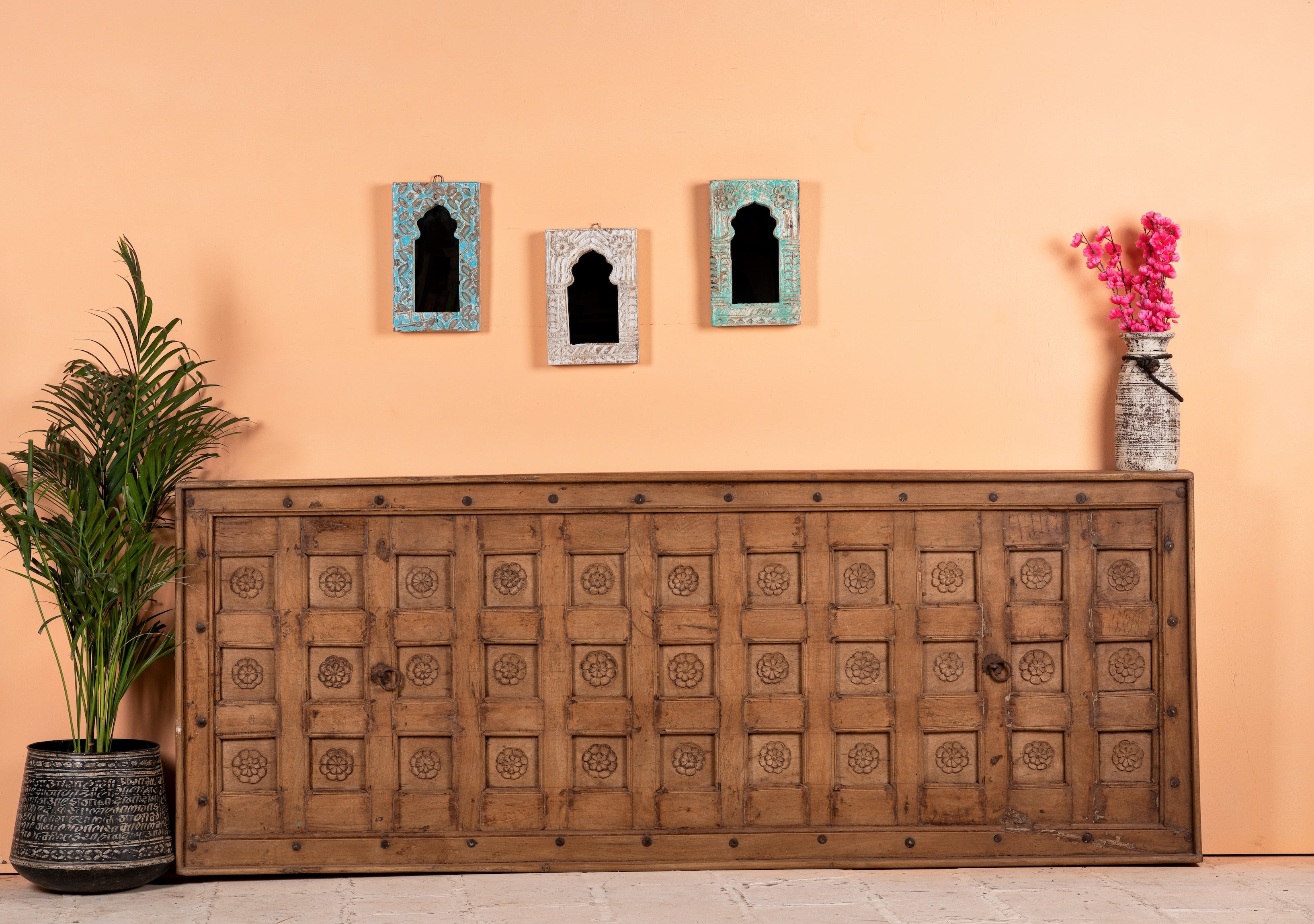 Deze antieke Indiase deur is uniek in zijn soort. Als sprookjesachtige wanddecoratie brengt deze deur elke kamer in een vakantiestemming. Hij kan gemakkelijk worden gebruikt als hoofdbord achter een bed.