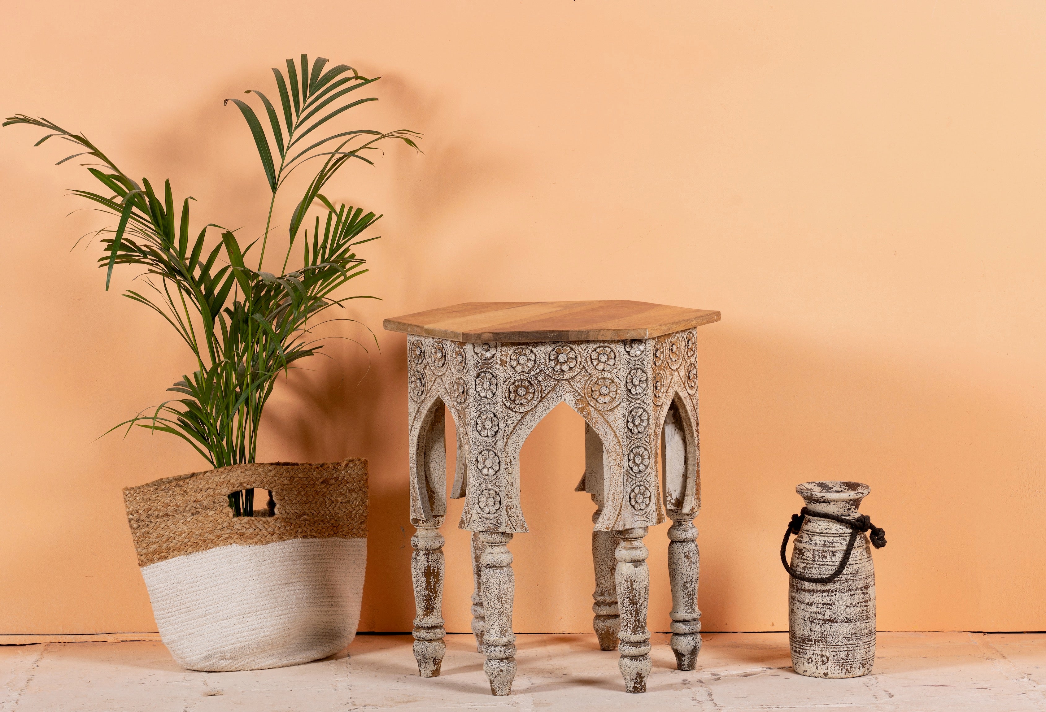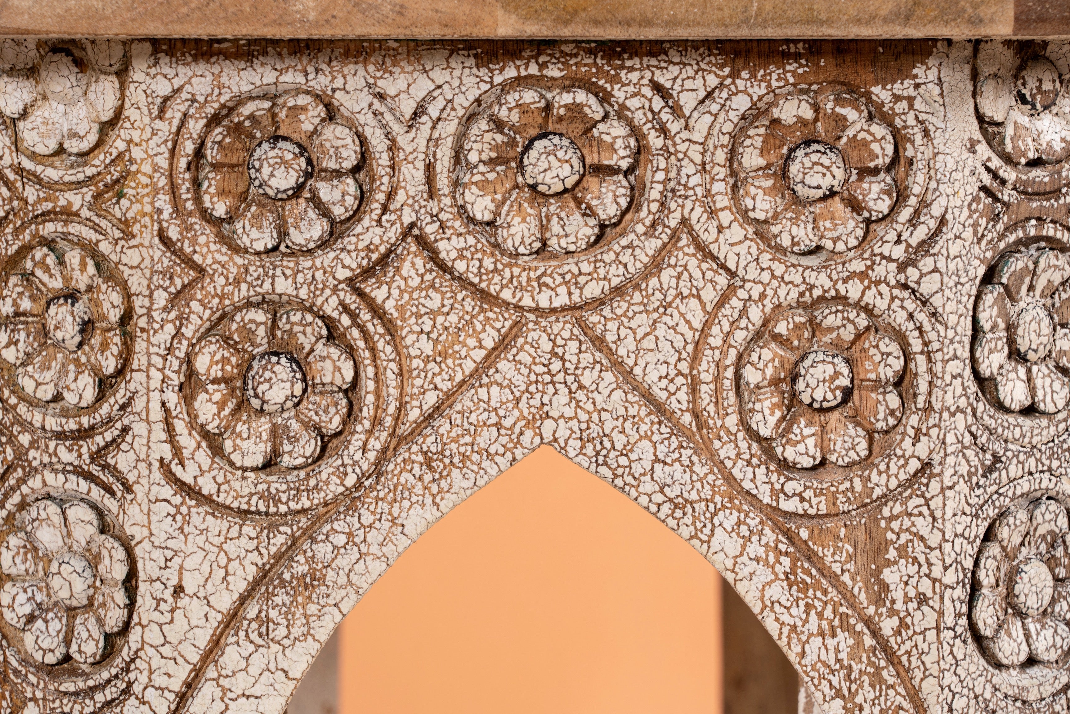 Dit unieke salontafeltje is versierd met een gedetailleerd gesneden bloemenpatroon. Met zijn opvallende kleur, toegepast in 3 lagen, brengt deze tafel een vintage sfeer in uw huis.