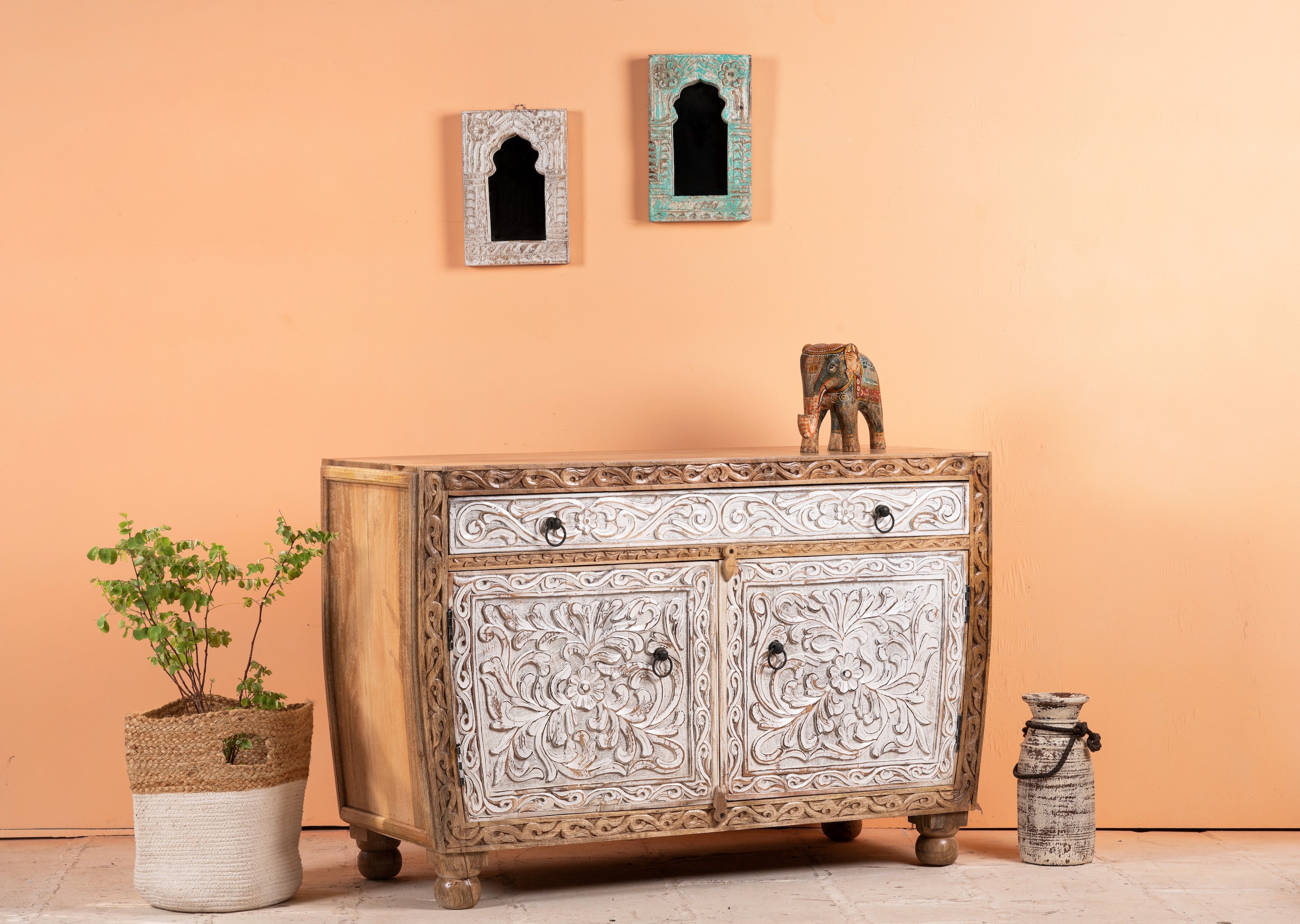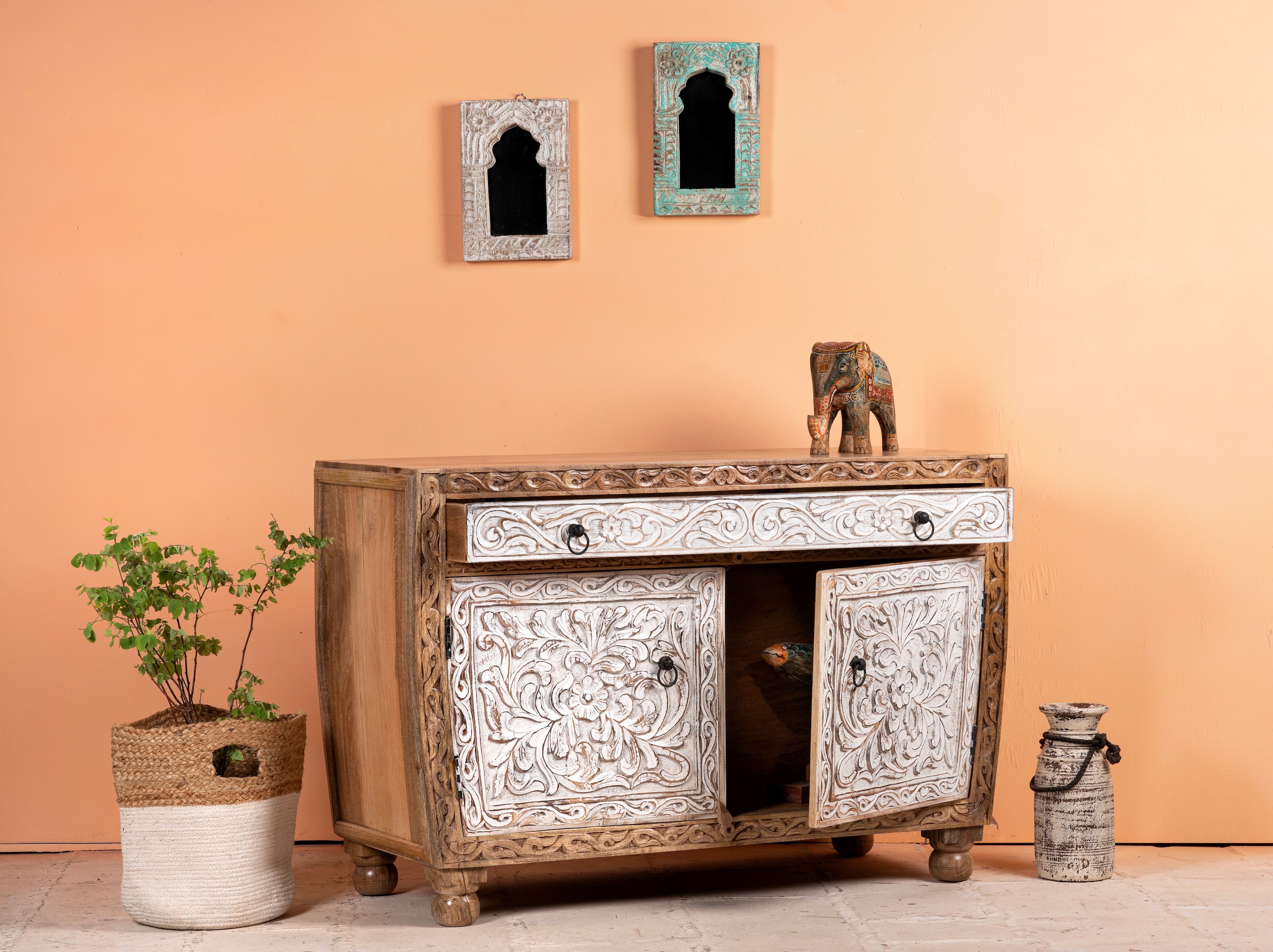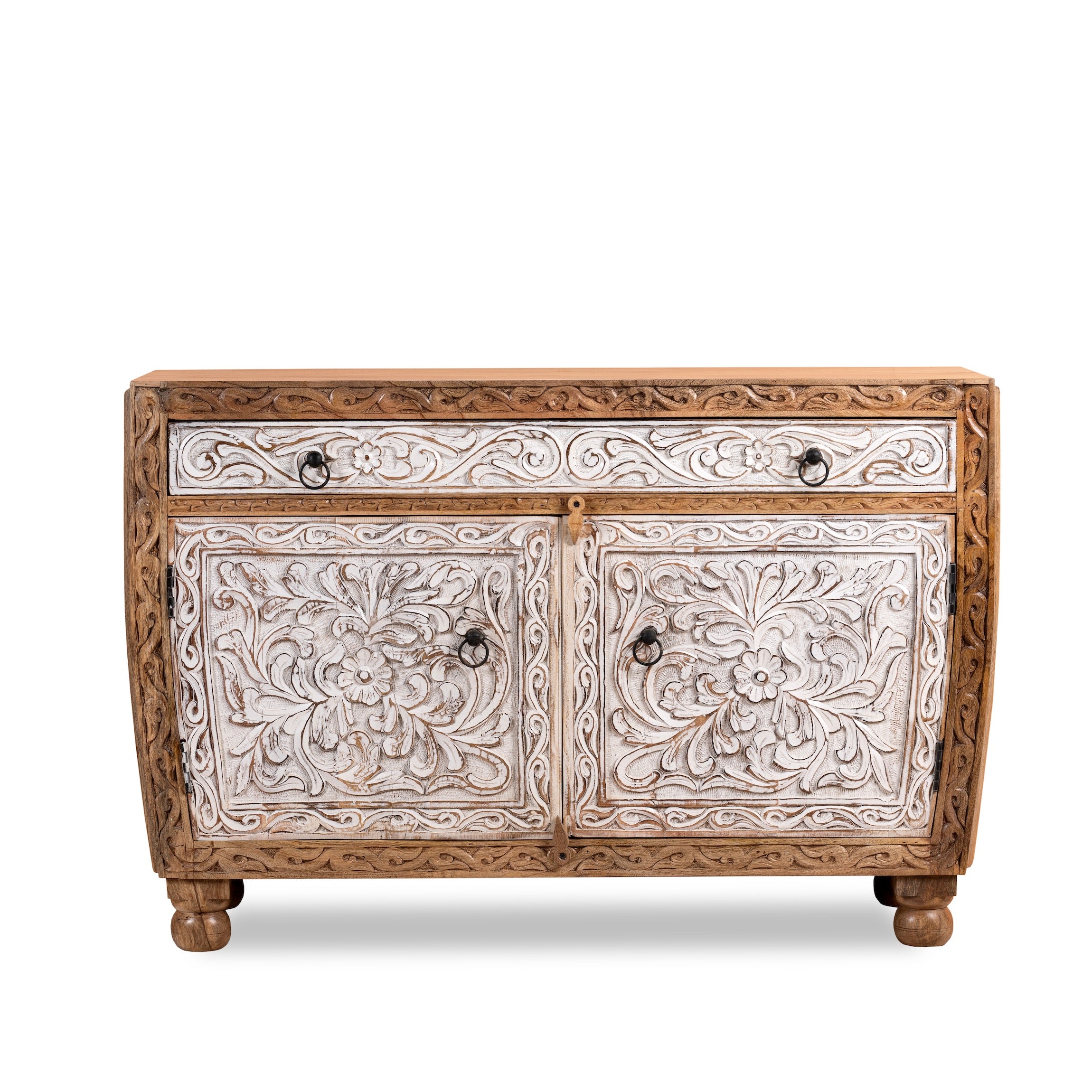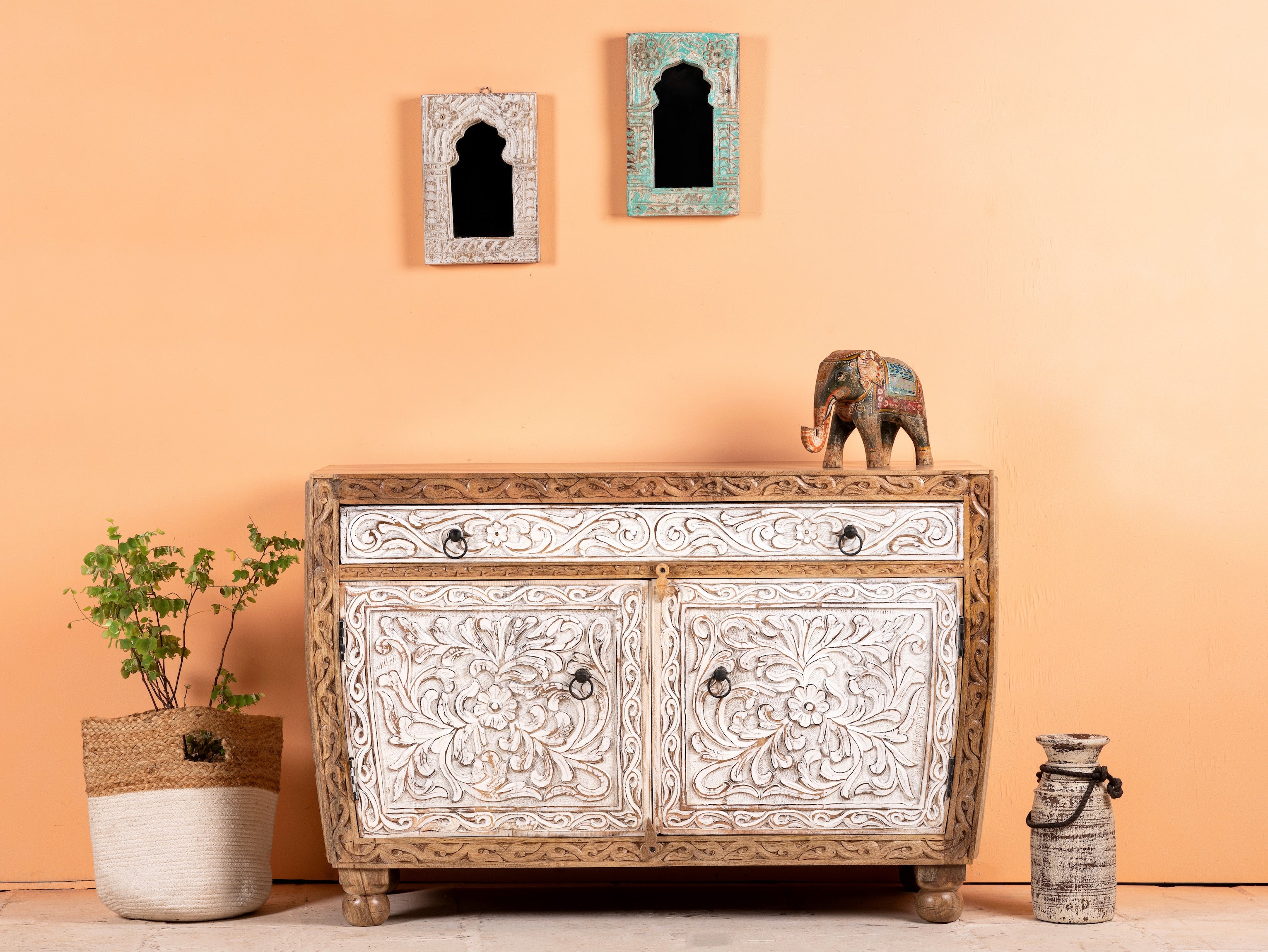 Maak kennis met de Sonali Indian handgemaakte kast, een betoverende mix van elegantie en functionaliteit. Het unieke halfronde frame voegt een vleugje verfijning toe aan uw leefruimte, terwijl de witgekalkte laden en deuren een gevoel van rust en sereniteit brengen.