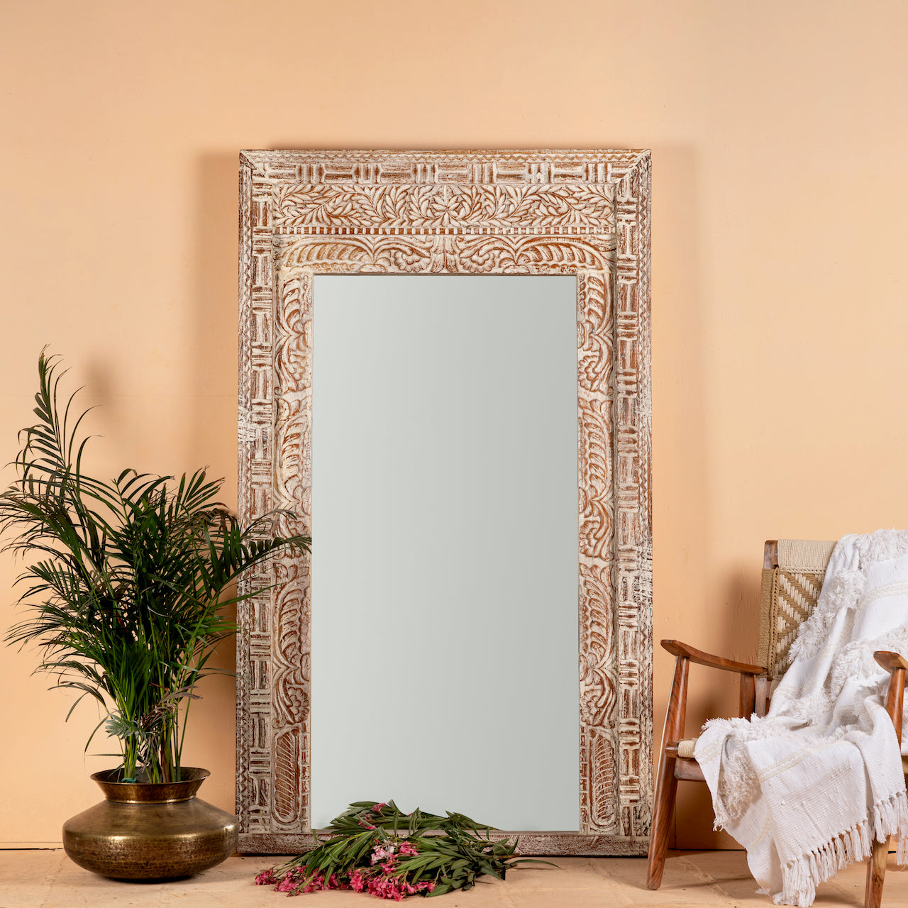 Deze verbluffende handgesneden mangohouten wandspiegel belichaamt de ontspannen elegantie van Ibiza-geïnspireerd design. Met ingewikkelde bloemensnijwerken maakt deze grote spiegel een gedurfde maar serene statement in elke ruimte. De natuurlijke houttinten met een verweerde afwerking voegen rustieke charme toe, terwijl het vakmanschap ervoor zorgt dat het zowel stijlvol als tijdloos is.