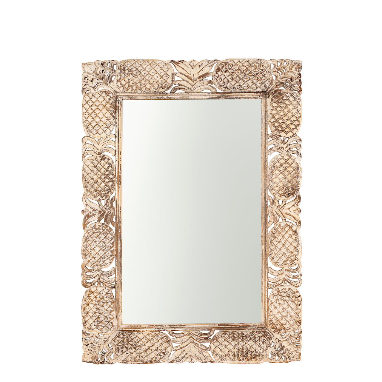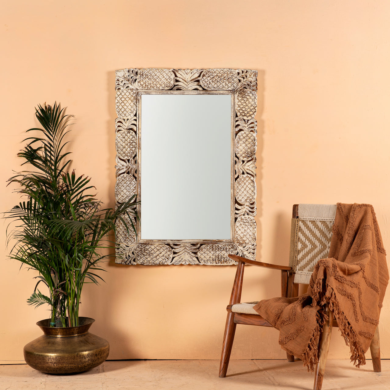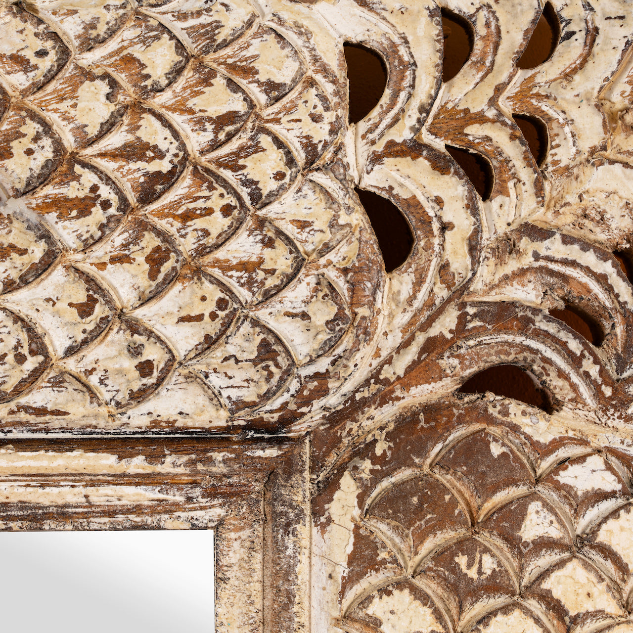 Introductie van de Apasmara-spiegel, een verbluffend voorbeeld van Indiaas vakmanschap. Deze spiegel heeft een witgekalkte kleur, wat een gevoel van elegantie en eenvoud creëert. Wat hem onderscheidt, zijn de ingewikkelde handgesneden gravures, die de artisticiteit van Indiase ambachtslieden weerspiegelen. De Apasmara spiegel voegt karakter en culturele diepte toe aan uw leefruimte. Til uw decor naar een hoger niveau met deze unieke en boeiende spiegel, die moeiteloos stijl en traditie combineert en tegelijkertijd de essentie van India in uw huis brengt.