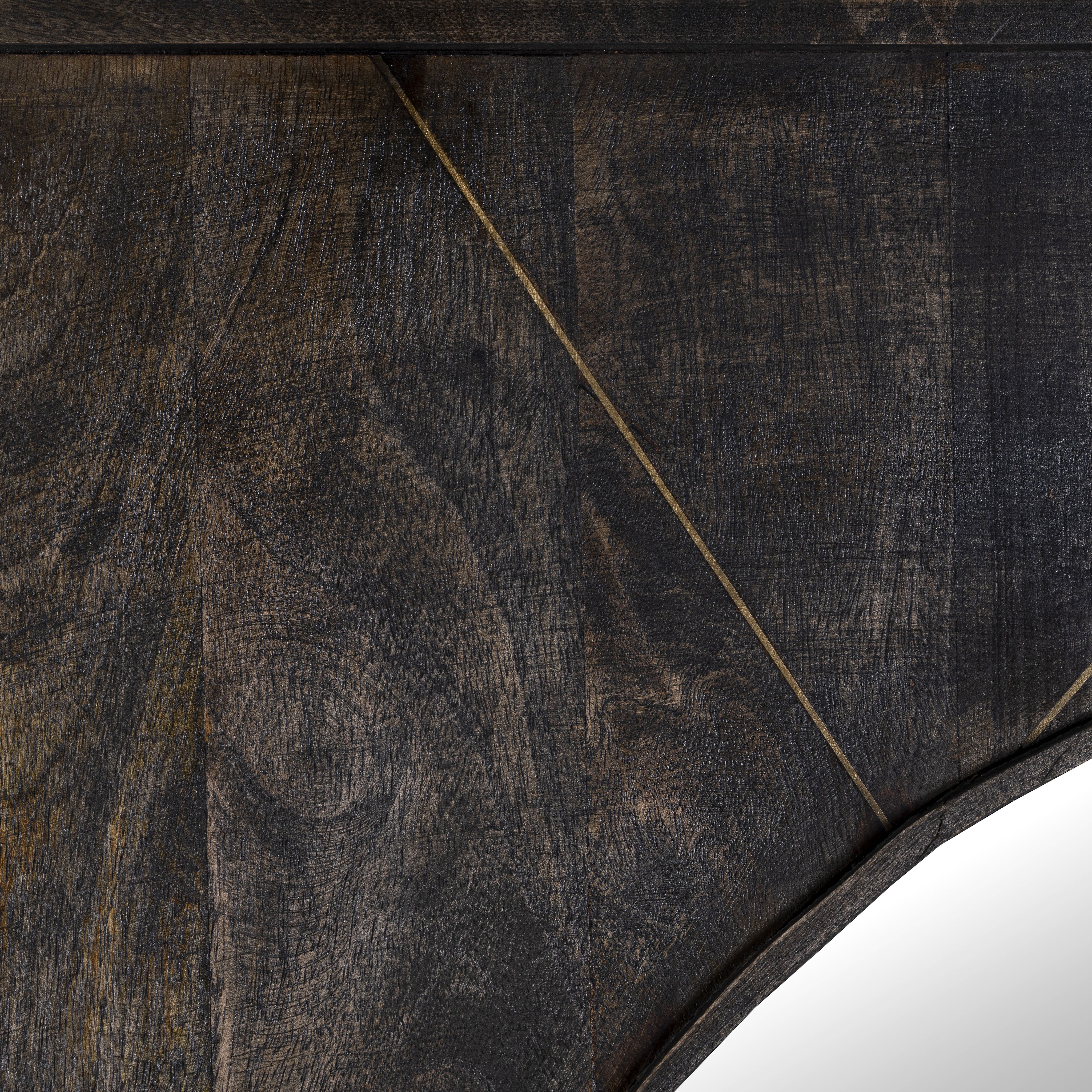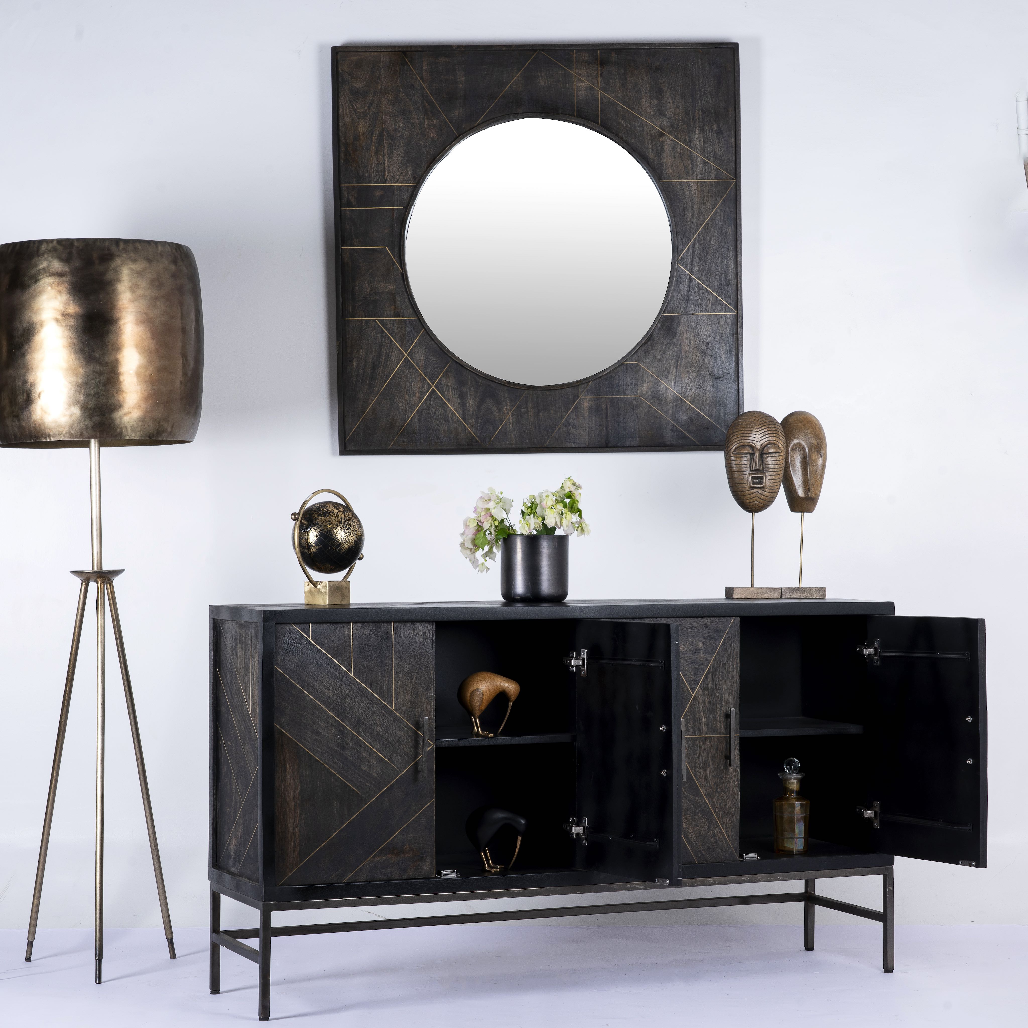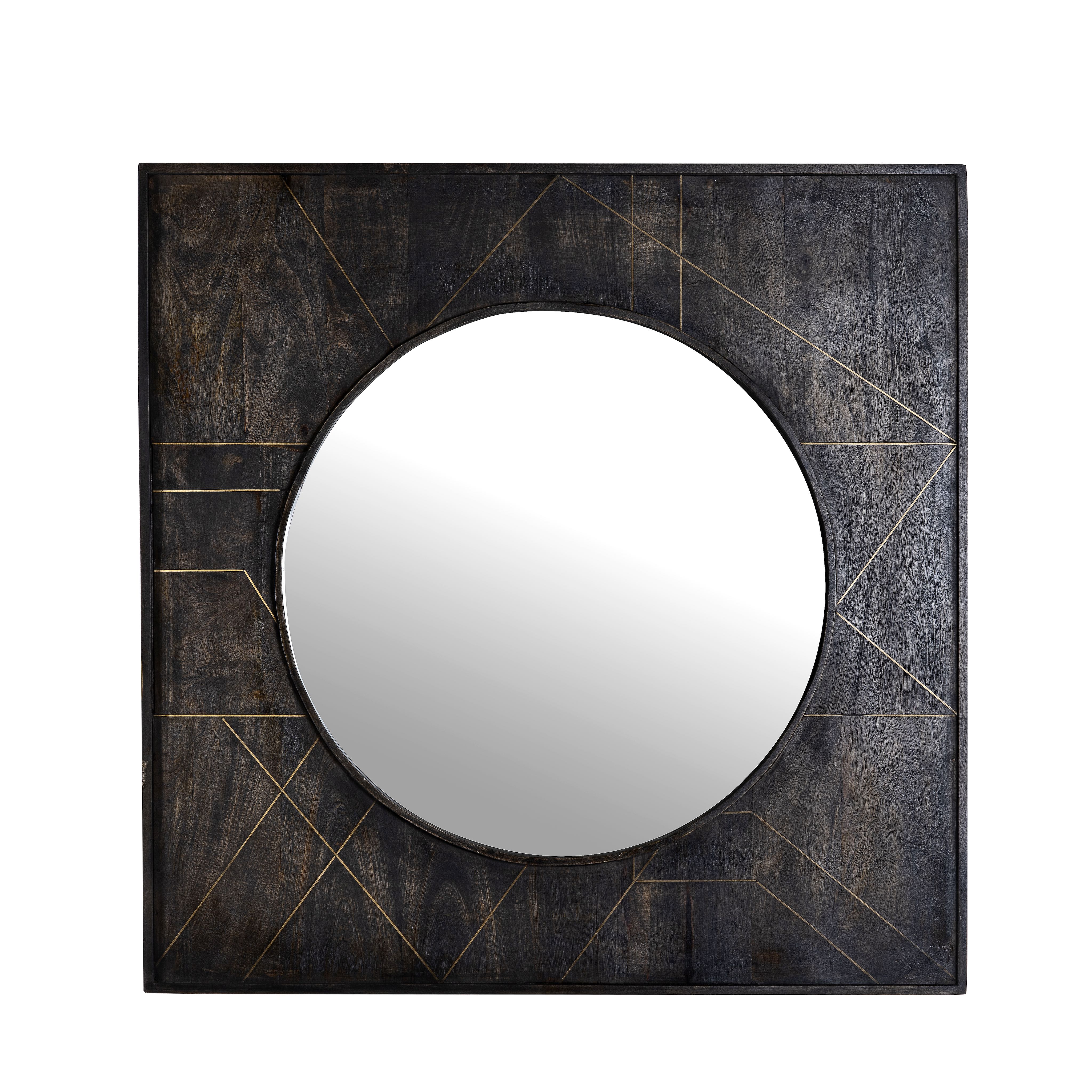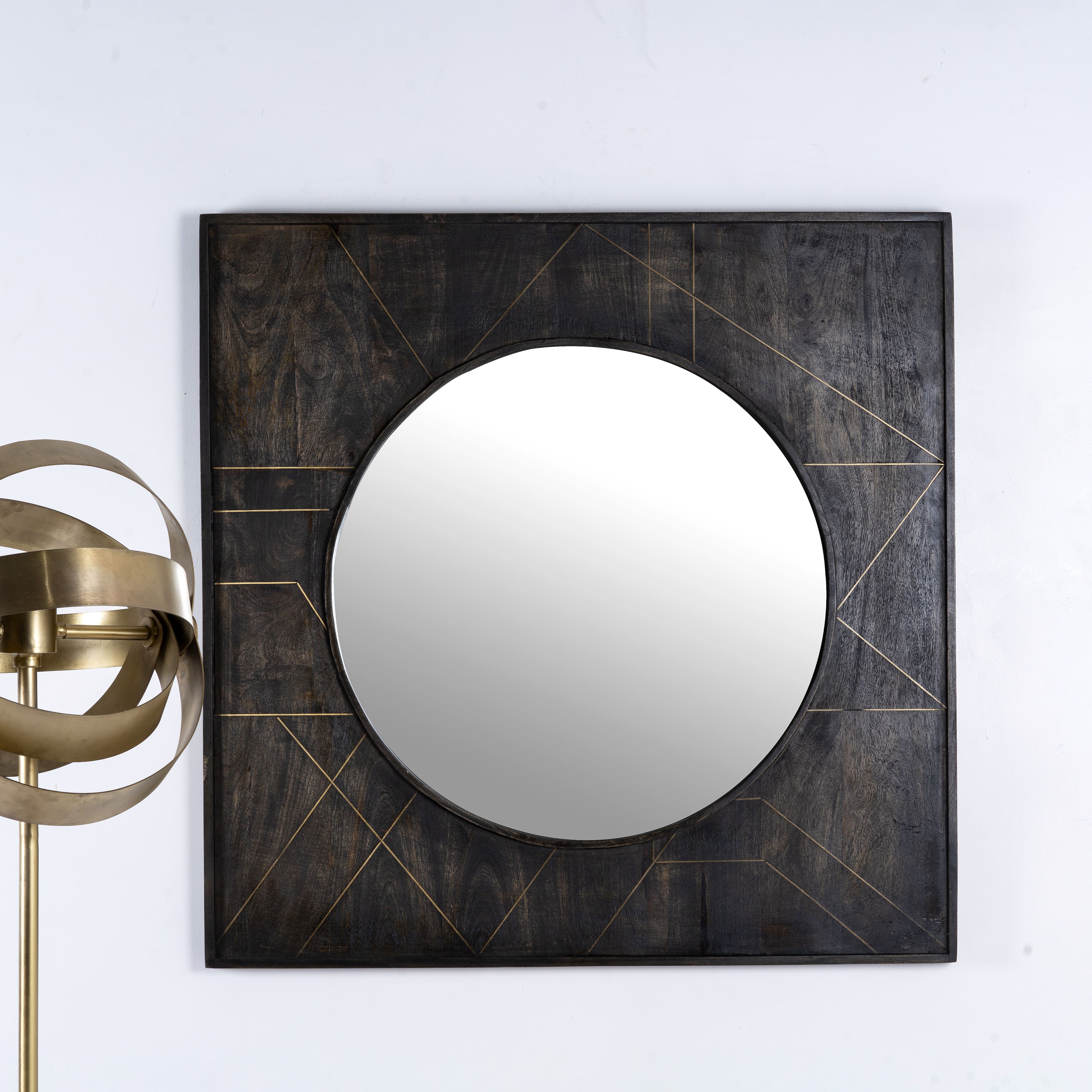 Deze vierkante houten spiegel met messing inlegwerk voegt een opvallend accent toe aan uw interieur. Handgemaakt van natuurlijk mangohout en zwart geverfd, straalt het elegantie en verfijning uit.