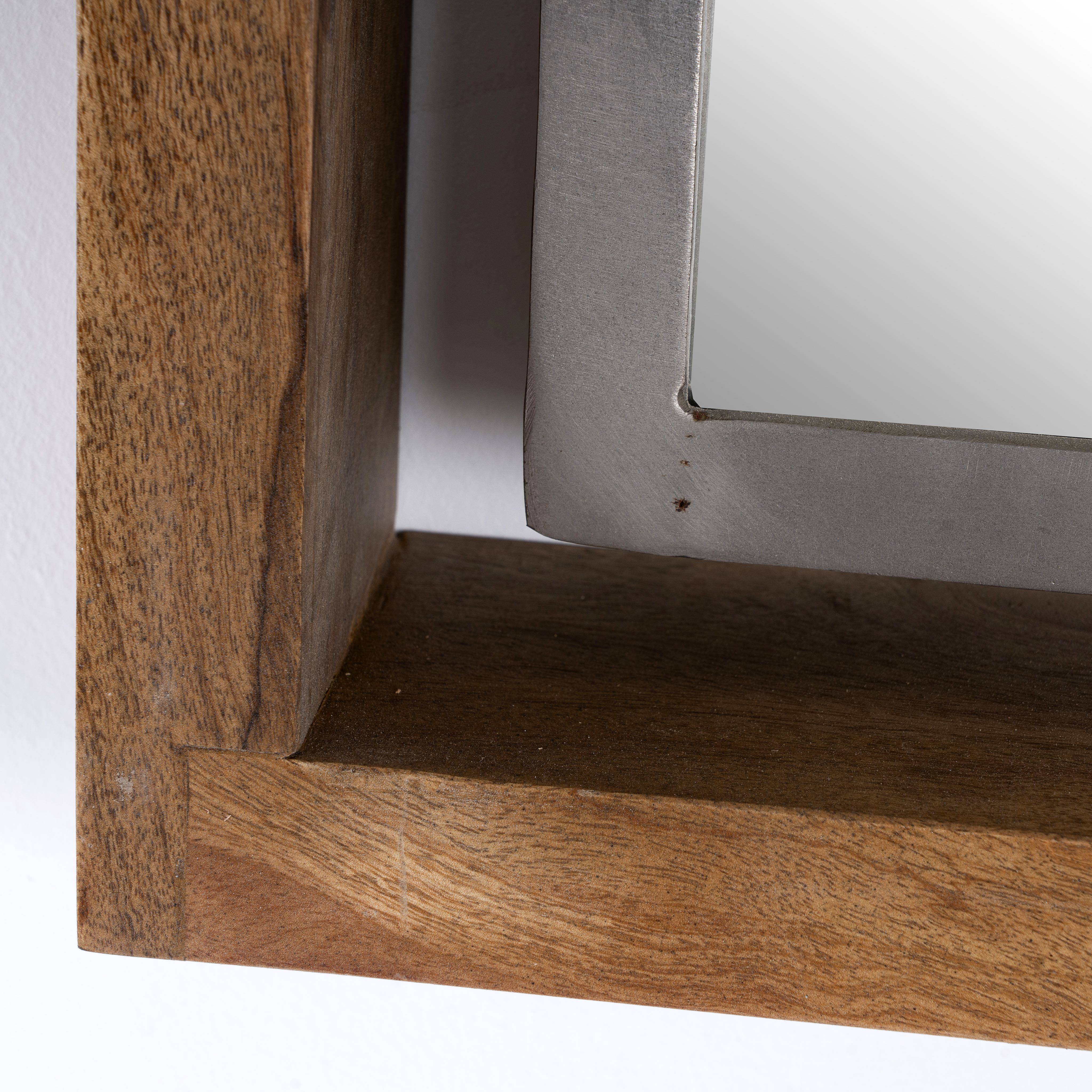 Het mangohouten frame is stevig gemonteerd in een robuuste vernikkelde ijzeren frameconstructie. De nikkelafwerking op het ijzeren frame voegt een vleugje moderne verfijning toe, wat een prachtig contrast creëert met het natuurlijke hout. Deze combinatie van materialen resulteert in een opvallend stuk dat rustieke charme combineert met hedendaagse elegantie.