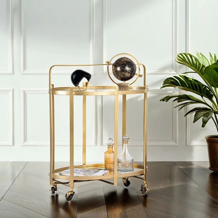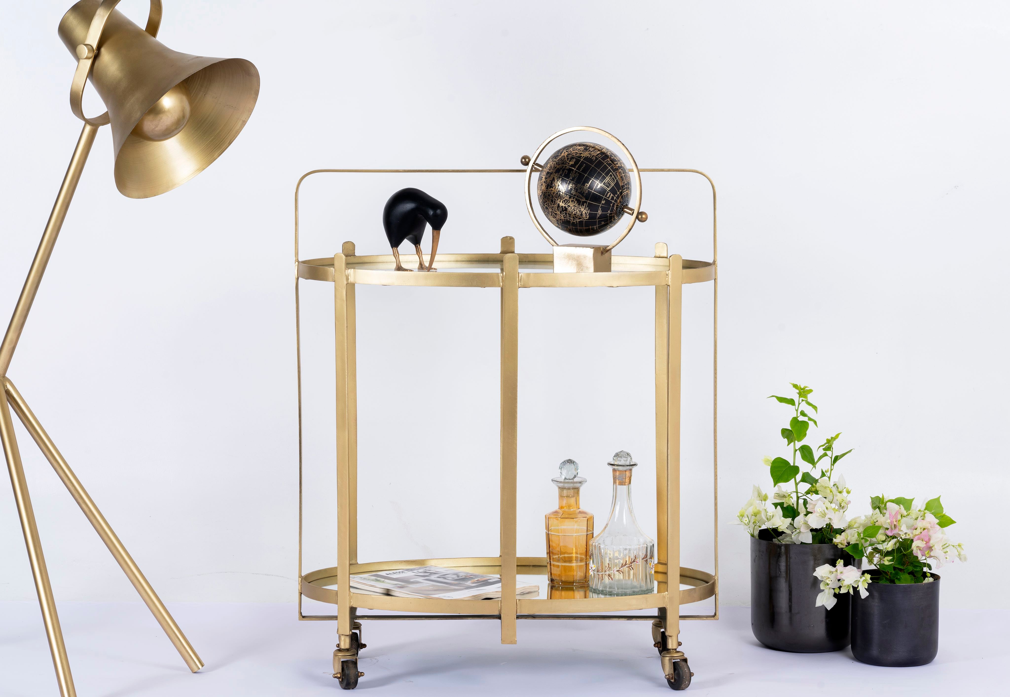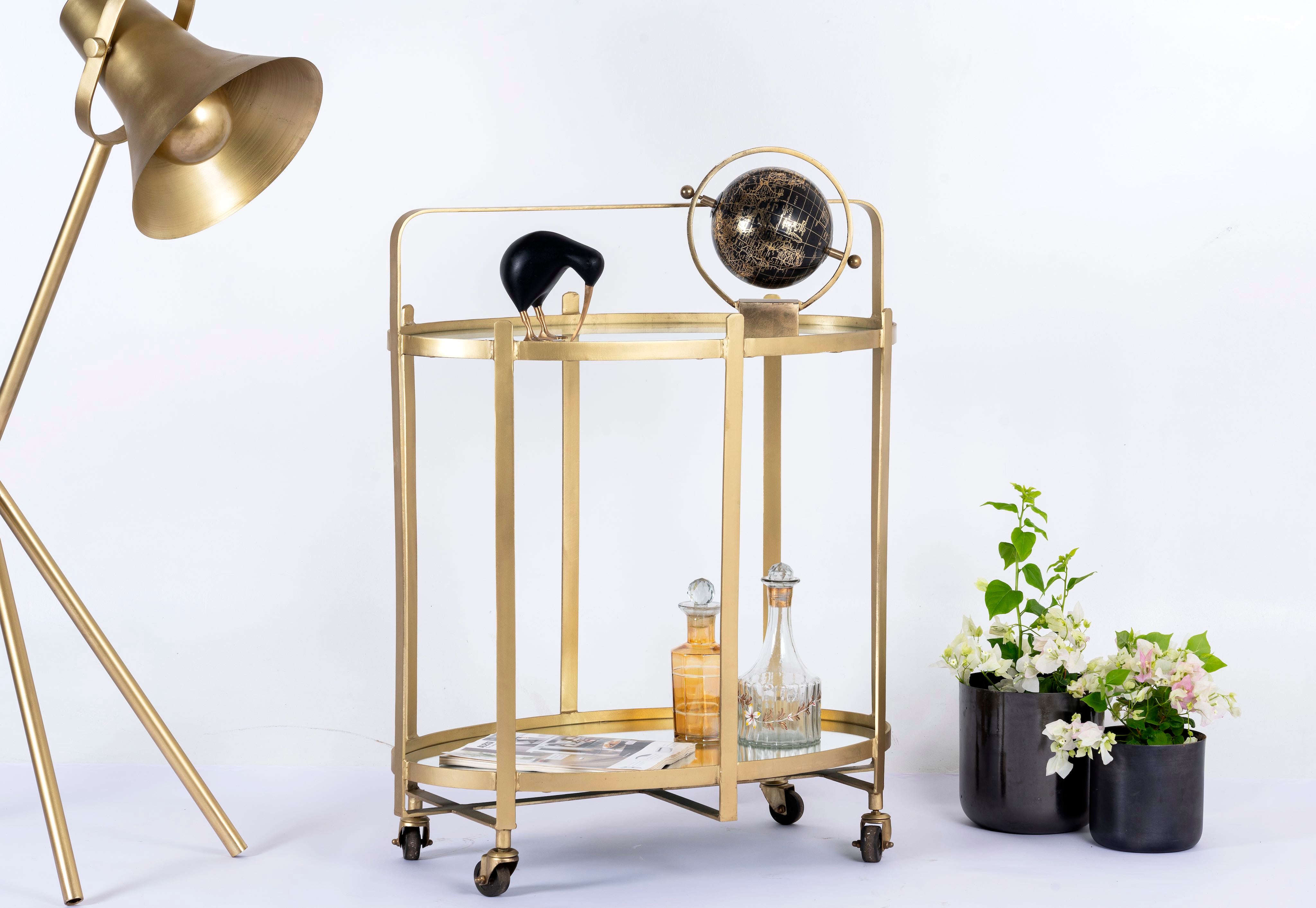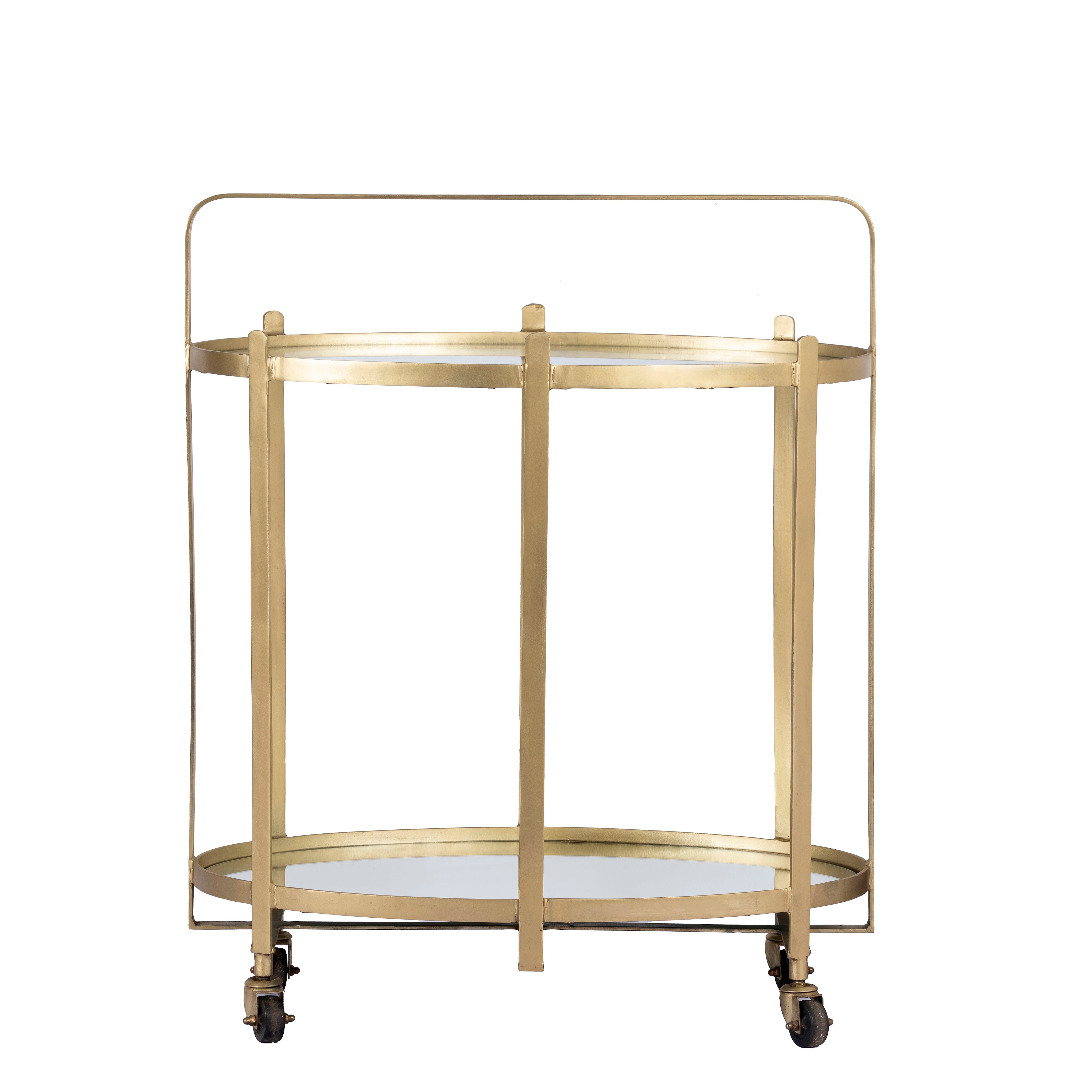 Ontdek onze unieke ovale serveerwagen Ameya met een messing gecoat ijzer- en glasframe en spiegeloppervlakken. Deze elegante barwagen combineert functionaliteit en esthetiek perfect om uw ruimte te verrijken.