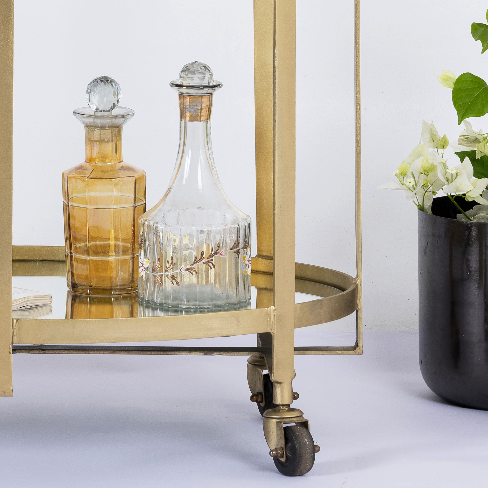 Het ijzeren frame met een messing gecoat oppervlak geeft de kar een robuust en toch elegant uiterlijk. Het vormt de ideale basis voor de glas- en spiegeloppervlakken die de trolley zijn verfijnde uitstraling geven. De glazen oppervlakken zijn niet alleen stijlvol, maar ook praktisch omdat ze gemakkelijk schoon te maken zijn en tegelijkertijd een perfecte presentatieruimte bieden voor uw drankjes en accessoires.
