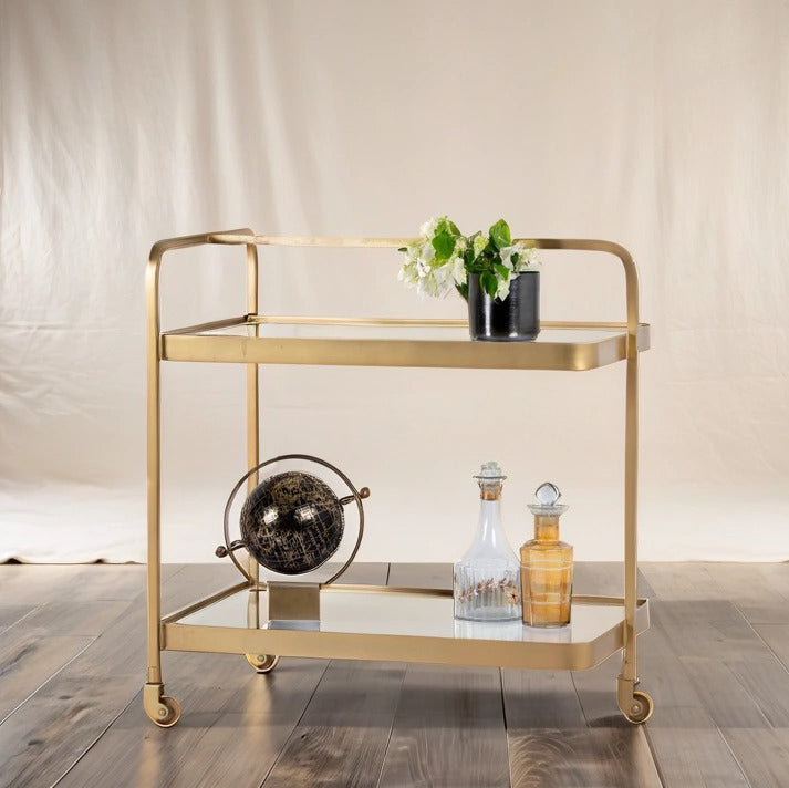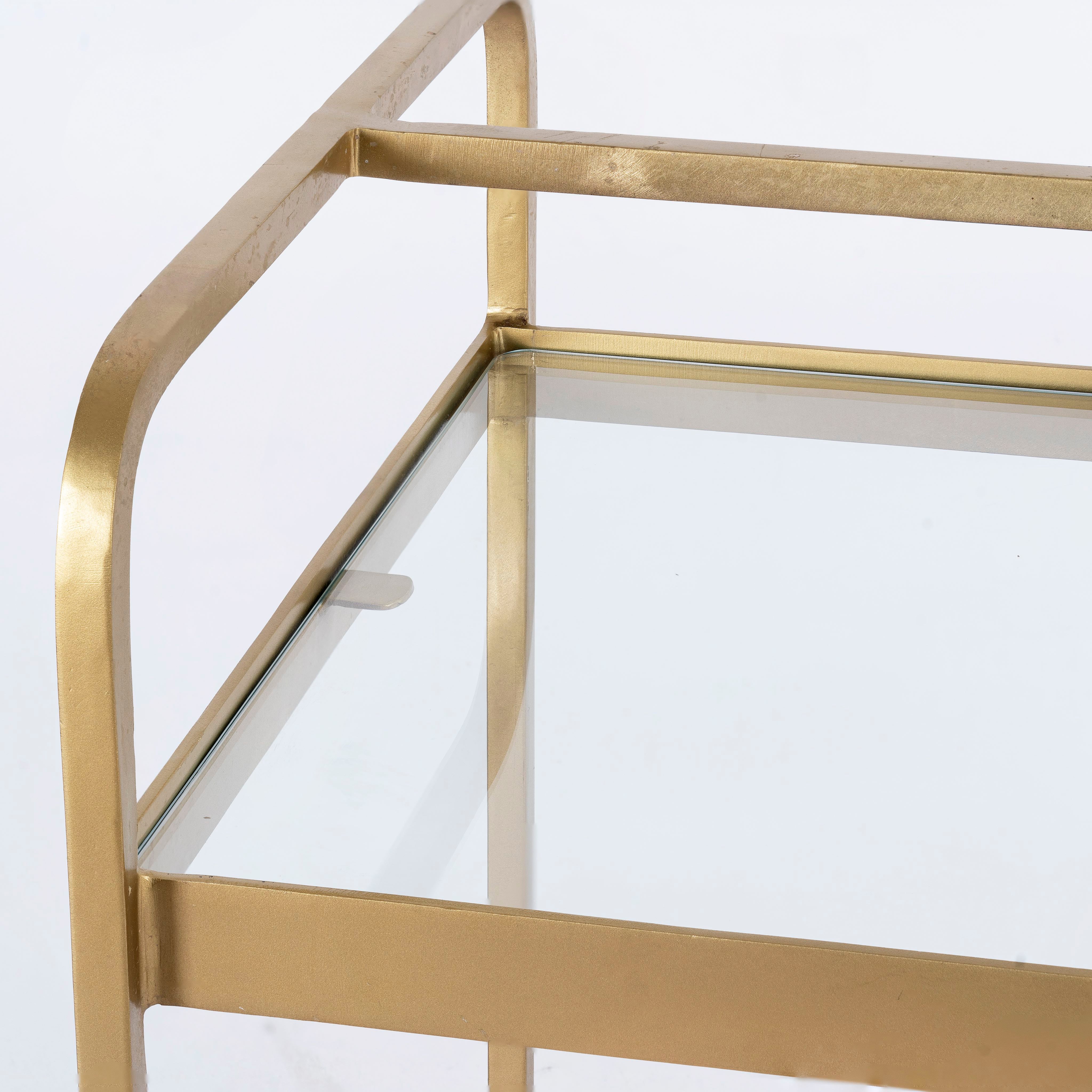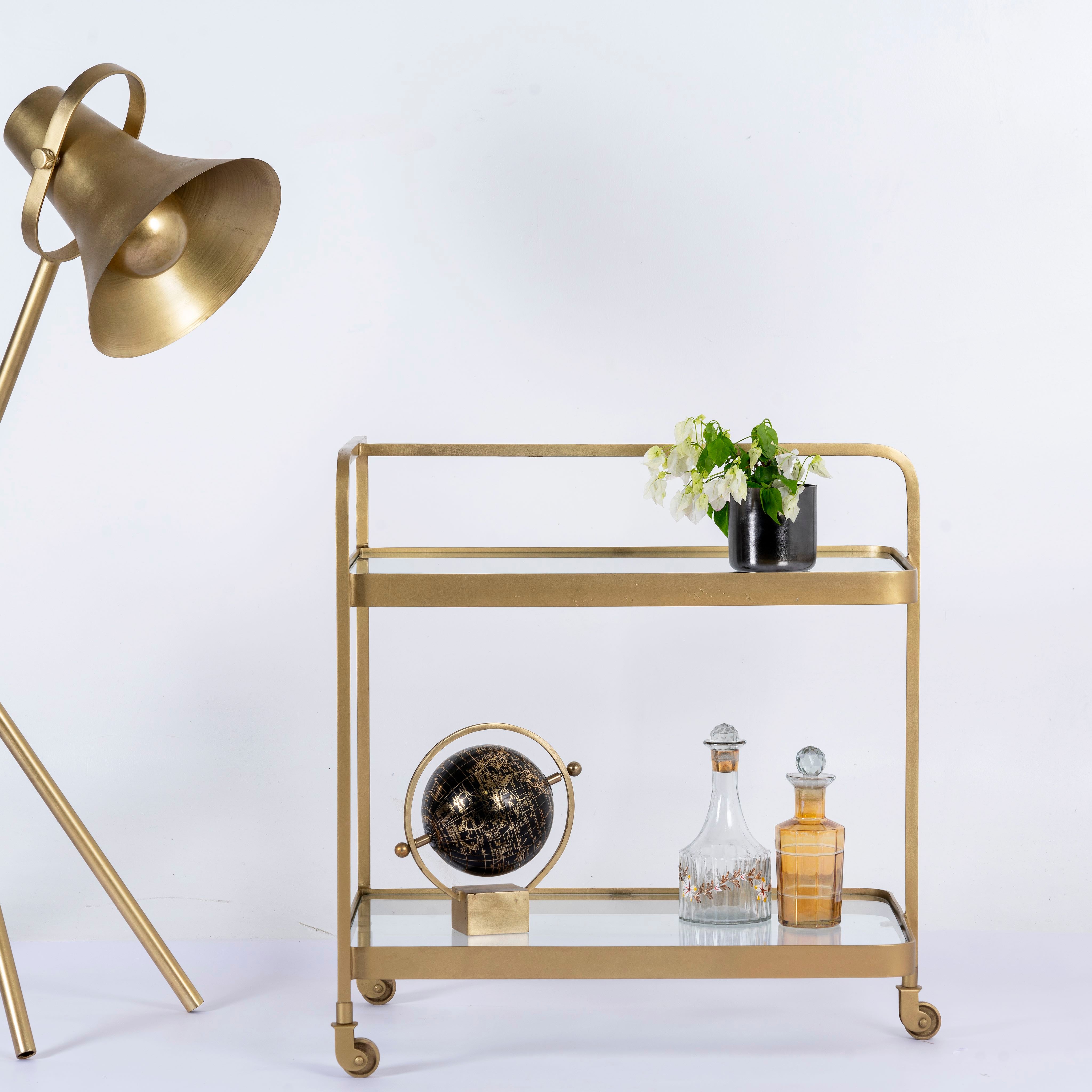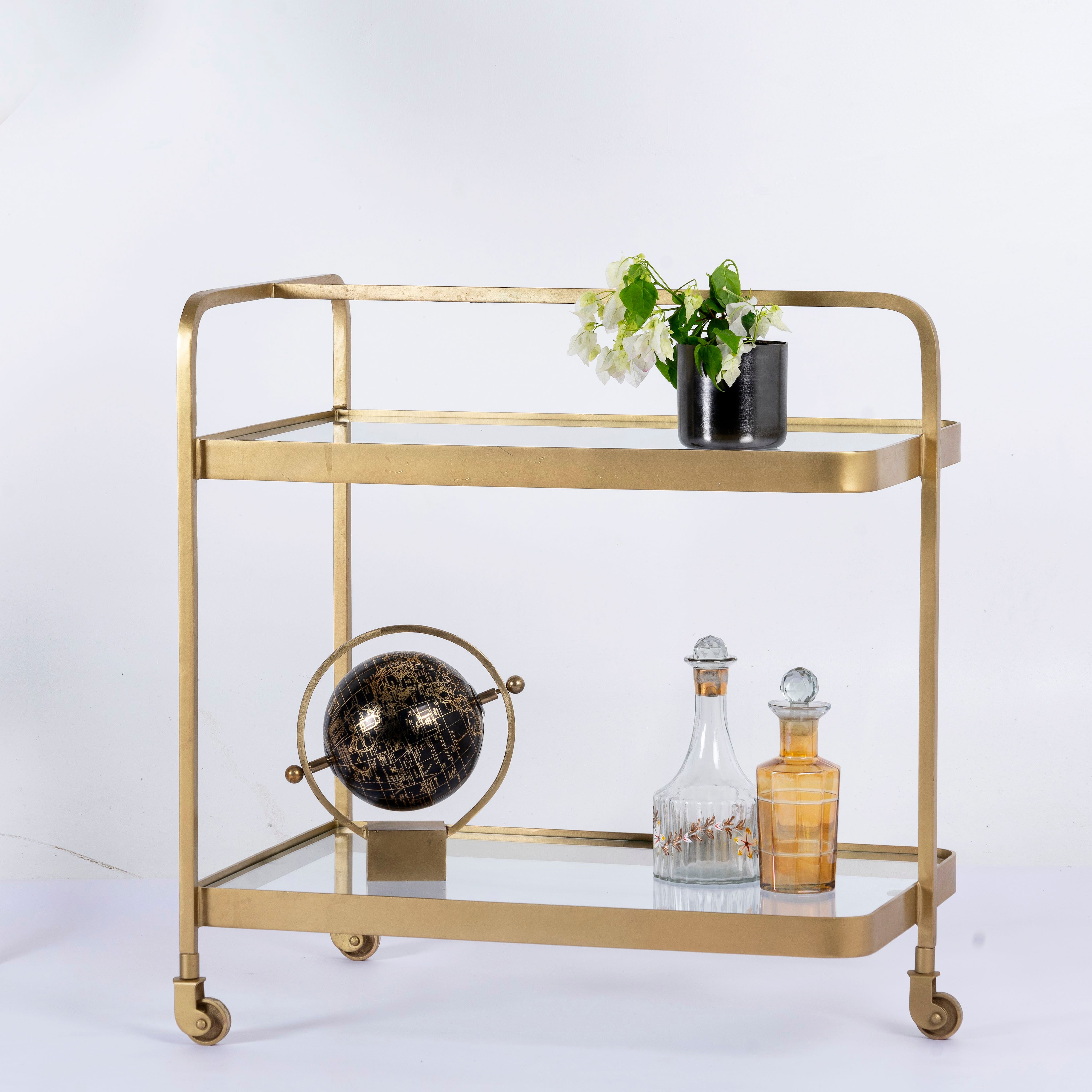 Een tijdloze toevoeging aan uw interieur: onze messing geplateerde ijzeren serveerwagen met glazen blad Sankha. Gemaakt met oog voor elegantie en functionaliteit, belichaamt deze wagen klassieke verfijning met een moderne twist.
