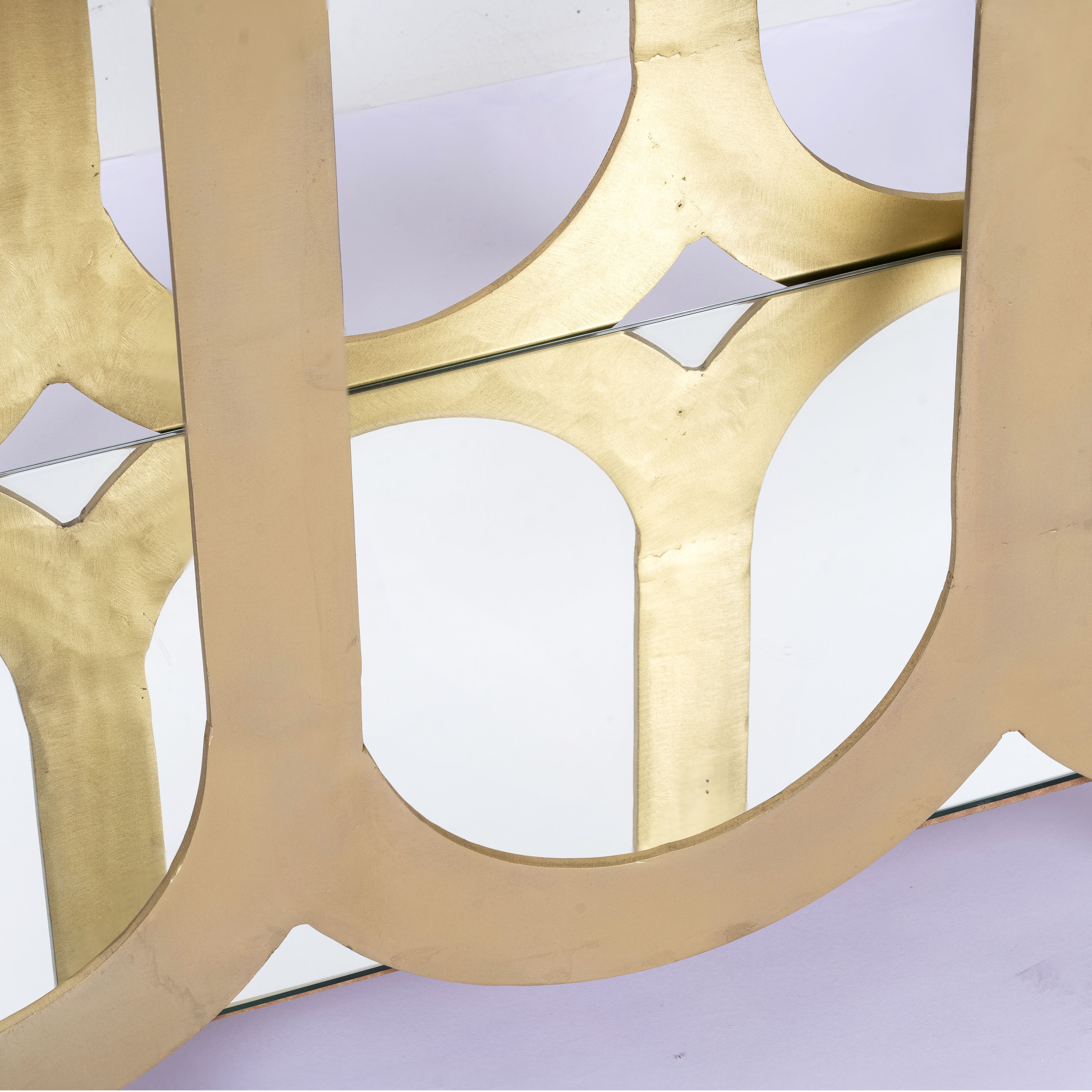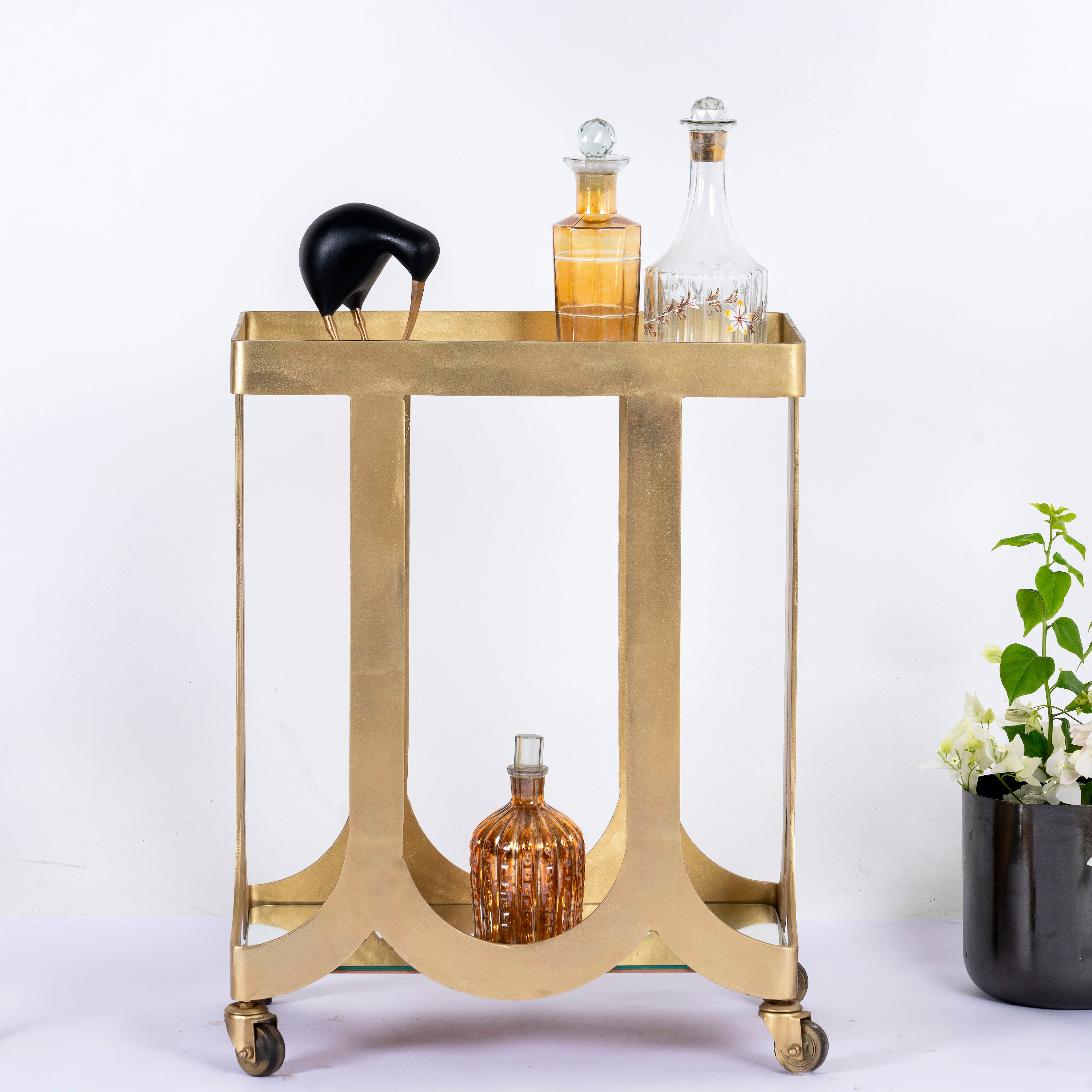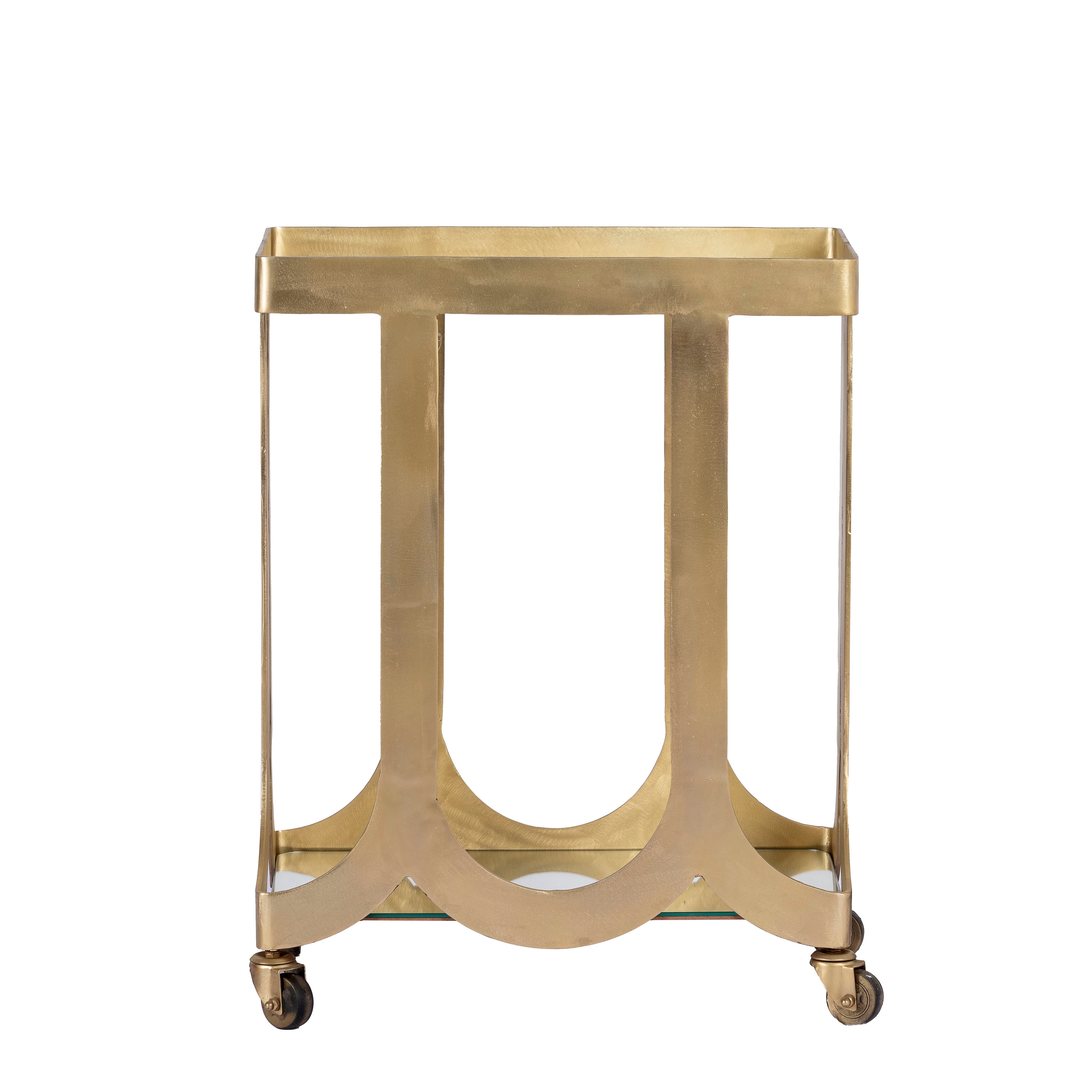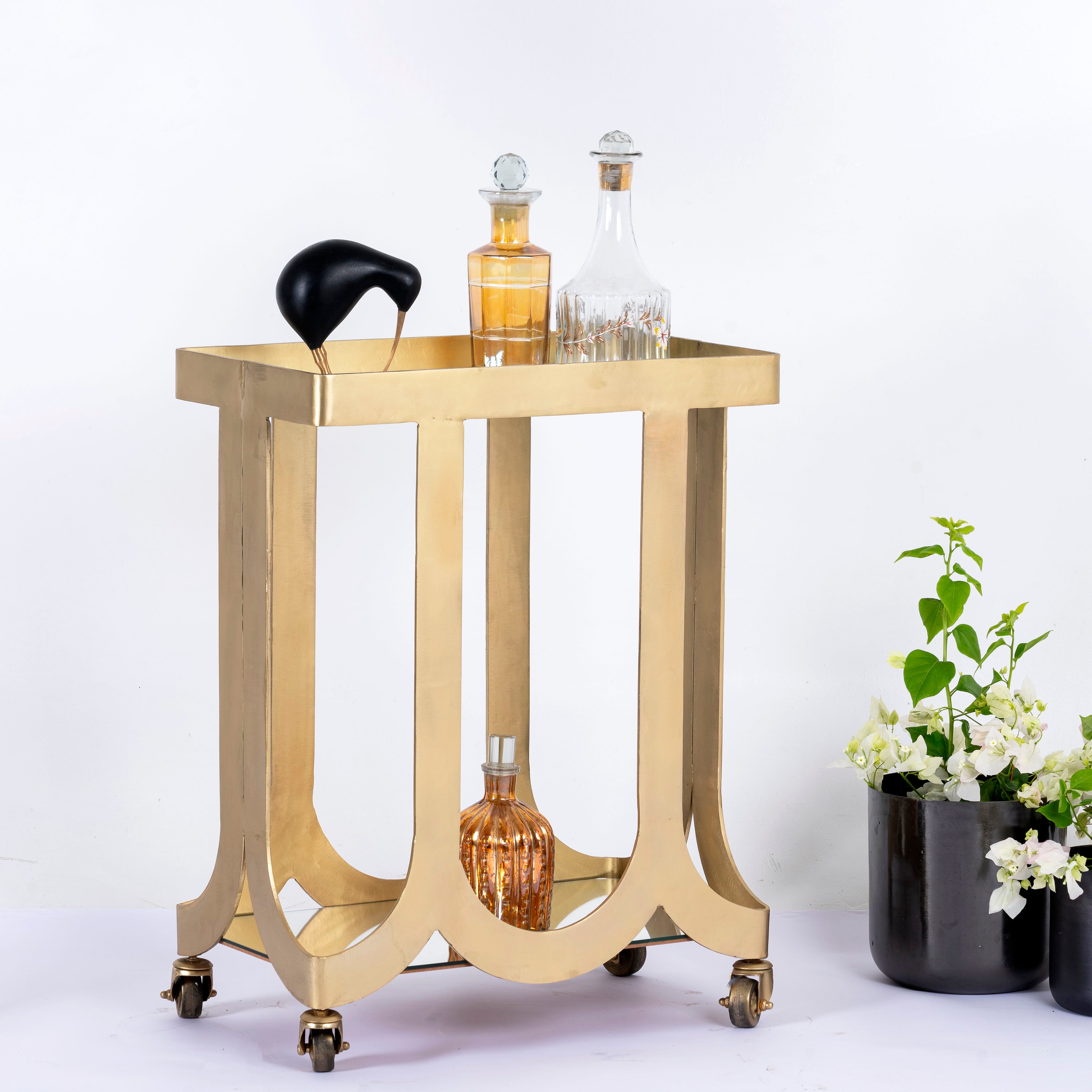 Ontdek onze unieke serveerwagen Sarika in boogdesign met een frame van messing gecoat ijzer en glas en spiegeloppervlakken. Deze elegante barwagen combineert functionaliteit en esthetiek perfect om uw ruimte te verrijken.