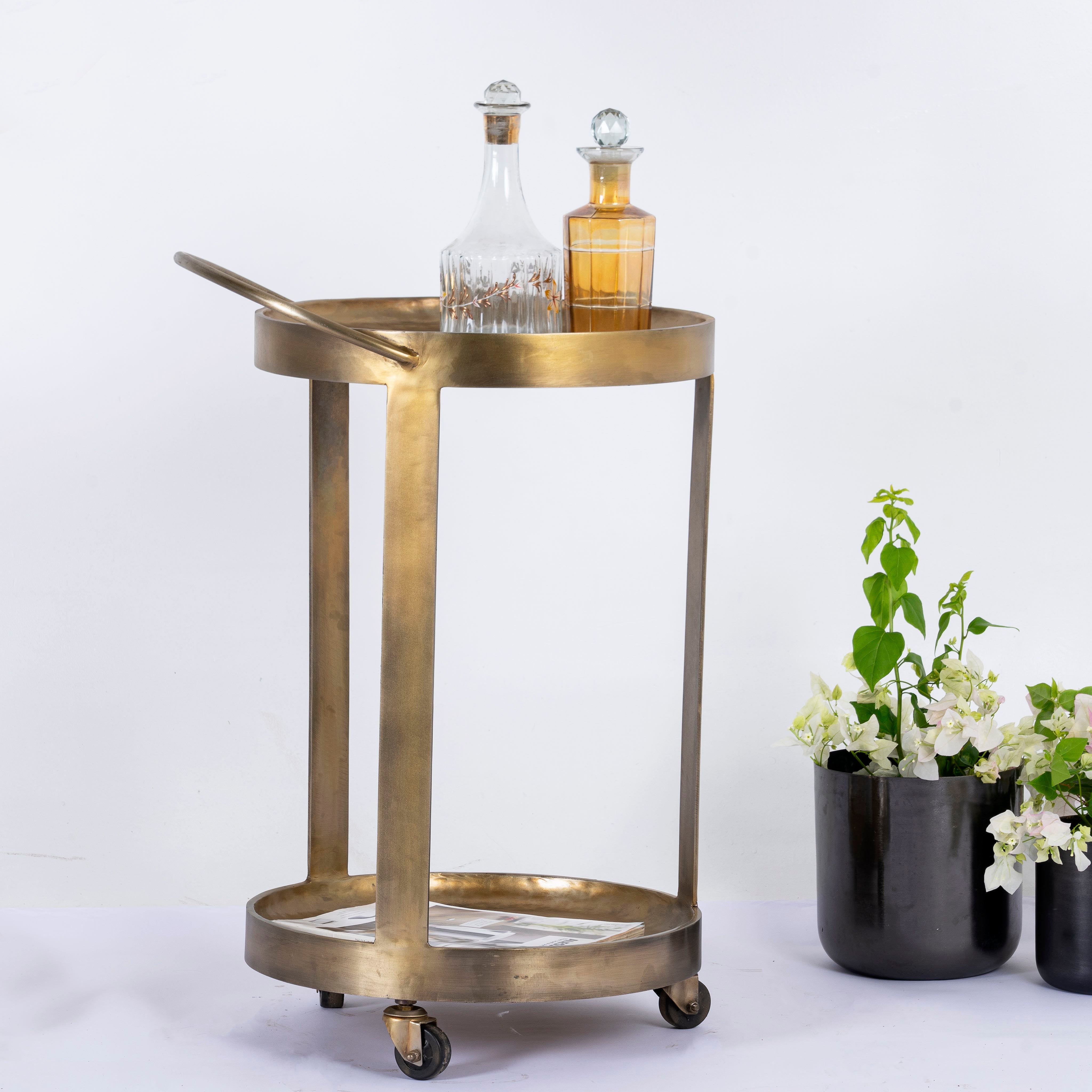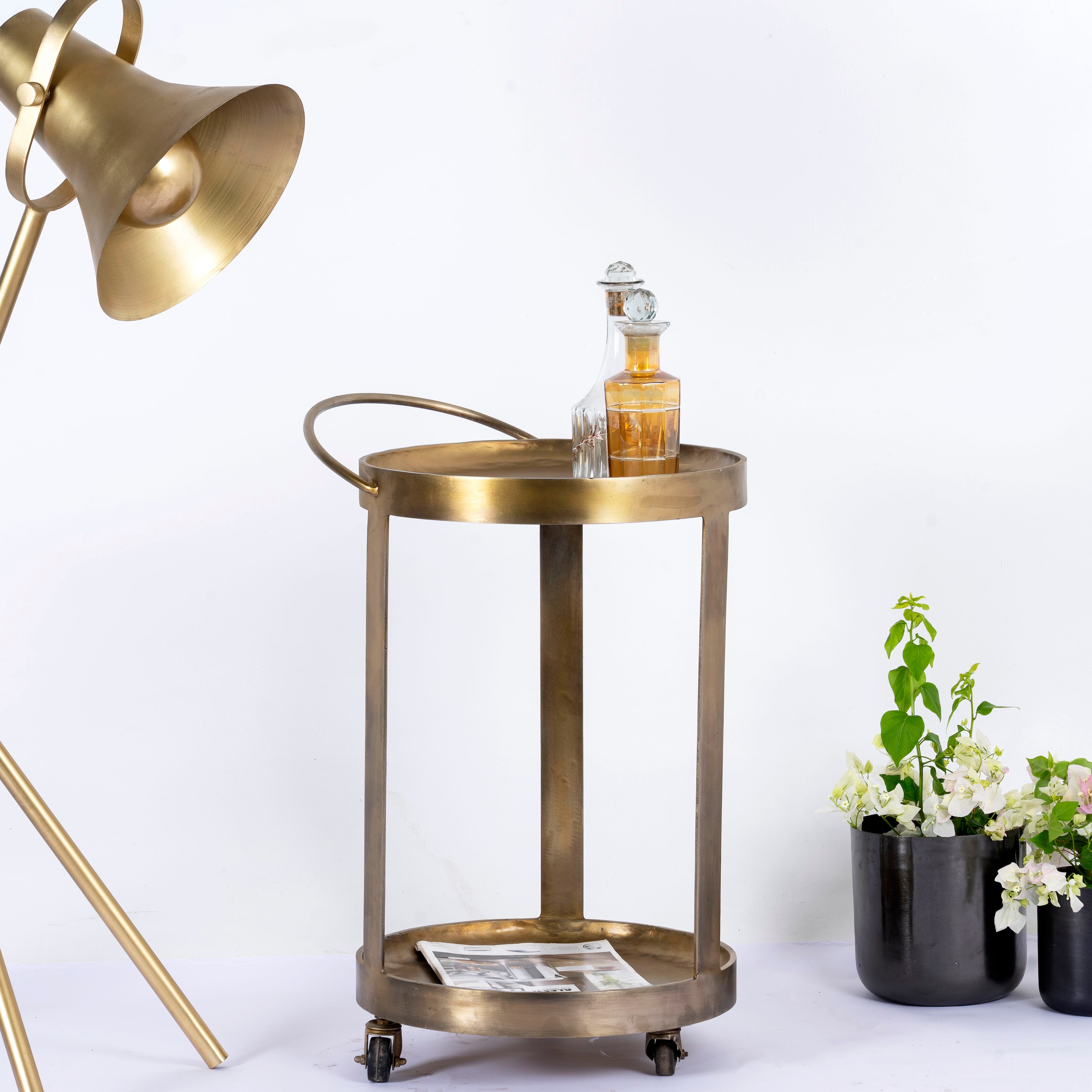 Ontdek de unieke serveerwagen van Om Home & Garden met een frame en serveerbladen van messing gecoat ijzer. Deze elegante barwagen combineert functionaliteit en esthetiek op perfecte wijze om uw ruimte te verrijken.