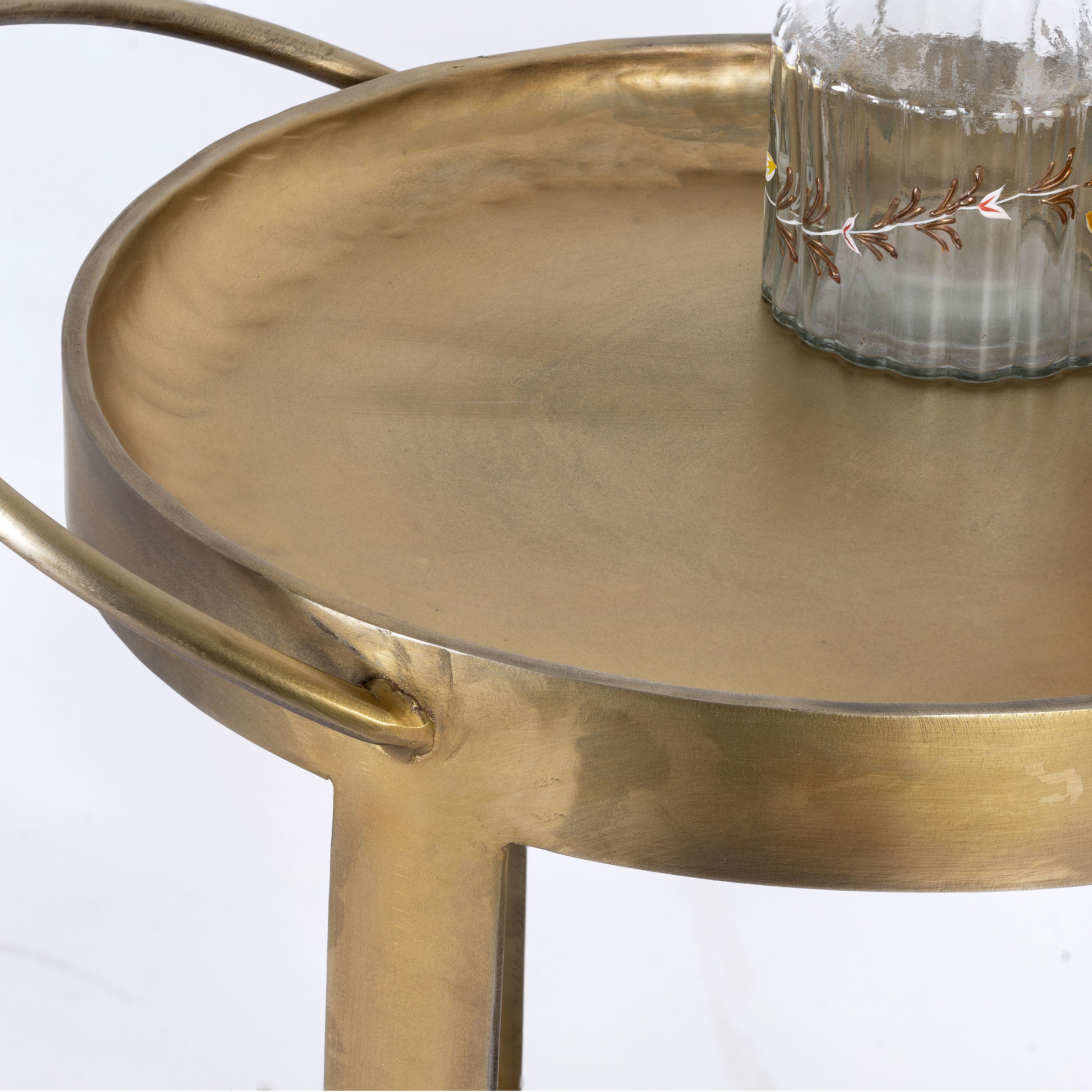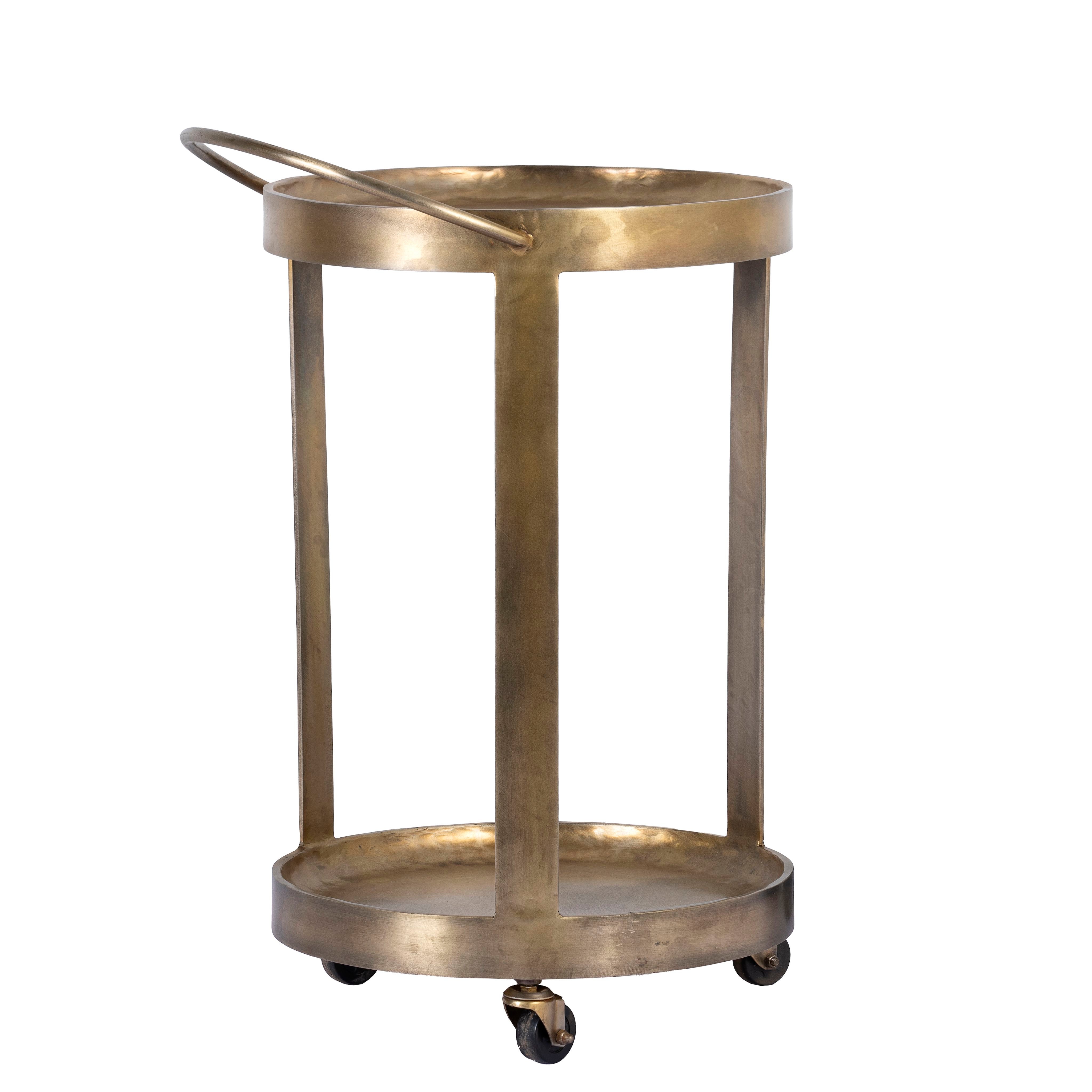 Het ijzeren frame met een messing gecoat oppervlak geeft de trolley een elegante uitstraling. Hierdoor is de kar niet alleen een functioneel meubelstuk, maar ook een decoratief element dat elke kamer verfraait.